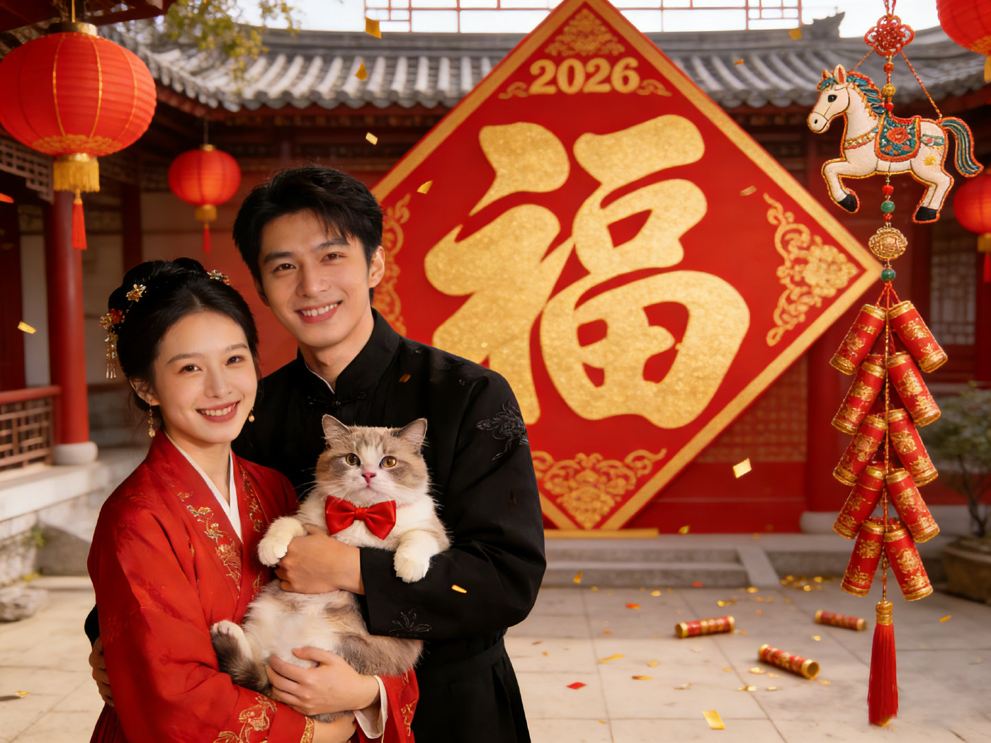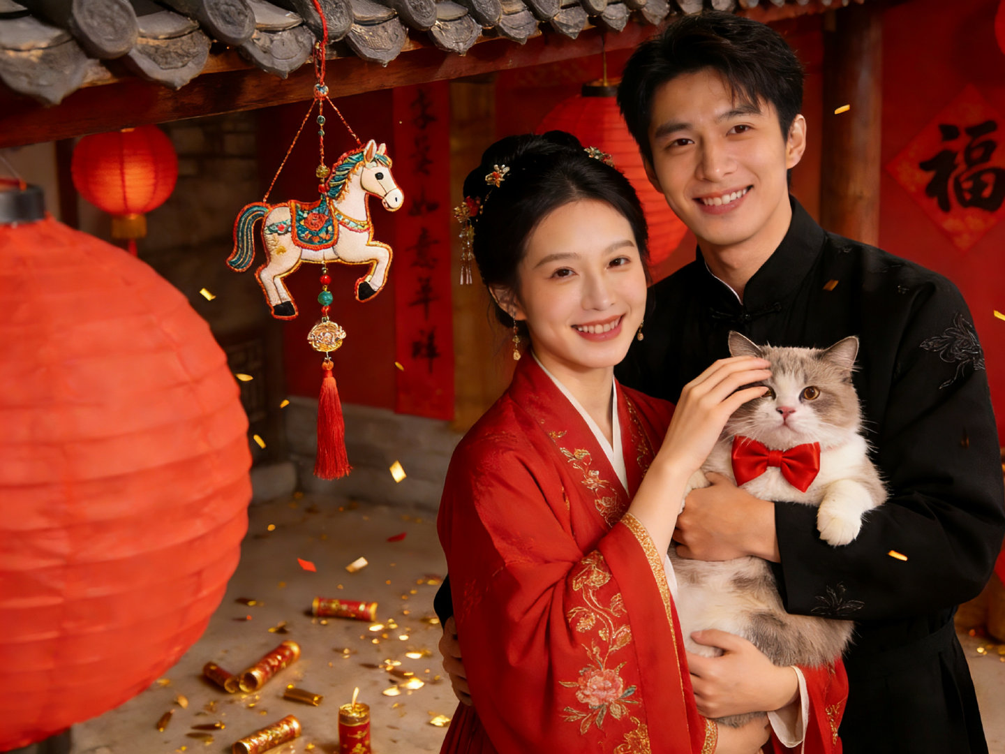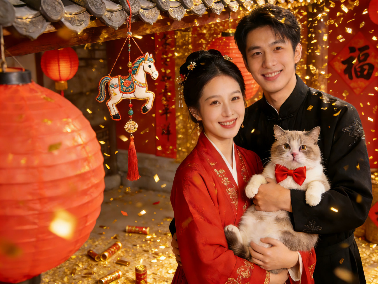 解锁AI古风新玩法!就算喵主子留守在家,也能拍新春团圆照,用全家福一键AI生成古风合影! 春节摄影大赛 春节AI合拍AI提示词:女着红刺绣汉服配古风发饰,男着黑刺绣唐装,中式庭院背景,红灯笼、福字、马年挂饰、金纸屑、鞭炮,2026马年春节,红金主色调,暖调自然光,高清8K人像,画面通透,人物生动。