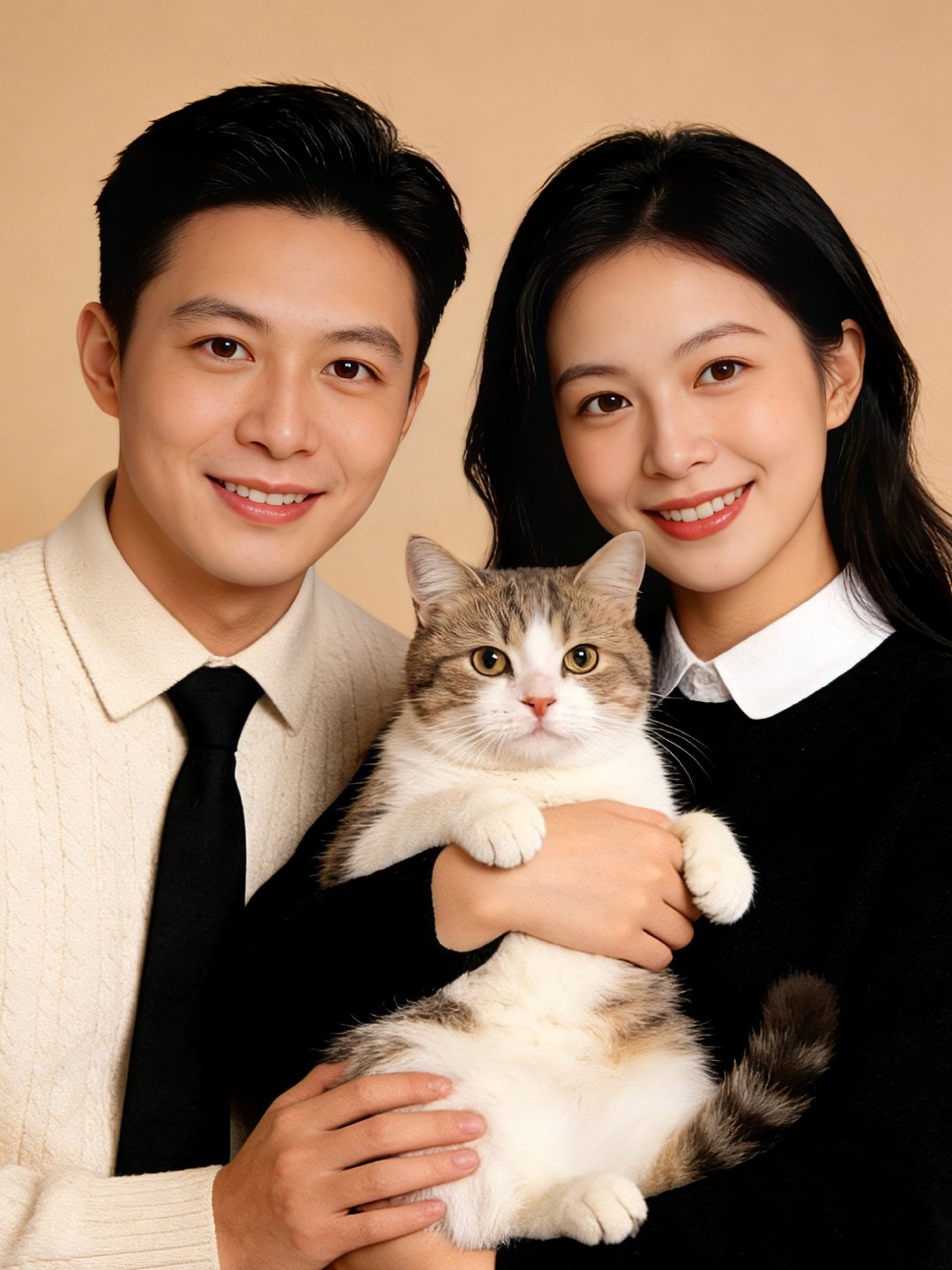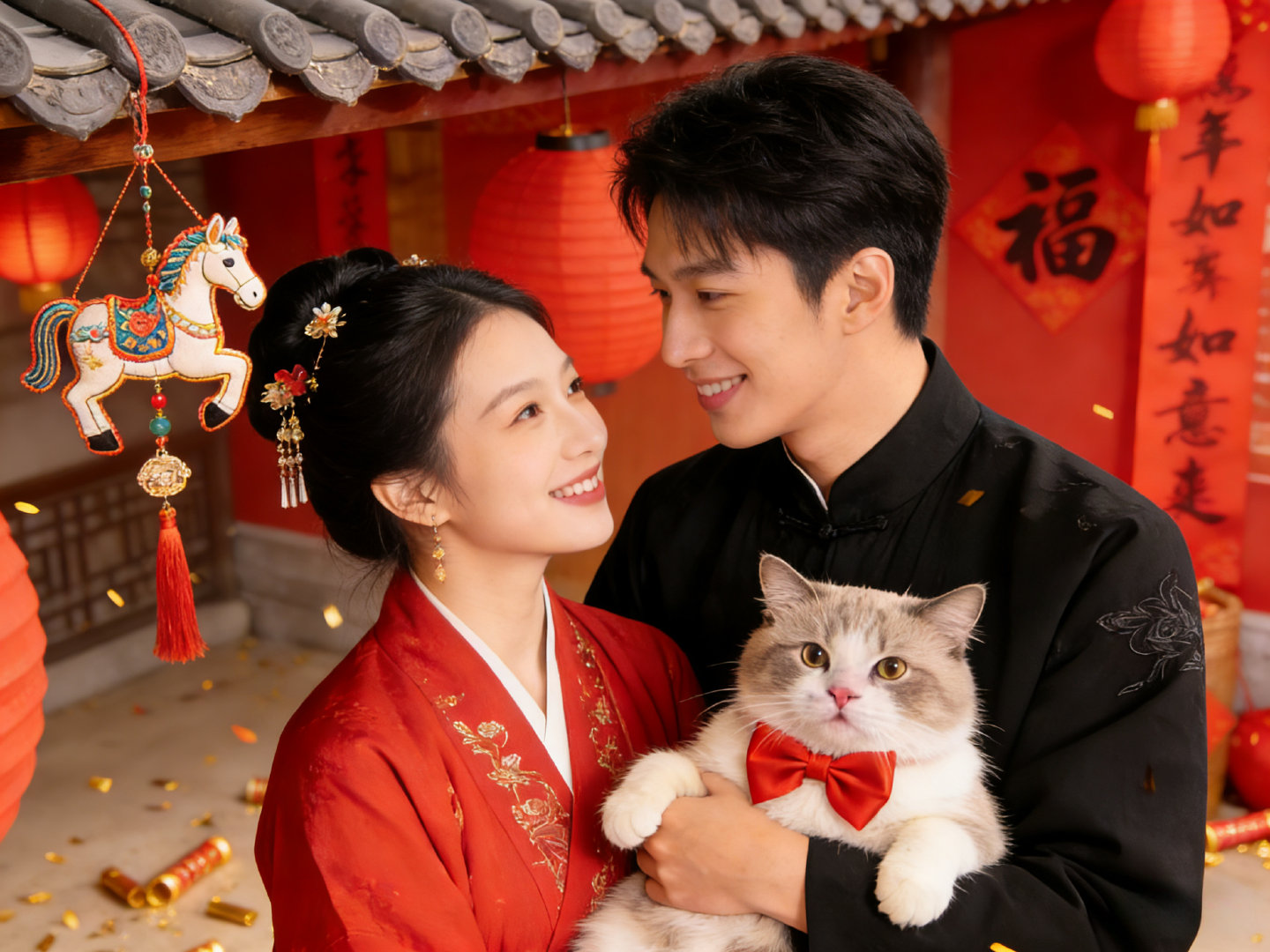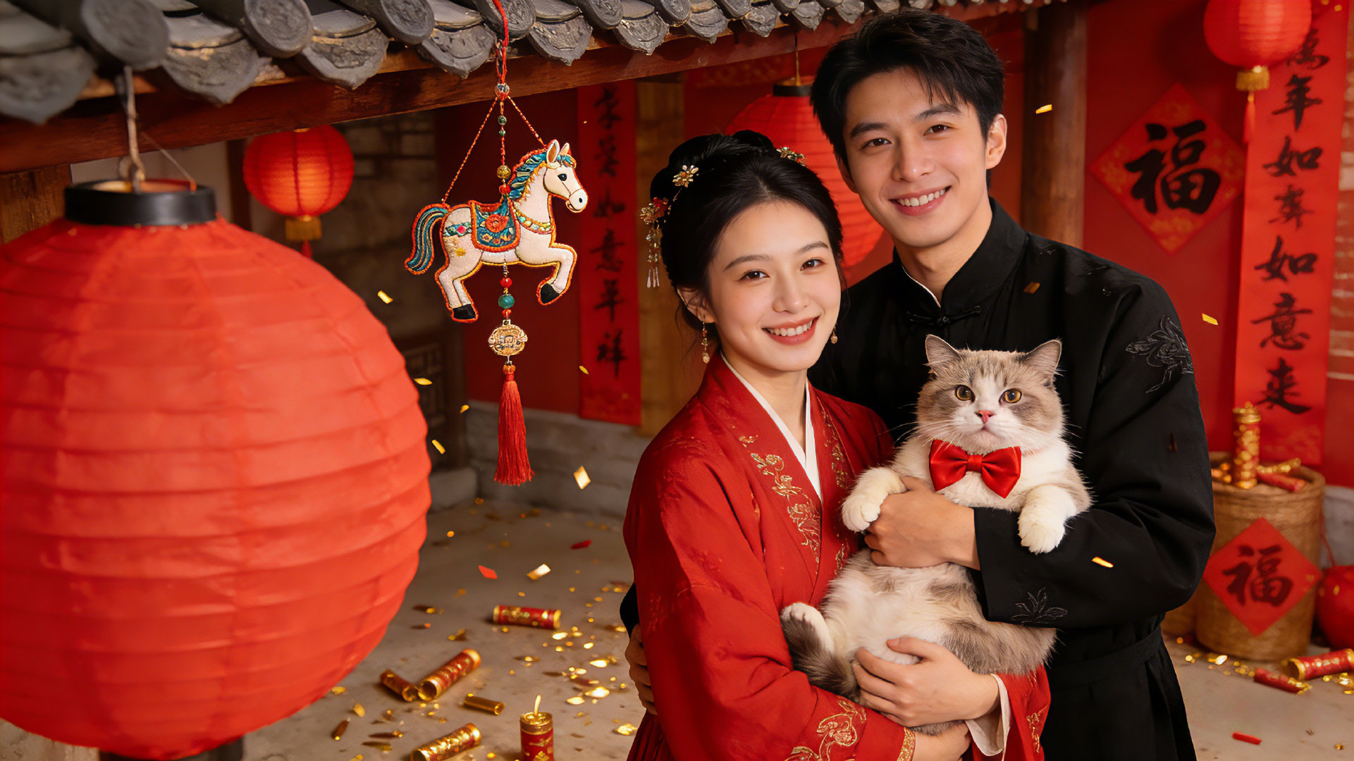 解锁AI古风新玩法!就算喵主子留守在家,也能拍新春团圆照,用全家福一键AI生成古风合影! 春节摄影大赛 春节AI合拍AI提示词:女着红刺绣汉服配古风发饰,男着黑刺绣唐装,中式庭院背景,红灯笼、福字、马年挂饰、金纸屑、鞭炮,2026马年春节,红金主色调,暖调自然光,高清8K人像,画面通透,人物生动。