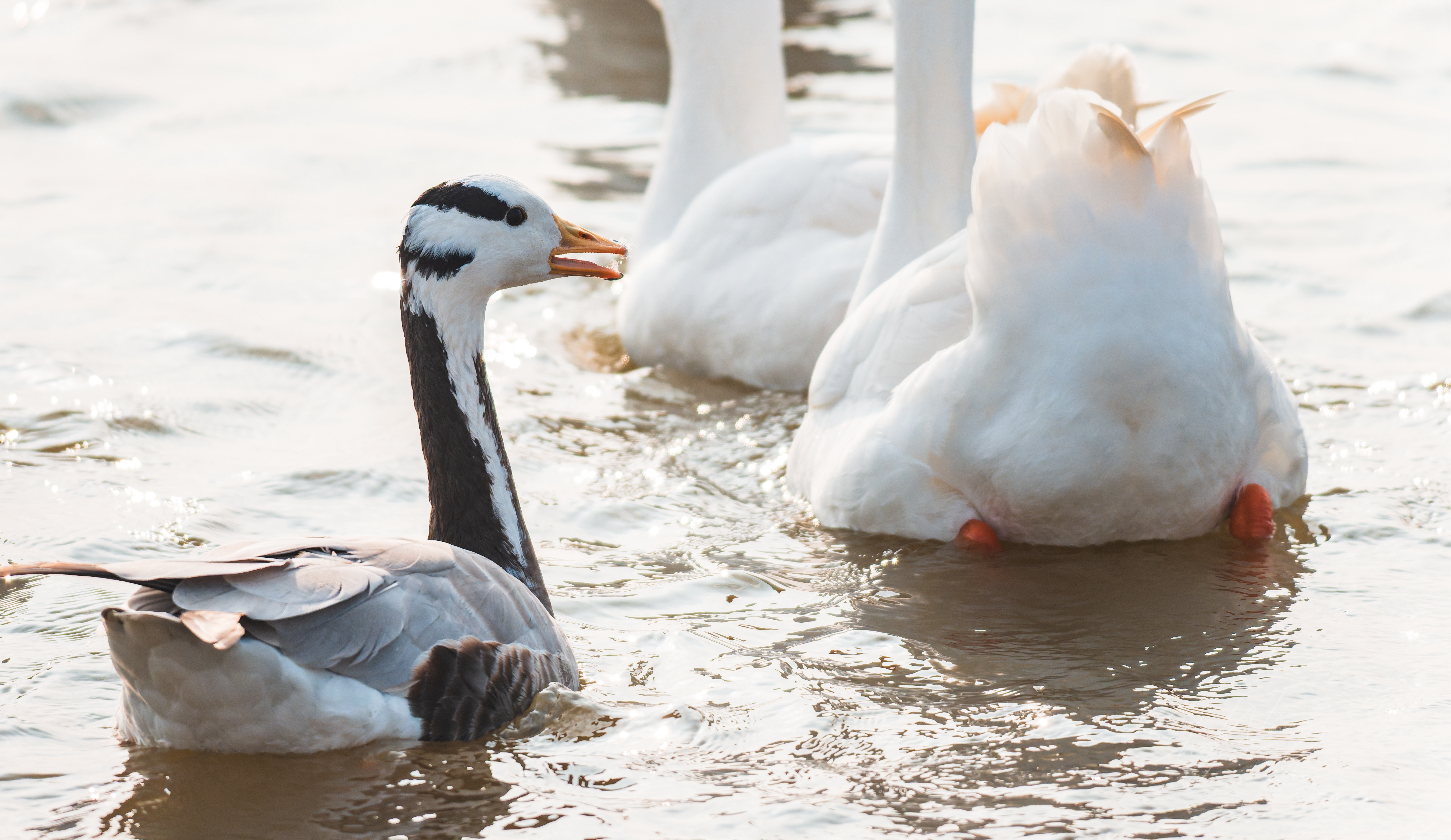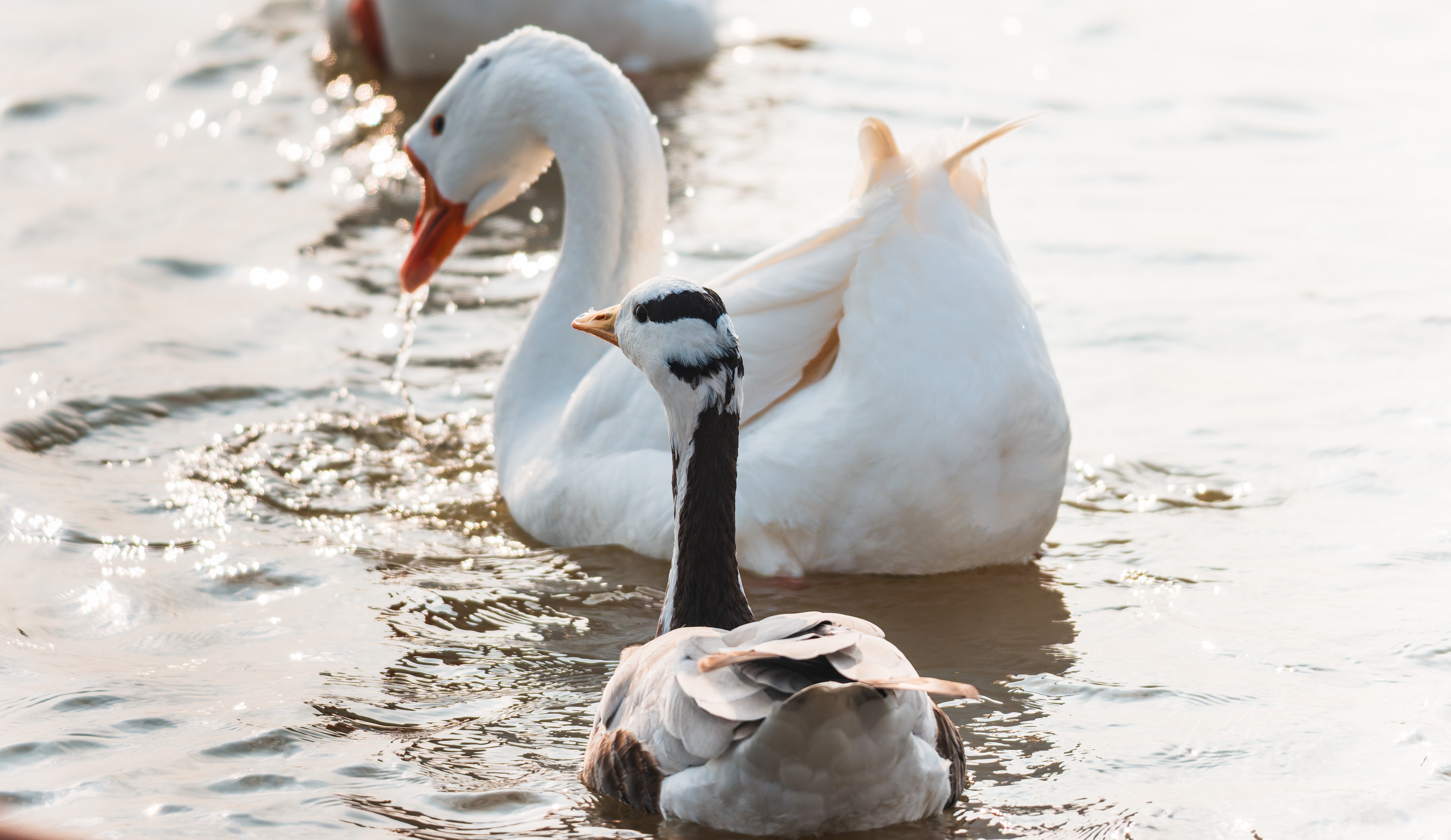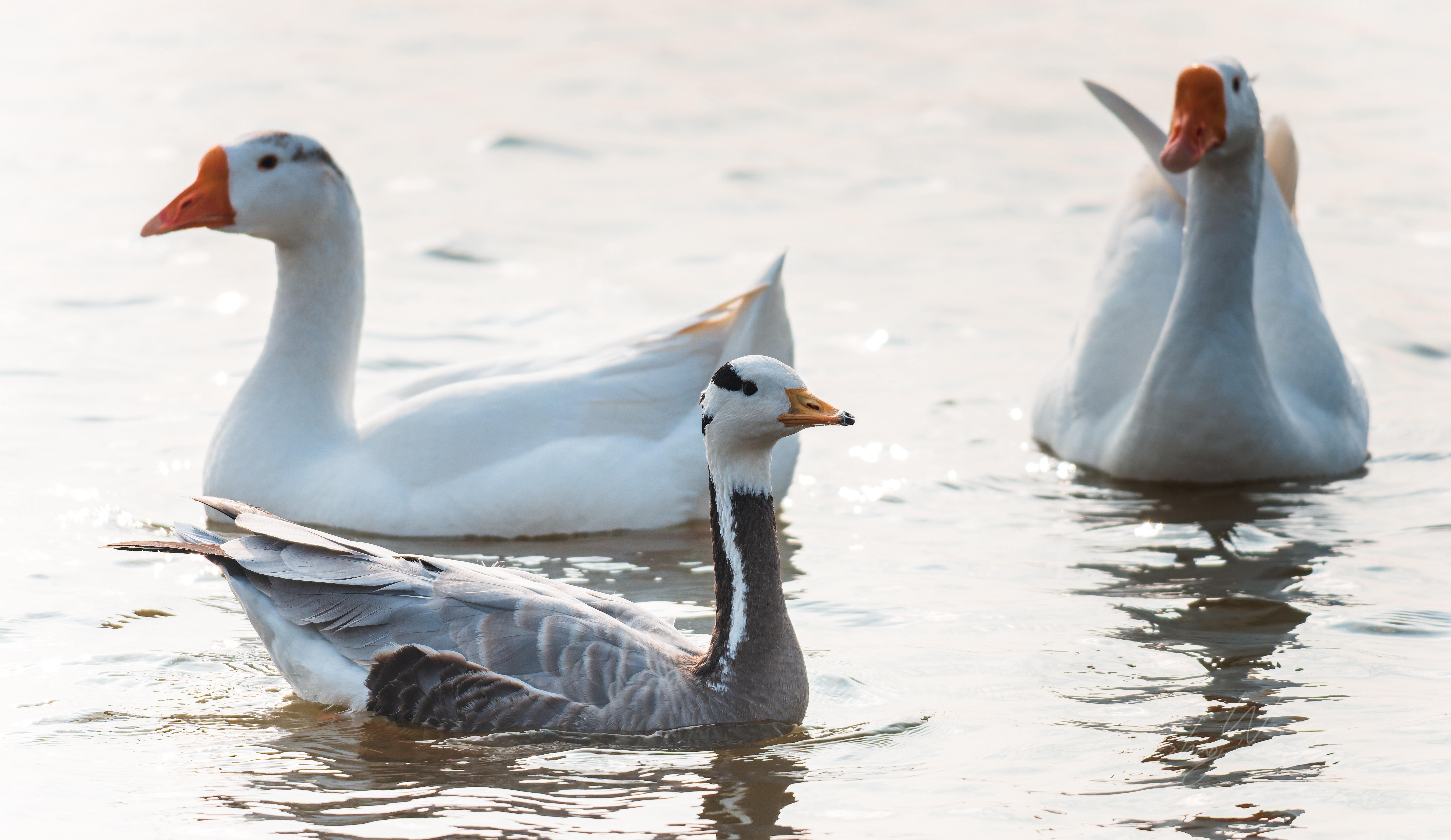 ✨ 冬日湖面的黑白精灵|斑头雁的优雅时刻✨ 在波光粼粼的水面上,这只斑头雁成了最亮眼的主角。黑白相间的羽毛,配上标志性的两道“眉纹”,在一群白鹅中显得格外独特。 它时而低头戏水,时而引吭高歌,橙黄色的喙在阳光下格外醒目。每一次划水都带着从容的韵律,仿佛在诉说着迁徙路上的故事。