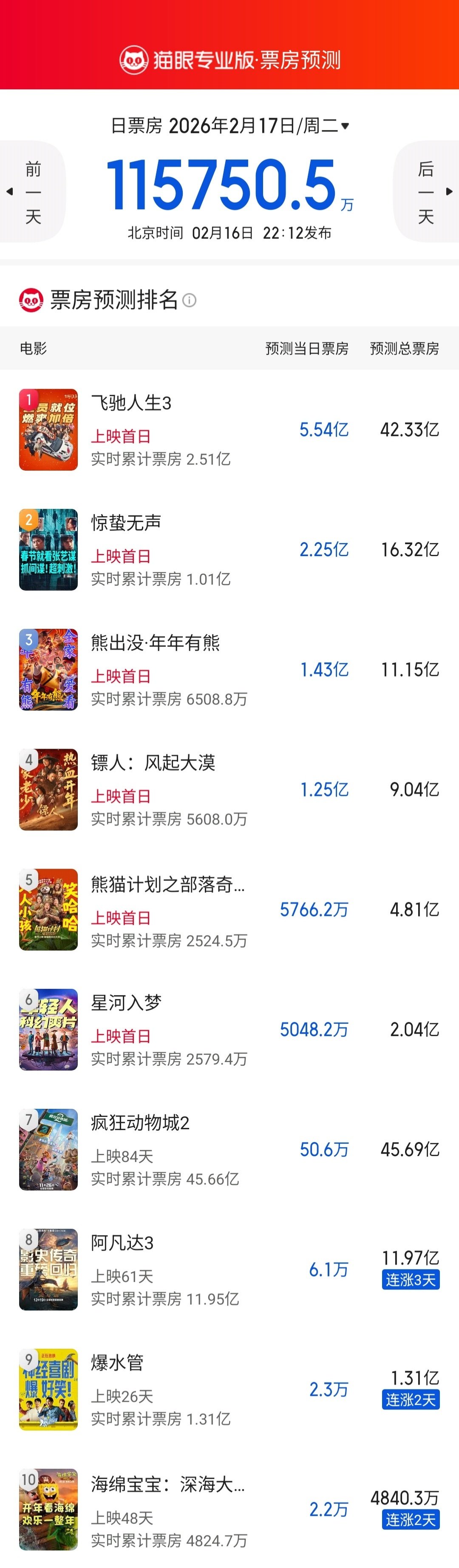 春节档票房预测,差距好大啊[柯基]镖人竟然预测这么低