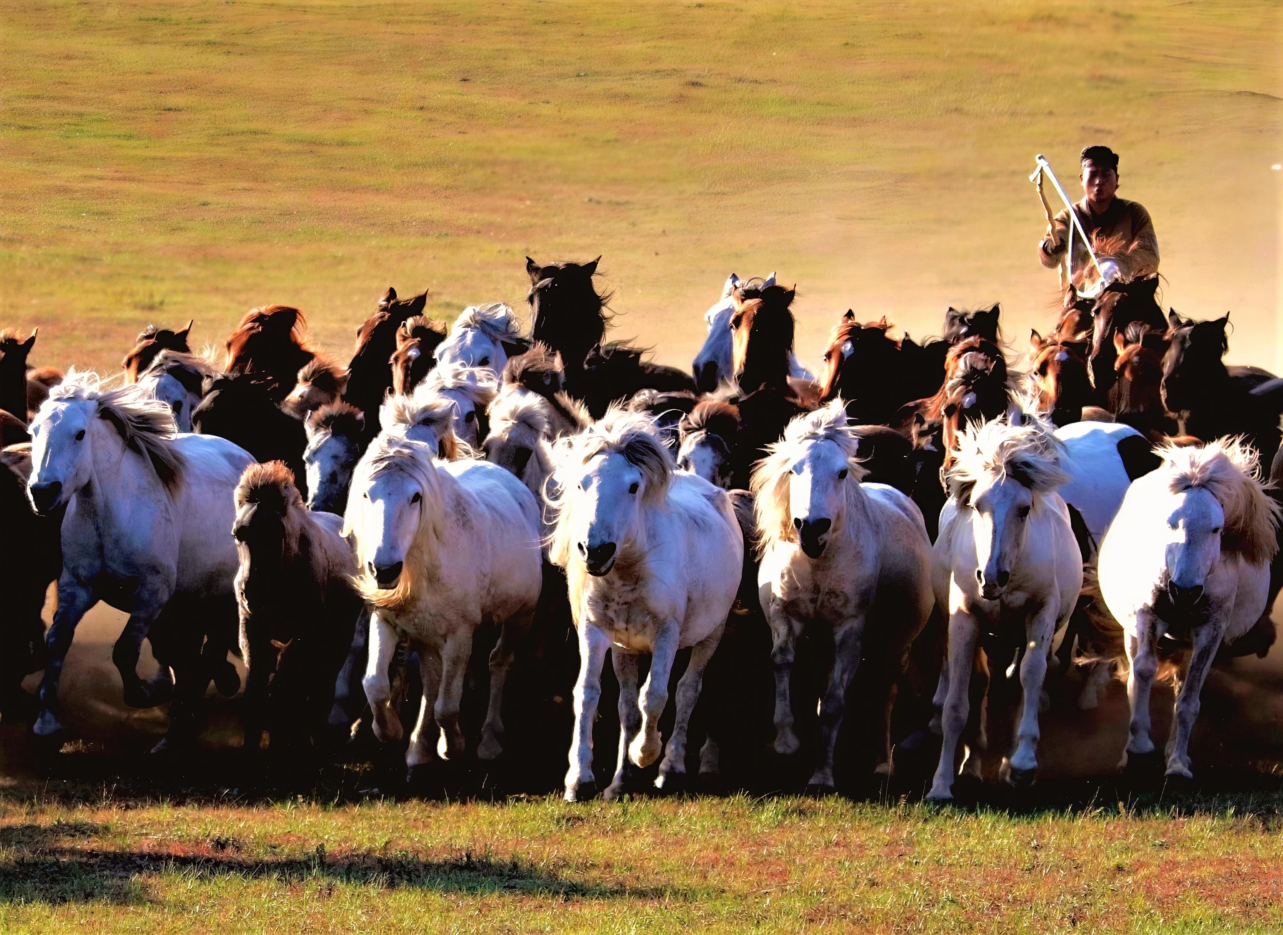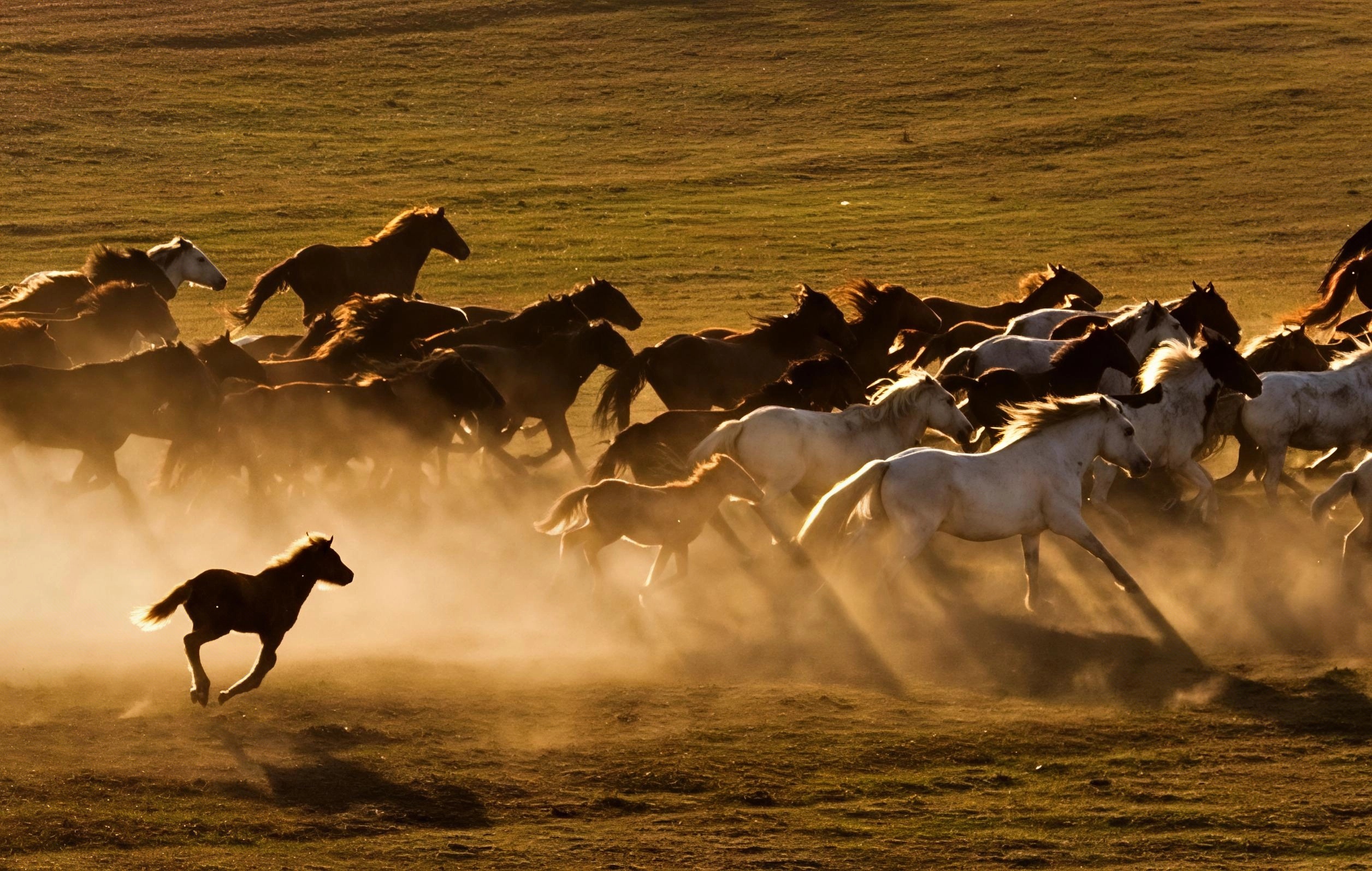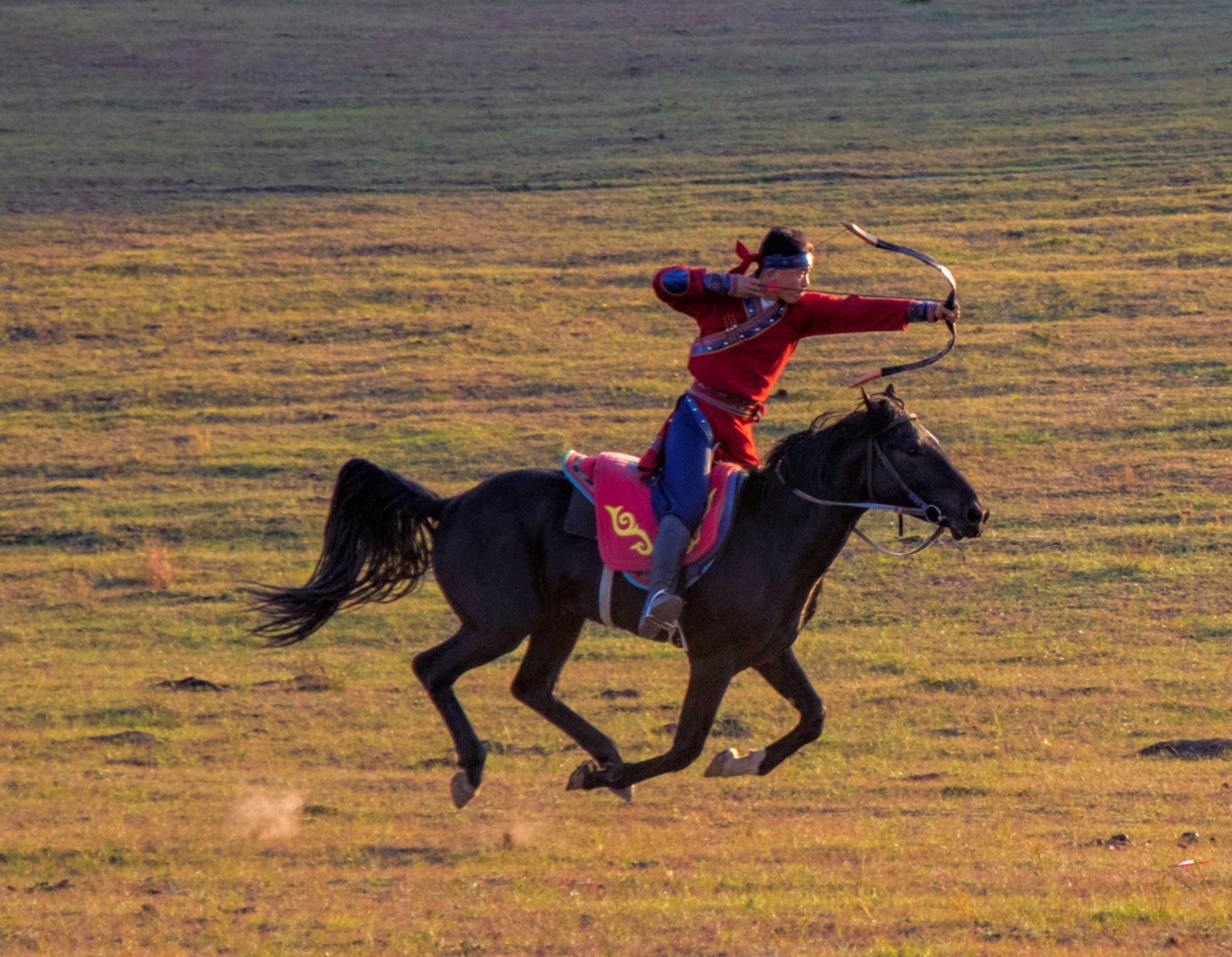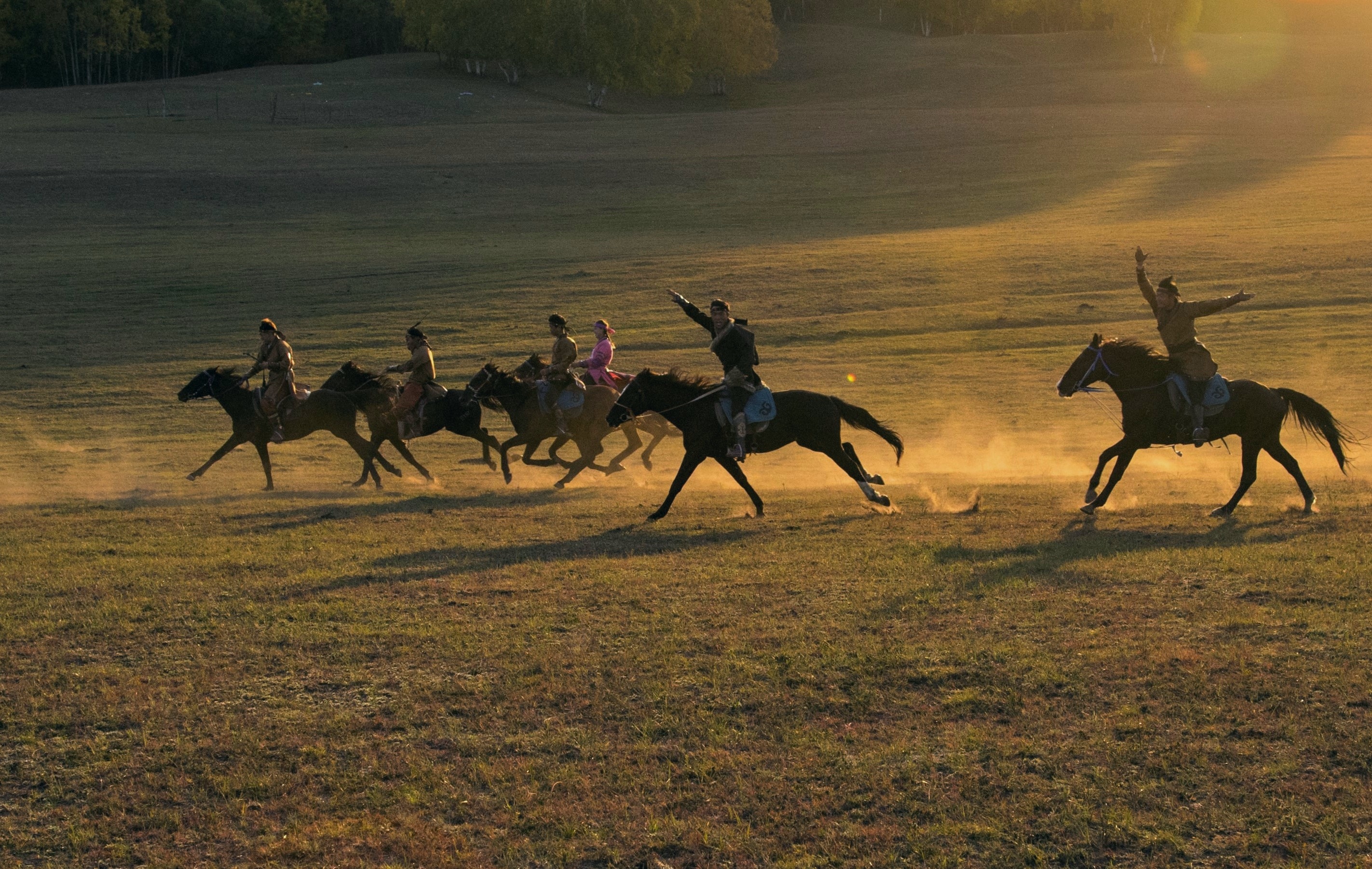 夕阳给坝上草原镀上金边,马群奔腾扬起尘雾,蒙古族骑手弯弓射箭,英姿飒爽。镜头追着风与自由,咔嚓定格这幕草原史诗~