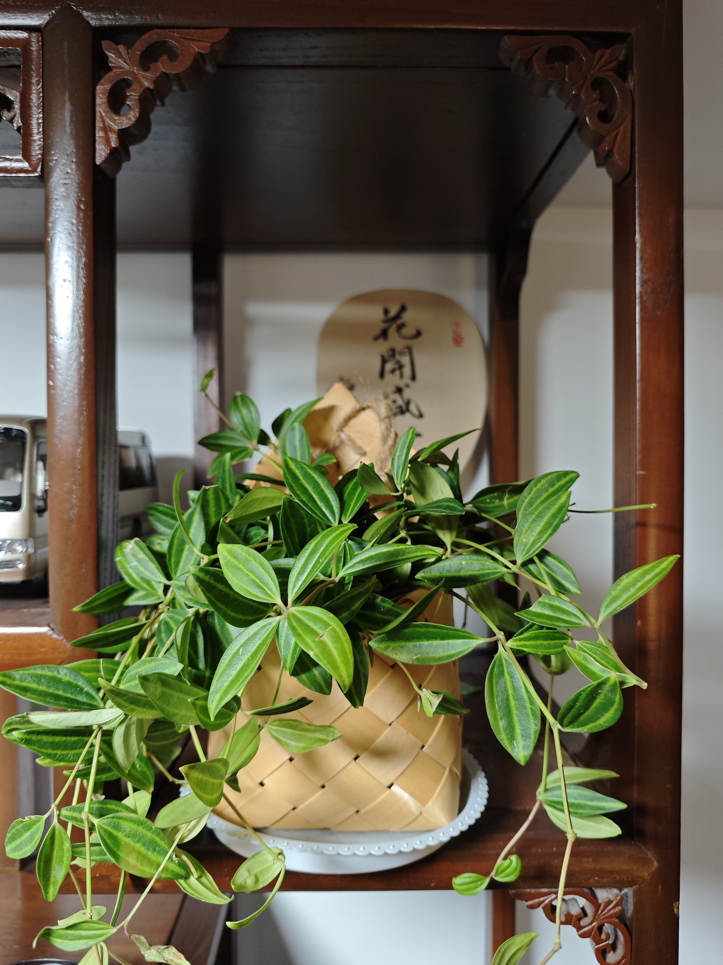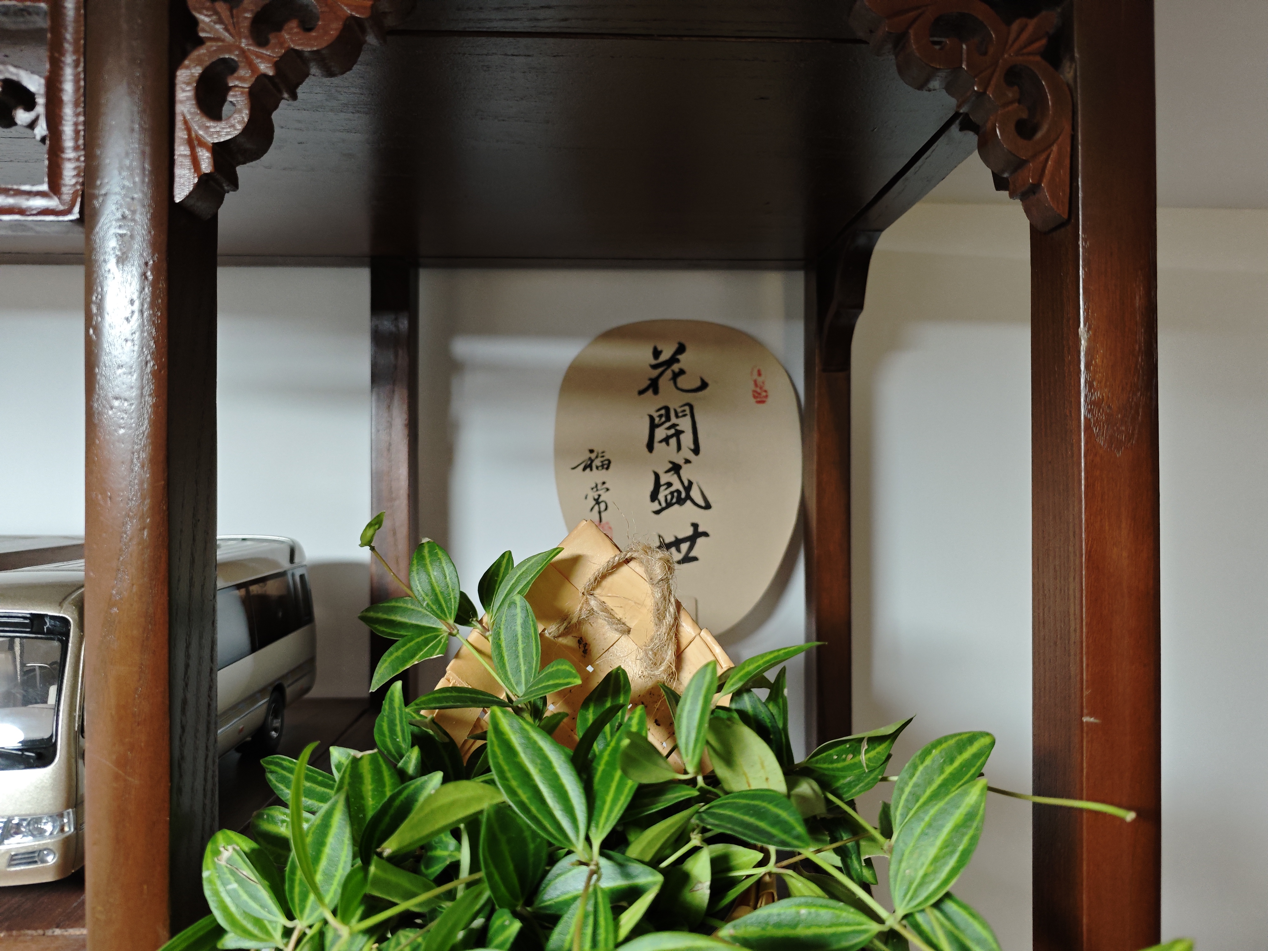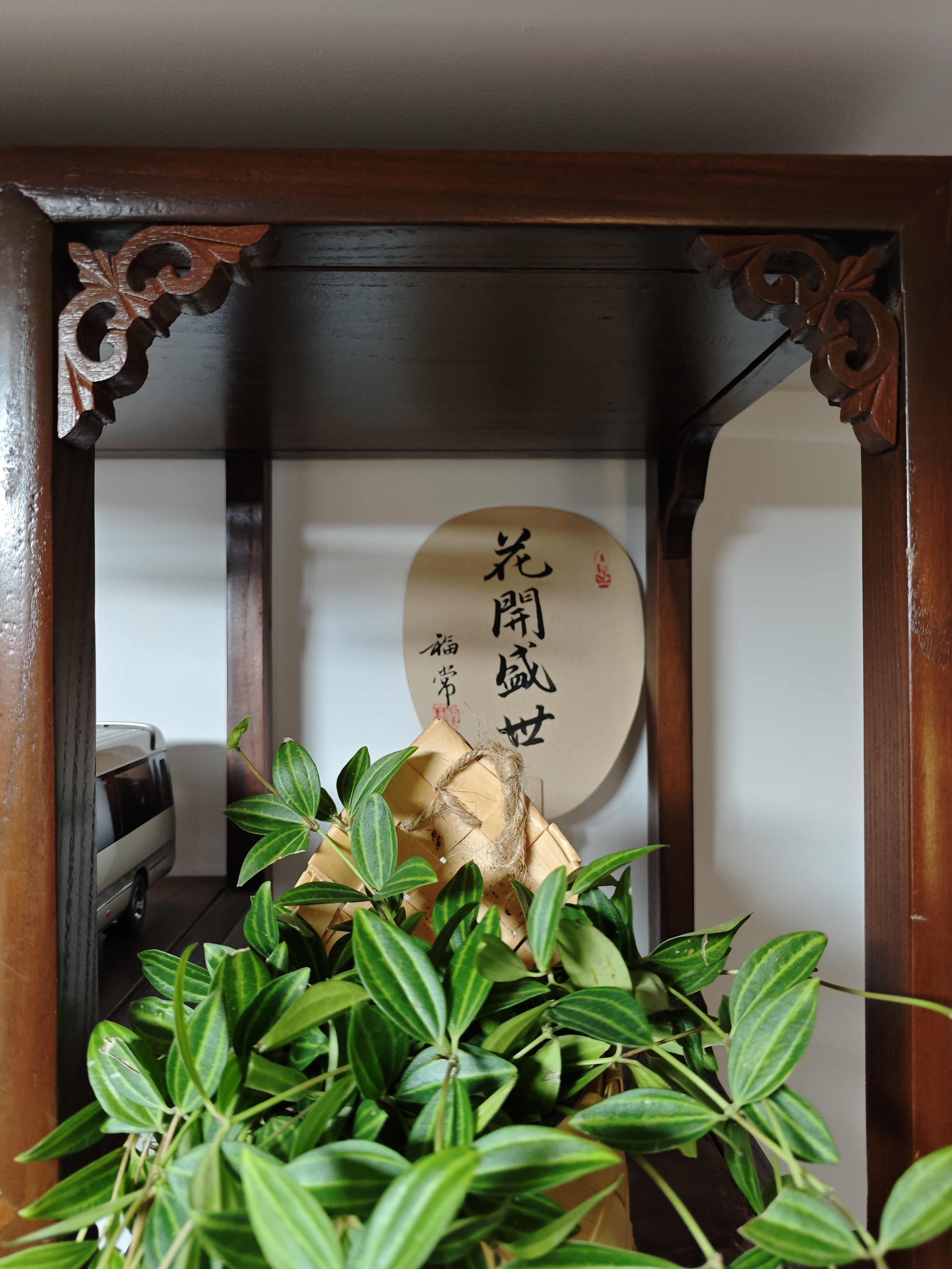 《案头清供,一隅静美》 古雅的木架上,时光似被雕花的榫卯悄悄挽留。米黄竹爿盆里的绿植垂落柔枝,叶片上深绿与浅纹交织,像把春日的溪涧裁作掌心的纹路——每一片叶尖都凝着生机,藤蔓轻垂时,便在案头铺展一卷流动的绿意。 竹爿盆旁,那柄写有“花开盛世”的扇面静静伫立。墨字端庄,红印鲜活,仿佛将岁月的祈愿凝在绢帛之上:“花开”是刹那的绚烂,“盛世”是恒久的安宁,而案头的绿意,正以生长的姿态,诠释着“常福”的期许——福泽如叶,岁岁常青;盛世如光,朗照日常。 左侧的模型车静默着,金属的光泽与木质的温软相映成趣,似在无声诉说旧时光的故事。白瓷托盘承着竹爿盆,蕾丝般的边缘轻托着生机,与木架的古拙、扇面的文气、绿植的鲜活,共同织就一方小天地。 这隅空间,没有喧嚣的纷扰,只有木纹的呼吸、叶片的私语、墨字的沉吟。当目光抚过叶的脉络、字的筋骨,心便在这静美里沉淀:原来生活的诗意,从不在远方的追逐,而在这案头一隅的凝视与安守——绿植吐纳生机,扇面寄存祈愿,木架承载岁月,它们彼此依偎,把平凡的日子酿成了清供的雅韵。 《木格里的绿与雅》 木格雕花,框住一方小宇宙 竹爿盆的菱纹里,藤蔓垂落 像绿色的溪流,漫过时光的堤岸 “花开盛世”——墨字在扇面站立 红印是未干的朱砂,落进岁月的留白 叶脉舒展,深绿与浅纹的对话 在光里,酿成静谧的禅 模型车沉默如旧梦 木纹的呼吸,托起瓷盘的温柔 蕾丝边轻吻竹爿的体温 这一隅,是光阴的褶皱里 被妥帖安放的春天 风不来,叶自摇曳 字无言,意已盈怀 当目光与绿相遇,与墨相逢 心便在这一方小景里 泊成了宁静的岸