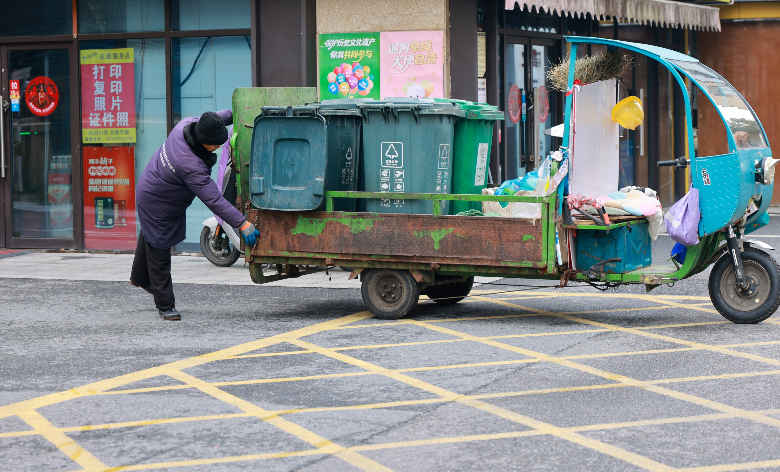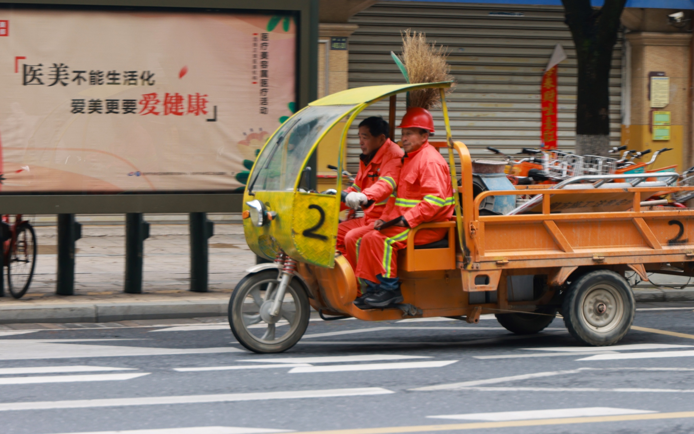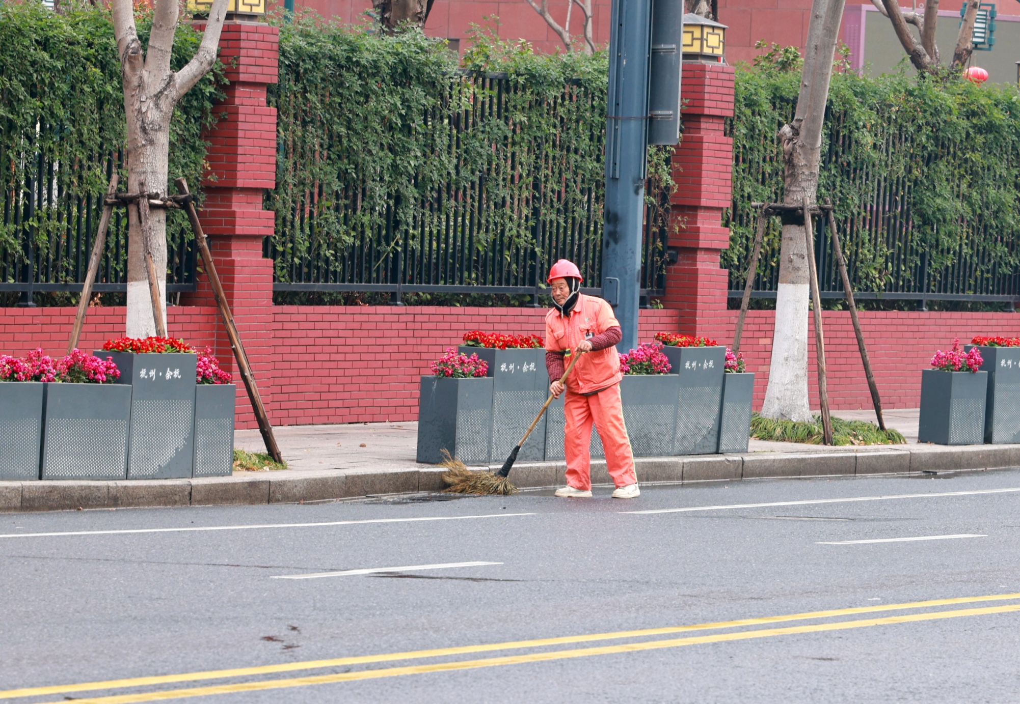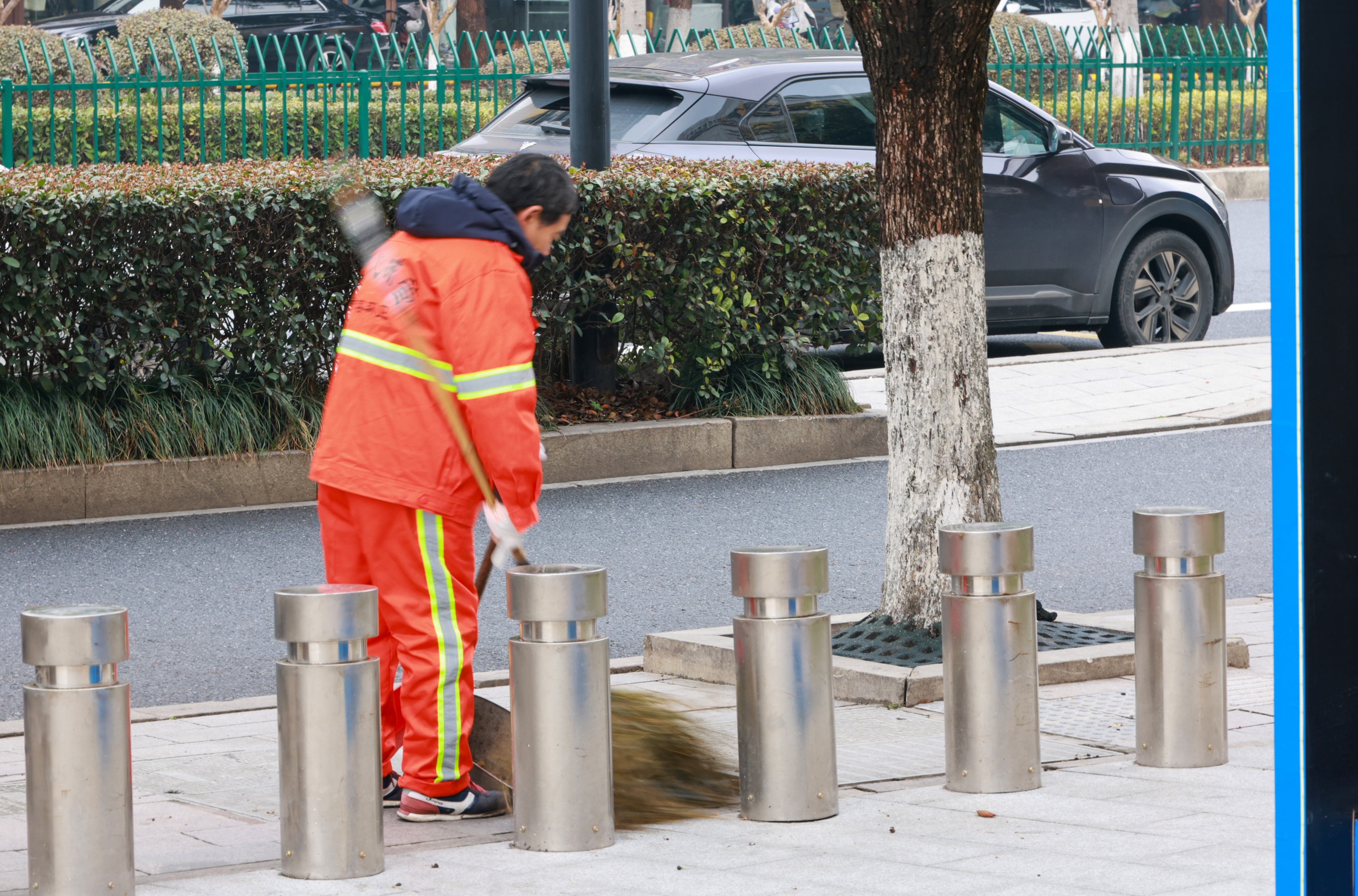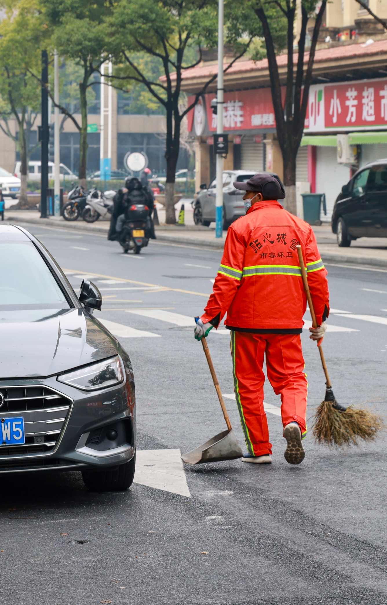 马年第一拍,杭州余杭街头,橙衣环卫工俯身挥帚,红帽映着初阳。铁锹铿锵,三轮车穿行于斑马线与绿化带之间;垃圾分类标识清晰,小芳超市橱窗映出城市日常。镜头定格这无声奉献——城市洁净的底色,由平凡坚守绘就。,真踏实!拍