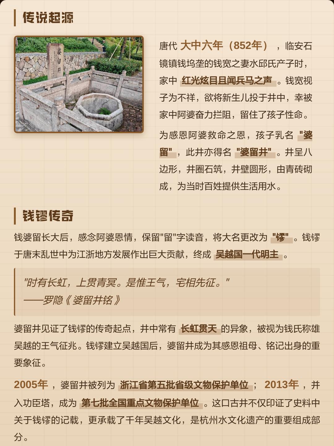 最近友友们是不是也追《太平年》追得心潮澎湃?从荧幕里的跌宕风云,到临安山水间的历史回响,我觉得作为浙江人、杭州人,跟着潮新闻的文章来一场“吴越寻根之旅”,这个想法真是太棒了。我认为第一站选婆留井,绝对是个有故事的开场。 我们这就出发,去触摸那段被一口井见证的千年传奇。 📜 联系《太平年》,走进钱镠的传奇起点 在《太平年》的故事里,我们看到了吴越国“纳土归宋”的深明大义和钱氏一族保境安民的智慧。而这一切的源头,都要从临安这口看似普通的古井说起。 · 一个惊心动魄的传说:公元852年,钱镠(小名“婆留”)诞生时,因其相貌丑陋且伴有异象,其父钱宽认为是不祥之兆,竟想将他投入后院的井中。危急时刻,一位好心的阿婆(祖母或邻家老妇)拼命将他拦下,保住了这个婴孩的性命。为了感念阿婆的救命之恩,钱镠乳名就叫“婆留”,这口井也因此得名“婆留井”。后来,他将名字改为同音的“镠”,既保留了纪念,又开启了全新的篇章。 · 一处真实的唐代遗存:这不仅仅是一个传说。婆留井位于临安功臣山南麓的功臣寺遗址内,是浙江省内保存完少有的唐代砖石构筑物。它由钱镠的外祖父所筑,井圈为八角形石质,井壁则由青砖砌成,静静地诉说着真实的历史。 · 一份厚重的文化坐标:如今,婆留井是全国重点文物保护单位“功臣塔及功臣寺遗址”的重要组成部分。它就像一把钥匙,为我们打开了通往吴越国历史的大门,让我们能真切地触摸到钱王传奇的起点。 🗺️ 婆留井游览攻略 了解了背后的故事,我们再来看看怎么去、怎么玩,让这趟寻根之旅更尽兴。 攻略要点 /详细信息 📍详细位置 /浙江省杭州市临安区锦城街道功臣山南麓,吴越文化公园内的功臣寺遗址东南角。 🚗怎么去 /自驾:导航“吴越文化公园”或“临安博物馆”,杭州市区出发约1小时车程。 公交:可乘坐地铁16号线至临安广场站,出站后换乘公交或打车前往,起步价即可到达。 💰开放信息 /门票:免费。 开放时间:吴越文化公园及婆留井通常全天开放,但建议在白天前往,便于参观和拍照。 👣游览建议 /婆留井静静地坐落在功臣寺遗址的台基之上。我们可以: · 驻足凝望:仔细端详这口千年古井,想象当年那个惊心动魄的瞬间。 · 阅读碑刻:寻找唐代文学家罗隐所作的《婆留井颂》,感受古人对钱镠的赞誉。 · 以井为媒:将眼前的实物与《太平年》剧中的情节和钱镠的身世联系起来,拍照留念,开启自己的吴越文化之旅。 | 🏃 寻根之旅,不止于此 参观完婆留井,我们会发现这里只是一个开始。站在功臣山上,我们已被吴越文化遗迹所包围。建议放慢脚步,来一场深度CITY WALK: · 登临功臣塔:从婆留井出发,沿步道登上功臣山,大约20分钟就能看到由钱镠亲自下令建造的功臣塔。这座千年古塔是临安的地标,登高可俯瞰临安全城。 · 探访博物馆:下山后,一定不要错过旁边的吴越文化博物馆(临安博物馆)。这里收藏着大量吴越国时期的珍贵文物,特别是三件“镇馆之宝”——秘色瓷褐彩云纹油灯、熏炉和盖罂,出土于钱镠母亲水丘氏的墓中,精美绝伦,能让你对吴越国的繁荣有更直观的感受。 · 寻迹衣锦城:可以再去看看新开放的衣锦城遗址博物馆,在发掘现场感受千年前吴越国都城的市井烟火与城市规划。 · 谒陵钱王陵:最后,前往钱武肃王陵,在肃穆的神道尽头,向这位传奇的吴越国开创者致以敬意。 🍜 舌尖上的临安 这一圈走下来,想必也饿了。临安的美食同样带着山野的淳朴与温暖: · 天目暖锅:冬日里最抚凡人心的美味,各种食材在炭火中咕嘟作响,暖胃又暖心。 · 昌化刀切面:手工制作,面条筋道,汤头浓郁。 · 还有:藻溪烤饼、横畈豆腐干,都是地道的临安风味。 🎁 带走一份“太平”记忆 旅程的最后,可以去吴越文化博物馆内的“吴越信物”文创店逛逛,挑选一些《太平年》联名文创,比如以秘色瓷为灵感的冰箱贴、摆件等,把这份独特的文化记忆带回家。 希望这份攻略能让感兴趣的友友们的吴越寻根之旅收获满满。从一口井开始,看一个王国的崛起,感念一段保境安民的千秋功德。祝大家在临安,找到属于自己的那份“太平”感悟。