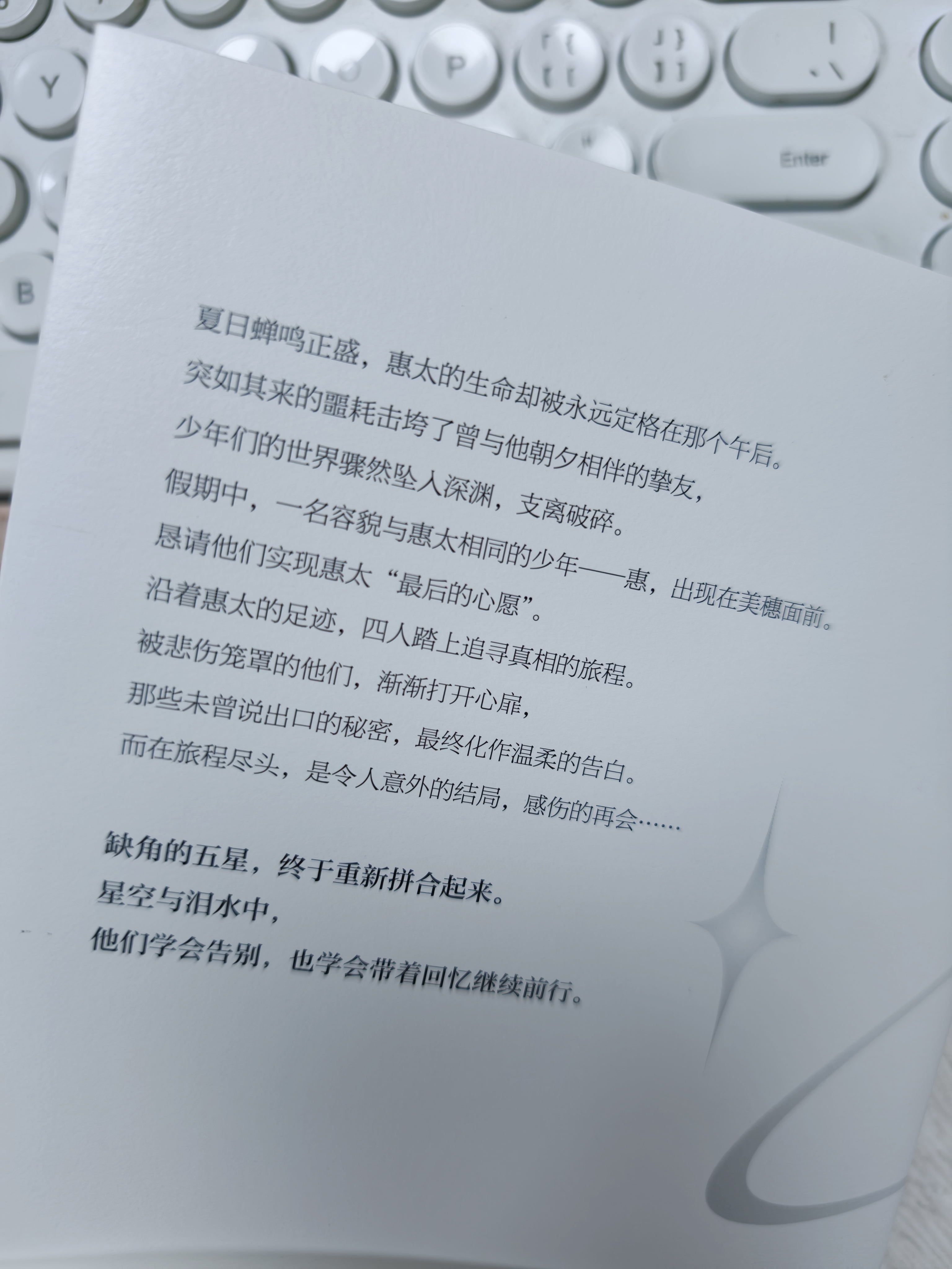 《然后,没有你的九月来临了》:青春的弦音 当蝉鸣在盛夏的余温里渐渐消散,天泽夏月的这本书如同一阵带着淡淡忧伤的风,轻轻拂过青春的旷野,留下一段关于成长、失去与救赎的动人故事。作者以细腻且深情的笔触,勾勒出青春岁月里友情与爱情的模样,它们如同一首悠扬又略带忧伤的乐章,奏响在少年们的心间,让读者沉浸其中,感受着那份纯粹与真挚。 友情:温暖与救赎的港湾 书中的友情是少年们在黑暗中相互扶持的明灯,是他们在迷茫时找到方向的指南针。惠太、美穗、舜、莉乃和大辉五人组成的团体,就像一个紧密相连的大家庭,彼此之间有着深厚的情感纽带。 惠太是这个团体的核心人物,他阳光开朗,充满活力,总是用自己的热情感染着身边的人。他的存在,让整个团体充满了欢声笑语。当惠太突然离世,这个团体瞬间陷入了巨大的悲痛之中,但他们并没有因此而分崩离析。相反,他们更加紧密地团结在一起,共同面对失去挚友的痛苦。 在追寻惠太死亡真相的旅程中,他们相互鼓励,相互支持。美穗虽然性格内向,但在朋友们的陪伴下,她逐渐变得坚强起来,勇敢地面对内心的恐惧;舜在棒球场上不断投球,朋友们默默地在一旁陪伴,给予他力量和勇气;莉乃用她毒舌的外表掩饰内心的脆弱,朋友们却能看穿她的伪装,给予她温暖的安慰;大辉在暴饮暴食的痛苦中挣扎,朋友们没有指责他,而是耐心地开导他,帮助他走出困境。 这种友情没有利益的纠葛,没有虚伪的客套,有的只是纯粹的关心和无私的付出。它让少年们在面对生活的挫折时,不再感到孤单和无助,而是充满了勇气和力量。就像在暴风雨中,他们相互依偎,共同撑起一把伞,抵御着风雨的侵袭。 爱情:青涩与隐秘的萌芽 书中的爱情如同春天里刚刚绽放的花朵,青涩而又美好。莉乃对惠太的暗恋,是青春里最纯真的情感表达。她收集惠太掉落的橡皮屑,就像收集星星的碎片一样,小心翼翼地珍藏着这份青涩的喜欢。她会在惠太比赛时,默默地为他加油助威;会在惠太遇到困难时,偷偷地关心和帮助他。 然而,莉乃的这份喜欢却始终没有说出口。她害怕被拒绝,害怕破坏了现有的友谊。这种隐秘而又纠结的情感,正是青春期爱情的典型特征。它充满了不确定性和羞涩感,让人既向往又害怕。 舜对莉乃的感情也同样是青涩而隐晦的。他将情书藏在棒球手套里,却始终没有勇气递出。他在棒球场上挥洒汗水,或许也是为了引起莉乃的注意。这种小心翼翼的喜欢,就像一颗种子,在舜的心中悄然发芽,却又不敢肆意生长。 书中的爱情没有轰轰烈烈的表白,没有惊天动地的誓言,有的只是那些看似微不足道的小举动,却蕴含着深深的情感。它让少年们体验到了爱情的甜蜜与苦涩,也让他们在成长的过程中,逐渐明白了爱情的真谛。 友情和爱情的交织:成长的催化剂 书中的友情和爱情,是青春岁月里最珍贵的财富。它们让我们看到了青春的伤痛与美好,也让我们明白,成长就是在失去中学会坚强,在告别中迎来新生。 它们让少年们在成长的道路上不再迷茫,不再孤单,而是充满了希望和勇气。就像九月的风,虽然带着一丝凉意,但却吹散了青春的迷雾,让我们看到了前方的光明。这份情感将铭刻在读者心中,成为我们青春记忆中最美好的篇章。