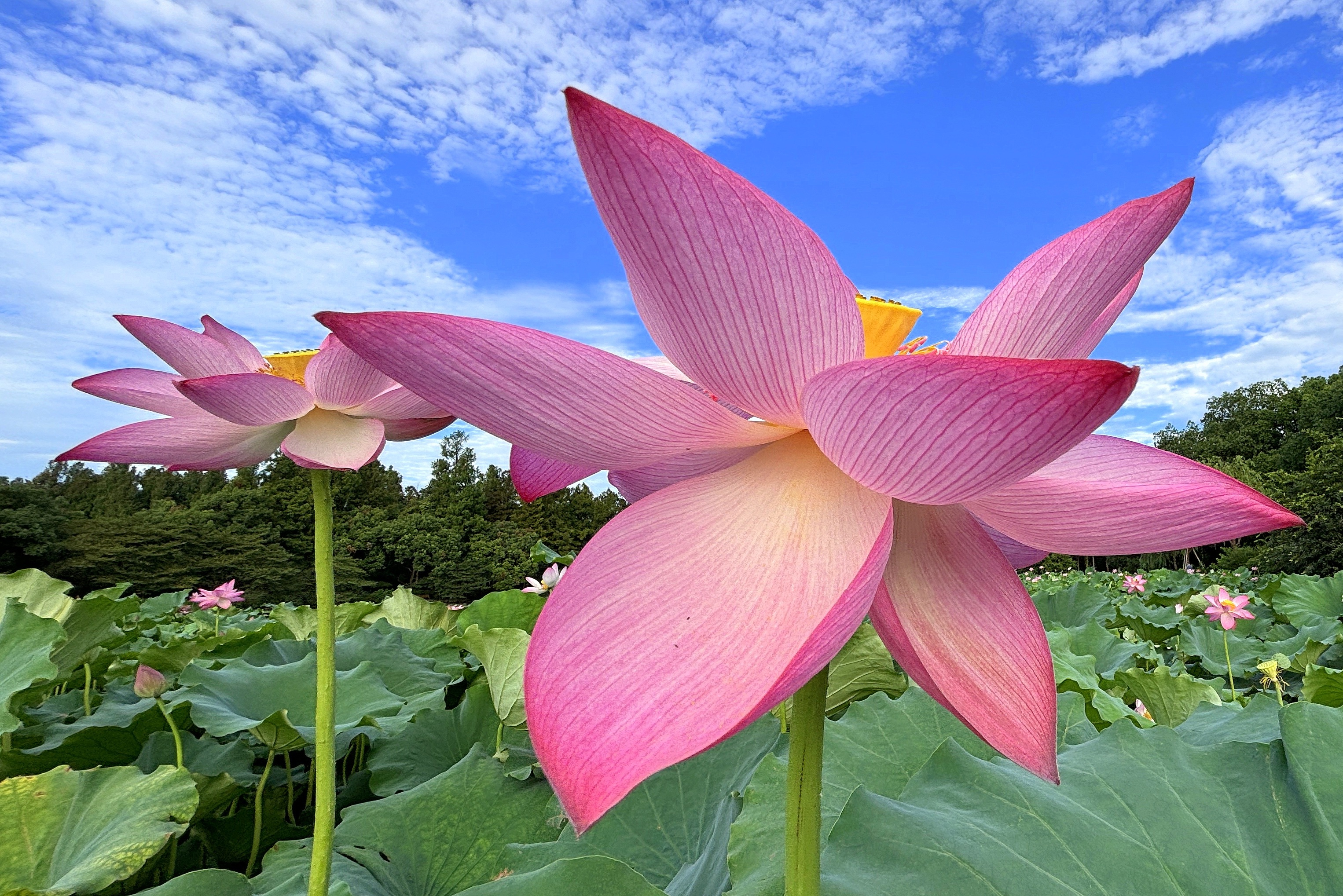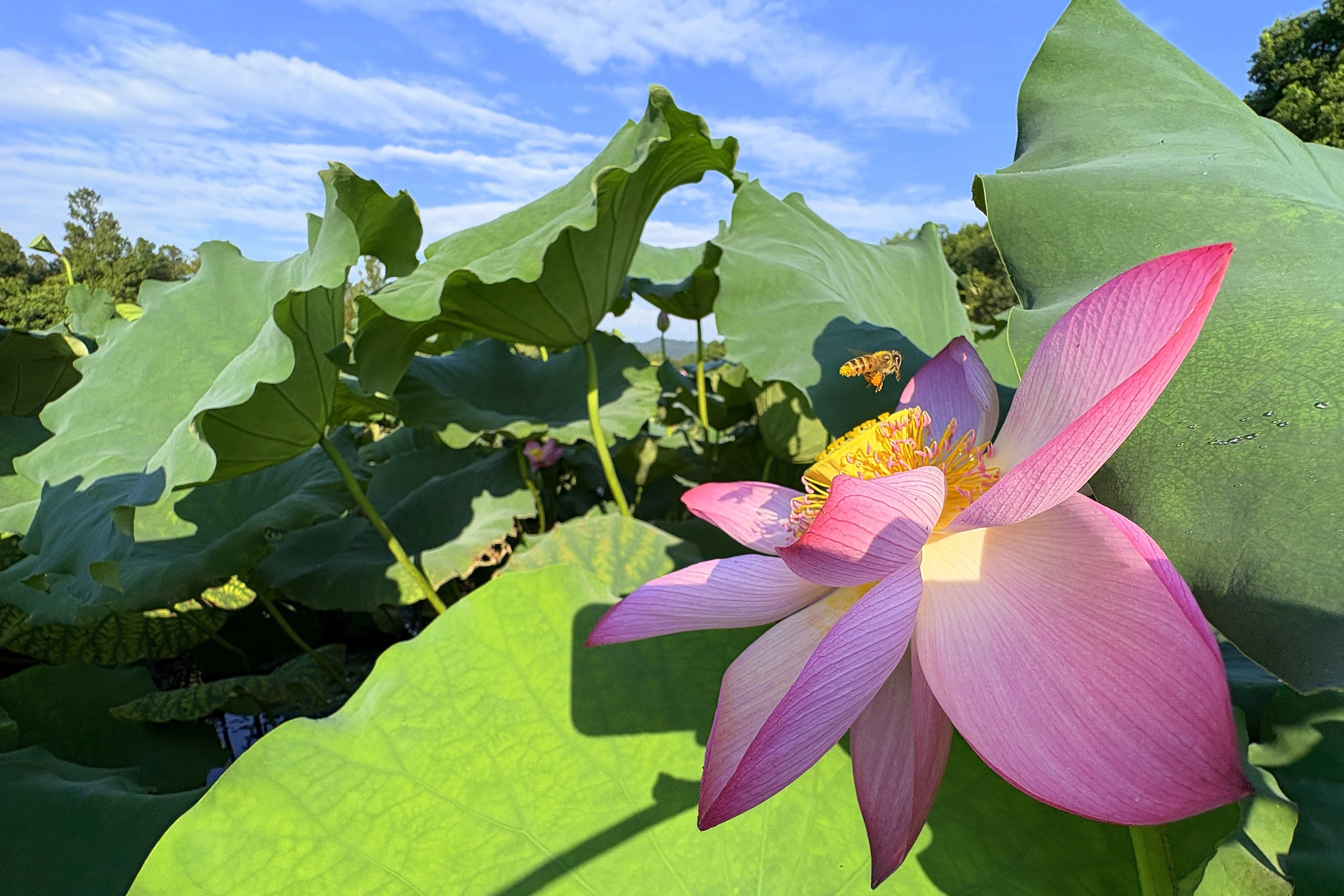 呱呱,在这小龙年悠长的回响里,我的思绪悠悠飘回那个盛夏的清晨。彼时,西湖的荷塘宛如一个巨大的蒸笼,暑气如轻纱般弥漫其中,袅袅娜娜地升腾着。荷叶在炽热的空气里肆意翻卷,深浅不一的碧绿交织在一起,似是大自然不经意间泼洒的颜料,晕染出一幅灵动而鲜活的画卷。 我突发奇想,借来青蛙那蹲在荷叶上的独特视角,手持手机,架上自拍杆,以仰视之姿开启这场别具一格的拍摄之旅。这一创意的灵感,恰似灵光乍现,源自青蛙“坐井观天”的趣味姿态,让我得以用一种全新的目光去审视这片荷塘。 瞧那接天的莲叶,宛如一把把巨大的绿色巨伞,错落有致地撑开在蓝天白云之下。它们层层叠叠,相互簇拥,仿佛在编织着一个清凉的世界,为那些在炎炎夏日中焦躁不安的动物们,提供了一处静谧而舒适的栖息之所。微风拂过,荷叶轻轻摇曳,发出沙沙的声响,似是在低声诉说着夏日的故事。 再看那映日荷花,宛如天边飘落的绚丽云霞,在晨风的轻抚下,悠悠地摇晃着。粉嫩的花瓣娇艳欲滴,在阳光的照耀下,闪烁着迷人的光泽,仿佛是大自然精心雕琢的艺术品。我屏住呼吸,轻轻按下快门,终于捕捉到了“接天莲叶无穷碧,映日荷花别样红”同框的绝美画面。那一刻,眼前的景象如同一束光,瞬间照亮了我的视野,让我为之眼前一亮,心中涌起一股难以言喻的喜悦。 这个独特的手机拍摄切入点,巧妙地将曲院风荷的自然背景融入其中。蓝天白云与荷叶构成了宏大的背景,宛如一幅淡雅的水墨画,而那娇艳的映日荷花则是画中的点睛之笔,二者相互映衬,相得益彰。尤其值得一提的是,那柔和的金色阳光如同一位神奇的画师,恰到好处地调整着色彩的饱和度。在自动与手动模式的微妙平衡之间,既完美地保留了荷花“别样红”的娇艳欲滴,又让蓝天白云荷叶的自然背景保持着水墨画般的淡雅韵味。每一朵大荷花在画面中占据着约四分之一的位置,与大背景同框,仿佛在诉说着一个关于夏日的浪漫故事。 在构图上,我力求做到既保留自然之美,又不失艺术之感。荷叶的舒展、荷花的绽放,以及蓝天白云的点缀,都经过精心安排,宛如古诗词中描绘的画面跃然眼前,充满了诗意与韵味。我用手机将这看似普通的场景转化为一个不凡的视角,这并非是相机无法完成的任务,但手机却以其独特的便捷性和灵活性,让我能够更加自由地捕捉那些稍纵即逝的美好瞬间。更重要的是,我将文学背景与自然背景不着痕迹地融入其中,二者相互成就,产生了“美”的奇妙化学反应。 那一刻,我突然恍然大悟:这何尝不是一种时空的折叠呢?南宋的杨万里或许从未想过,他在六月的西湖写下那流传千古的经典诗句,而800年后的我,却在同样的季节、同样的地点,用手机镜头让文字与影像完成了一场跨越时空的深情拥抱。这种浪漫,在游客们纷纷举起相机的瞬间,就已经找到了最完美的具象呈现。它不仅仅是一张照片,更是一段历史的延续,一种文化的传承。 如今,当我再次回望小龙年那个炎热的盛夏,心中满是感慨与眷恋。那片绿色的海洋和那朵朵娇艳的荷花,如同璀璨的星辰,镶嵌在我记忆的天空中,成为了我心中永恒的独家记忆。