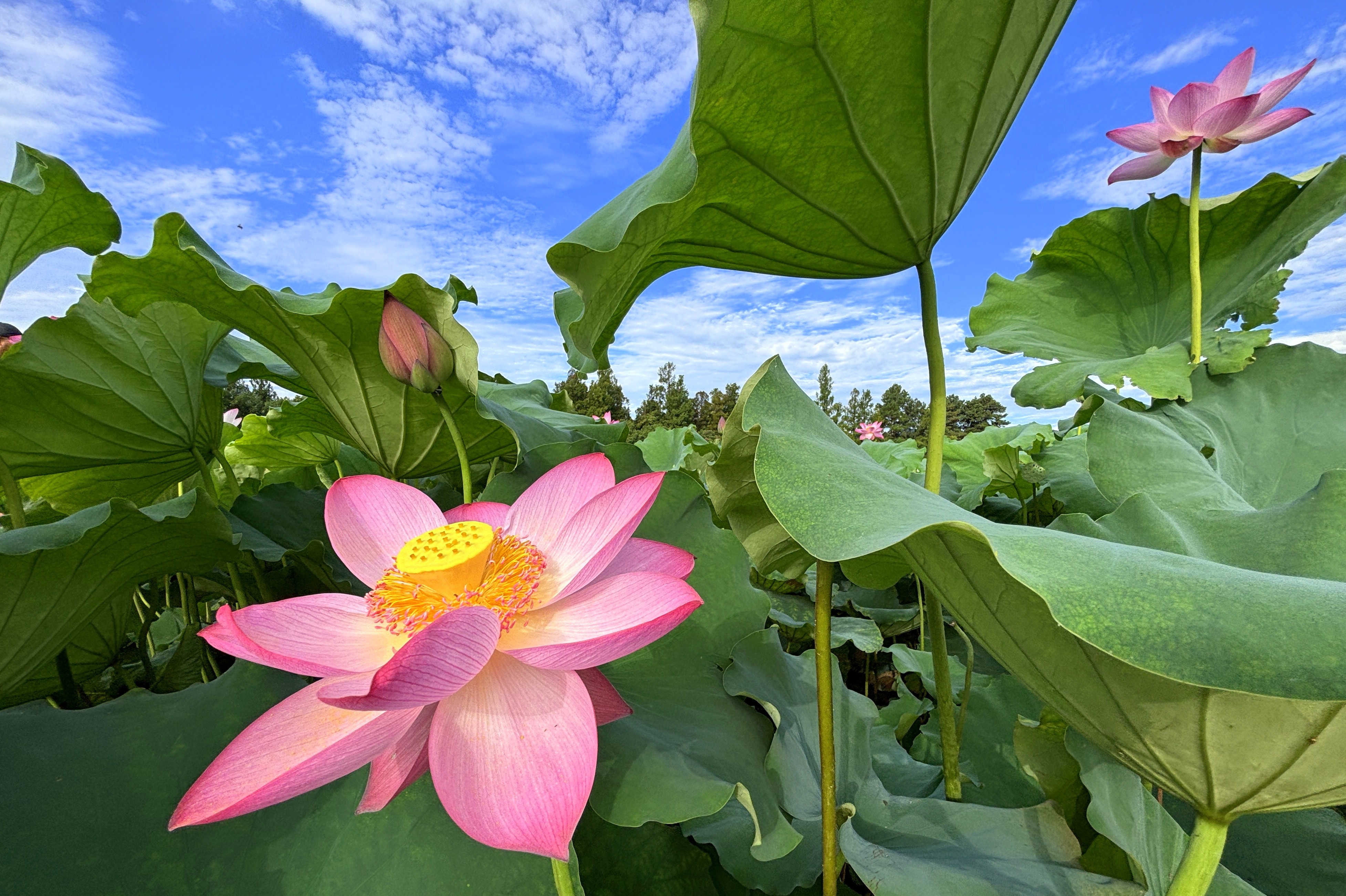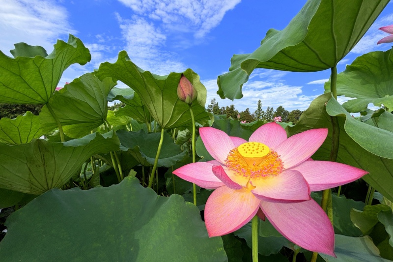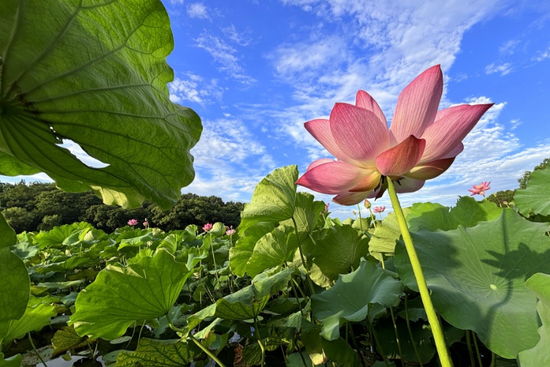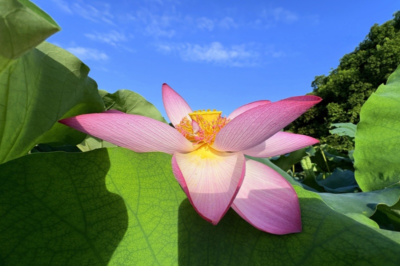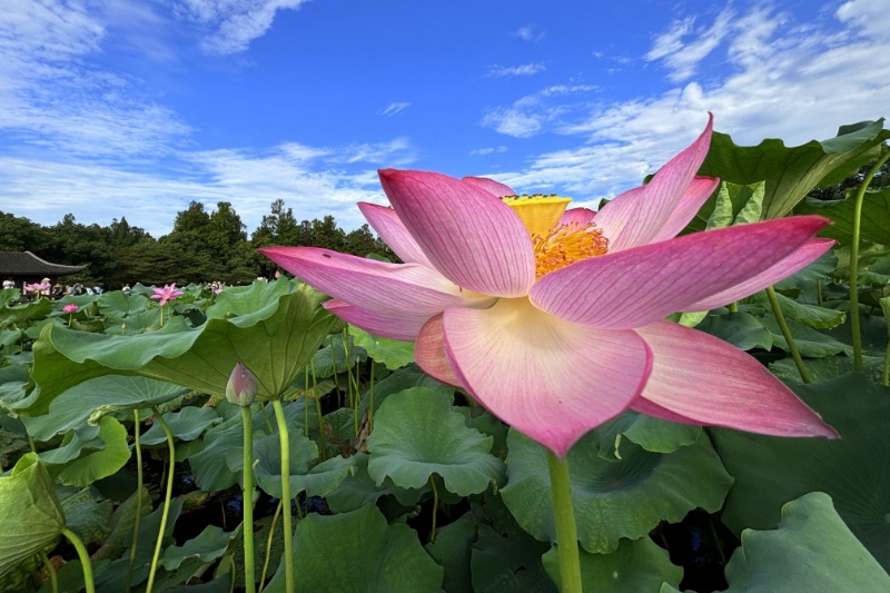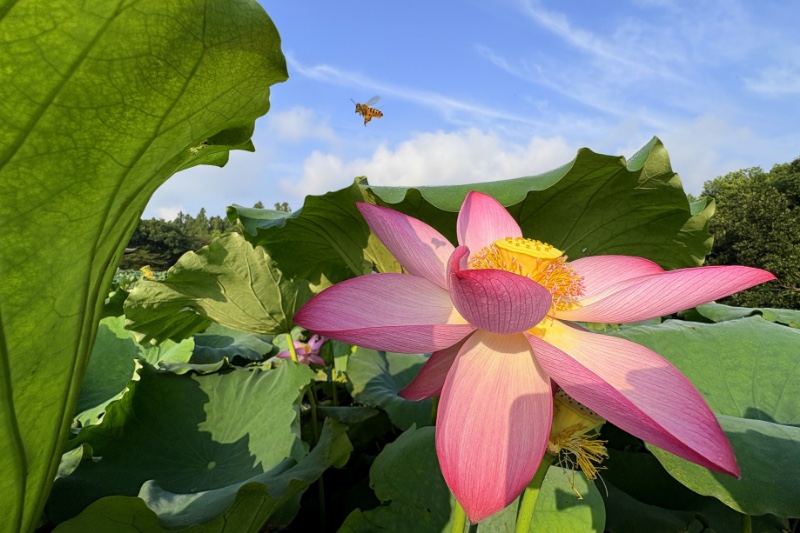 回望小龙年,用青蛙的视角仰拍接天莲叶与映日荷花同框。