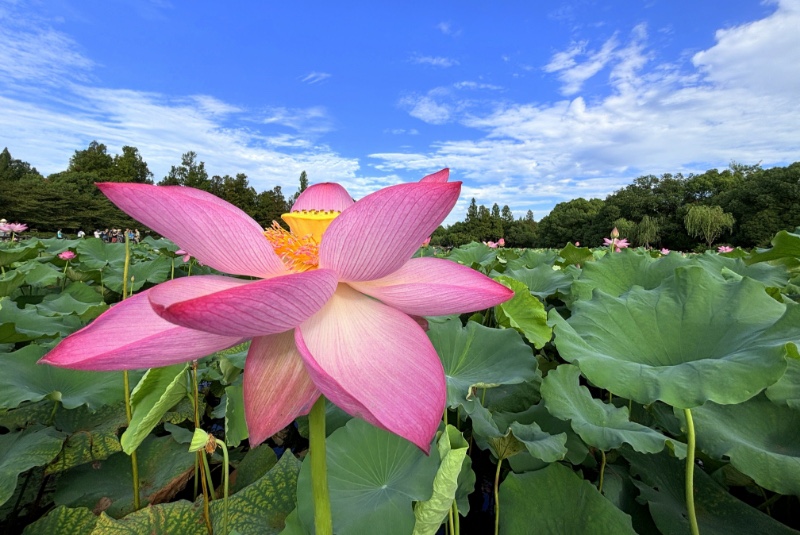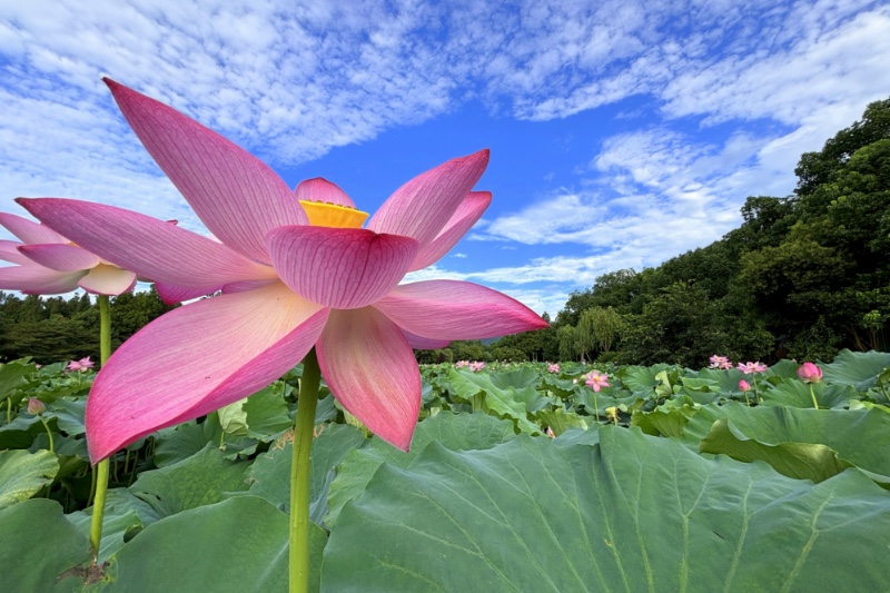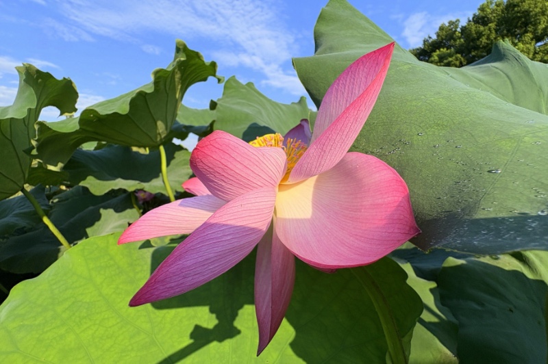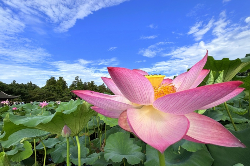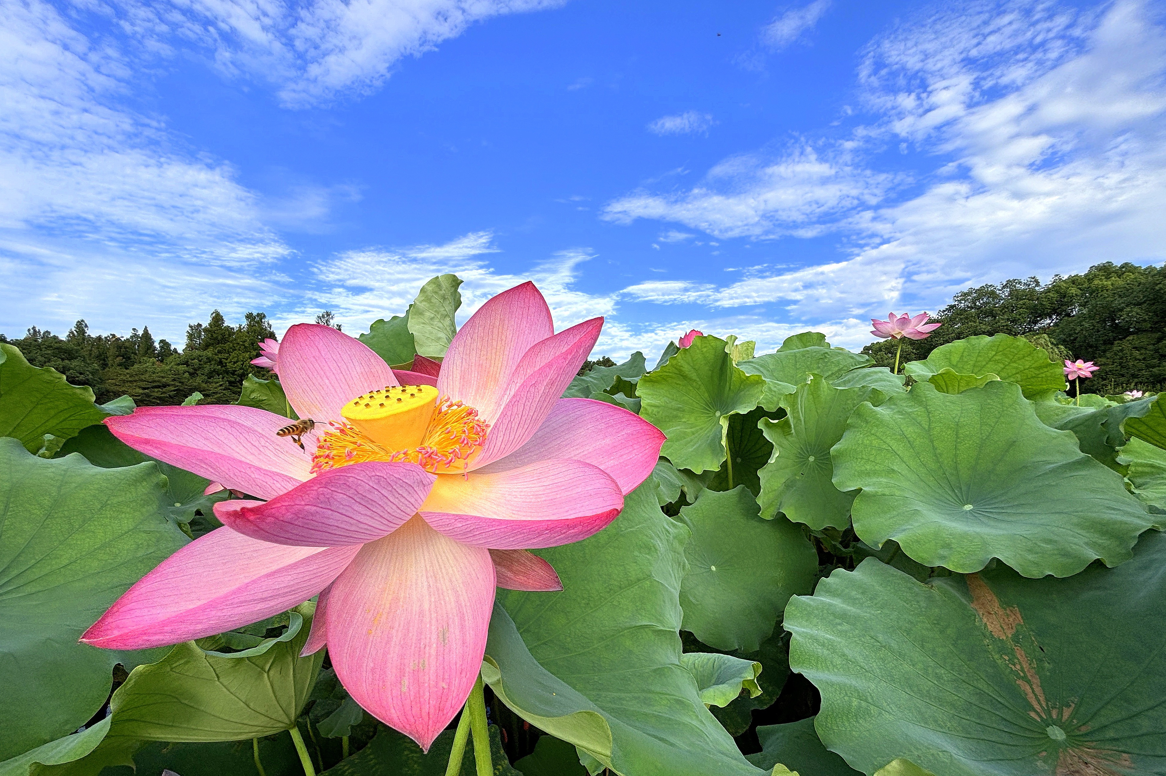 回望小龙年,用青蛙的视角仰拍接天莲叶与映日荷花同框。
