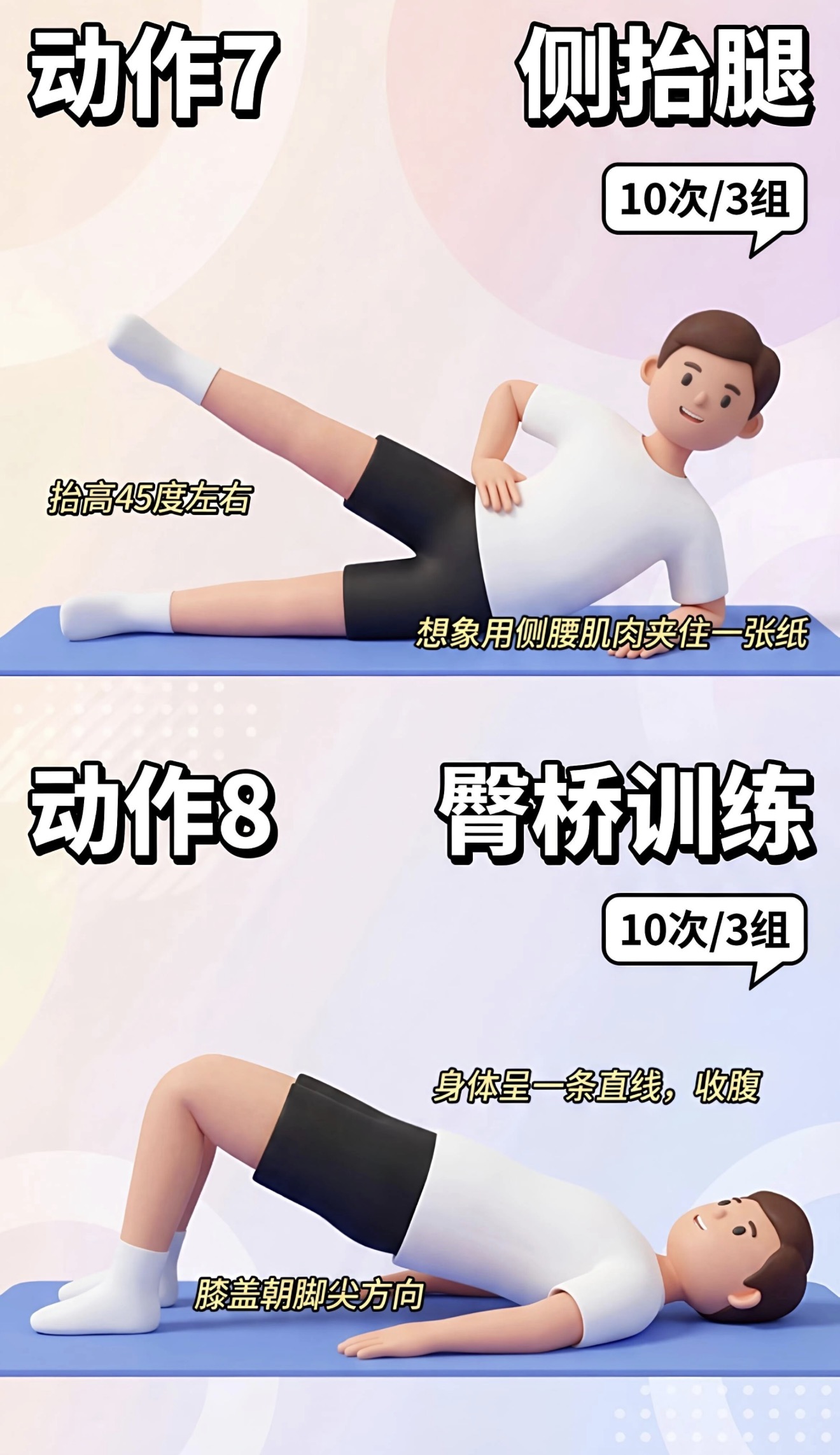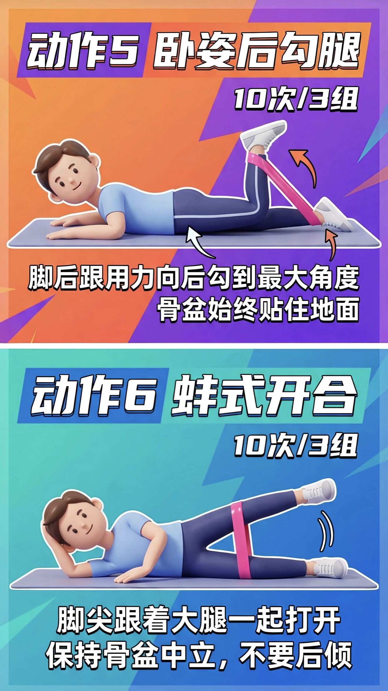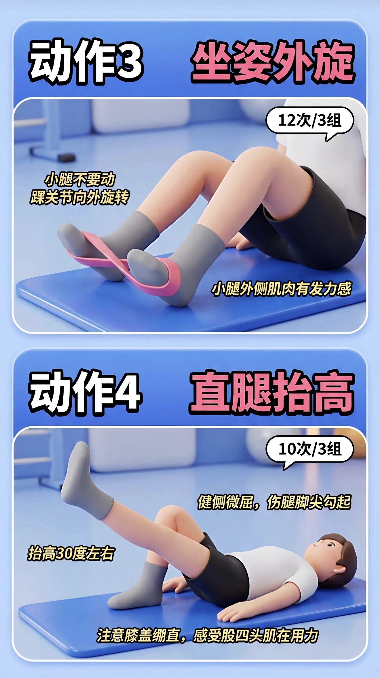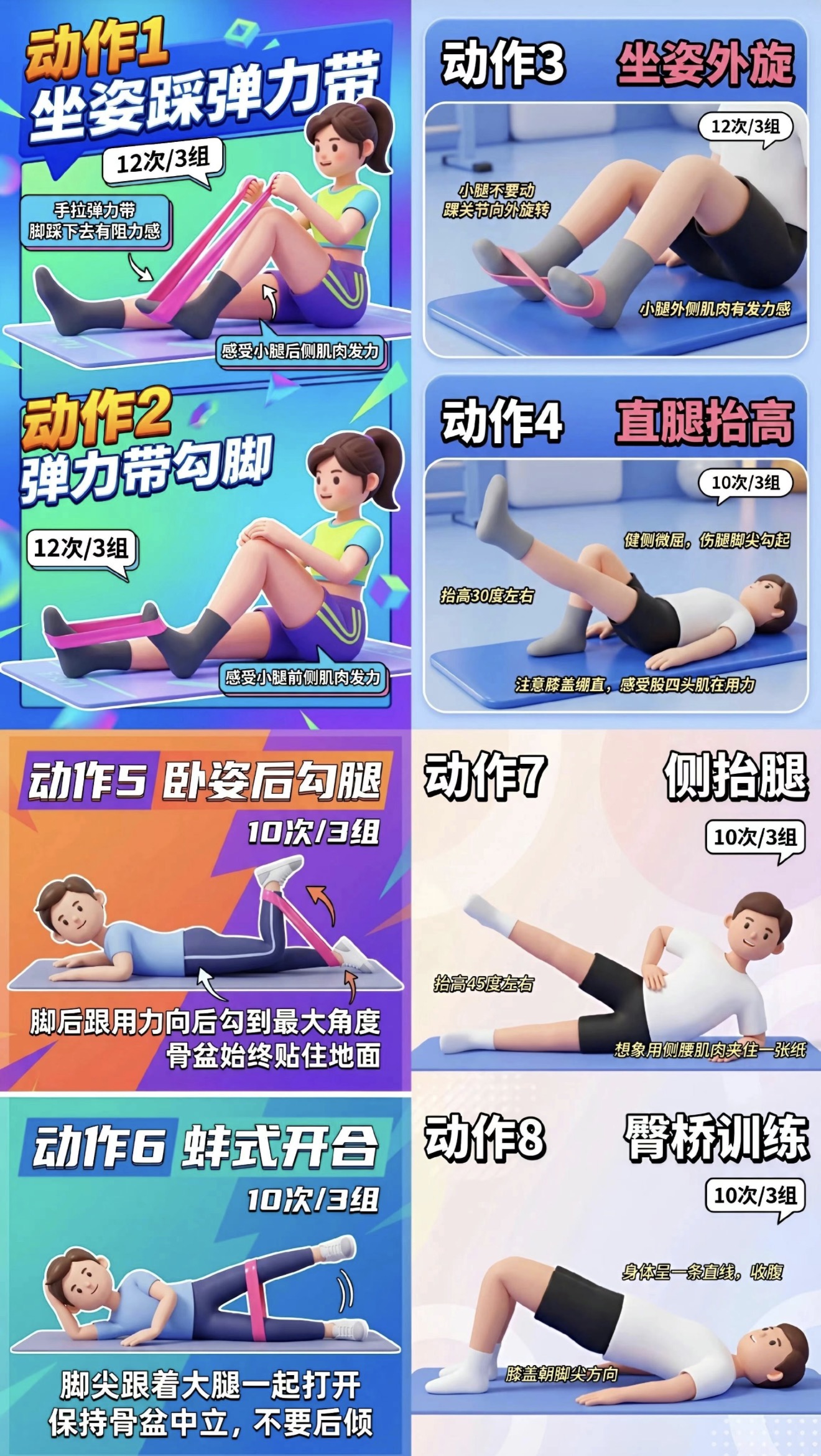 肌肉萎缩如何恢复?科学锻炼是核心!骨折/骨科术后下肢萎缩必练 骨折、骨科手术后,下肢肌肉萎缩是很多人的困扰,别担心,坚持针对性训练就能有效恢复!推荐8个超实用弹力带康复动作,简单易操作,坚持练习,腿部力量明显提升,走路、上下楼梯更平稳有力。 全程只需准备一根弹力带,8个动作精准发力,每个动作都附带训练要点,新手也能轻松掌握。 动作一:坐姿下踩弹力带 重点锻炼小腿后侧肌肉,强化小腿蹬踏力量,改善脚踝发力不足。 动作二:弹力带勾脚 针对性训练小腿前侧肌肉,缓解脚踝僵硬,提升脚踝灵活性。 动作三:坐姿外旋 激活小腿外侧肌群,增强腿部外侧稳定性,减少走路歪斜问题。 动作四:直腿抬高 强化大腿前侧股四头肌,是术后恢复大腿力量的基础核心动作。 动作五:卧姿勾腿 锻炼大腿后侧腘绳肌,均衡前后侧肌肉力量,让腿部发力更协调。 动作六:蚌式开合 专注训练臀部肌肉,改善臀肌无力,为下肢提供更好的支撑。 动作七:侧抬腿 激活臀腿两侧肌肉,矫正腿型,提升髋关节与腿部整体稳定性。 动作八:臀桥 全面锻炼臀腿整体肌群,强化核心与下肢力量,助力术后整体恢复。