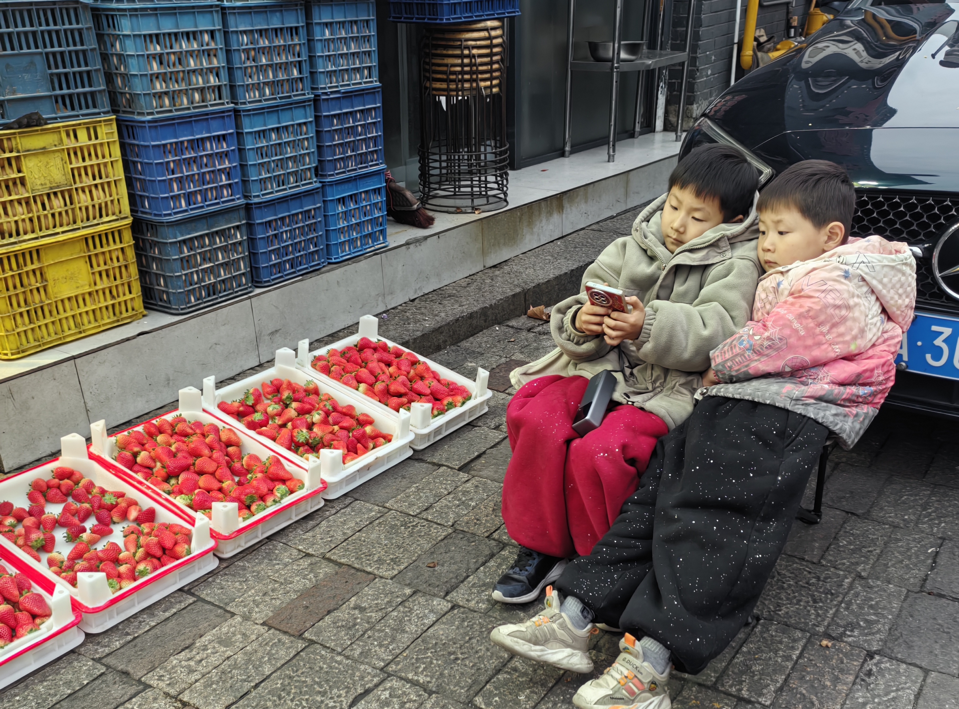 新年第一天,给爸妈看水果摊又能玩手机,真惬意。