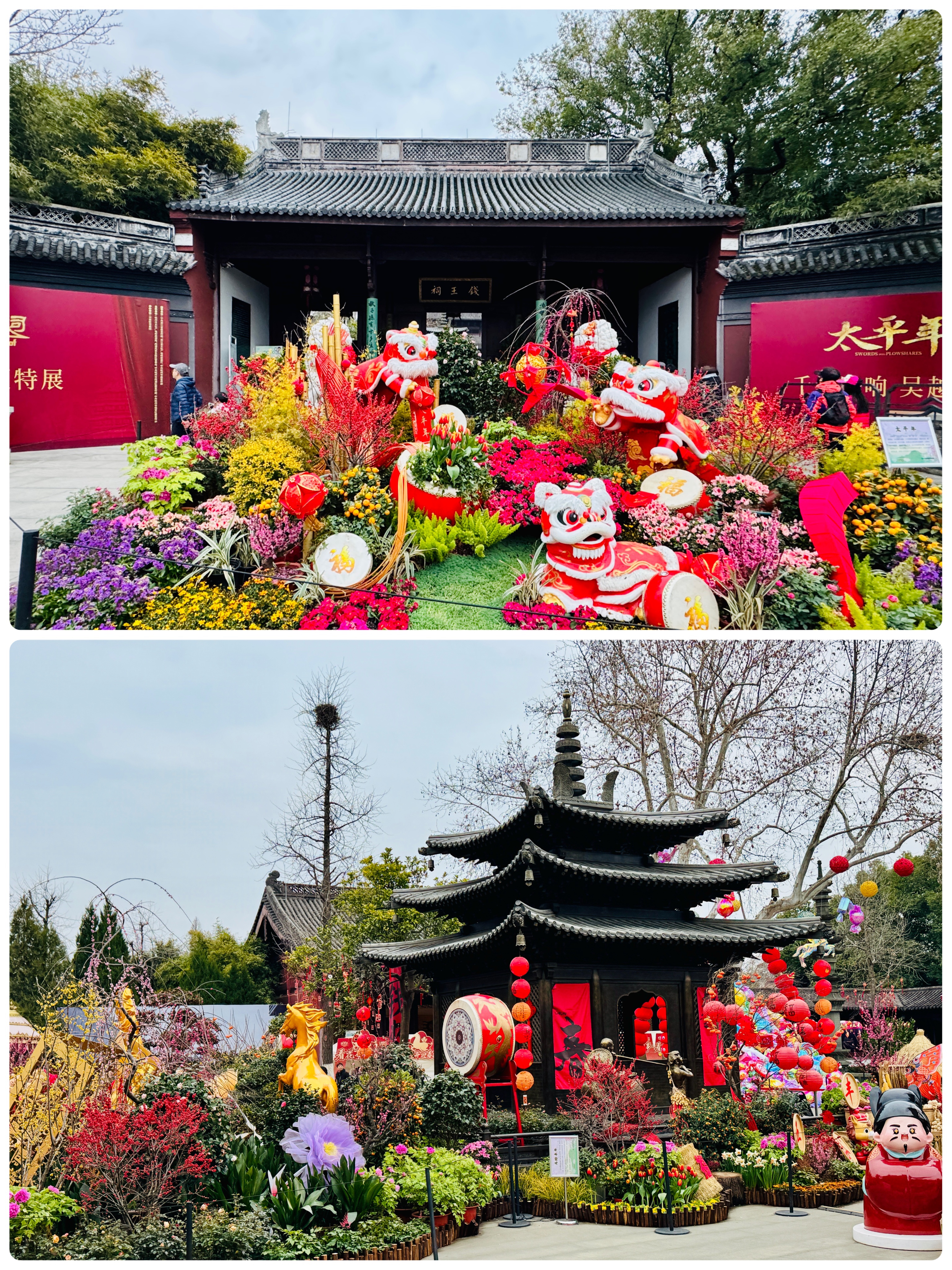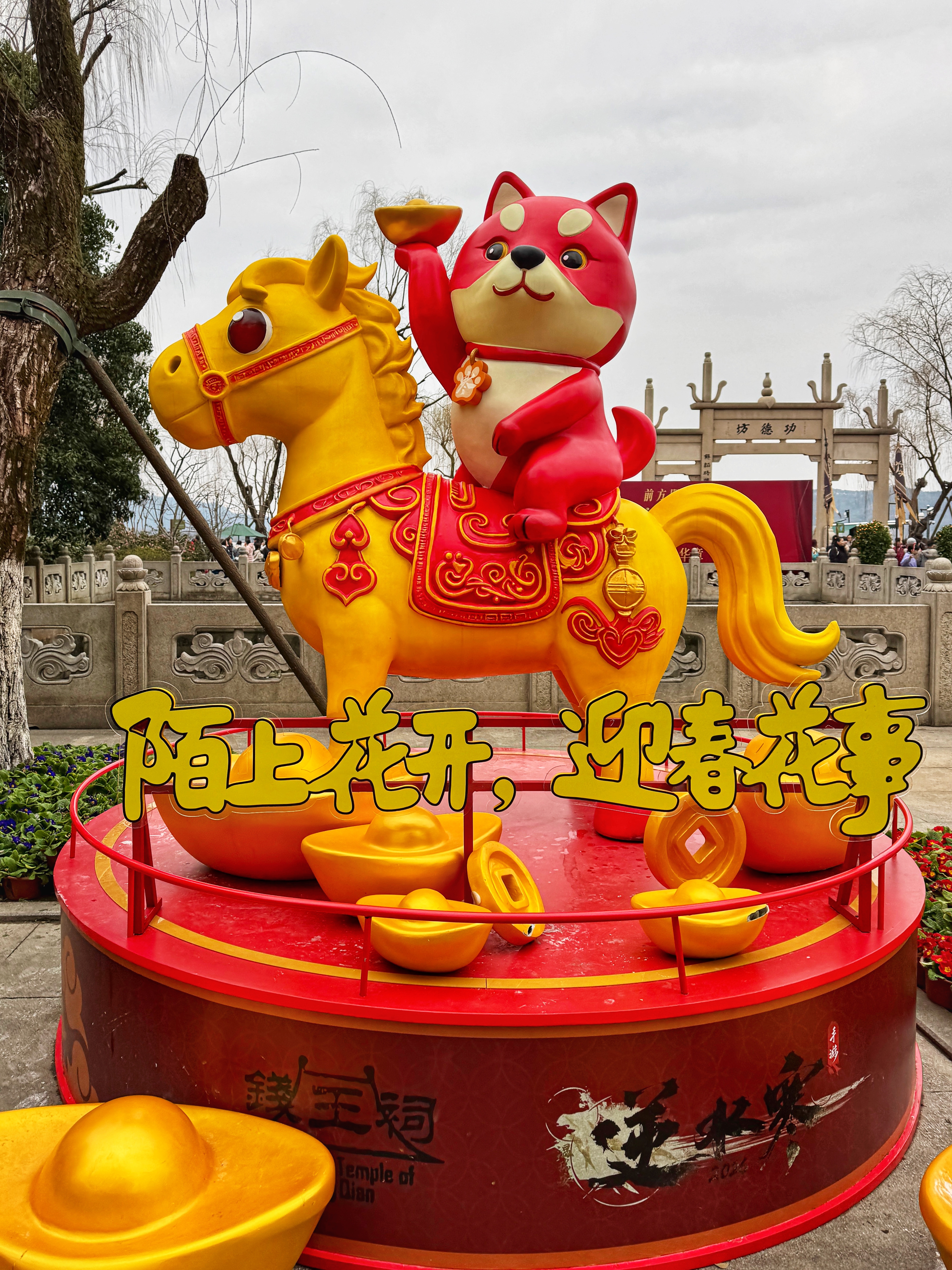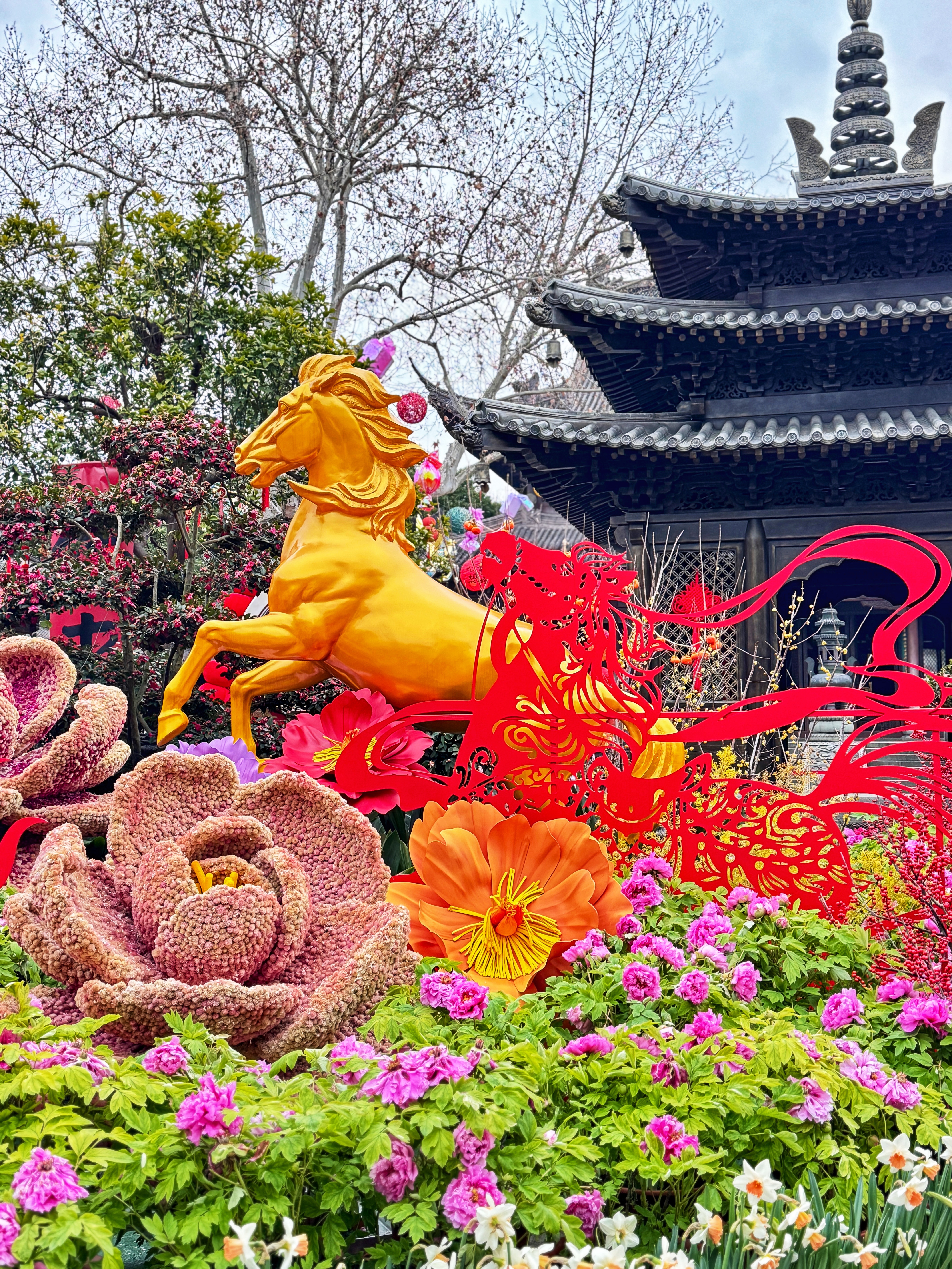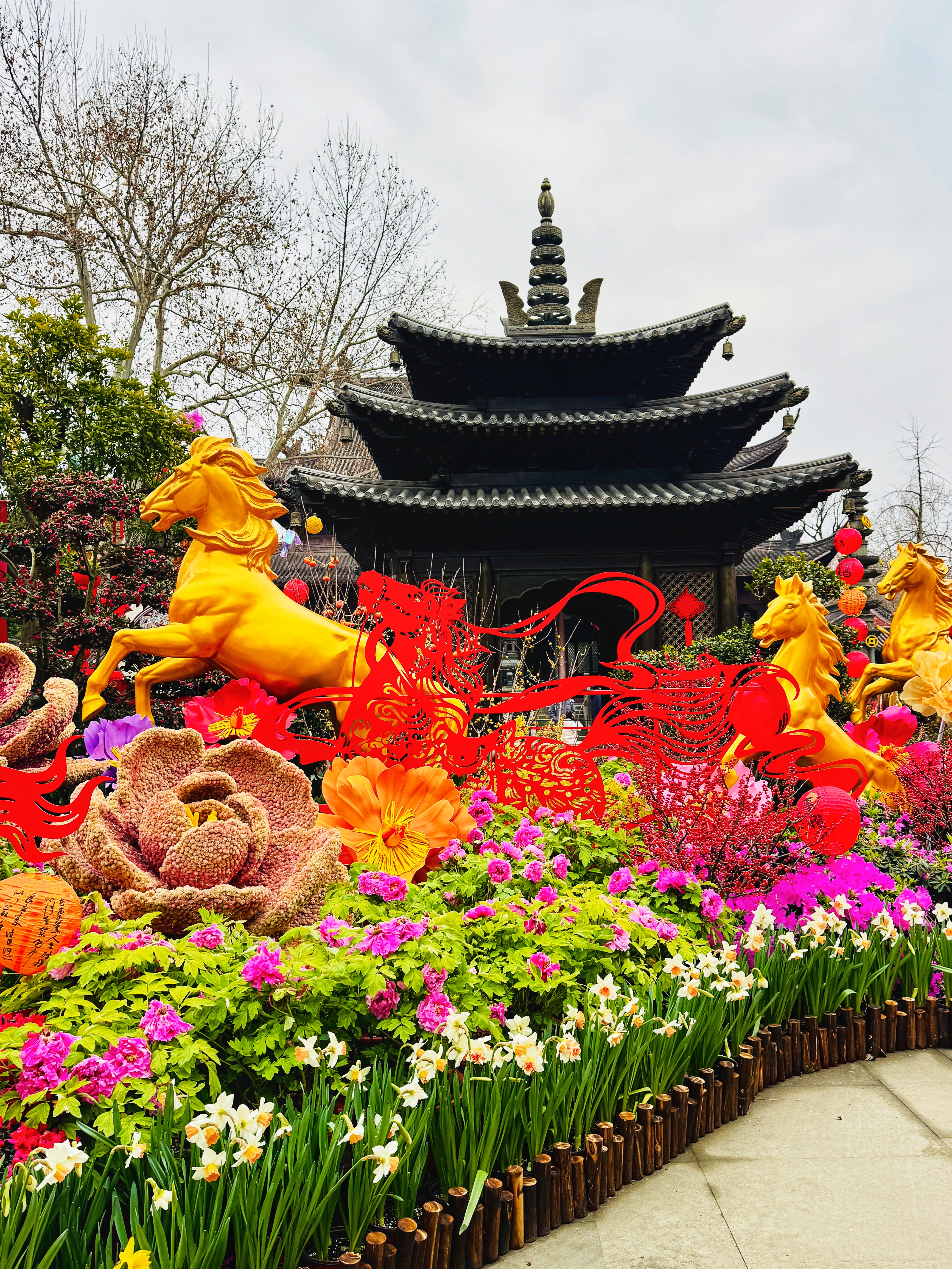 大年初一的杭州钱王祠的新春盛景,充满了宋韵年味与江南春气: 1. 门庭焕彩:五牌坊下“阳光彩虹小福马”迎宾,祠外吉狮献瑞、春联红灯高挂;《跃马花间》造景金鞍映繁花,地面元宝地贴讨彩头,游人接踵,汉服身影随处可见。 2. 红墙梅香:网红红墙下蜡梅、白梅疏影横斜,暗香浮动;阅礼堂牡丹缀廊,铜献殿“马踏丰年”布景配“糖福禄”糖果瀑布,童趣与古雅相映;室内迎春花展聚杜鹃、热带兰等近60种冬花,“大鱼海棠”纱艺金鱼似游花月间。 3. 雅俗共欢:《太平年》特展复刻钱王议事、纳土归宋场景,戏服道具可赏;越剧、非遗戏法每日上演,香火轻绕古建,人声、乐声、花香交织成最浓的新春氛围。 钱王祠下春风劲, 跃马钱塘福满门。