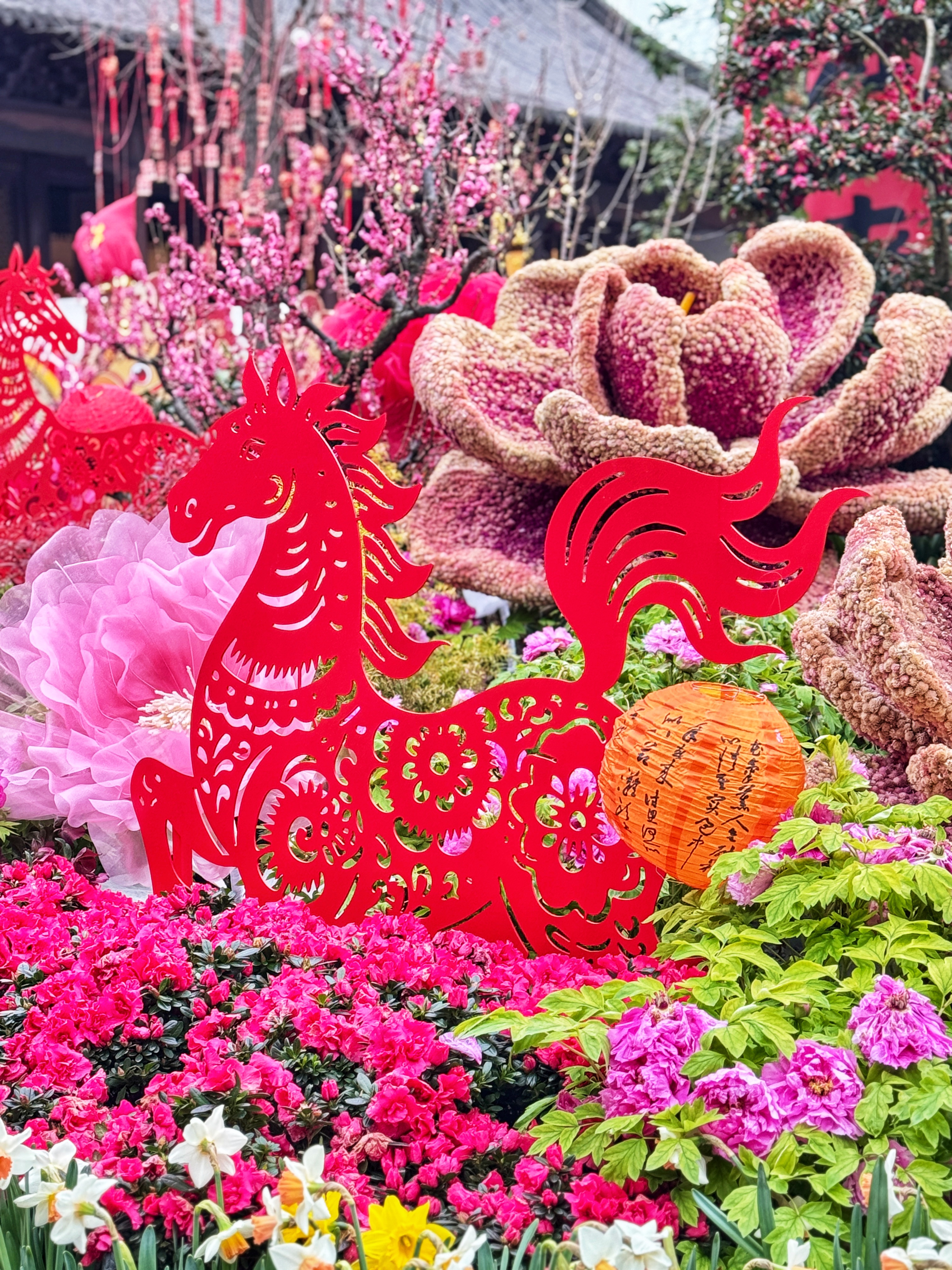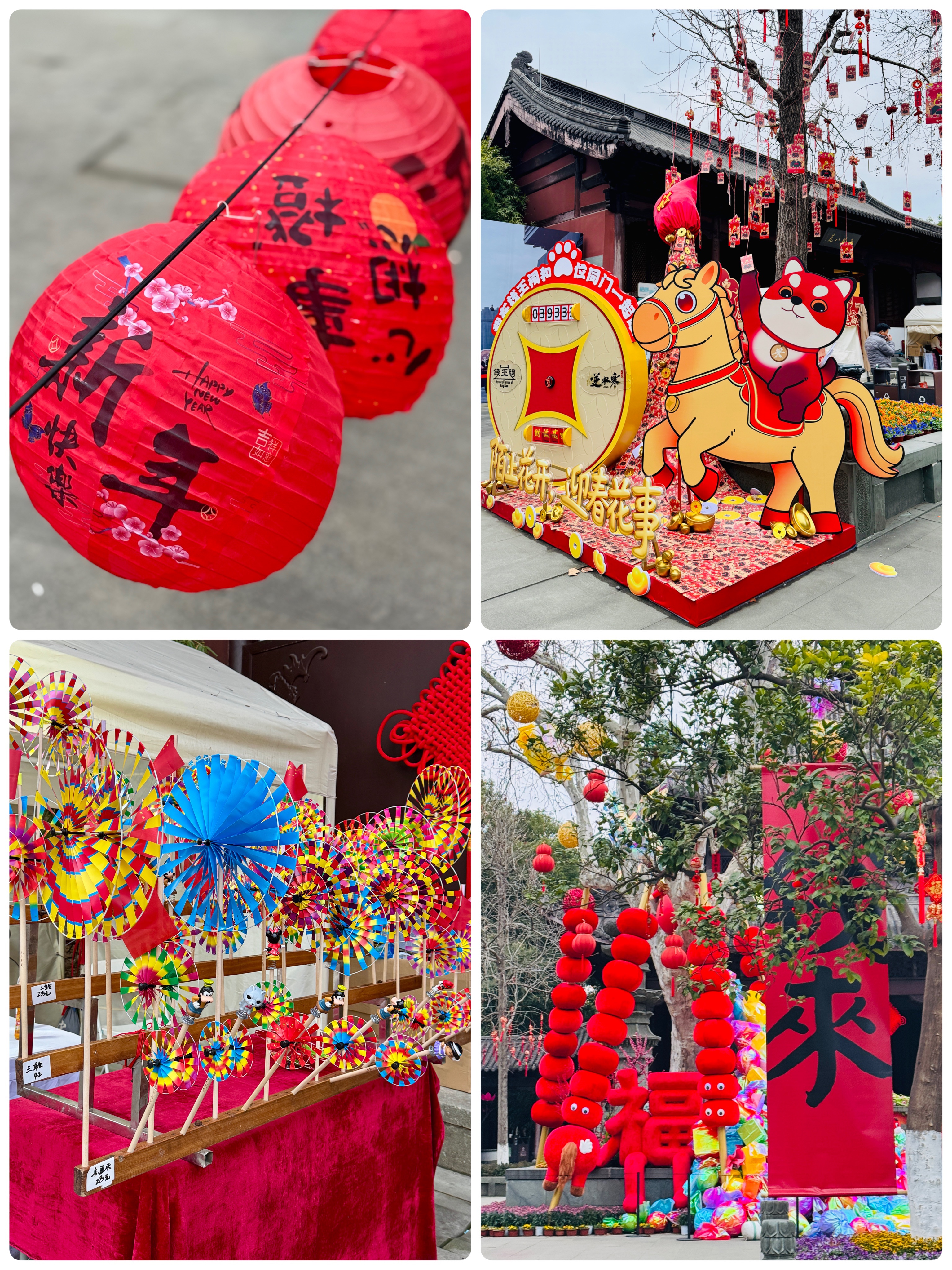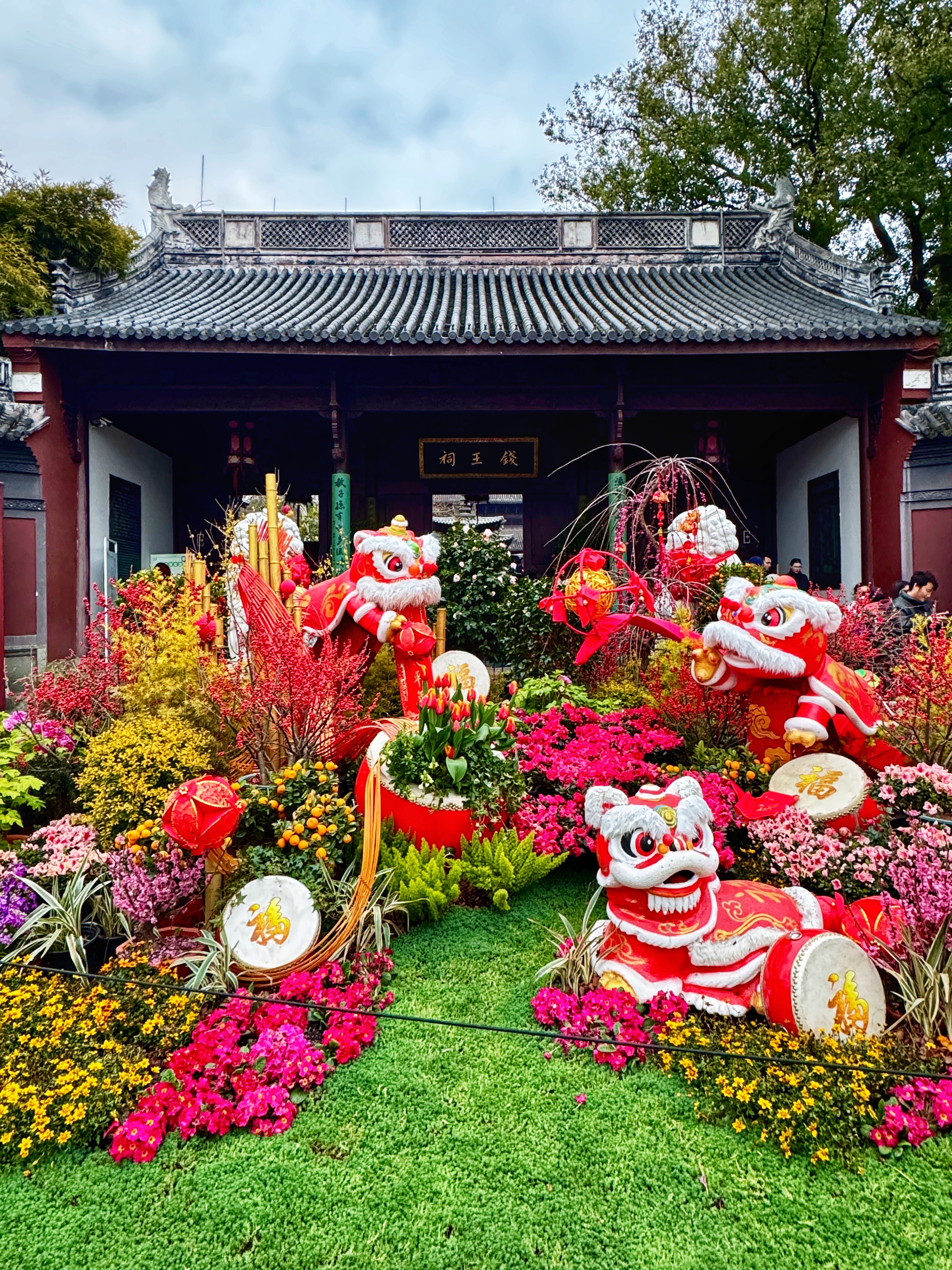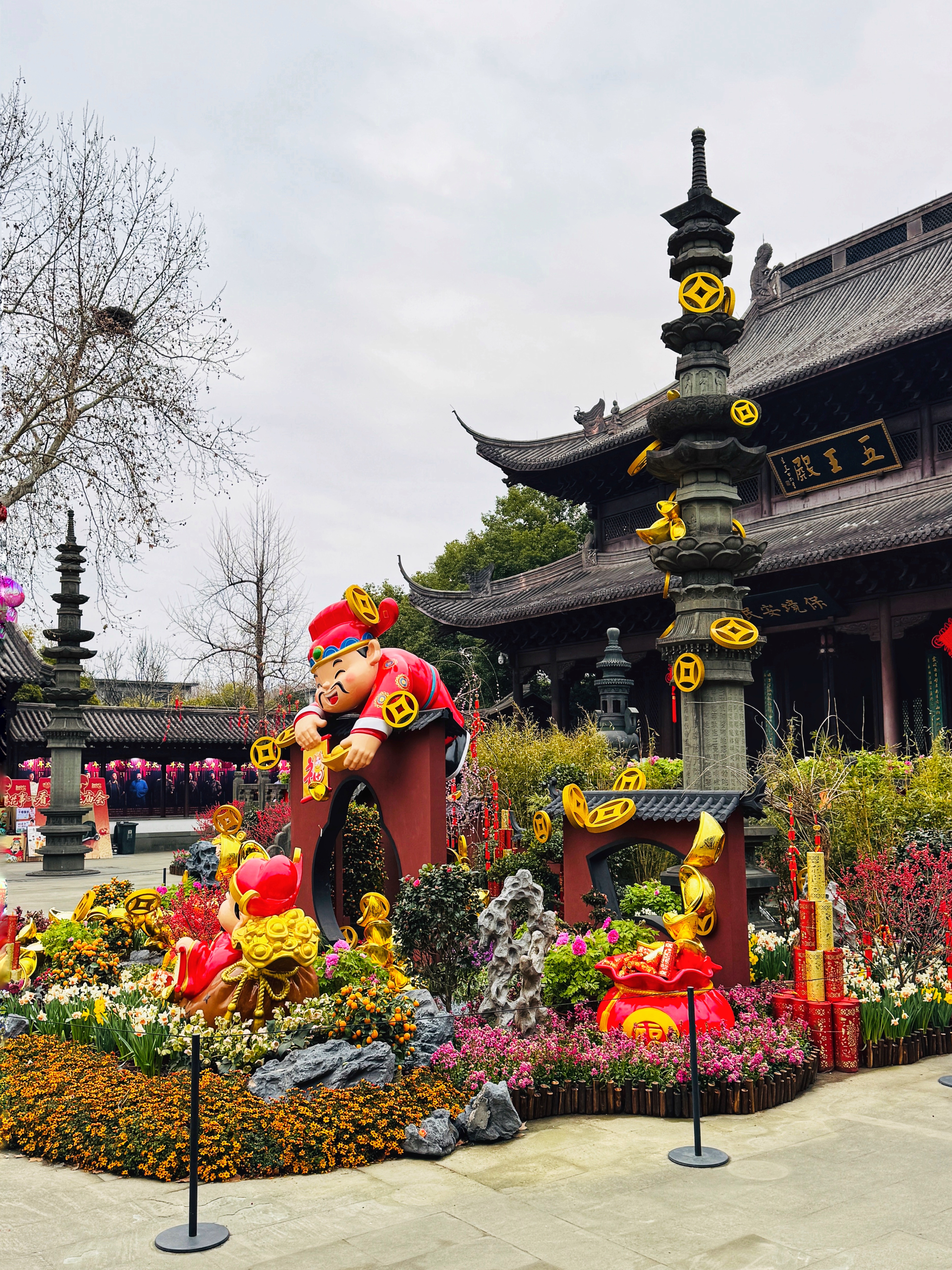 大年初一的杭州钱王祠的新春盛景,充满了宋韵年味与江南春气: 1. 门庭焕彩:五牌坊下“阳光彩虹小福马”迎宾,祠外吉狮献瑞、春联红灯高挂;《跃马花间》造景金鞍映繁花,地面元宝地贴讨彩头,游人接踵,汉服身影随处可见。 2. 红墙梅香:网红红墙下蜡梅、白梅疏影横斜,暗香浮动;阅礼堂牡丹缀廊,铜献殿“马踏丰年”布景配“糖福禄”糖果瀑布,童趣与古雅相映;室内迎春花展聚杜鹃、热带兰等近60种冬花,“大鱼海棠”纱艺金鱼似游花月间。 3. 雅俗共欢:《太平年》特展复刻钱王议事、纳土归宋场景,戏服道具可赏;越剧、非遗戏法每日上演,香火轻绕古建,人声、乐声、花香交织成最浓的新春氛围。 钱王祠下春风劲, 跃马钱塘福满门。