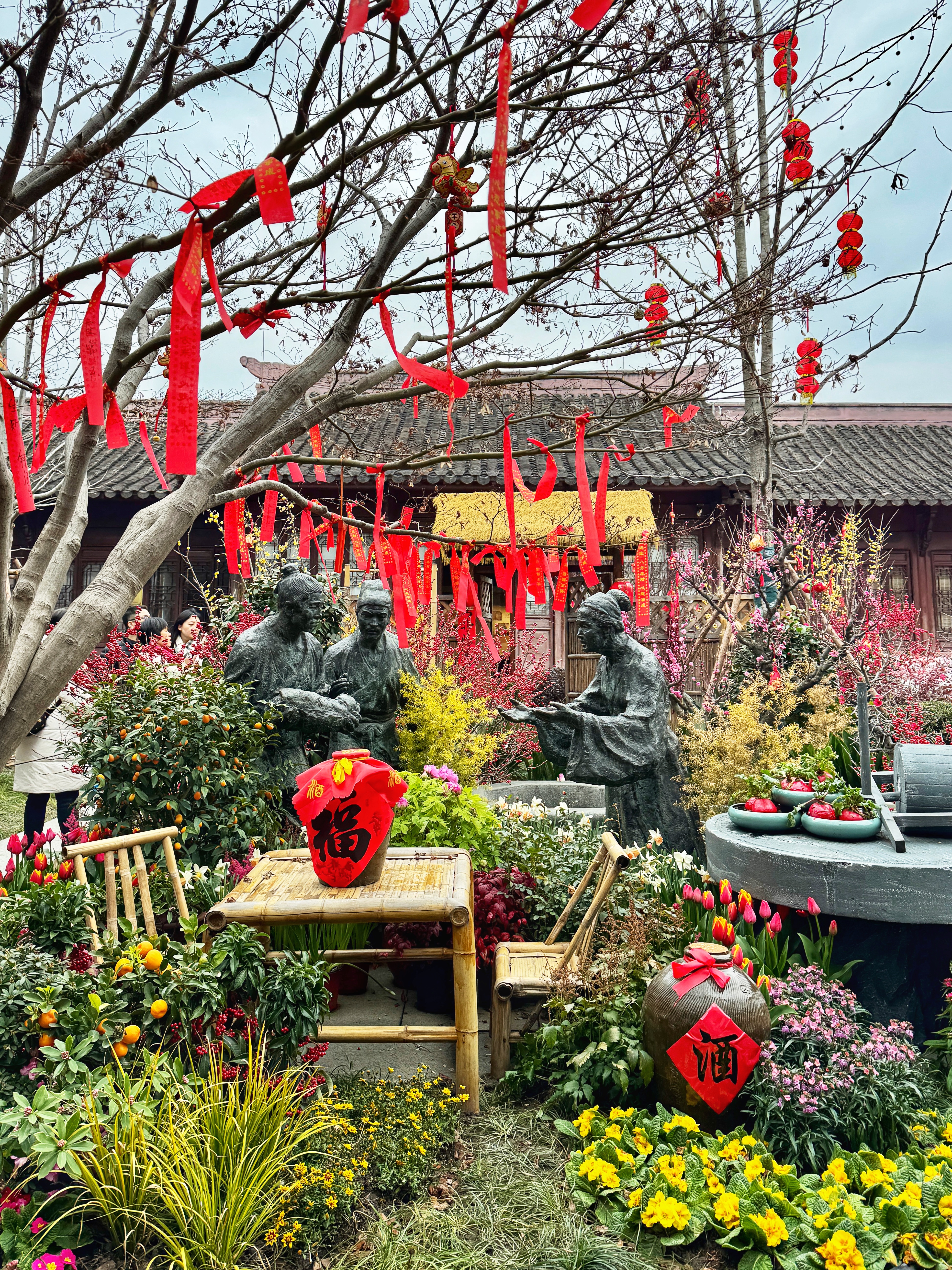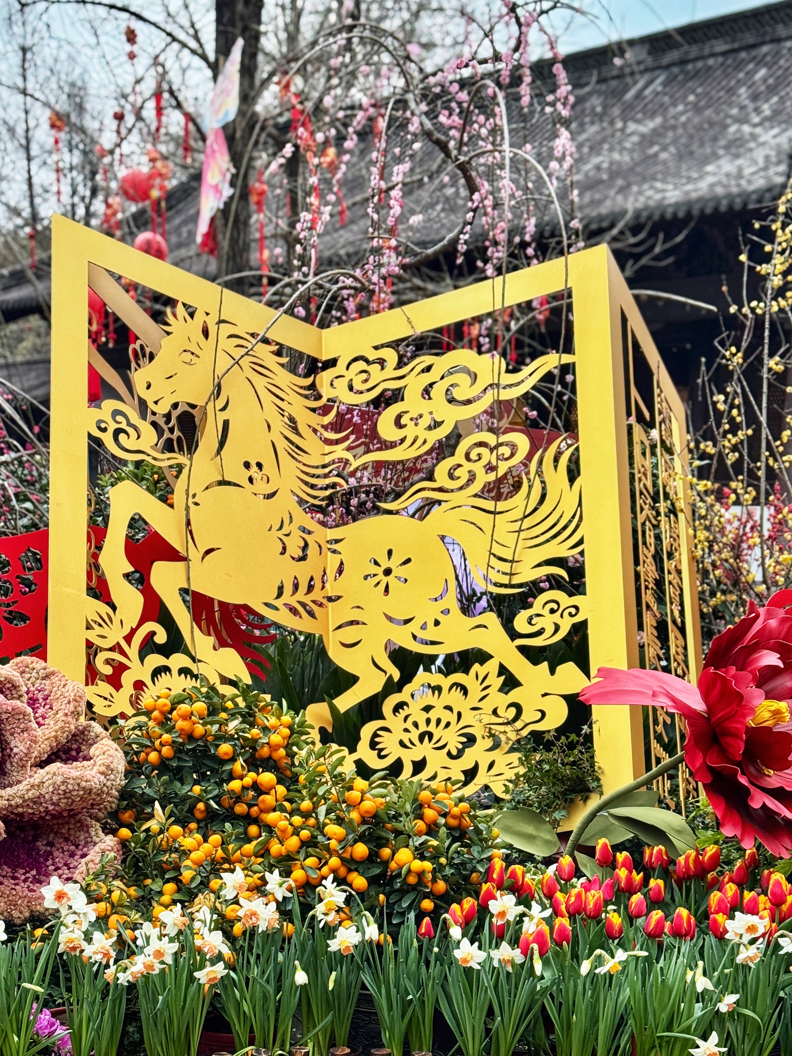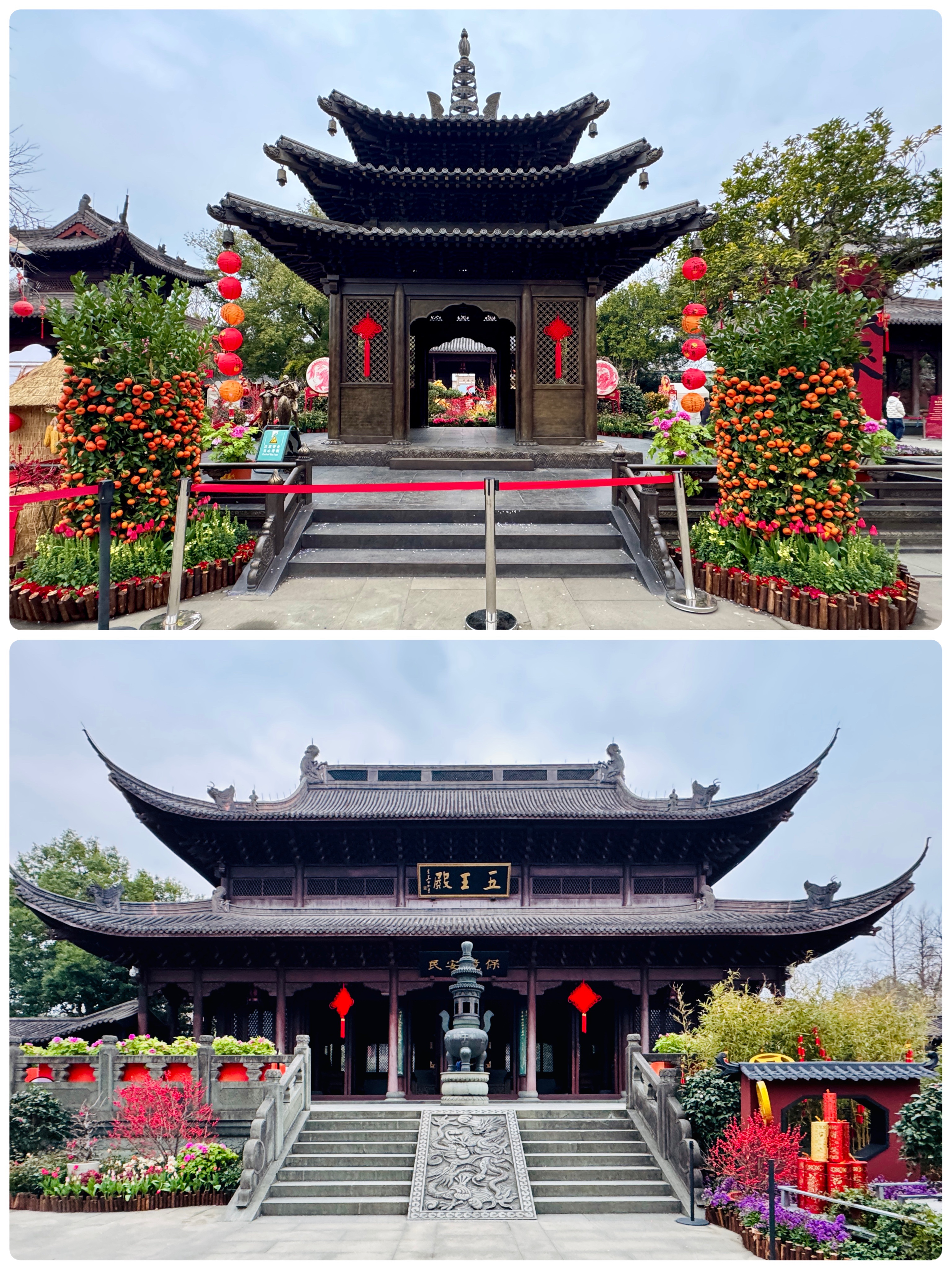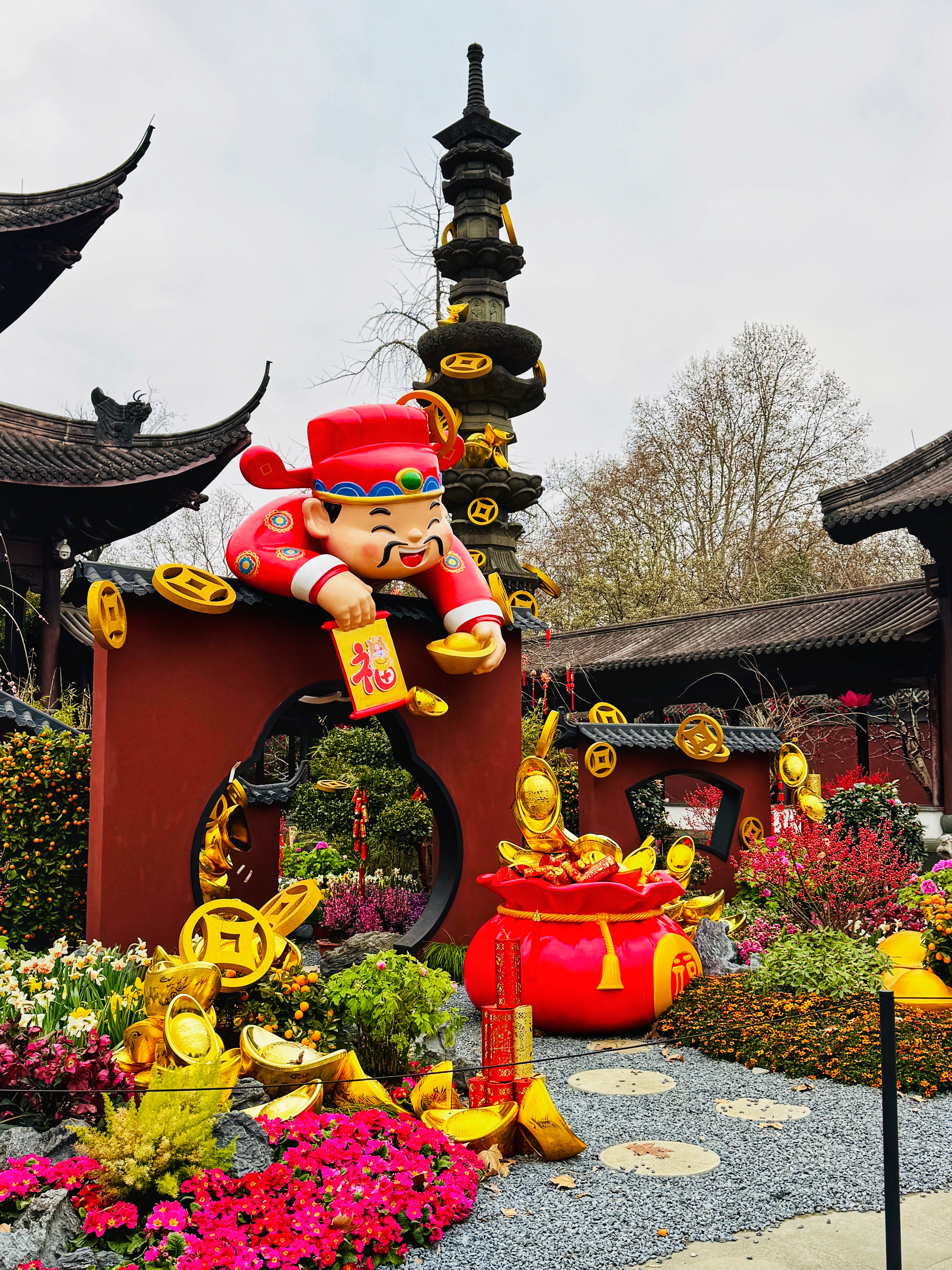 大年初一的杭州钱王祠的新春盛景,充满了宋韵年味与江南春气: 1. 门庭焕彩:五牌坊下“阳光彩虹小福马”迎宾,祠外吉狮献瑞、春联红灯高挂;《跃马花间》造景金鞍映繁花,地面元宝地贴讨彩头,游人接踵,汉服身影随处可见。 2. 红墙梅香:网红红墙下蜡梅、白梅疏影横斜,暗香浮动;阅礼堂牡丹缀廊,铜献殿“马踏丰年”布景配“糖福禄”糖果瀑布,童趣与古雅相映;室内迎春花展聚杜鹃、热带兰等近60种冬花,“大鱼海棠”纱艺金鱼似游花月间。 3. 雅俗共欢:《太平年》特展复刻钱王议事、纳土归宋场景,戏服道具可赏;越剧、非遗戏法每日上演,香火轻绕古建,人声、乐声、花香交织成最浓的新春氛围。 钱王祠下春风劲, 跃马钱塘福满门。