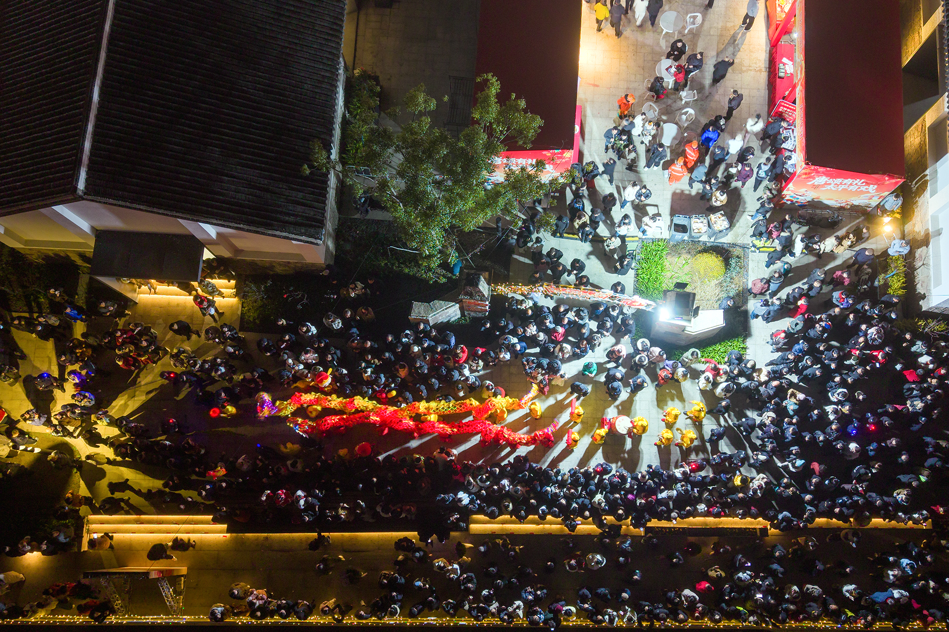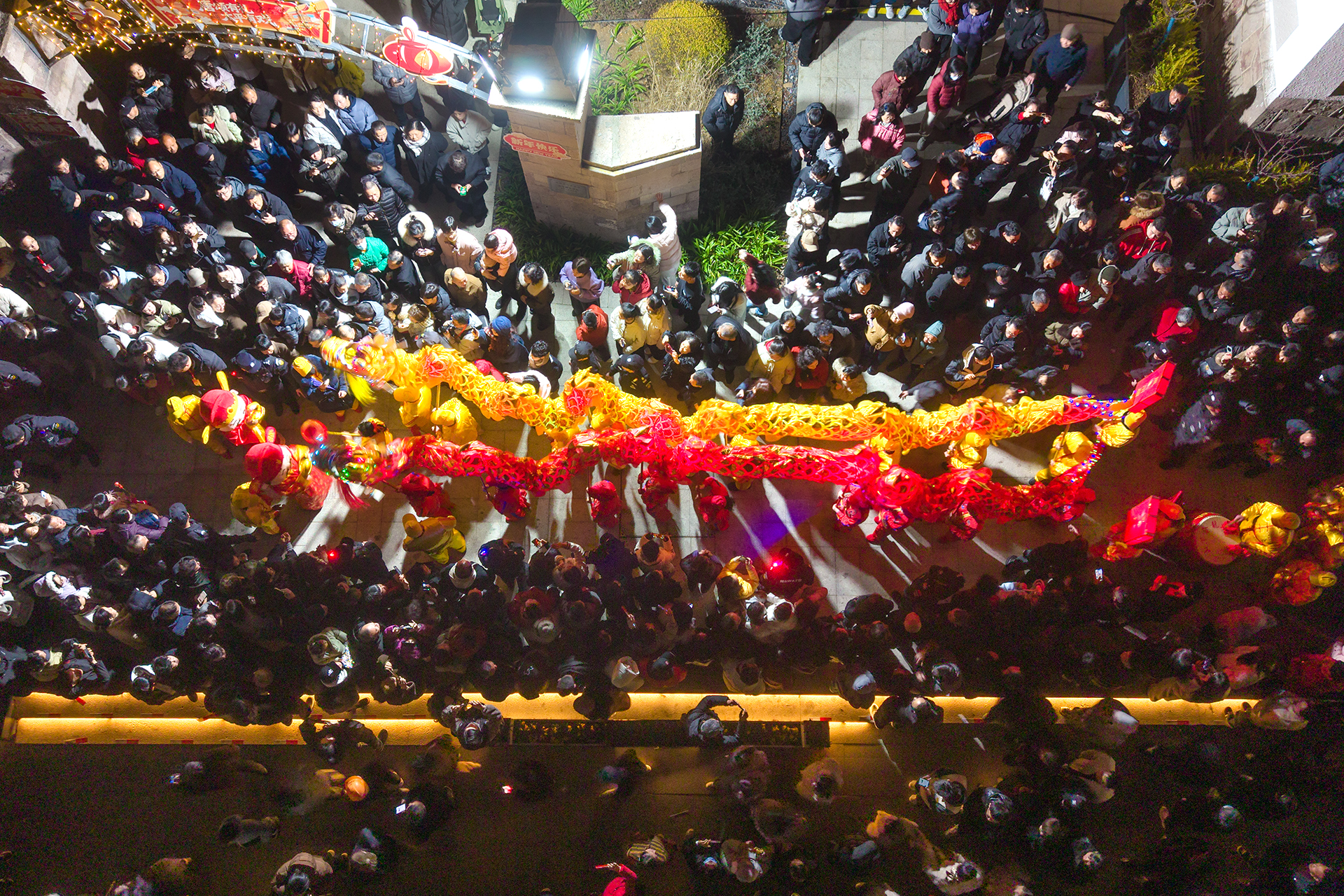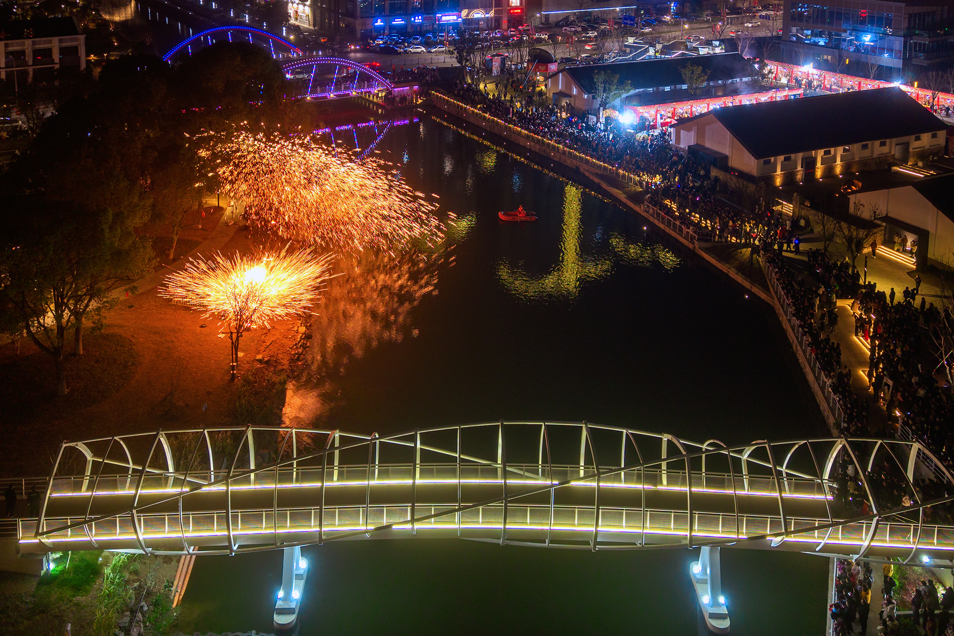 2026年2月17日,农历正月初一,在温岭市太平街道月河天地文化街区,舞龙巡游、打铁花活动热闹举行,营造出红红火火的节日氛围。