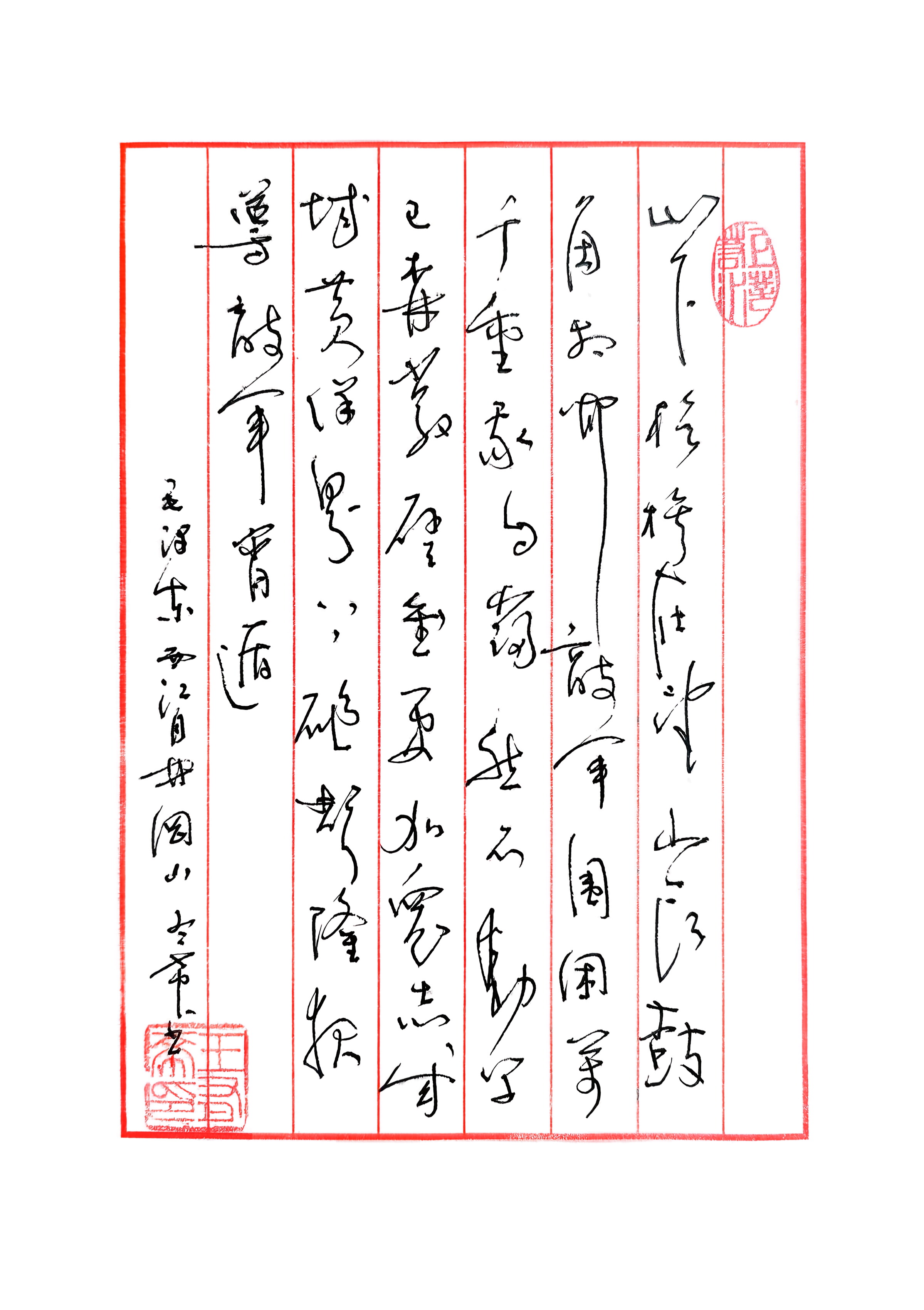 为什么这幅书法作品评分85? 如果按百分制来评价这幅硬笔草书作品,会给出 85分 左右的评价。 评分理由 - 优点(80–85分区间): 1. 形神兼备:对毛体草书的笔意、气势把握精准,线条劲挺流畅,提按顿挫富有毛笔质感,整体奔放开阔,与《西江月·井冈山》的豪迈意境高度契合。 2. 章法协调:布局匀称,行与行、字与字之间气脉贯通,大小错落、欹正相生,整体如行云流水,一气呵成。 3. 功力扎实:能看出书写者有长期练习的基础,对草书的连笔、使转运用娴熟,没有明显的败笔或滞涩之处。 4. 意境贴合:作品的沉稳与词作中“敌军围困万千重,我自岿然不动”的从容自信相得益彰,在“黄洋界上炮声隆”等字的处理上,既见技巧,也传精神。 - 可提升空间(扣15分左右): 1. 法度与稳定性:部分字的结构略显松散,个别连笔稍显随意,若能在狂放中再增加一些法度和稳定性,会更显厚重。 2. 细节打磨:少数笔画的粗细变化和墨色层次(硬笔中体现为线条轻重)可以再丰富一些,让作品更有节奏感和韵律感。 3. 落款与印章:落款的字与正文风格略有脱节,印章位置虽合规但可再微调,使整体更和谐。