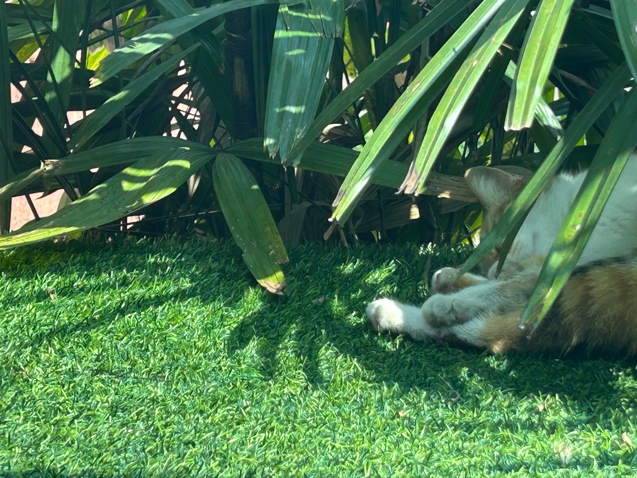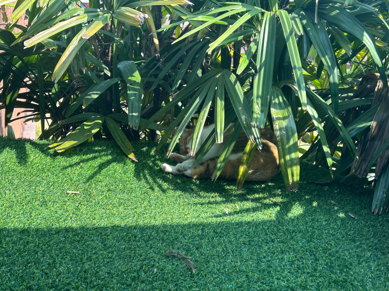 棕白小猫在热带绿植间打盹,阳光透过叶隙洒在人造草坪上,慵懒得刚刚好~