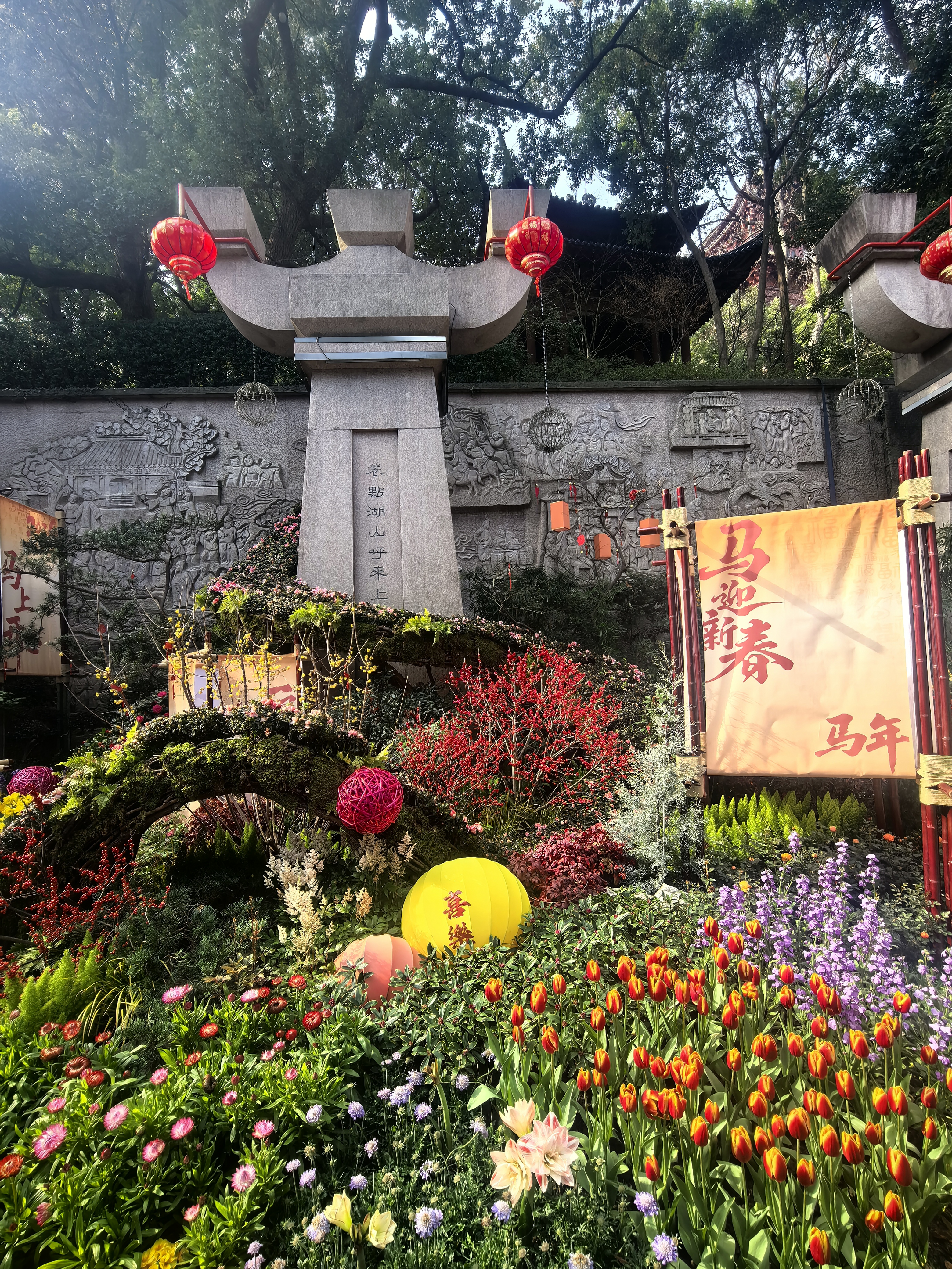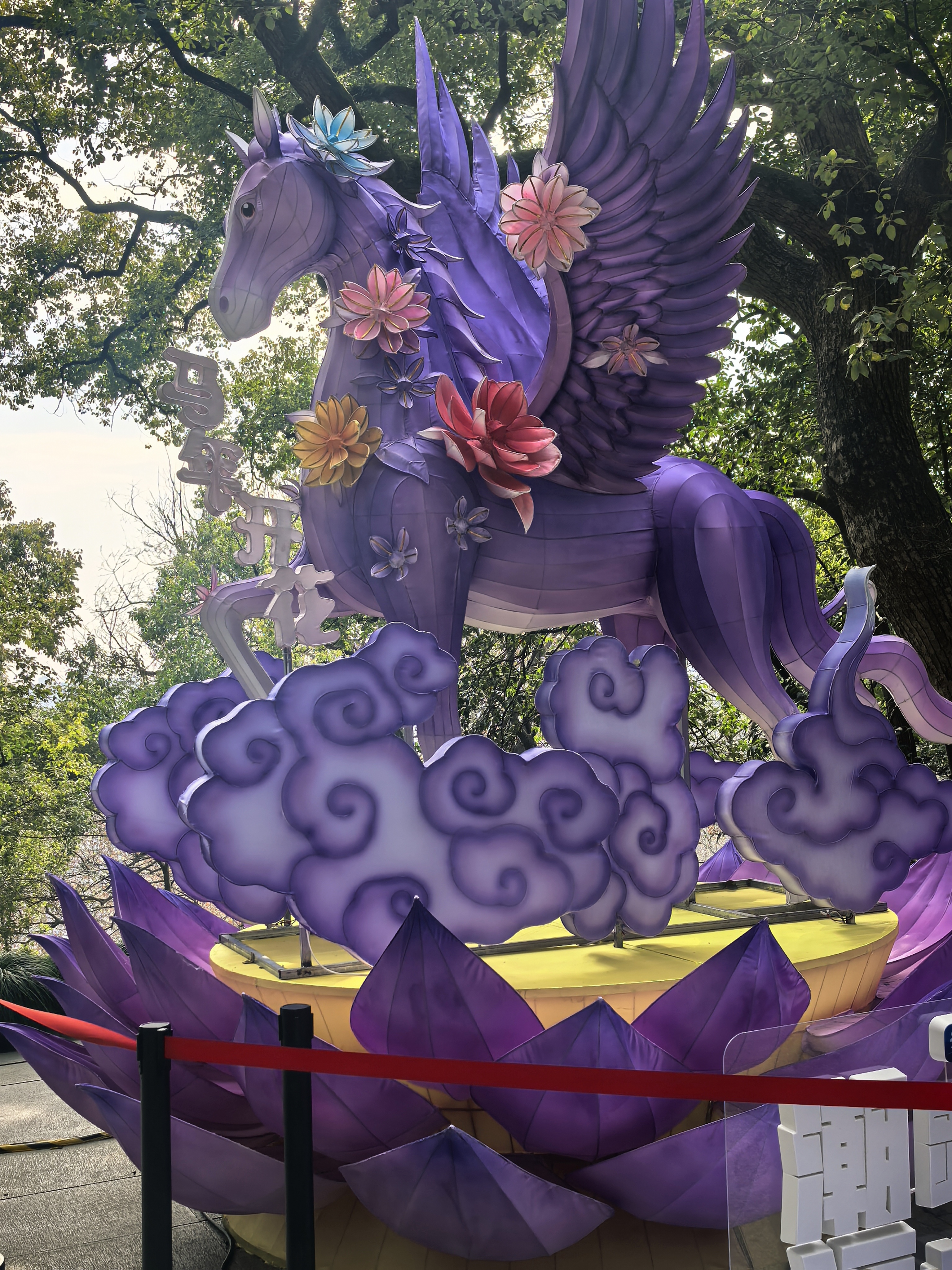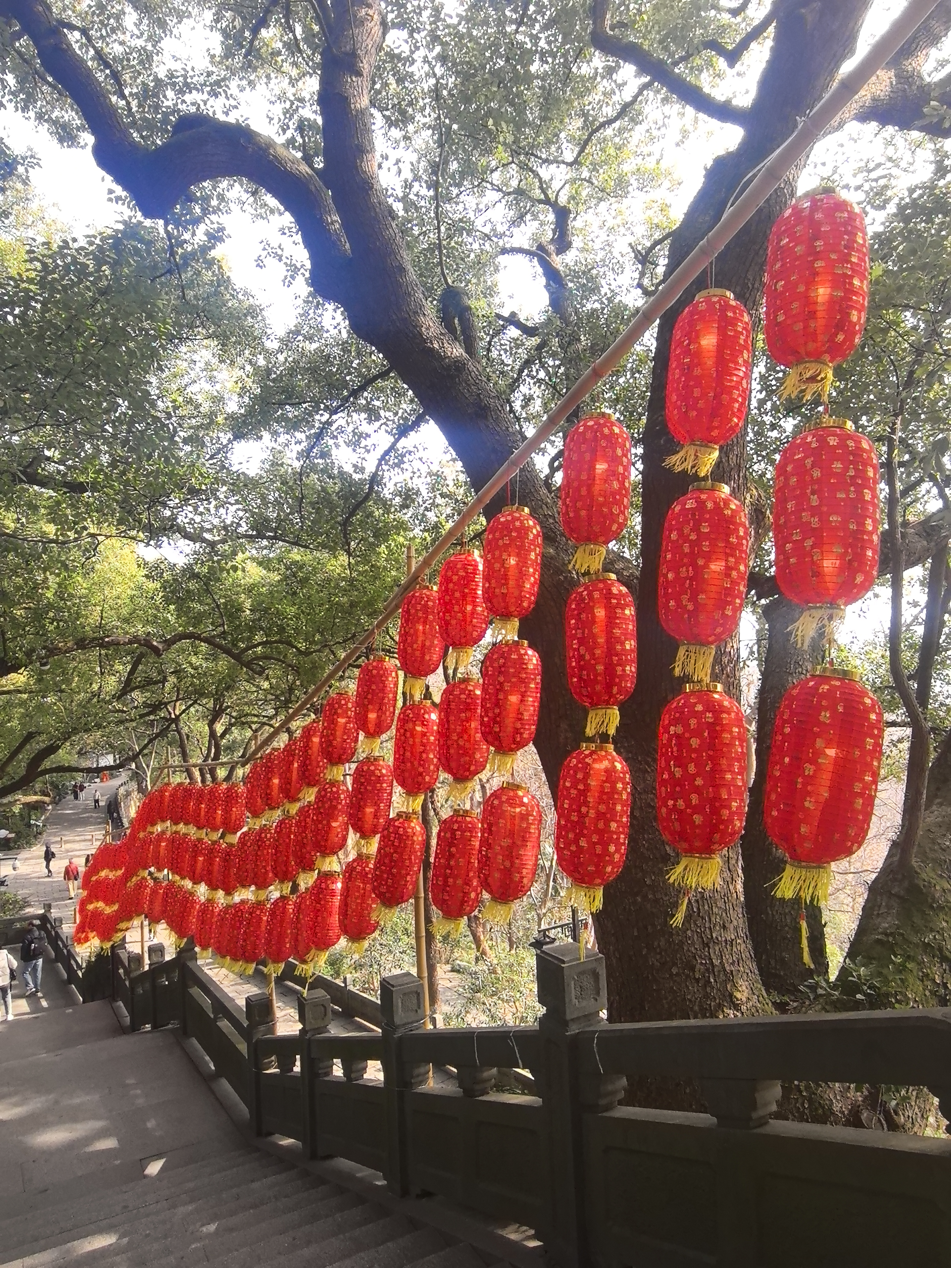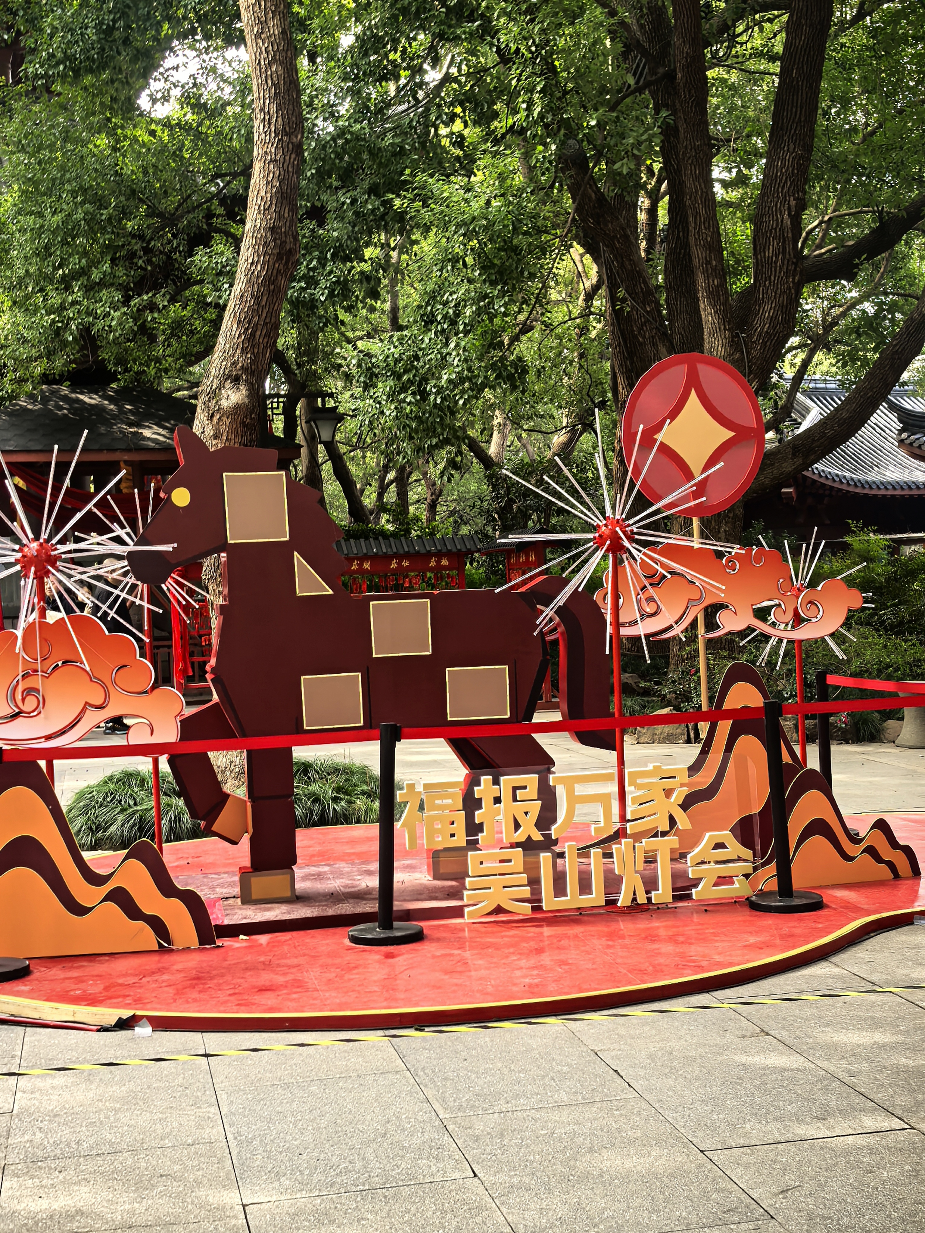 大年初三的吴山,沿着粮道山走,一路大红灯笼,赏灯的游人如织。 城隍阁前广场上,一串串造形各异的马形彩灯小品,吸引了许多游人的关注,马鬃金黄,鲜花锦簇,马儿昂首踏花而来。 在城隍阁开门之前,一场舞蹈音乐秀表演正在举行。