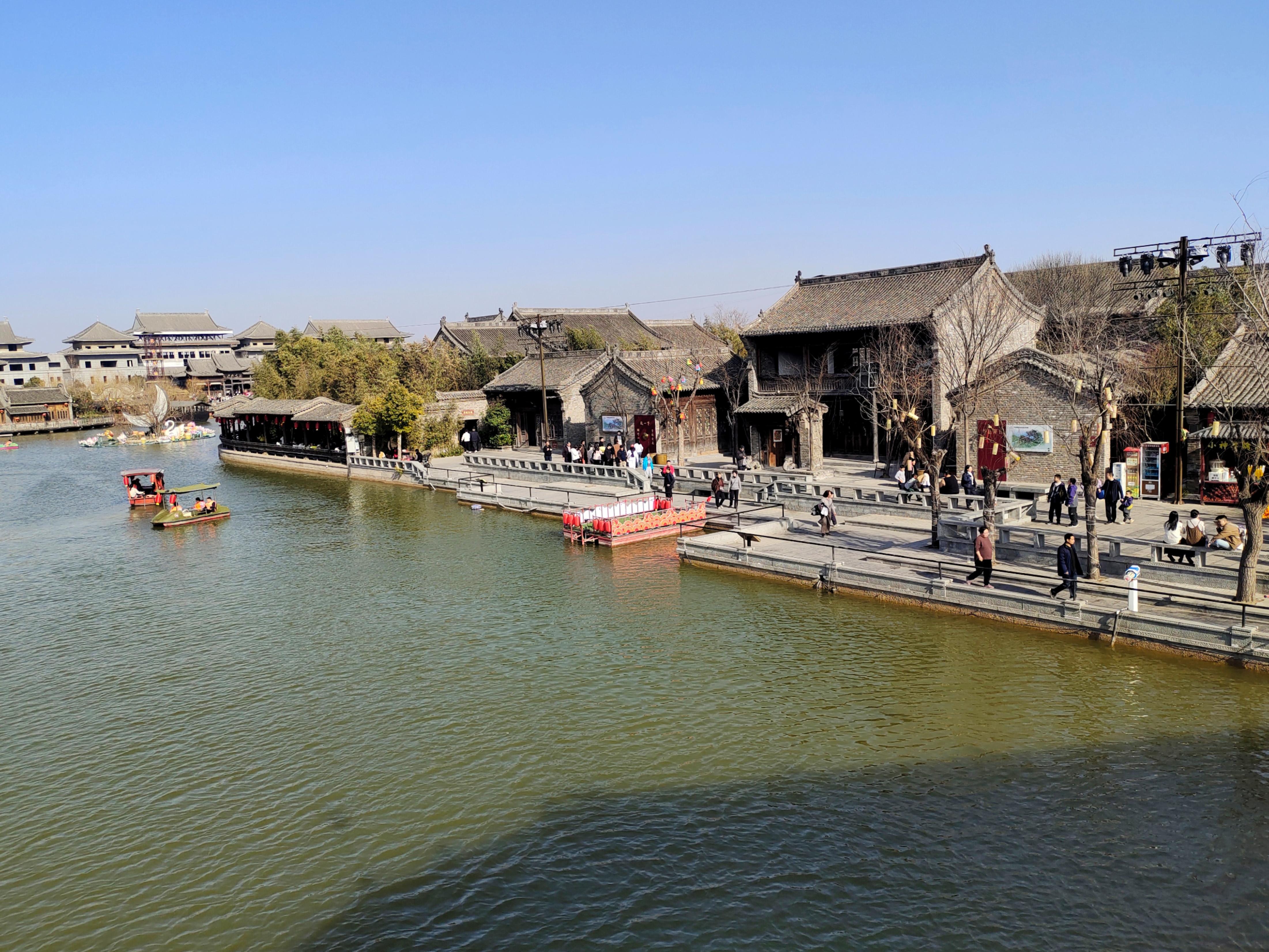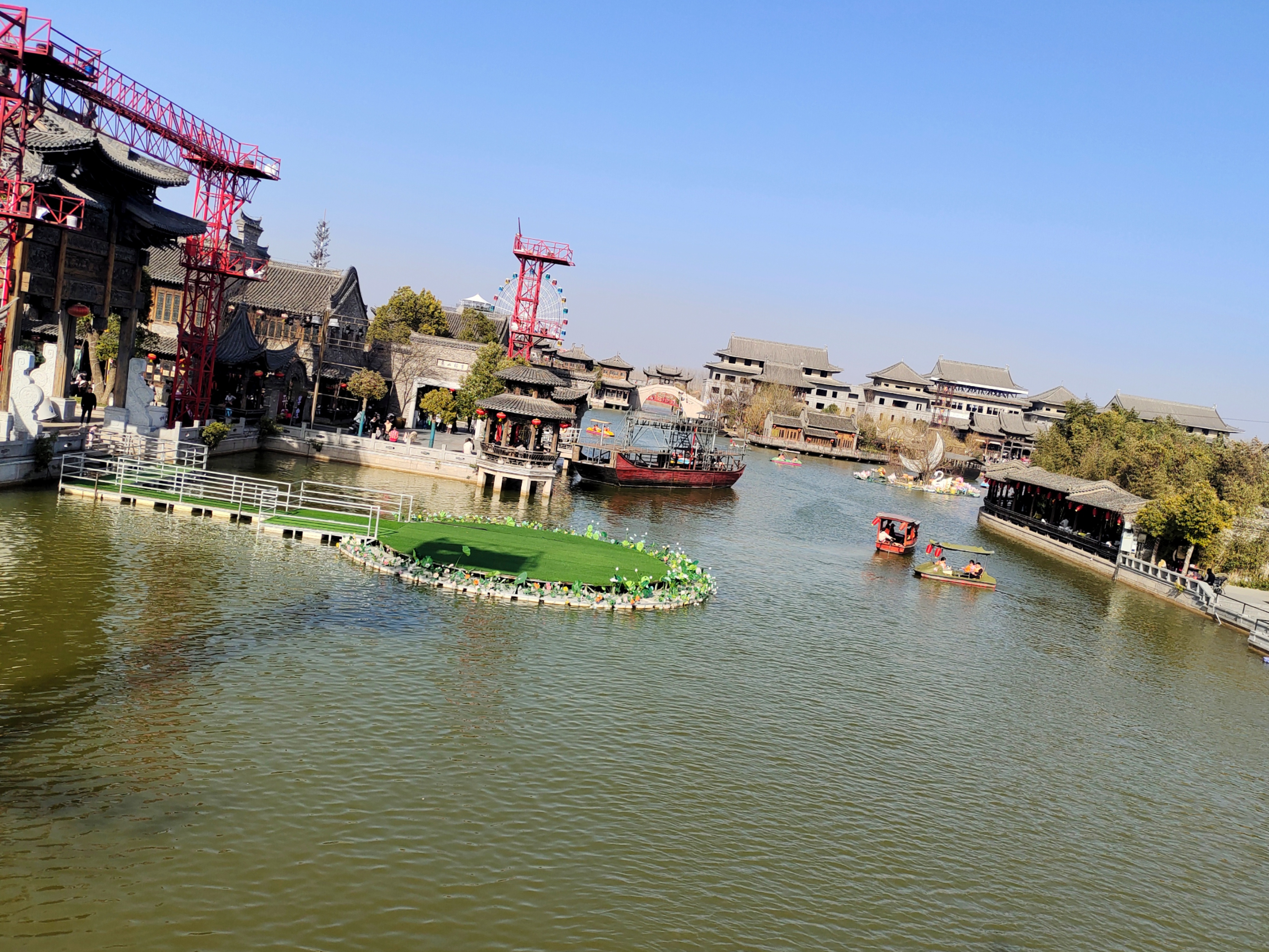 古建倒映湖面,游船划开晴空,红桥边灯笼轻晃。