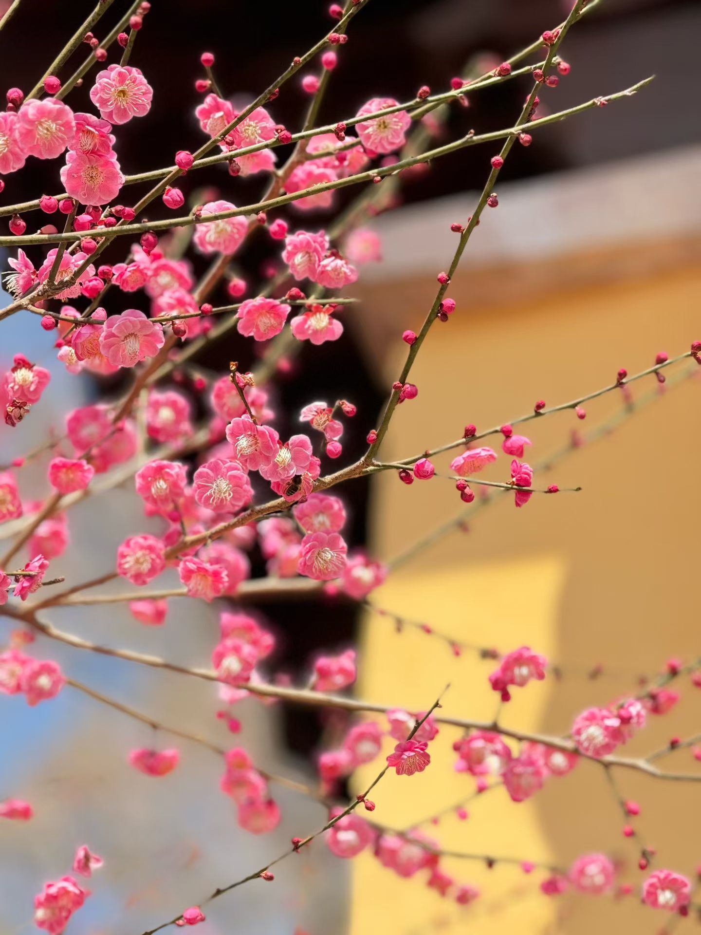 粉梅探出黄墙头,枝头花苞俏,盛开正当时~春日园林随手一拍都是画!