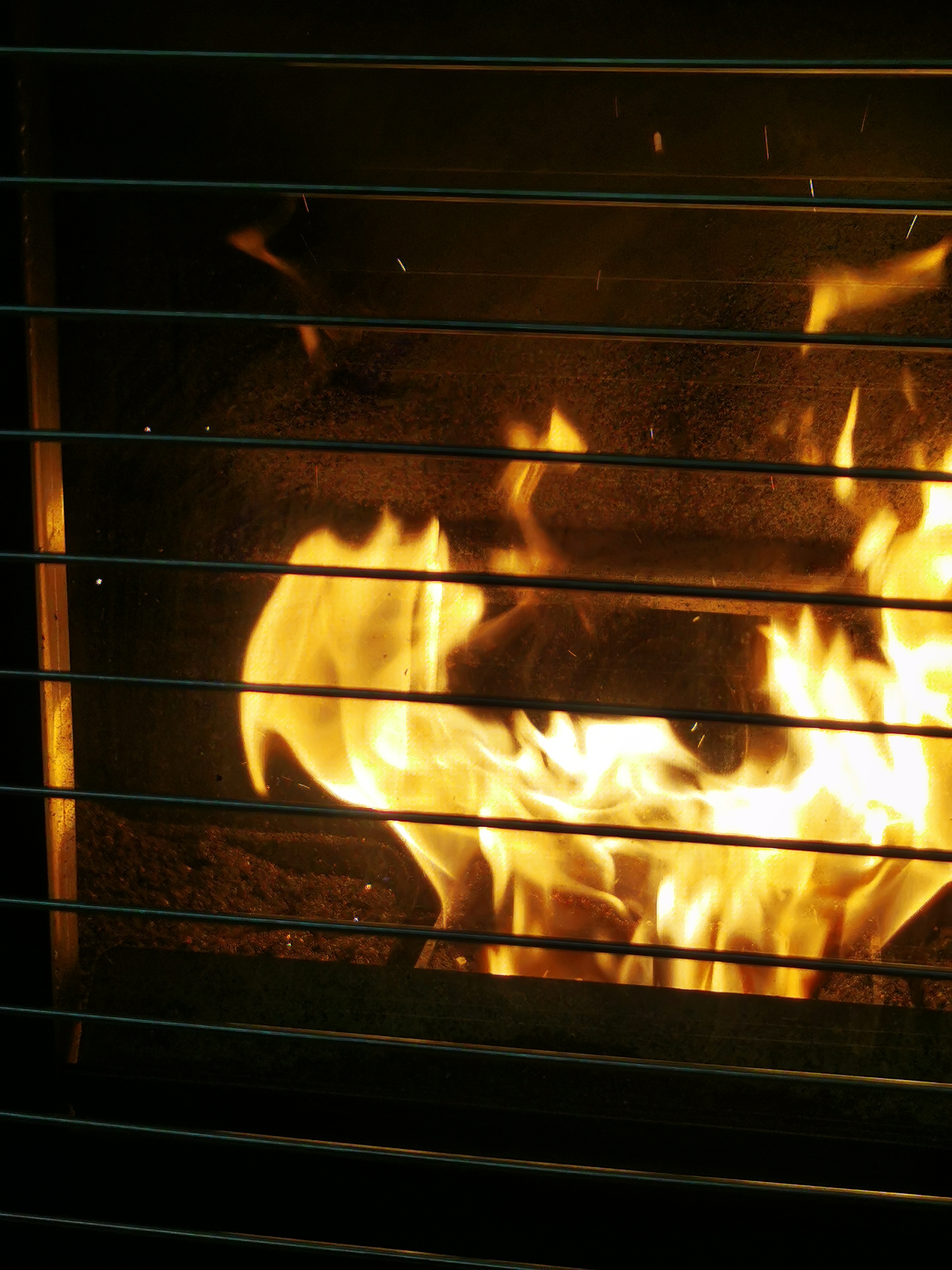 炉火在金属格栅后静静燃烧,炭红如诗,焰影摇曳。暖光漫过墙面,把冬夜染成琥珀色。火苗轻舔空气,噼啪声是时光低语,炉膛深处,是永不冷却的守候。黑色背景里,光与暗温柔对峙,条状遮挡投下疏朗影痕——这方寸之间的热源,不单取暖,更以柔光为笔,为平凡日子写下温厚注脚。人间至暖,不过一炉、一火、一家人静坐的微光。