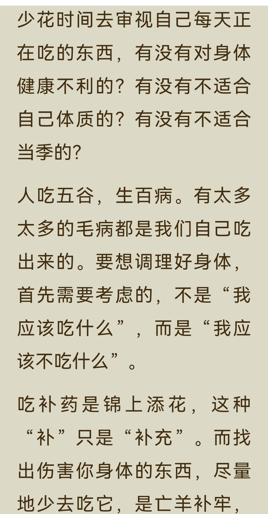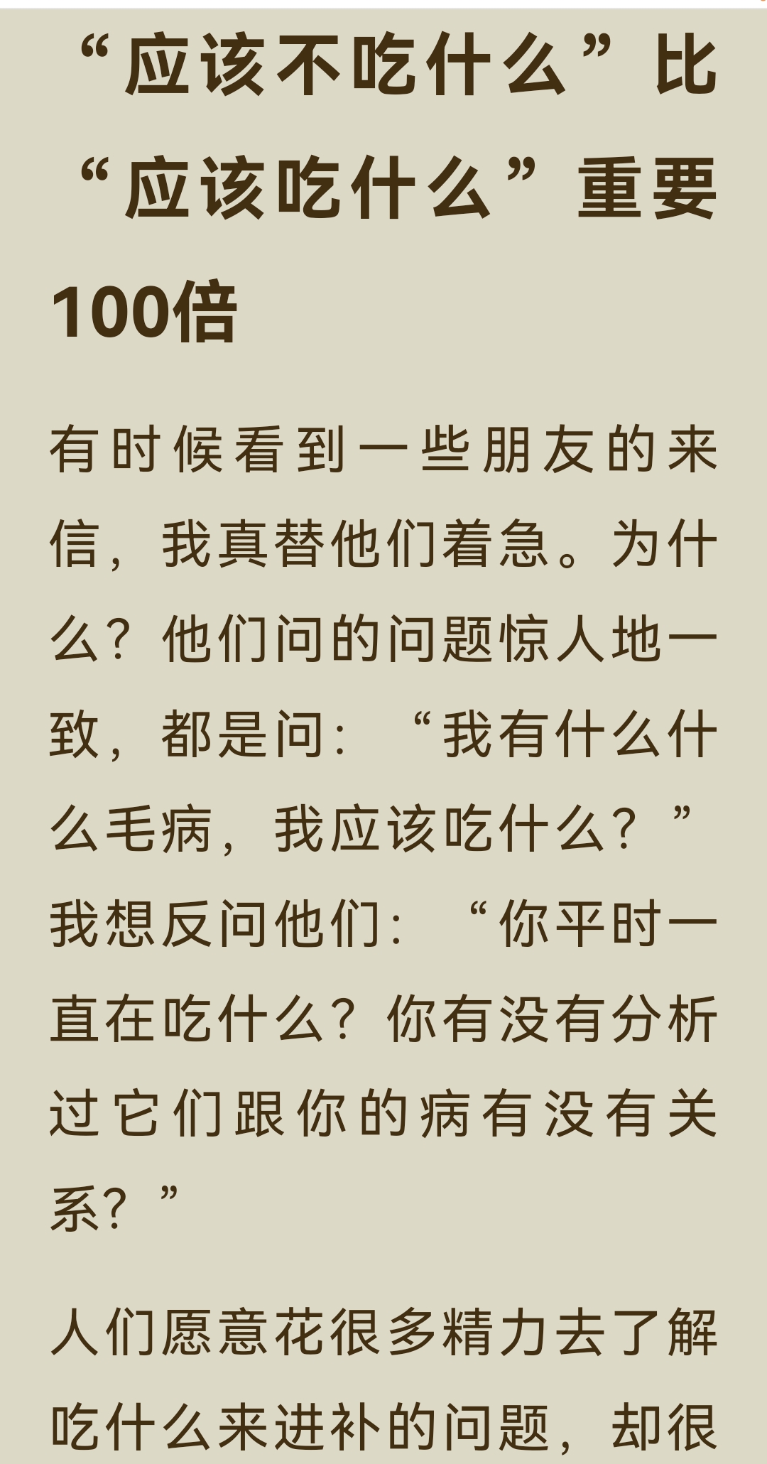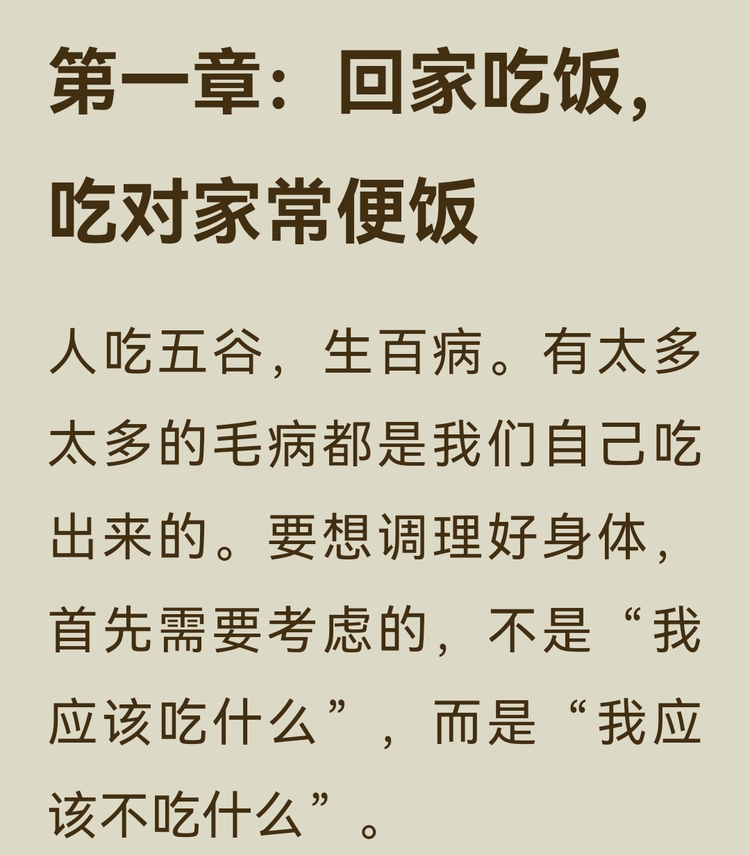 《回家吃饭的智慧》第一章第一节主要内容及阅读体会: 一、主要内容 《回家吃饭的智慧》第一章第一节,核心观点是:“应该不吃什么”比“应该吃什么”重要100倍。 1. 饮食与疾病的关系 作者提出“人吃五谷,生百病”,指出很多健康问题都是长期不良饮食习惯造成的。调理身体的首要任务,不是盲目进补,而是先审视并排除日常饮食中对身体有害的食物。 2. 对“进补”的重新定义 吃补药只是“锦上添花”的补充,而识别并减少摄入伤害身体的食物,才是“亡羊补牢”式的根本调理。如果不先排除致病因素,再多的补品也难以见效。 3. 特殊人群的饮食原则 针对脾胃娇弱的小孩和老人,作者强调:身体不适时,不要急于寻找“该吃什么”的食疗方,而应先判断“正在吃的东西”是否适合。例如,小儿咳嗽多由饮食不节、伤脾生痰湿引起,控制饮食、清淡甚至暂时禁食,比盲目吃冰糖炖梨更有效。 4. 个体化饮食观 适合自己的才是最好的。即使是公认的补品,如果与体质、季节或病情不符,也可能变成“毒药”。咳嗽分燥咳、寒咳等类型,冰糖炖梨只对燥咳有效,用错反而加重病情,这一例子生动地说明了这一点。 二、阅读心得 读完这一节,我最大的感受是:养生的智慧,往往在于“做减法”,而非“做加法”。 在快节奏的现代生活中,我们很容易陷入“养生焦虑”:身体一不舒服,就想立刻找到“吃什么能好”的答案,于是各种保健品、食疗方轮番上阵。但作者却提醒我们,问题的根源可能恰恰在于我们每天都在吃的东西。外卖的重油重盐、零食里的添加剂、不分体质的盲目进补,这些才是蚕食我们健康的“隐形杀手”。 这让我反思自己的饮食习惯:是否常常为了图方便而忽略了食物的本质?是否在追求“营养”的同时,给身体增加了不必要的负担?作者用小孩咳嗽的例子让我明白,有时候“不吃”比“吃”更重要。当身体发出警报时,给脾胃“减负”,让它有机会自我修复,远比强行投喂补品更有智慧。 同时,“适合你的才是补药”这句话也点醒了我。养生不是照搬别人的成功经验,而是要建立对自己身体的认知。了解自己的体质,顺应季节的变化,拒绝跟风式的养生,才能真正做到“吃对家常便饭”,把健康的主动权掌握在自己手中。