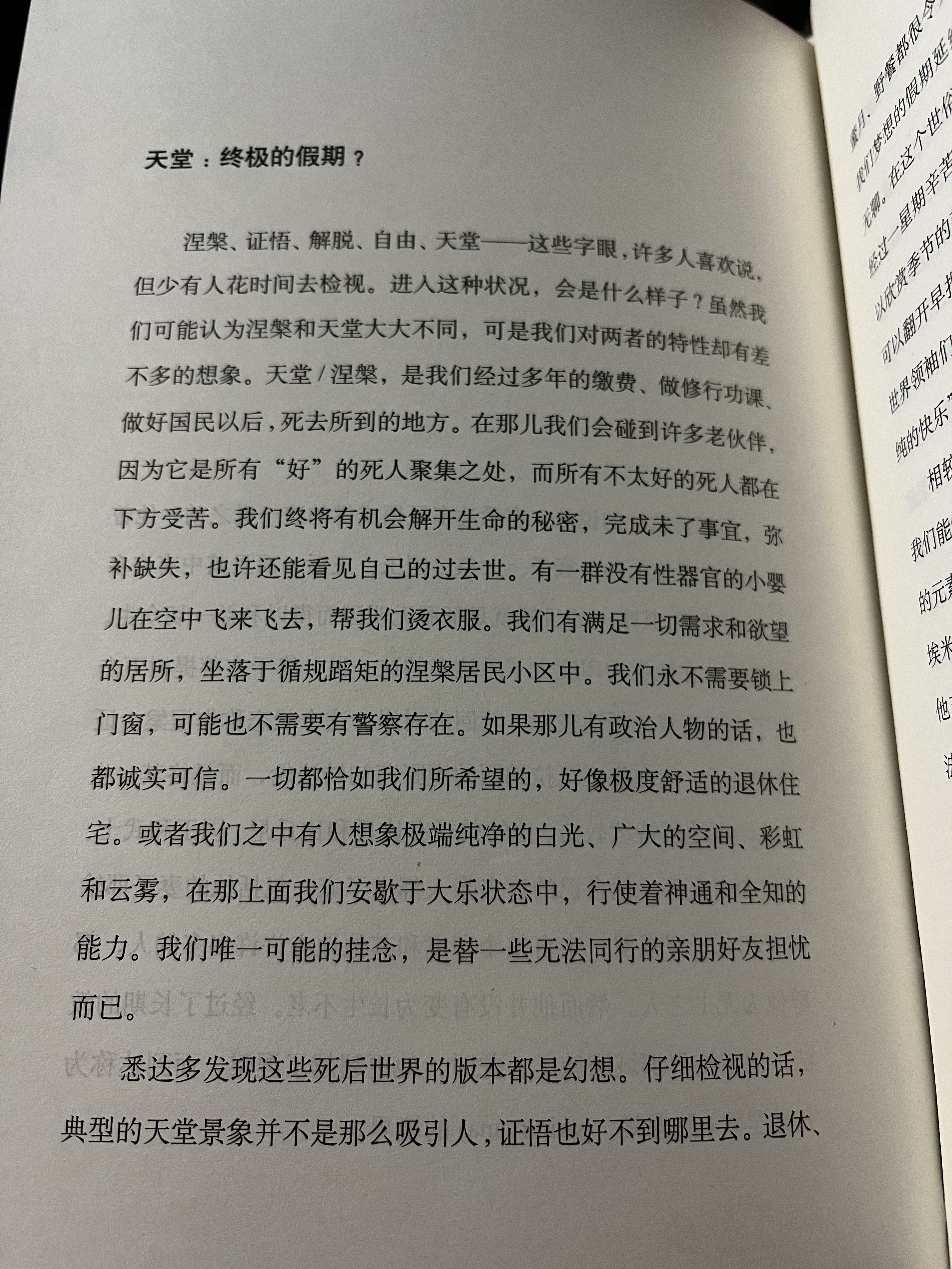 这一章在讨论我们向往的天堂或证悟,真那么好吗? 书里说,大家常把天堂想象成一个没有烦恼,永远快乐的地方。但仔细想想,如果生活真的毫无困难、没有惊喜、也不会结束,那还有什么意思呢?蜜月虽好,但天天在一起也会腻。快乐,恰恰需要一点不完美和未知来衬托。