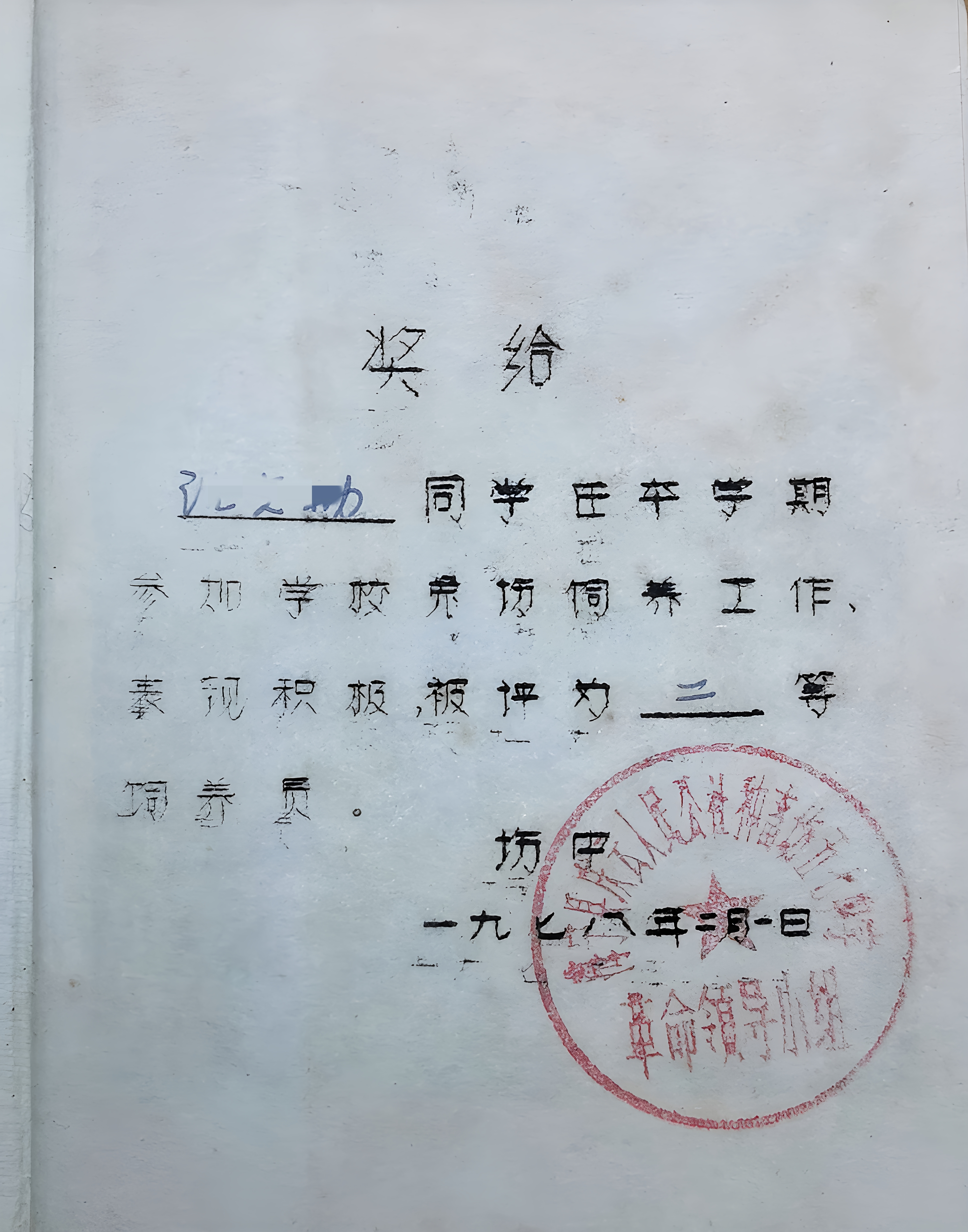 【少年回忆】从路仲大队到古镇,我的五七中学 时光往回走,回到上世纪七十年代末,我的少年时光,就安放在路仲大队。那时的路仲,还不是如今游人如织的古镇,田埂纵横,炊烟袅袅,是刻在心底最朴素、最亲切的故乡。1978年,我就读的学校,有着那个年代特有的名字——海宁县庆云人民公社种畜场五七中学。 最近翻出当年的奖状,想起学校曾奖给我参加兔场饲养工作,表现积极,被评为二等饲养员,一幕幕往事瞬间涌上心头。这一长串校名,藏着我们一代人的青春岁月。教室里的朗朗书声,操场上的奔跑身影,饲养场里的忙碌时光,放学路上的欢声笑语,都与这片土地紧紧相连,深深铭记。从路仲大队到路仲古镇,从五七中学到岁月远去,名字变了,模样新了,可藏在心底的少年时光,永远清澈明亮,永不褪色。
