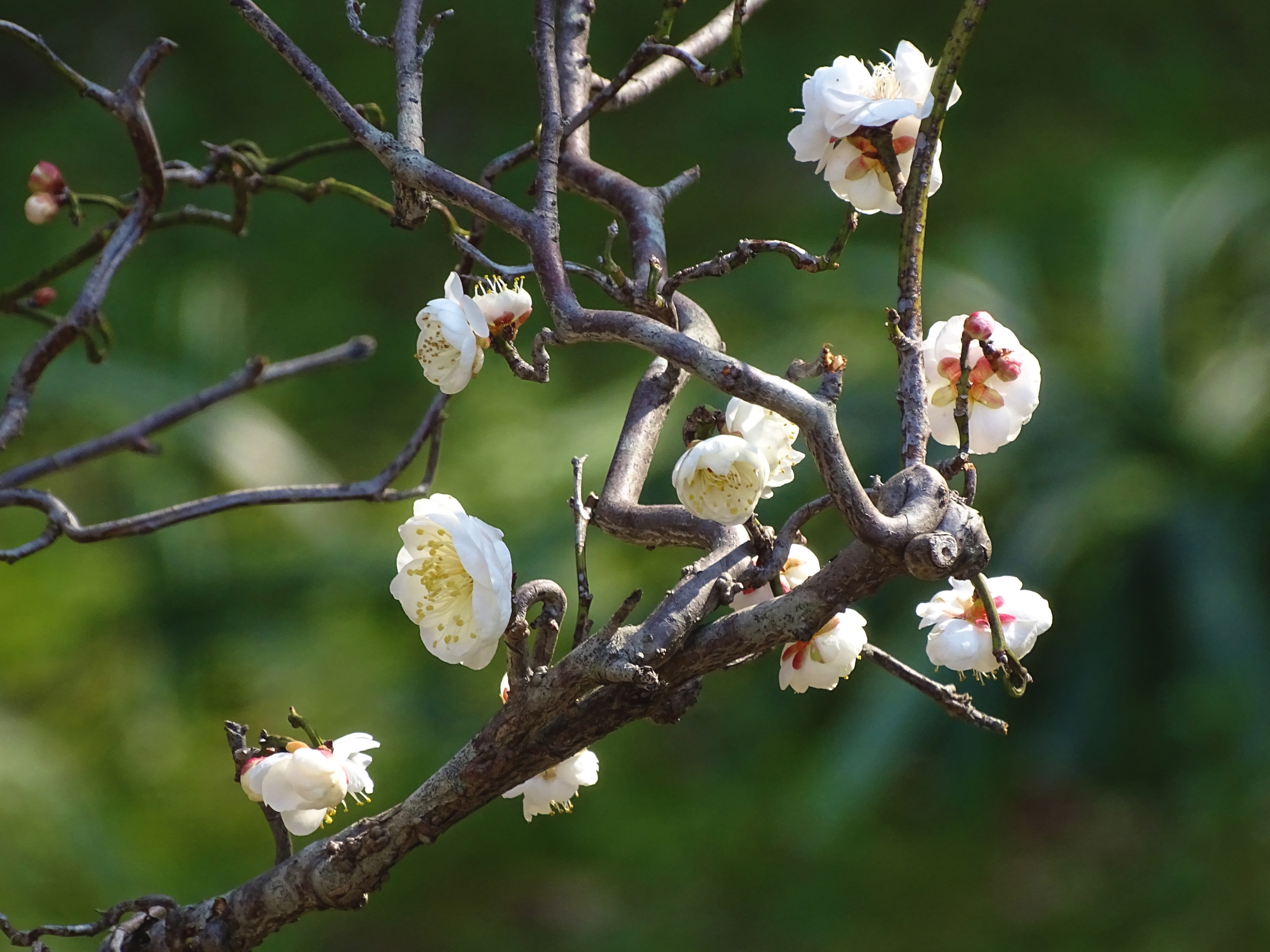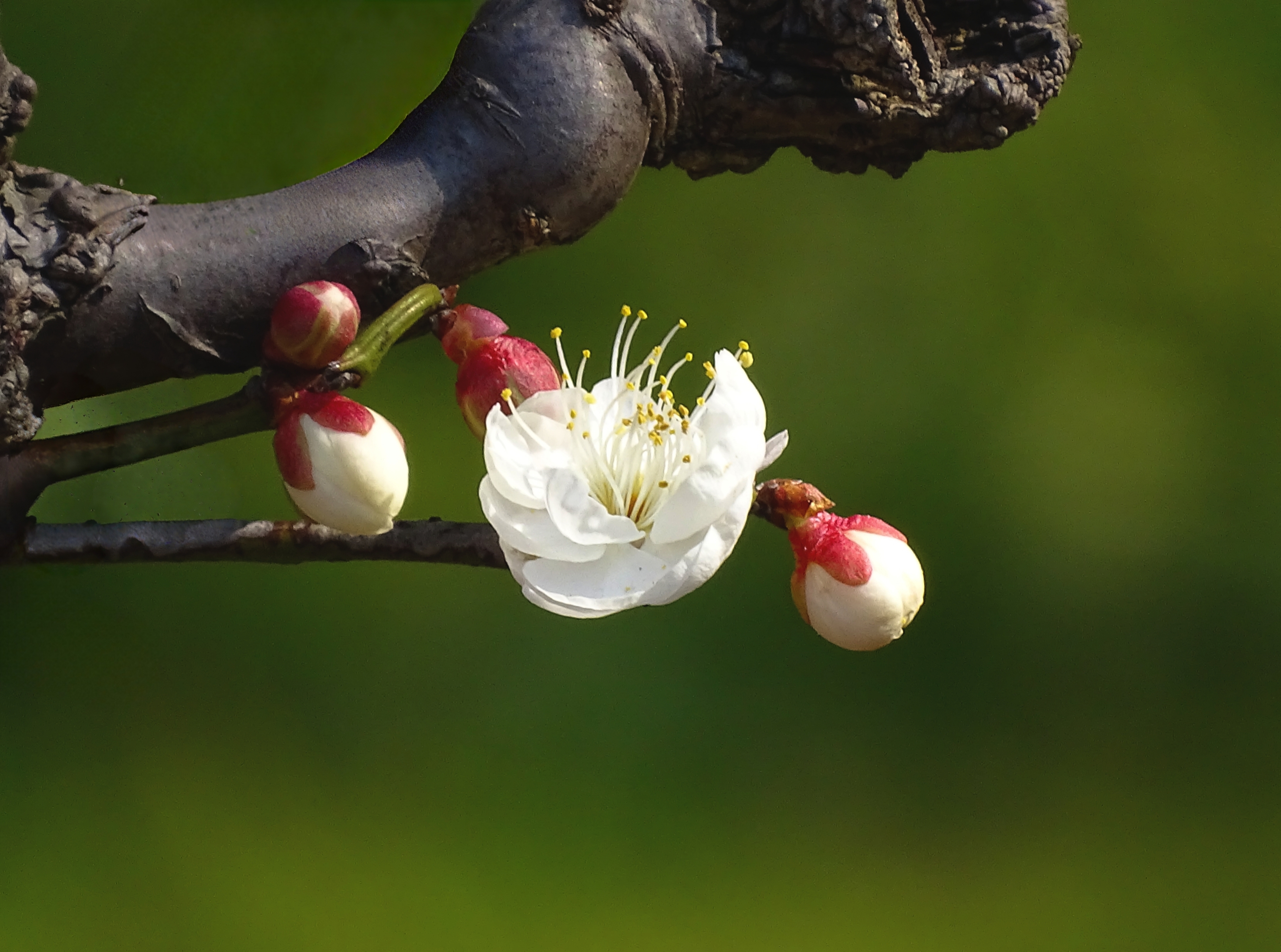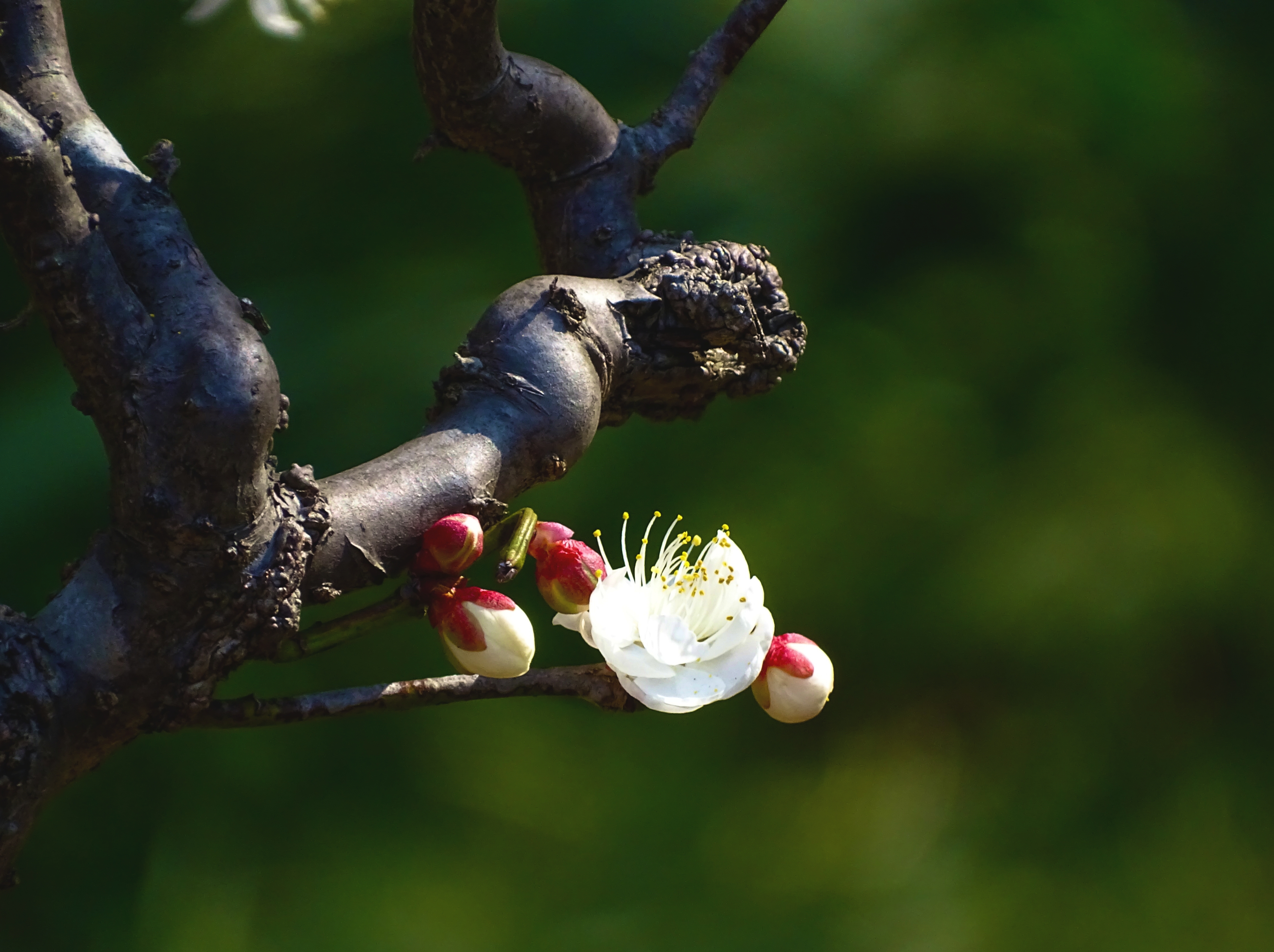 灵峰龙游梅,蜷曲的枝桠上白花配红萼,像不小心撒落的春日碎片,凑近闻闻,淡淡的香阵阵飘来。
