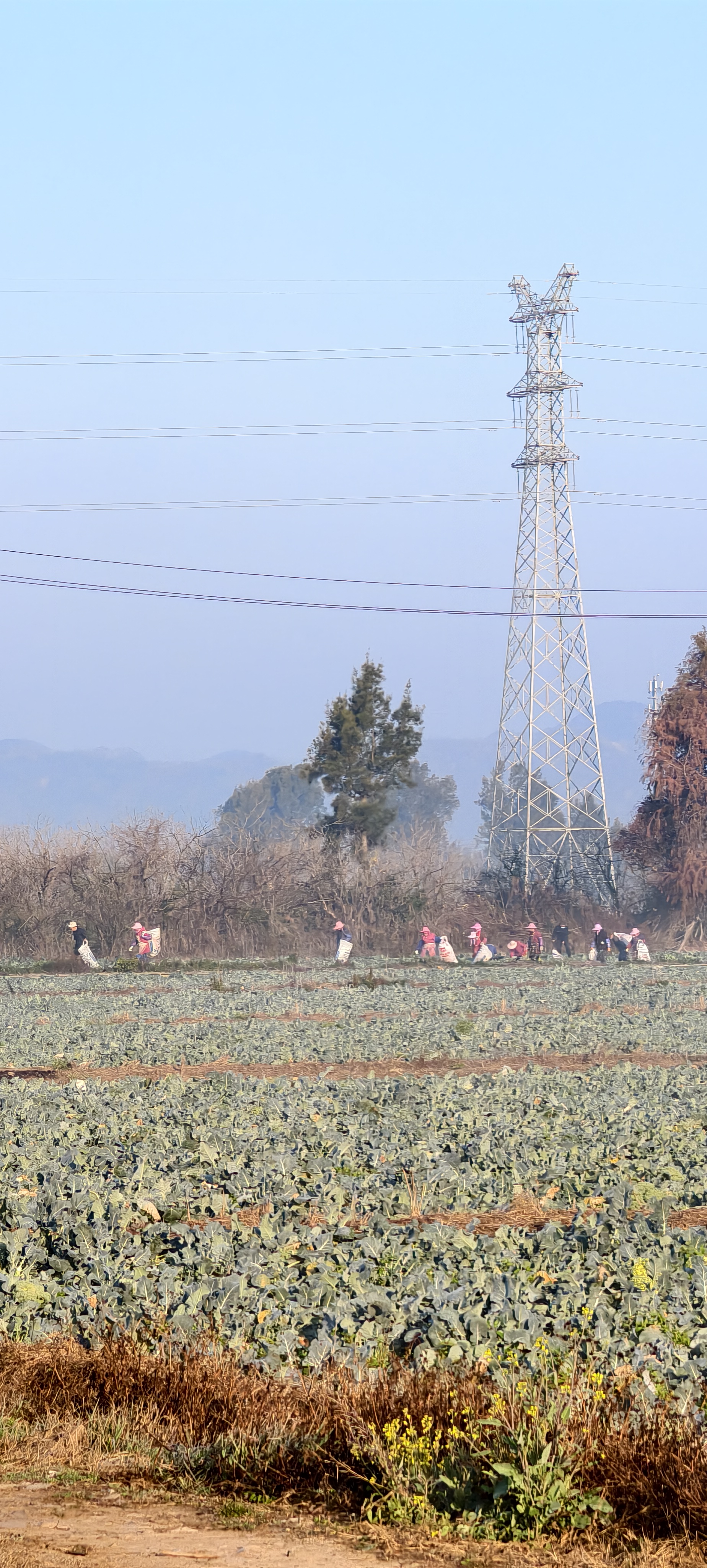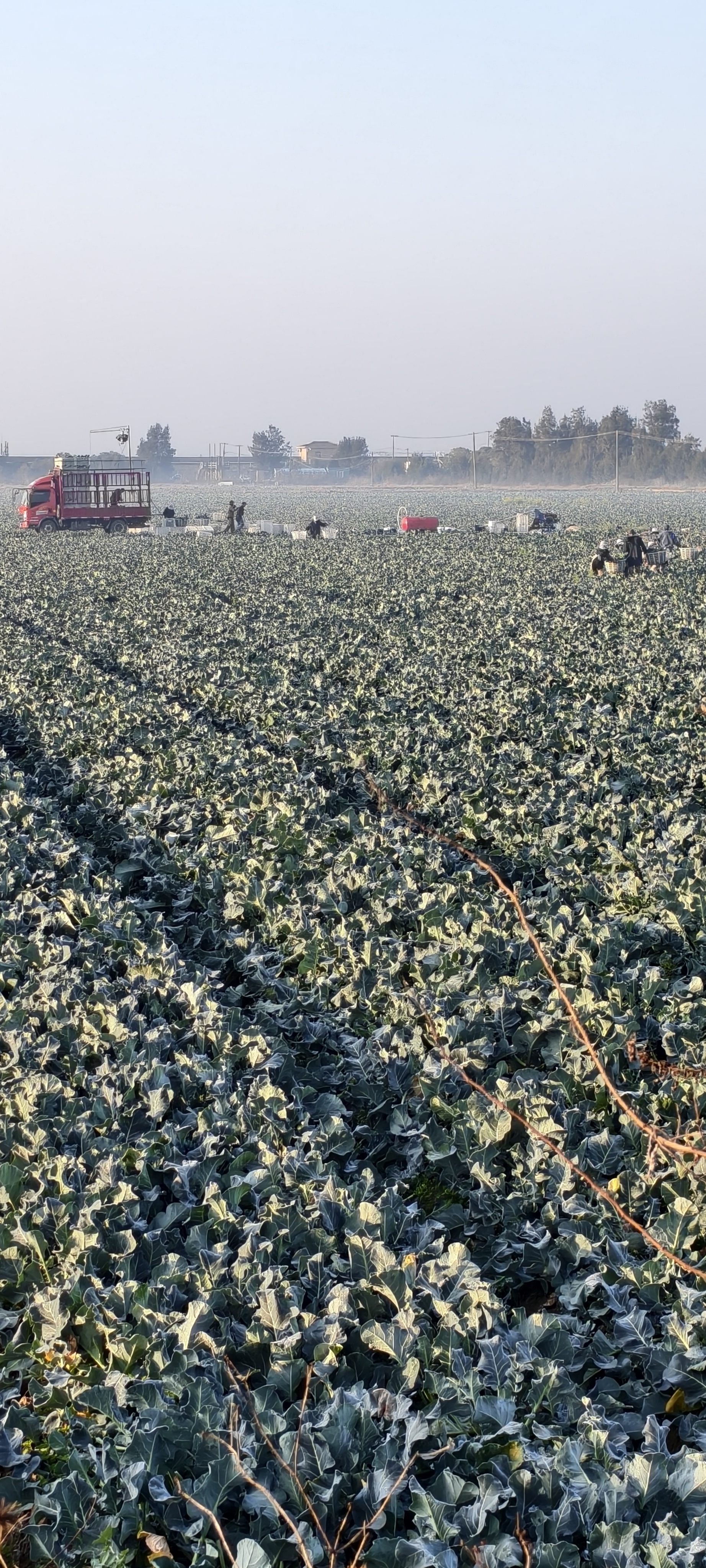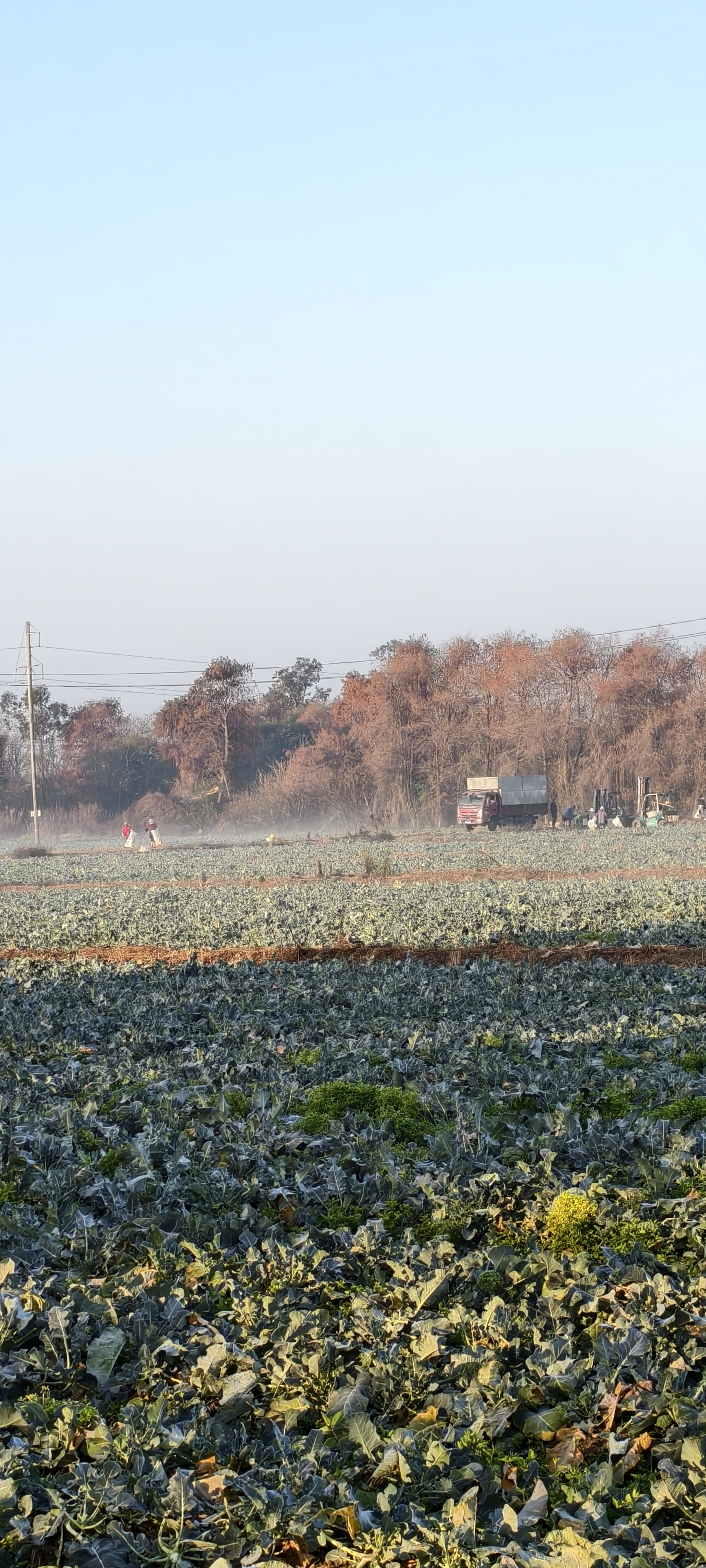 温岭东浦农场晨雾中菜农已开始采摘西兰花。