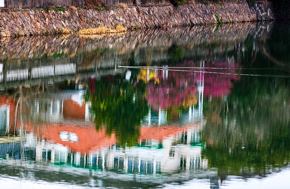《岸影摇春》 【七绝•岸影摇春】 岸影摇春水作绡, 红檐白壁卧青梢。 天光潋滟浮云碎, 一镜风痕送碧涛。