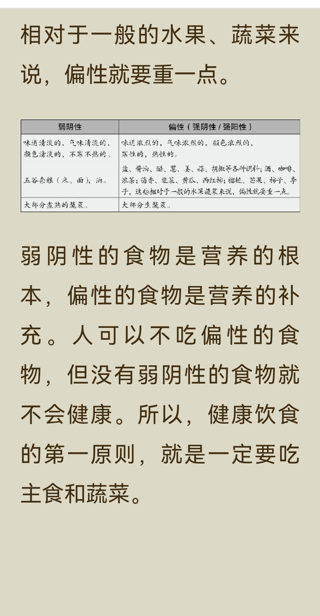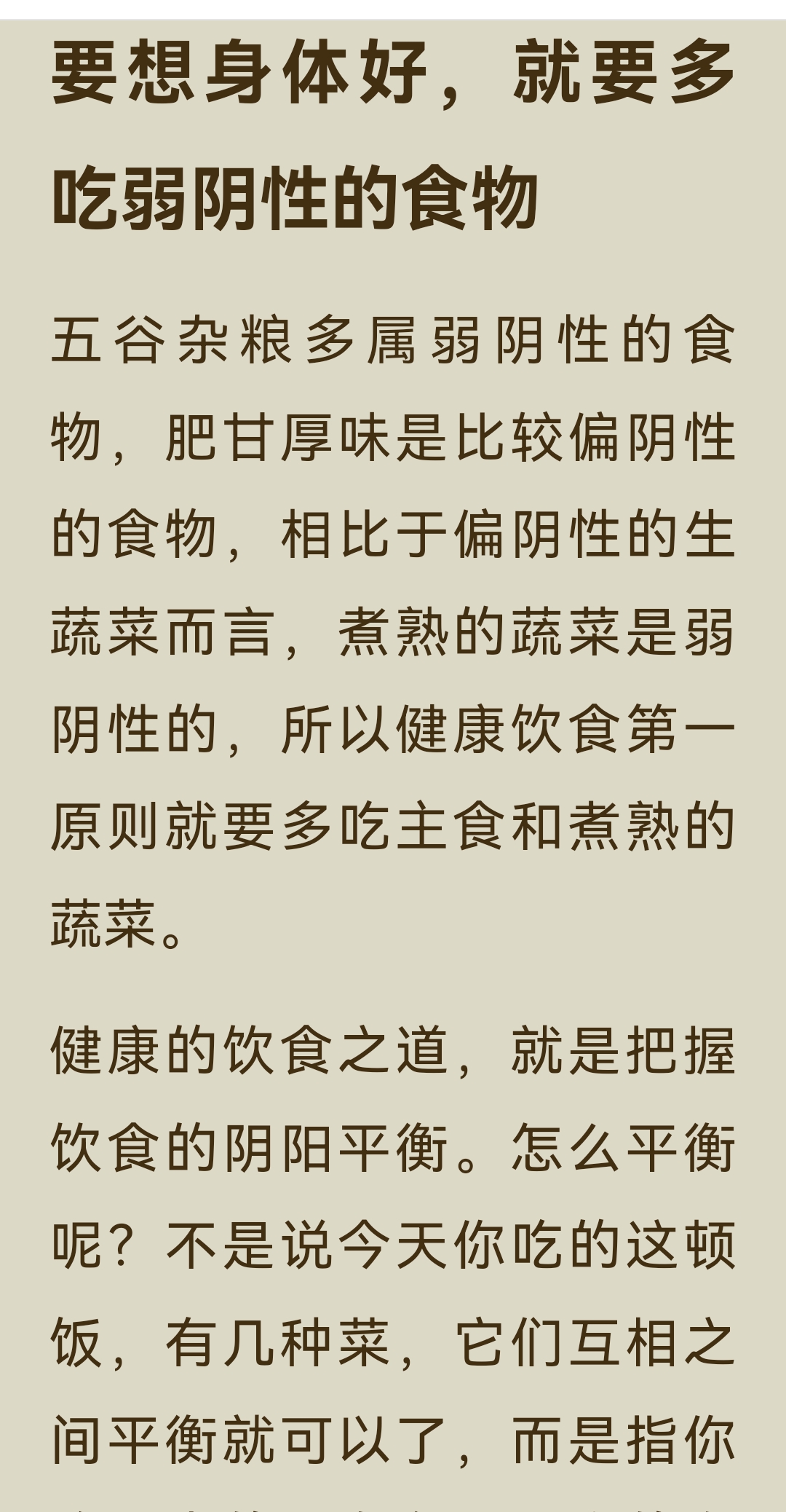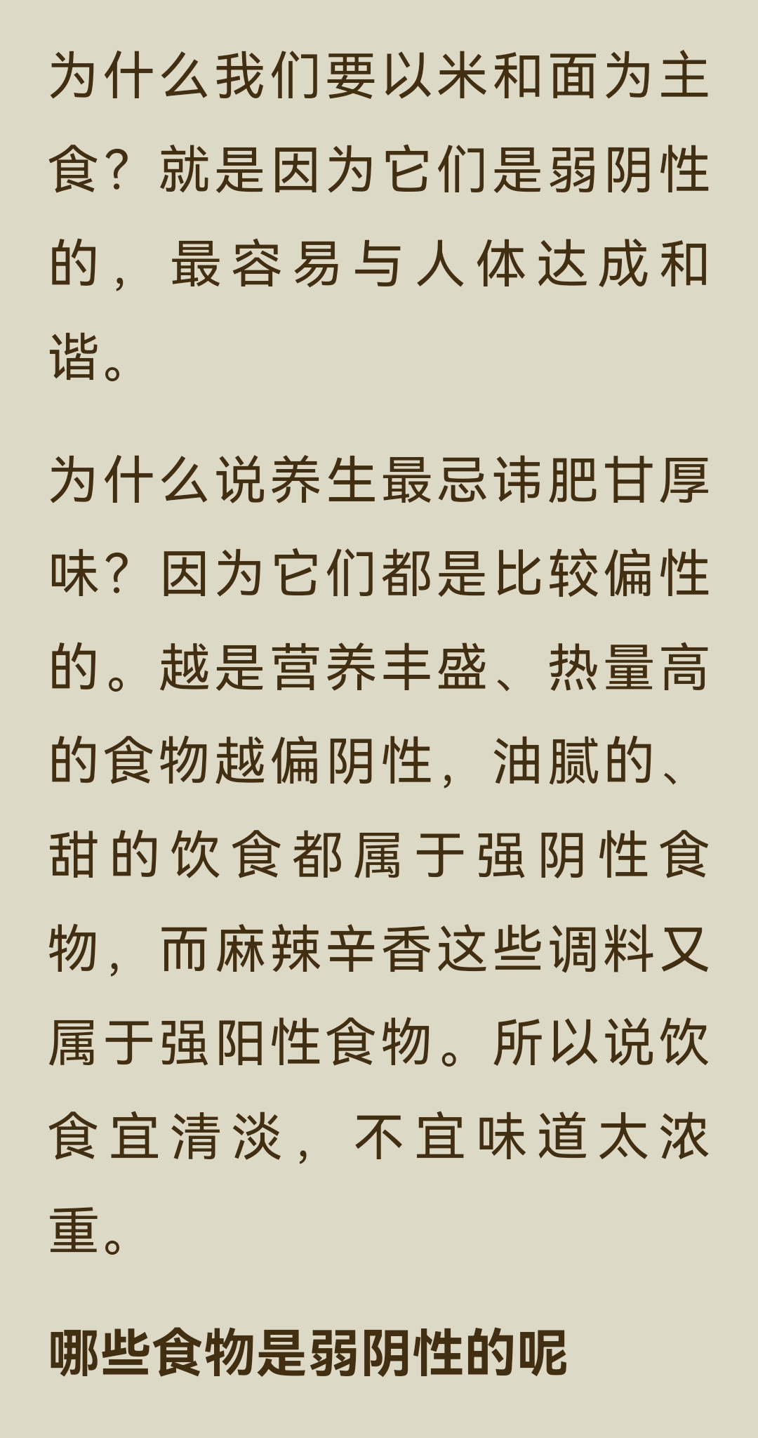 《回家吃饭的智慧》第一章第五小节,核心内容是: 健康饮食要以弱阴性食物为根本,少吃偏性食物,通过“阴主阳辅”的原则来维持身体阴阳平衡。 一、健康饮食的核心原则 1. 以弱阴性食物为主 人体属阳,为了达到阴阳平衡,饮食中阴性食物的分量要超过阳性食物,且应以弱阴性食物为主,阳性食物为辅。 - 弱阴性食物:味道、气味、颜色清淡,不寒不热,性质平和,是营养的根本。 - 偏性食物(强阴性/强阳性):味道浓烈、气味大、颜色鲜艳,或性寒、性热,是营养的补充,应少吃。 2. 为什么要多吃弱阴性食物 - 五谷杂粮(米、面等主食)多为弱阴性,最易与人体达成和谐,因此我们要以米、面为主食。 - 大部分蔬菜生食时偏阴性,煮熟后阴阳调和,成为弱阴性食物。 - 肥甘厚味(油腻、甜腻的食物)属于强阴性,麻辣辛香的调料属于强阳性,这类偏性食物会打破身体平衡,因此养生最忌讳肥甘厚味,饮食宜清淡。 二、弱阴性与偏性食物的区分 - 弱阴性食物:特征是味道清淡、气味清淡、颜色清淡,不寒不热,性质平和。代表食物有五谷杂粮(米、面)、大部分煮熟的蔬菜。 - 偏性食物(强阴性/强阳性):特征是味道浓烈、气味浓烈、颜色浓烈,或性寒、性热。代表食物有盐、酱油、醋、葱、姜、蒜、胡椒等各种调料;酒、咖啡、浓茶;茴香、韭菜、黄瓜、西红柿;榴莲、芒果、柿子、李子等;以及大部分生蔬菜。 三、总结 弱阴性食物是营养的根本,人可以不吃偏性食物,但没有弱阴性食物就无法健康。因此,健康饮食的第一原则,就是一定要吃主食和煮熟的蔬菜,并根据个人体质调整阴阳食物的比例。
