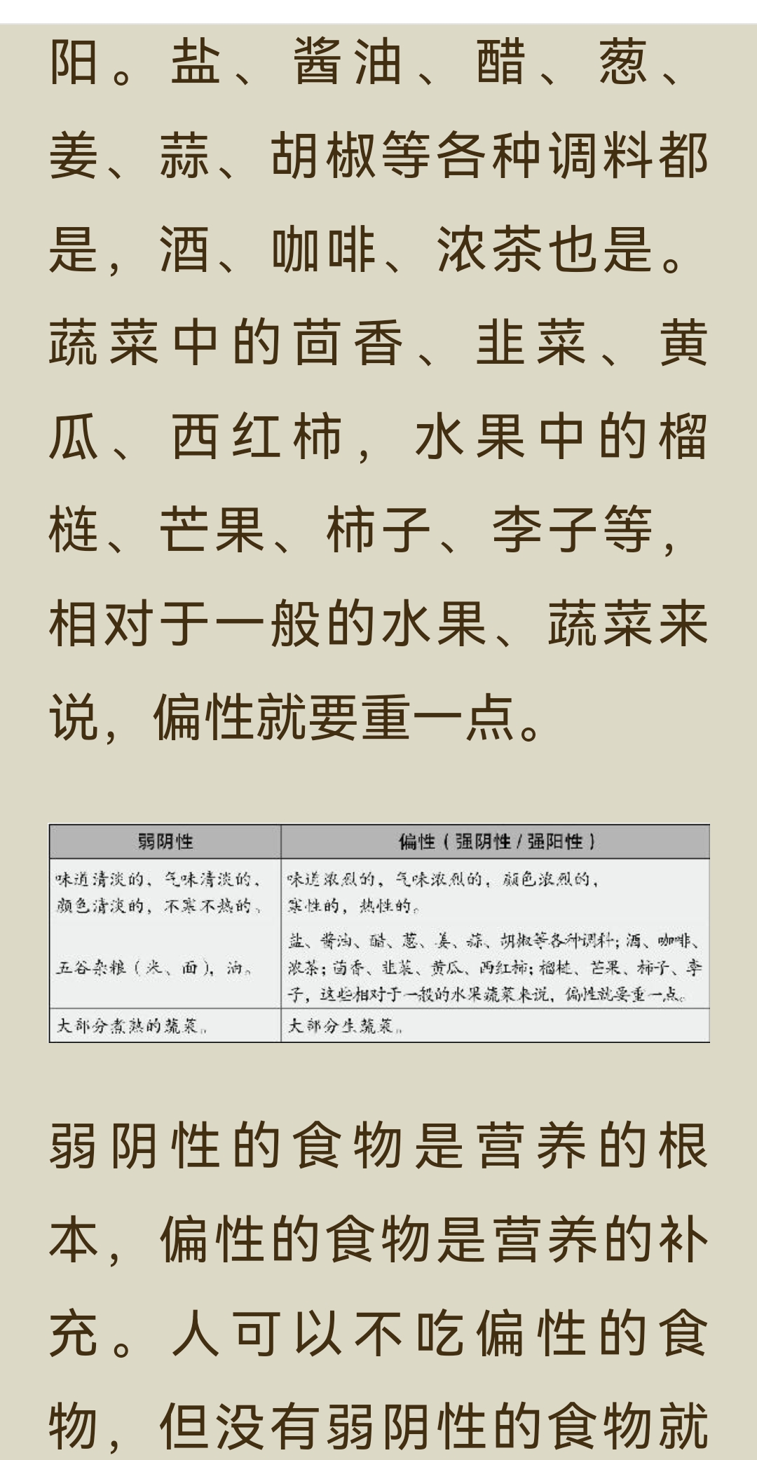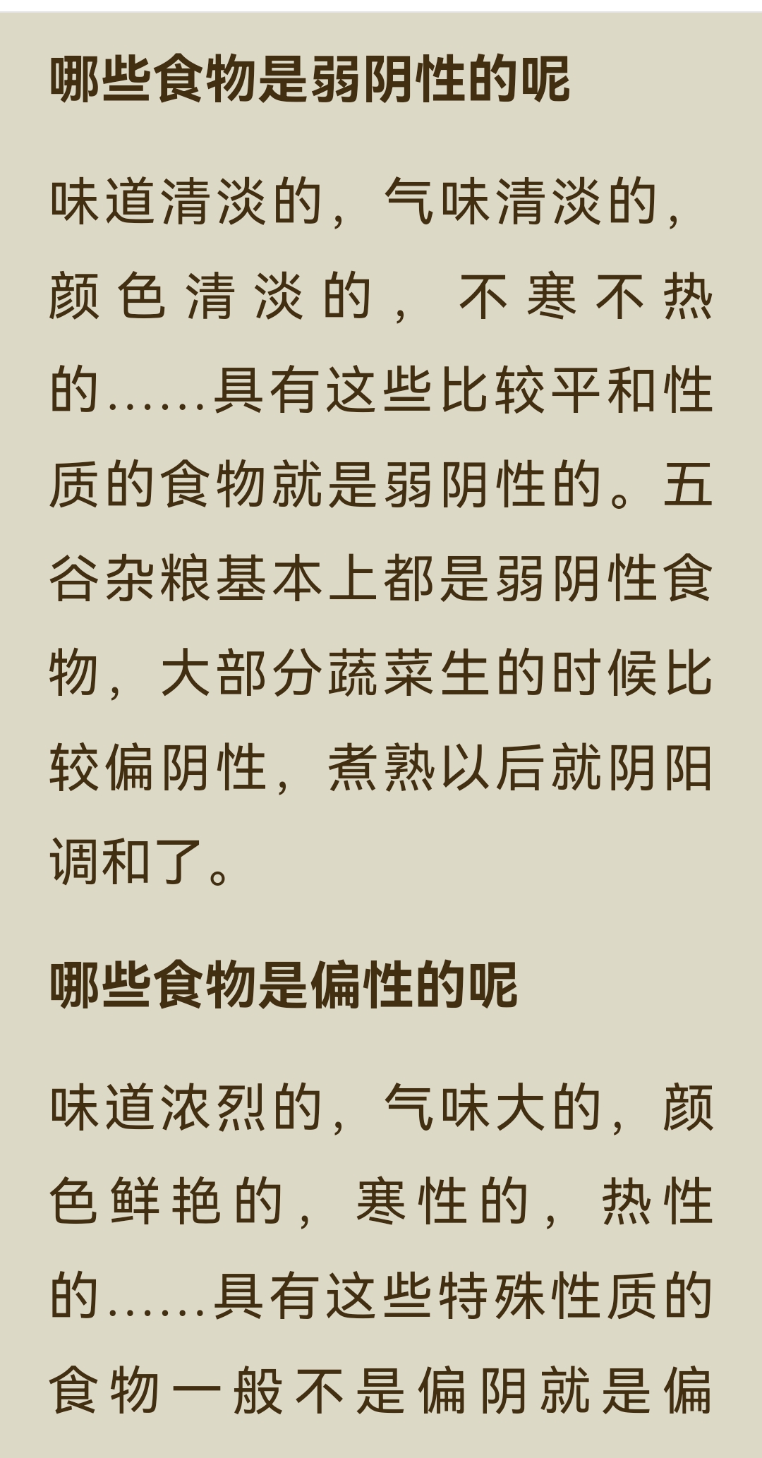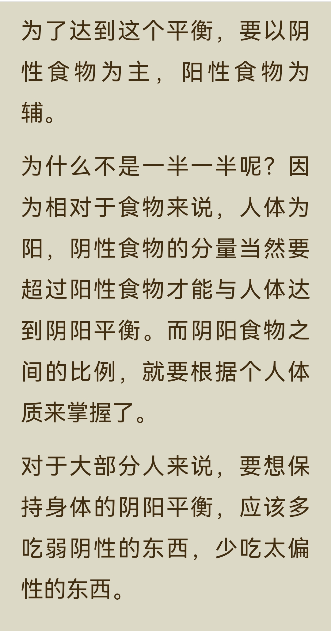 《回家吃饭的智慧》第一章第五小节,核心内容是: 健康饮食要以弱阴性食物为根本,少吃偏性食物,通过“阴主阳辅”的原则来维持身体阴阳平衡。 一、健康饮食的核心原则 1. 以弱阴性食物为主 人体属阳,为了达到阴阳平衡,饮食中阴性食物的分量要超过阳性食物,且应以弱阴性食物为主,阳性食物为辅。 - 弱阴性食物:味道、气味、颜色清淡,不寒不热,性质平和,是营养的根本。 - 偏性食物(强阴性/强阳性):味道浓烈、气味大、颜色鲜艳,或性寒、性热,是营养的补充,应少吃。 2. 为什么要多吃弱阴性食物 - 五谷杂粮(米、面等主食)多为弱阴性,最易与人体达成和谐,因此我们要以米、面为主食。 - 大部分蔬菜生食时偏阴性,煮熟后阴阳调和,成为弱阴性食物。 - 肥甘厚味(油腻、甜腻的食物)属于强阴性,麻辣辛香的调料属于强阳性,这类偏性食物会打破身体平衡,因此养生最忌讳肥甘厚味,饮食宜清淡。 二、弱阴性与偏性食物的区分 - 弱阴性食物:特征是味道清淡、气味清淡、颜色清淡,不寒不热,性质平和。代表食物有五谷杂粮(米、面)、大部分煮熟的蔬菜。 - 偏性食物(强阴性/强阳性):特征是味道浓烈、气味浓烈、颜色浓烈,或性寒、性热。代表食物有盐、酱油、醋、葱、姜、蒜、胡椒等各种调料;酒、咖啡、浓茶;茴香、韭菜、黄瓜、西红柿;榴莲、芒果、柿子、李子等;以及大部分生蔬菜。 三、总结 弱阴性食物是营养的根本,人可以不吃偏性食物,但没有弱阴性食物就无法健康。因此,健康饮食的第一原则,就是一定要吃主食和煮熟的蔬菜,并根据个人体质调整阴阳食物的比例。