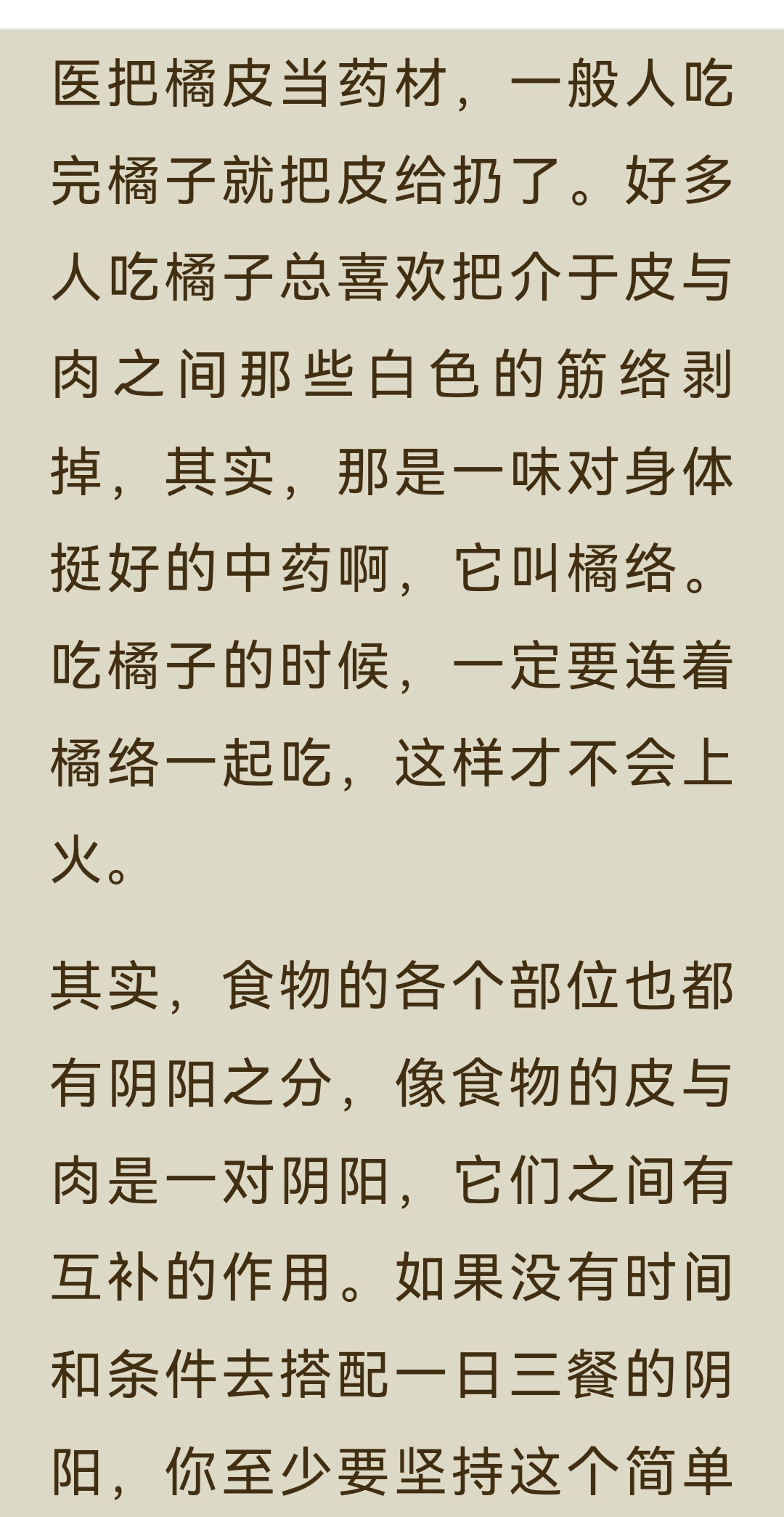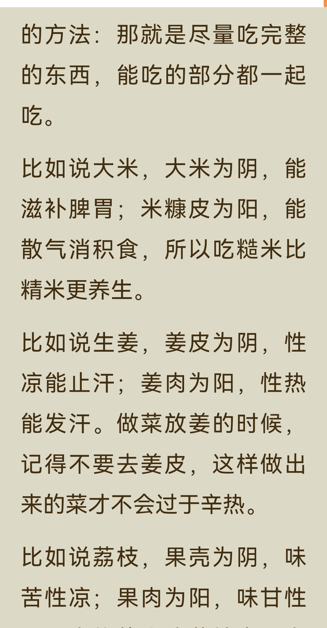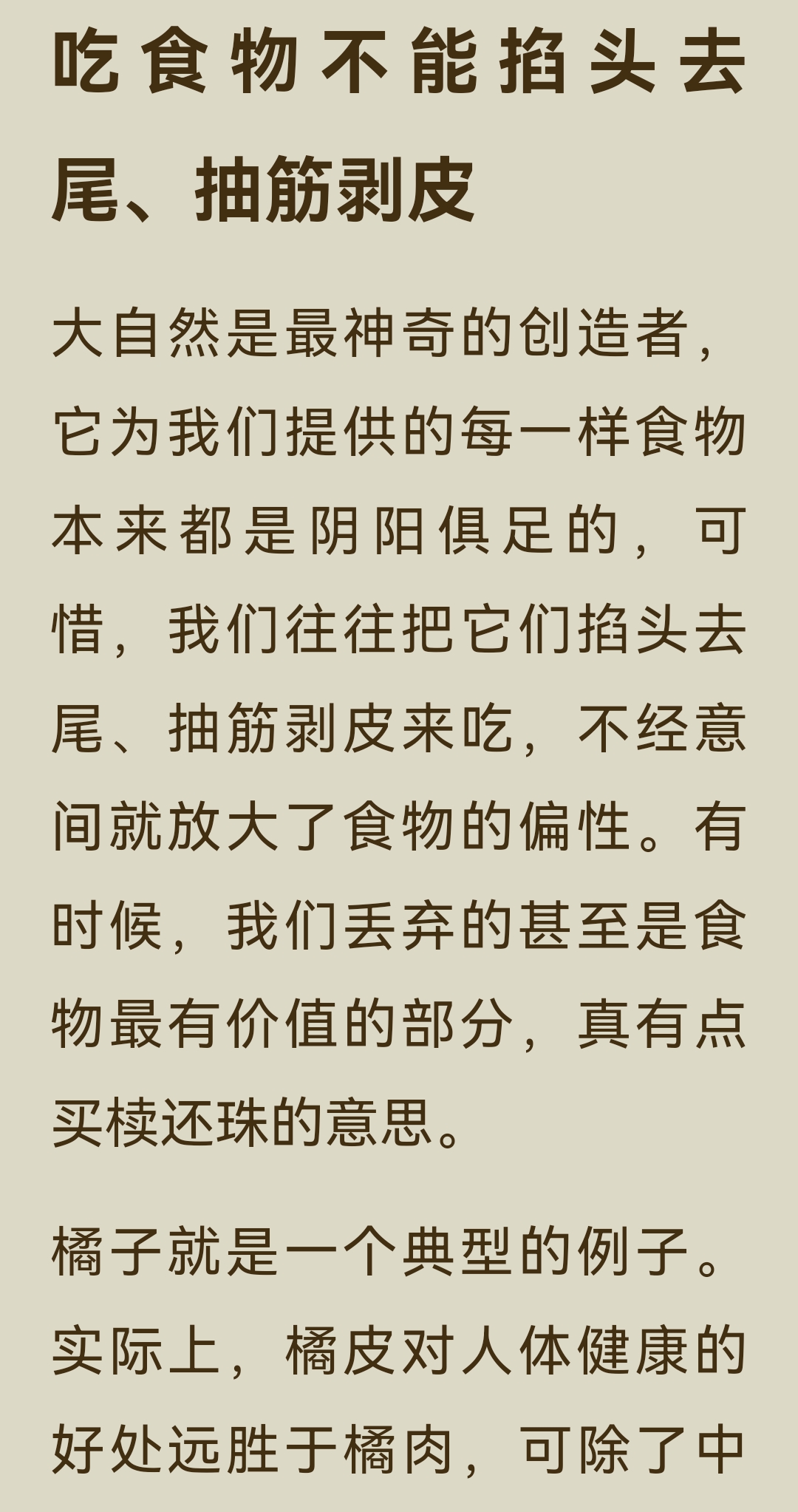 《回家吃饭的智慧》第一章第六小节,核心内容是: 吃食物要尽量完整,避免掐头去尾、抽筋剥皮,因为食物各部位存在阴阳互补关系,完整食用才能保持阴阳平衡,发挥最大养生价值。 一、核心观点 大自然提供的食物本身阴阳俱足,但人们在食用时,常通过去皮、去筋、去壳等方式,丢弃了有价值的部分,放大了食物的偏性,这就像“买椟还珠”。因此,最简单的养生方法,就是尽量吃完整的东西,能吃的部分都一起吃。 二、食物各部位的阴阳互补示例 1. 橘子 - 橘肉(阴)偏凉,易上火;橘皮(阳)偏温,可理气健脾;橘络(介于皮与肉之间的白色筋络)是一味中药,能通络化痰。连橘络一起吃,可避免上火。 2. 大米 - 大米(阴)滋补脾胃;米糠皮(阳)散气消积食。因此,吃糙米比精米更养生。 3. 生姜 - 姜皮(阴)性凉,能止汗;姜肉(阳)性热,能发汗。做菜时不去姜皮,可避免菜肴过于辛热。 4. 荔枝 - 果肉(阳)味甘性温,易导致血热人群上火、流鼻血;果壳(阴)味苦性凉,用其泡水可调理上火症状。 5. 鲤鱼 - 鱼肉(阳)能利尿消肿;鱼皮和鱼鳞(阴)能收涩止血。日常食用尽量不去鳞,入药调理水肿时则需去鳞。 6. 驴 - 驴肉(阳)补气强身;驴皮(阴)熬制后为阿胶,可滋阴补血。 7. 花生 - 存在两对阴阳:花生米(阴)润肺,花生壳(阳)敛肺、降脂;花生仁(阴)补血,花生红衣(阳)止血。 8. 鸡蛋 - 存在两对阴阳:蛋壳(阳)可缓解蛋白质过敏、补钙;蛋清(阴)性凉补气,蛋黄(阳)性温补血,二者同食可阴阳平衡,且不会升高血脂。 三、总结 阴阳是相对的概念,食物的皮与肉、不同部位之间存在阴阳互补。如果没有时间精细搭配三餐,坚持“吃完整的食物”,就能在日常饮食中自然地维持阴阳平衡,达到养生目的。