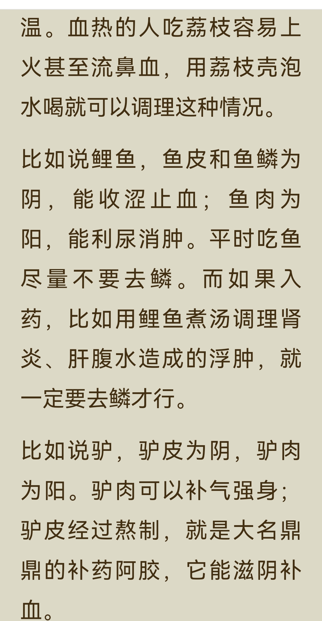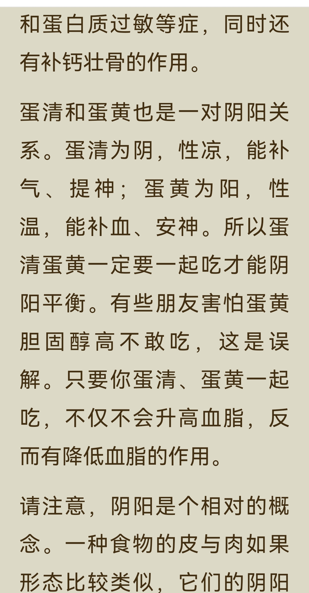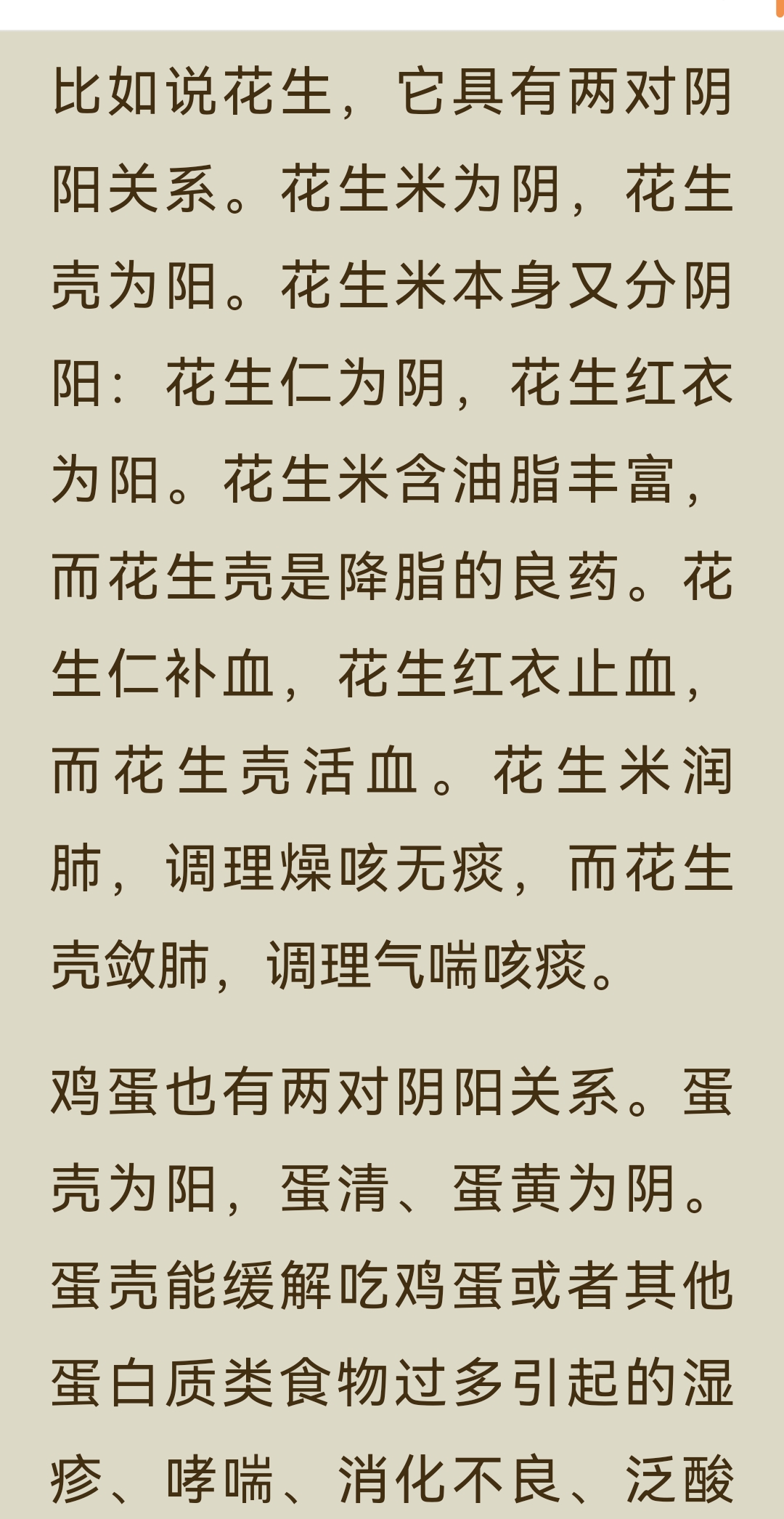 《回家吃饭的智慧》第一章第六小节,核心内容是: 吃食物要尽量完整,避免掐头去尾、抽筋剥皮,因为食物各部位存在阴阳互补关系,完整食用才能保持阴阳平衡,发挥最大养生价值。 一、核心观点 大自然提供的食物本身阴阳俱足,但人们在食用时,常通过去皮、去筋、去壳等方式,丢弃了有价值的部分,放大了食物的偏性,这就像“买椟还珠”。因此,最简单的养生方法,就是尽量吃完整的东西,能吃的部分都一起吃。 二、食物各部位的阴阳互补示例 1. 橘子 - 橘肉(阴)偏凉,易上火;橘皮(阳)偏温,可理气健脾;橘络(介于皮与肉之间的白色筋络)是一味中药,能通络化痰。连橘络一起吃,可避免上火。 2. 大米 - 大米(阴)滋补脾胃;米糠皮(阳)散气消积食。因此,吃糙米比精米更养生。 3. 生姜 - 姜皮(阴)性凉,能止汗;姜肉(阳)性热,能发汗。做菜时不去姜皮,可避免菜肴过于辛热。 4. 荔枝 - 果肉(阳)味甘性温,易导致血热人群上火、流鼻血;果壳(阴)味苦性凉,用其泡水可调理上火症状。 5. 鲤鱼 - 鱼肉(阳)能利尿消肿;鱼皮和鱼鳞(阴)能收涩止血。日常食用尽量不去鳞,入药调理水肿时则需去鳞。 6. 驴 - 驴肉(阳)补气强身;驴皮(阴)熬制后为阿胶,可滋阴补血。 7. 花生 - 存在两对阴阳:花生米(阴)润肺,花生壳(阳)敛肺、降脂;花生仁(阴)补血,花生红衣(阳)止血。 8. 鸡蛋 - 存在两对阴阳:蛋壳(阳)可缓解蛋白质过敏、补钙;蛋清(阴)性凉补气,蛋黄(阳)性温补血,二者同食可阴阳平衡,且不会升高血脂。 三、总结 阴阳是相对的概念,食物的皮与肉、不同部位之间存在阴阳互补。如果没有时间精细搭配三餐,坚持“吃完整的食物”,就能在日常饮食中自然地维持阴阳平衡,达到养生目的。