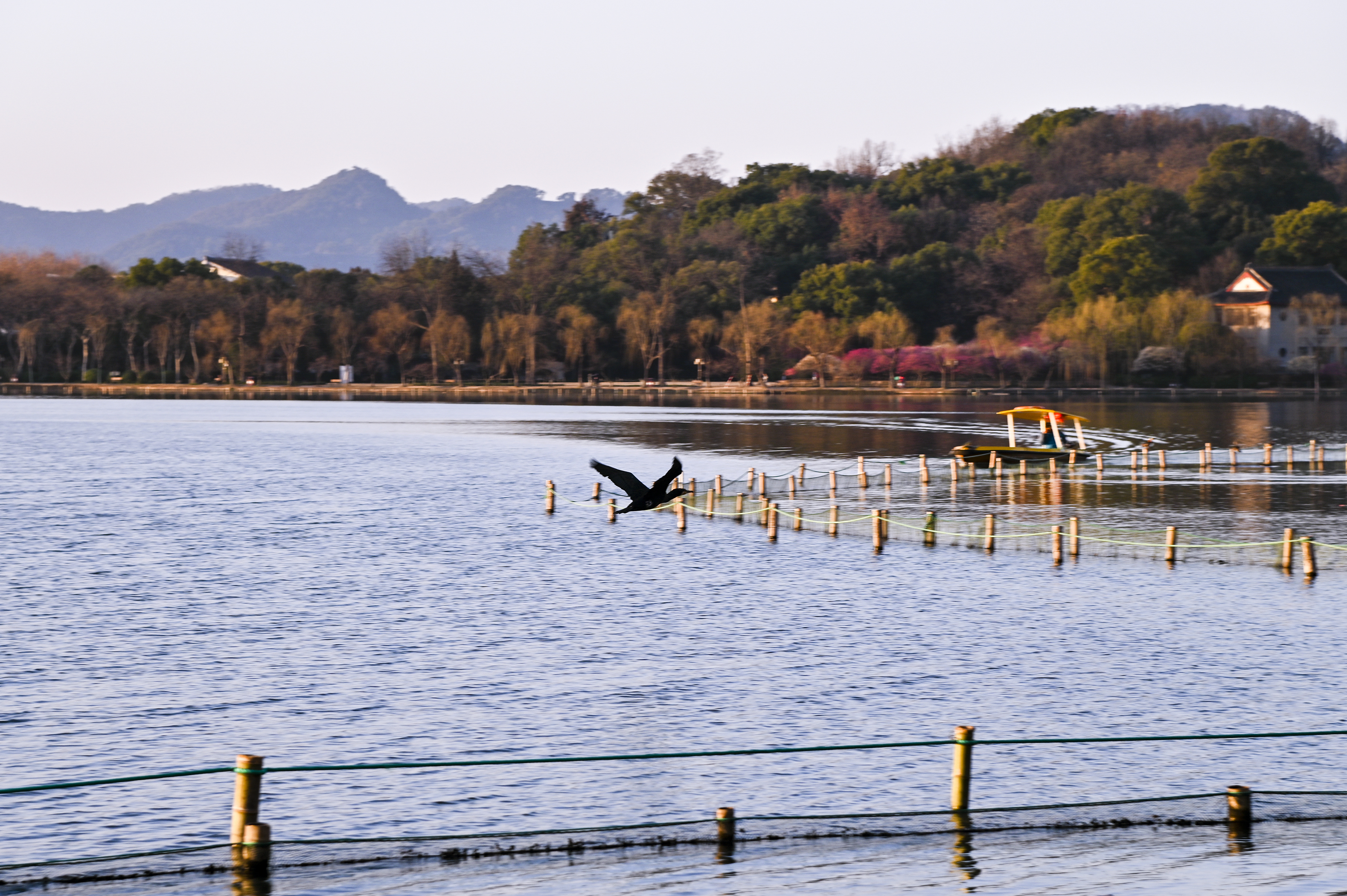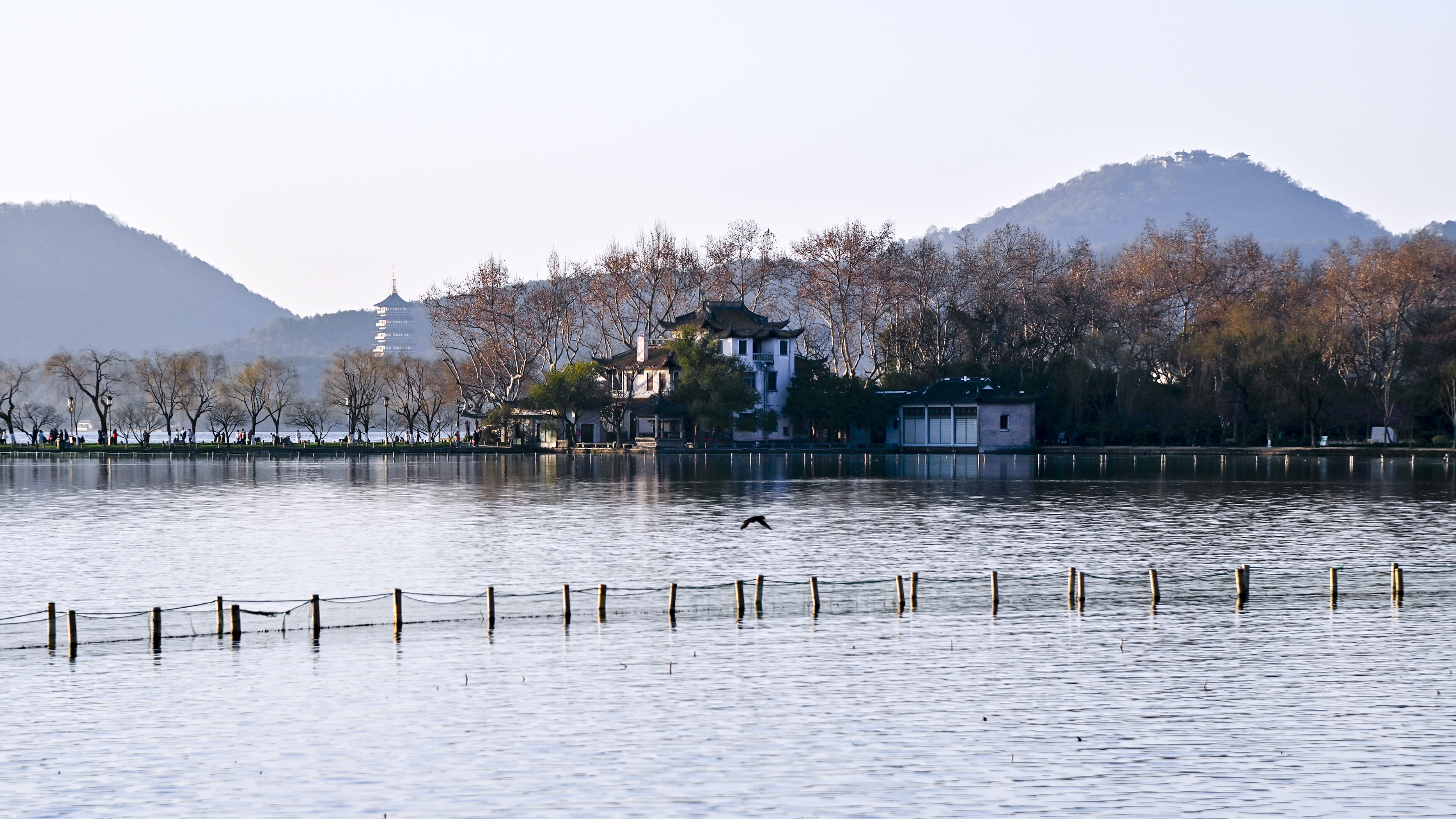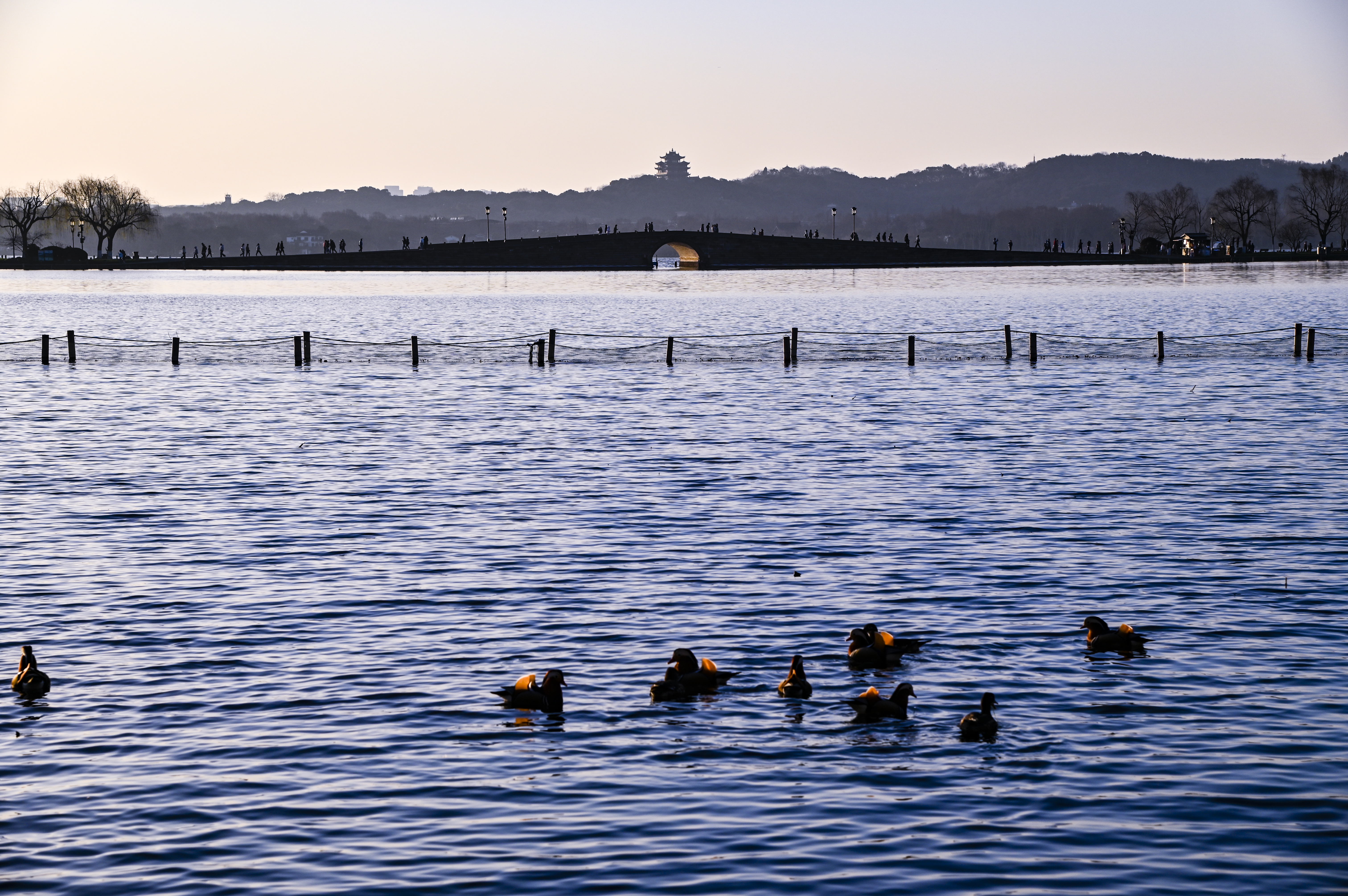 西湖晨曦,初升太阳洒满湖,金光闪闪;城隍阁锦带静卧,鸳鸯戏水;雷峰塔影映孤山,鸬鹚扑鱼;西泠桥下鸭知暖,遥望北高峰,财神爷俯瞰湖光山色,光影流转间,尽显杭城诗画风韵。