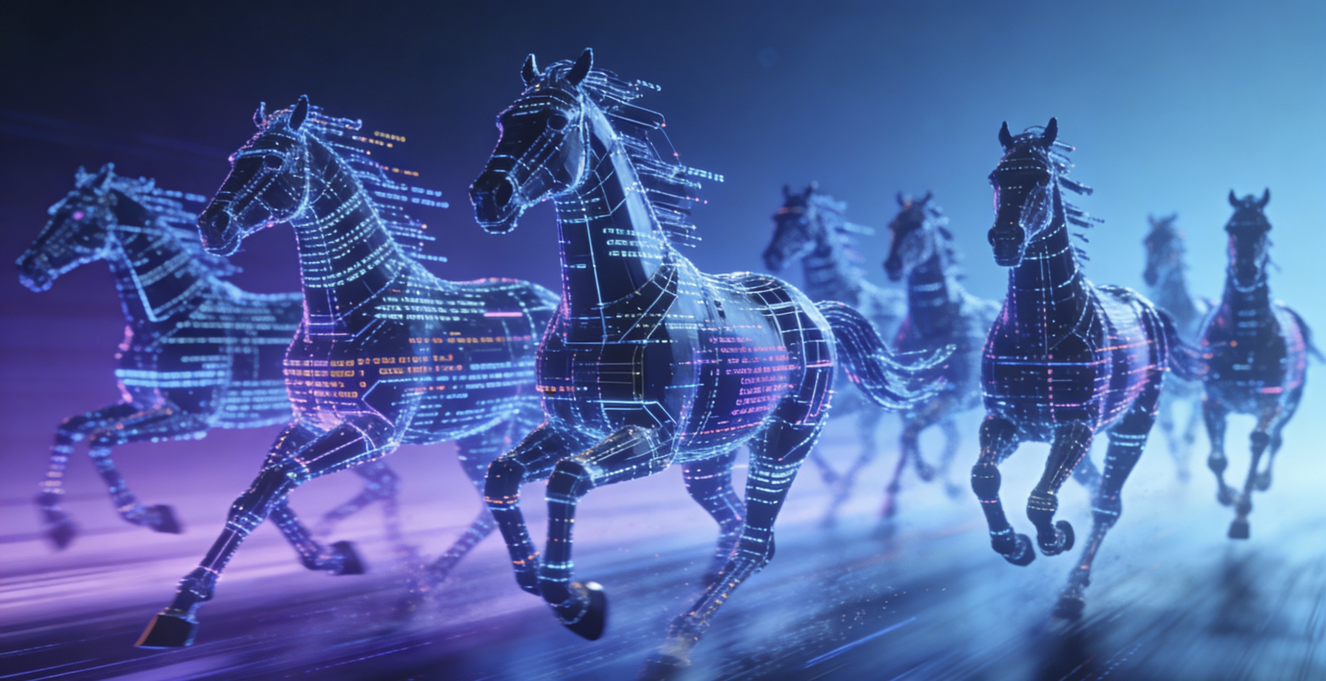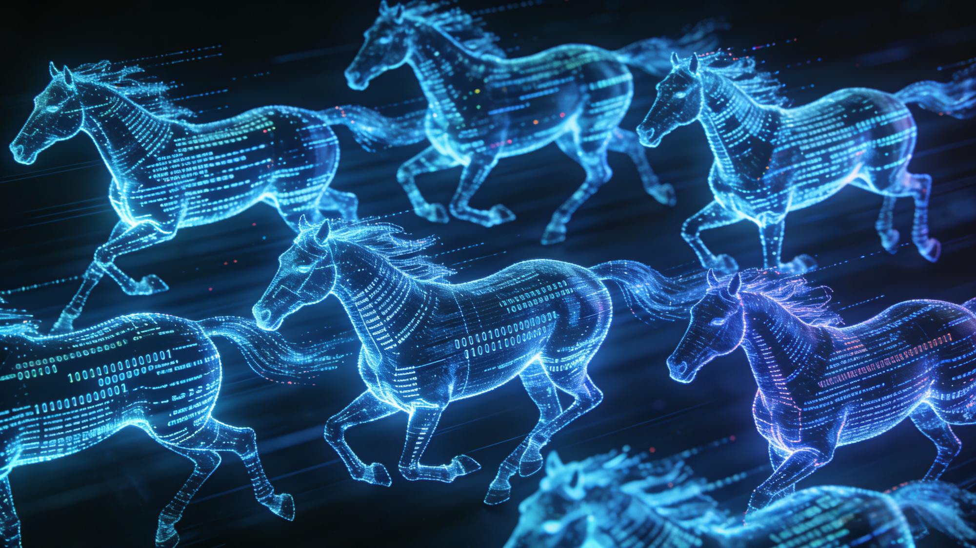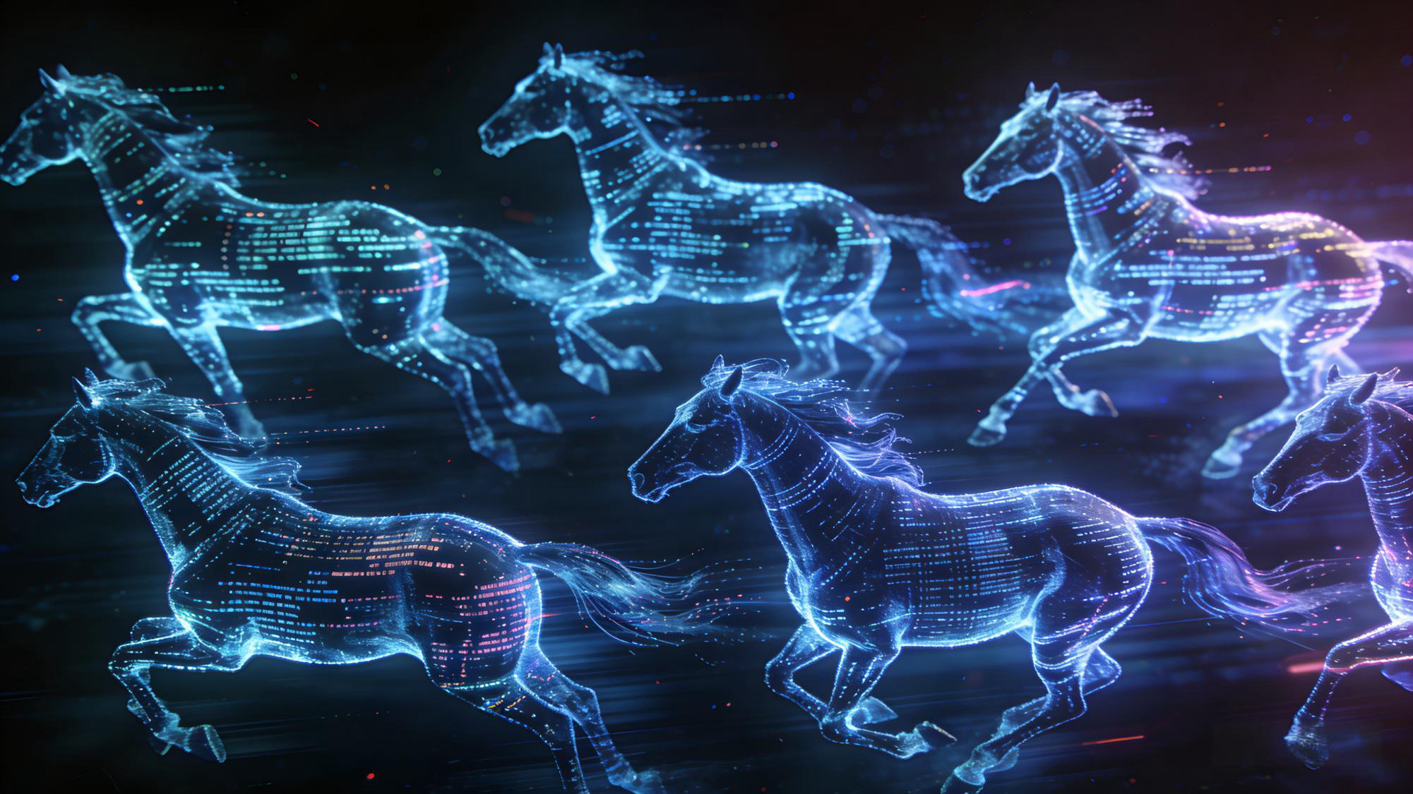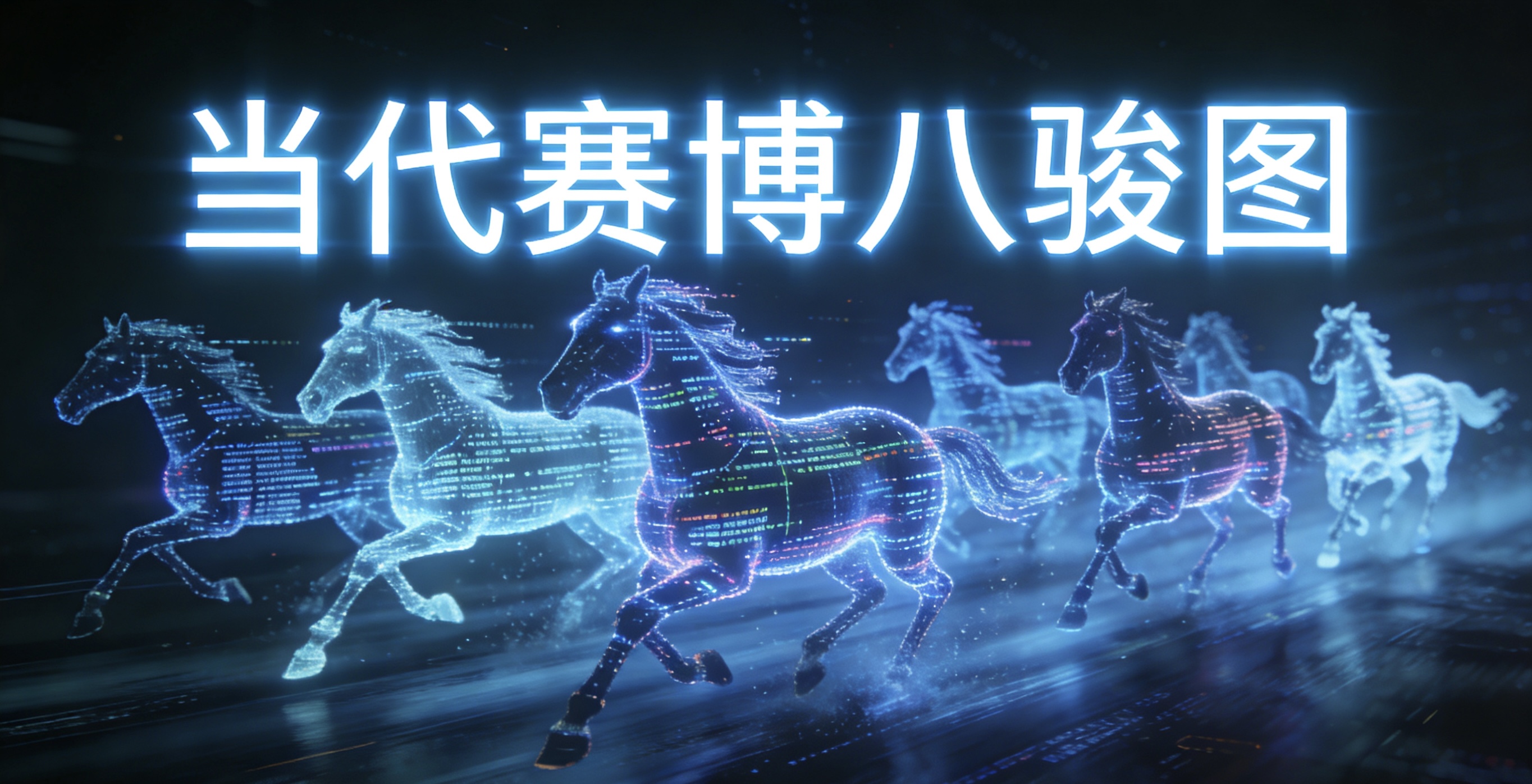 书画类:《当代赛博八骏图》 · 作品描述:用一串神秘的代码生成了八匹奔跑的马。远看是马,近看代码在跑。 · 配文:“这不是马,这是‘马上有码’。祝你新的一年,码到成功,BUG全无!”