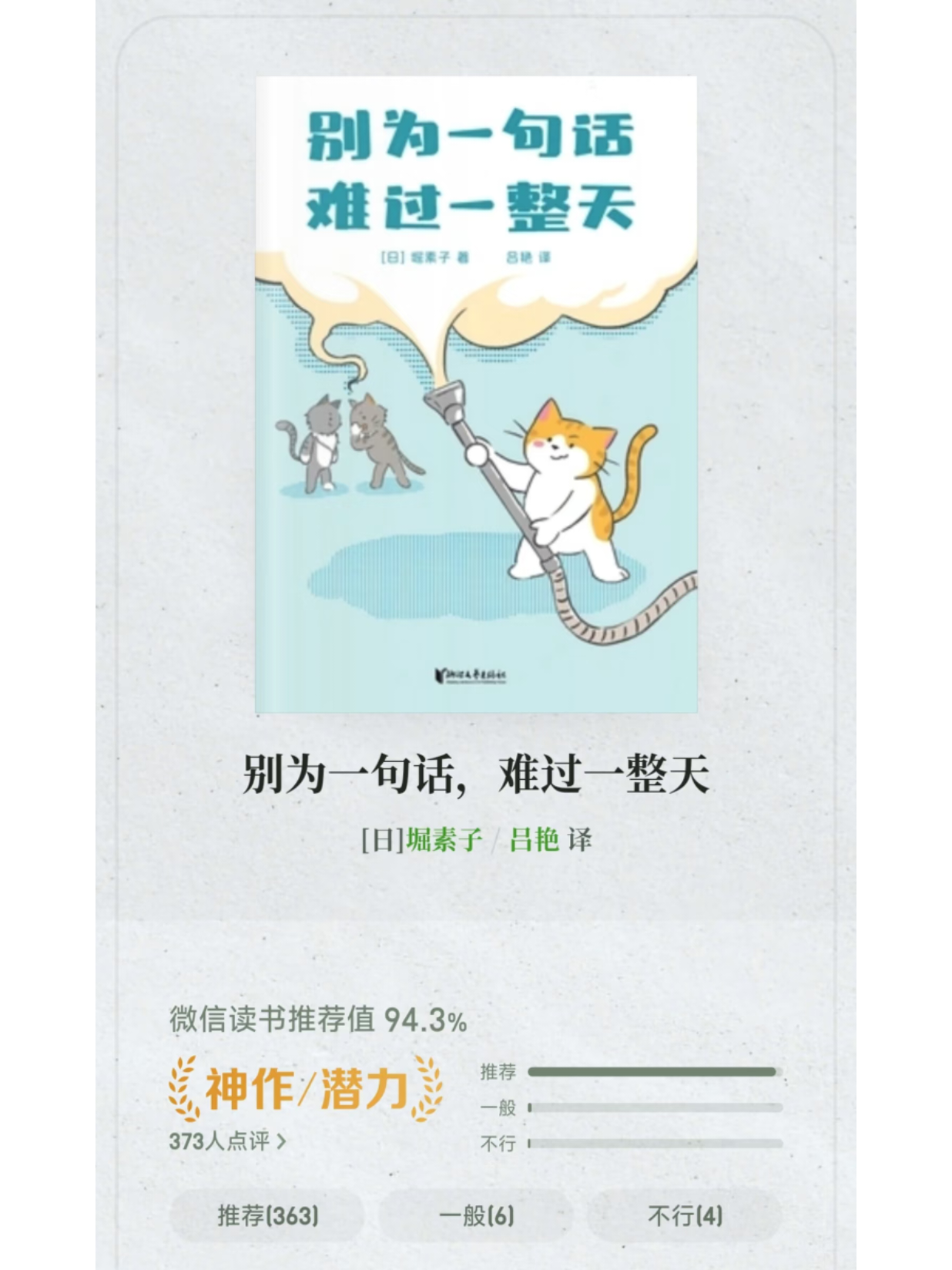 高敏感自救共读《别为一句话,难过一整天》 25年我遇到了很多事情,人生的上升键按下了暂停,生活陷入了不断轮回的内耗,《北方大道》里有一篇文章叫《盐井风筝》,看着朋友们像风筝们一样飞向自由,而我落入了盐井中…就像我的写照。 我开始尝试“自救”,重新找回自己的爱好,强迫自己去抽时间看剧,去阅读复健。曾经我能洋洋洒洒写下很多话,现在需要努力思考才能开口表达。 有些时候遇到的内耗不是我们的错,但却是我们给予自己的自我惩罚,其实到现在我也不知道未来我该怎么办,但是书影是千百个人留下的智慧,我希望能从书中找到答案。 这本书不是帮你找一个“借口”逃避别人的情绪,而是教你分析情绪、自省言行,更像是书中提到的“神经语言程序学”,也叫“大脑与心理的指导手册”。要意识到自己在不知不觉中养成的扭曲的看待事物的方式和思维方式,了解应对方法,并付诸实践。 书中的一句话我非常喜欢也送给大家。 ——人生只有一次,不能重新开始。你是自己人生的主人,也是生活的编剧。无论原来是怎样的人,一个人从决定“改变”的那一刻起,一定会有所改变。