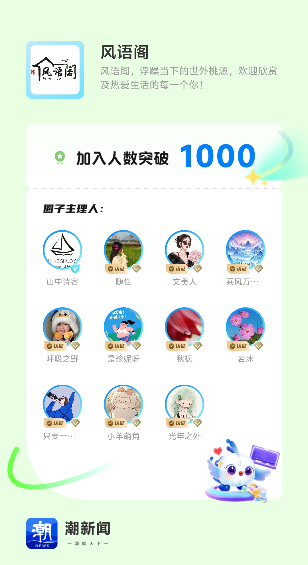 我主理的“风语阁”解锁新成就「加入人数突破1000」,感谢大家的支持,欢迎来圈子互动交流!