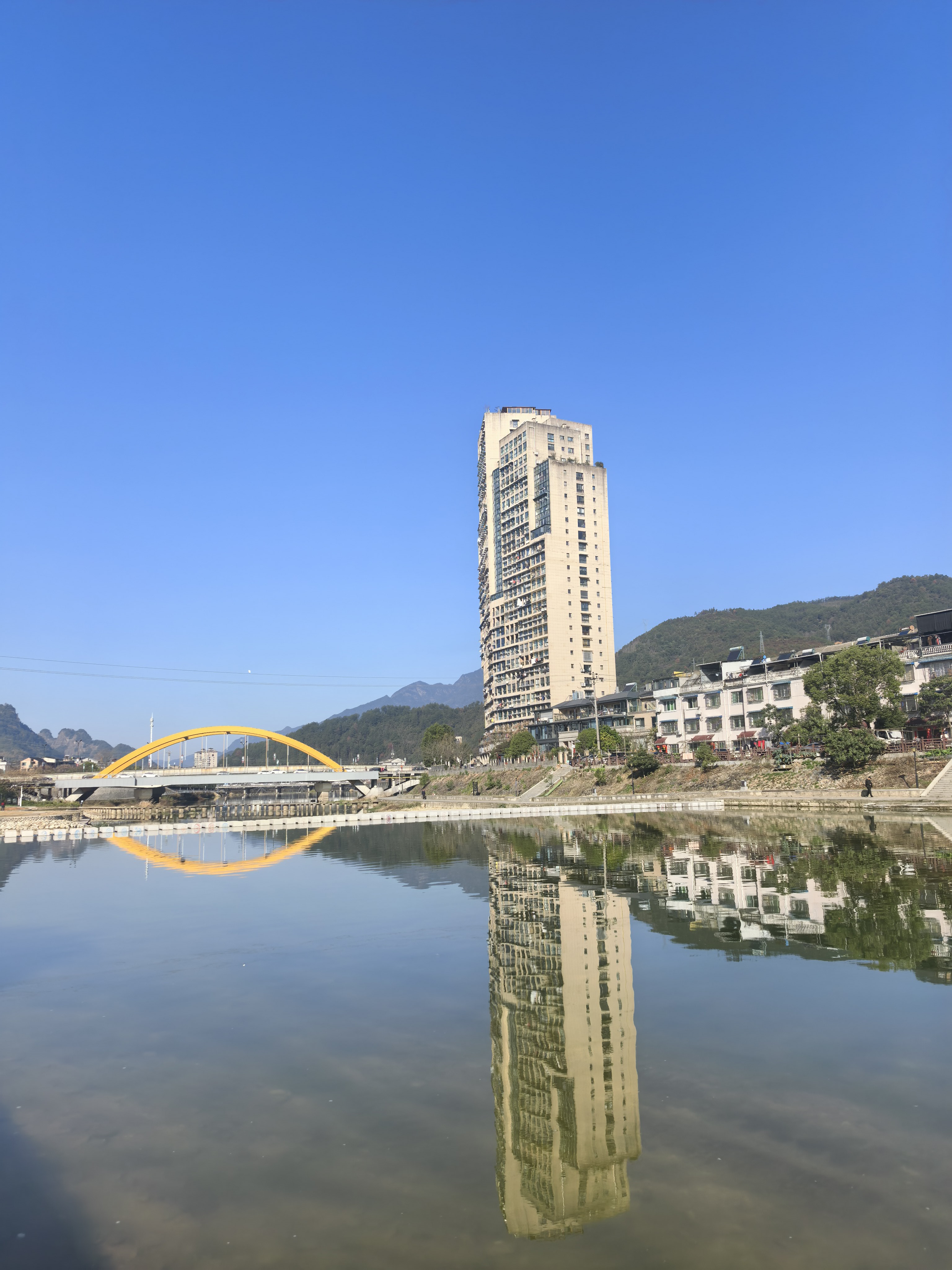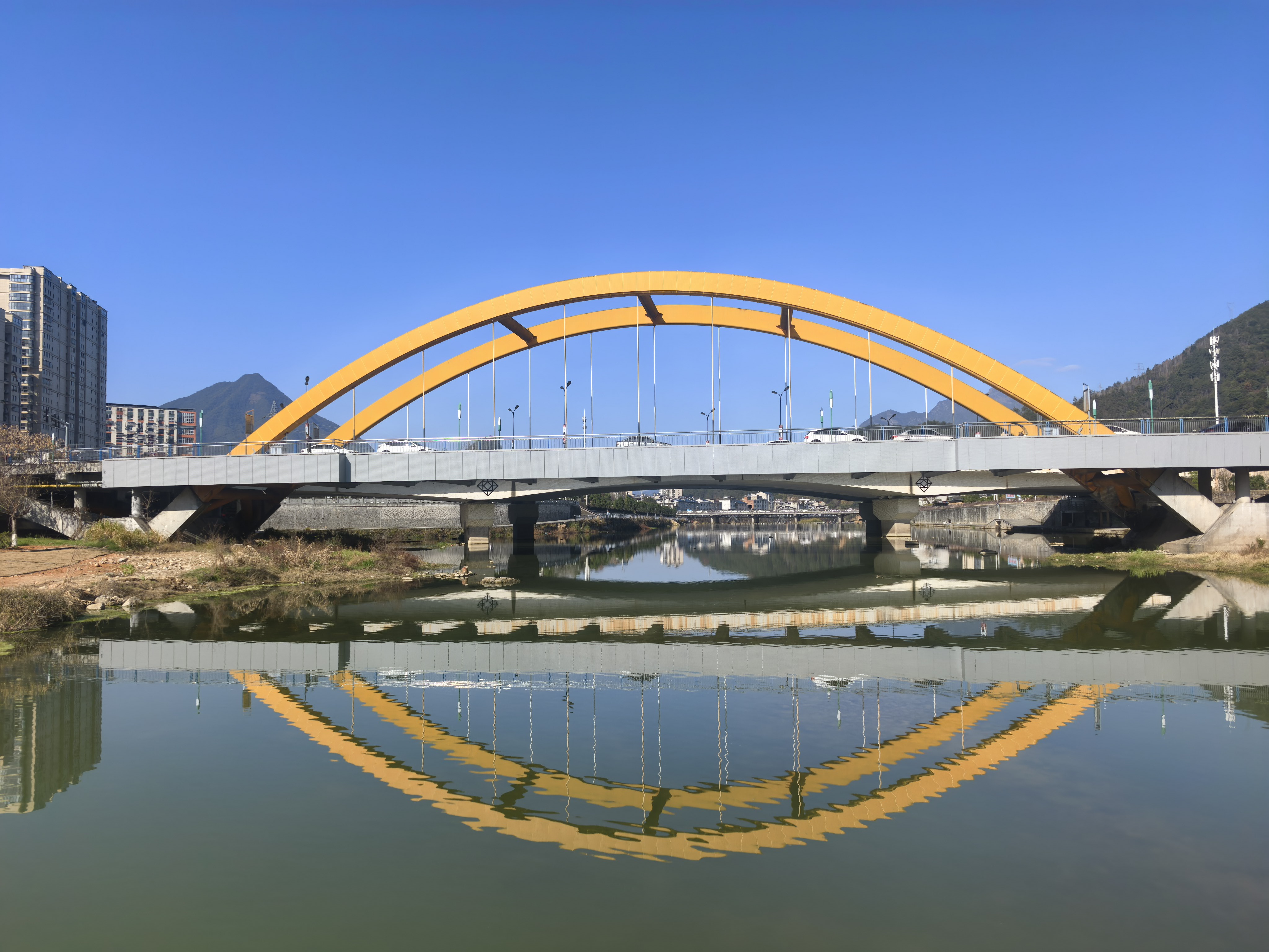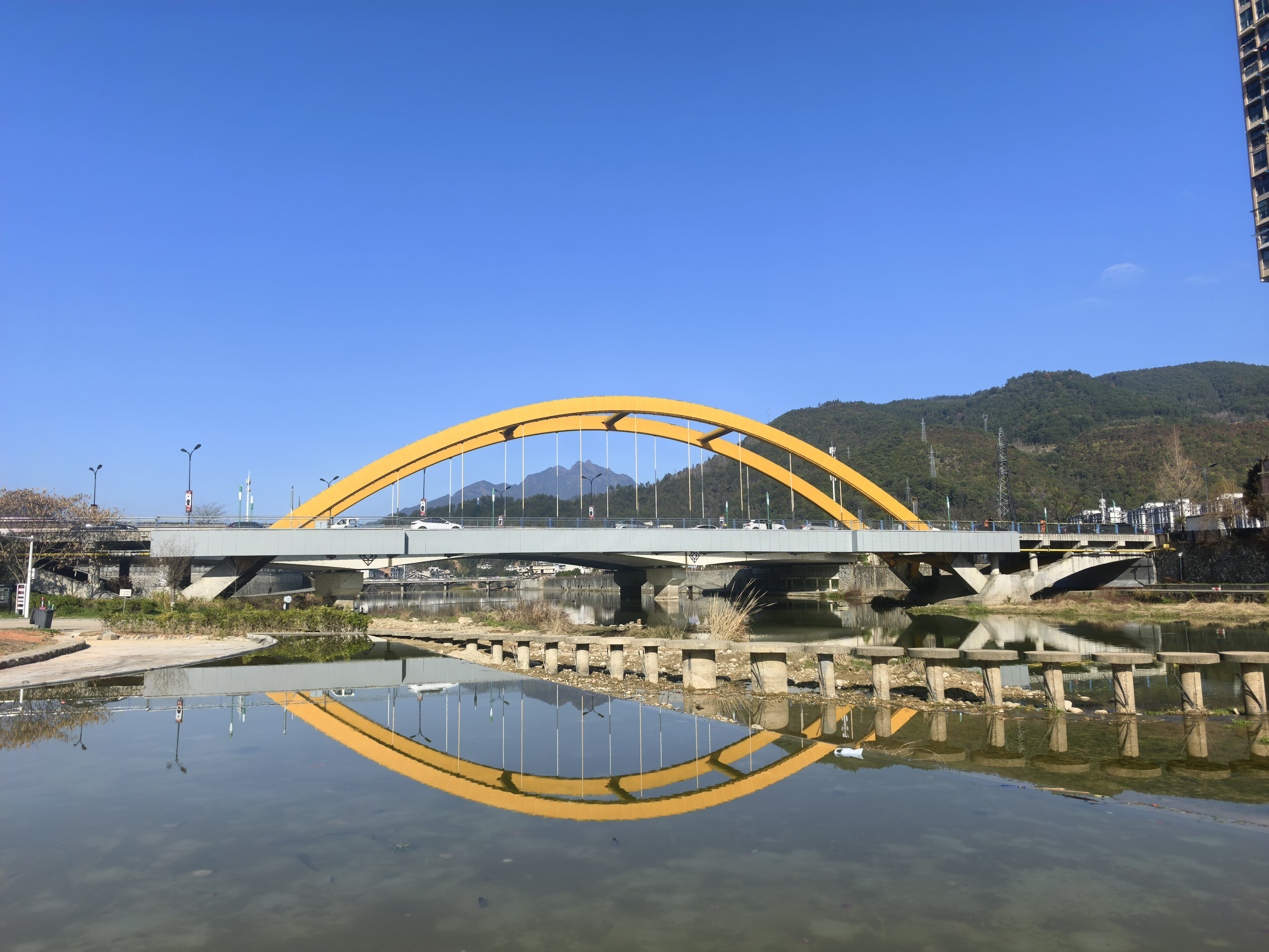 松源溪边,黄色拱桥倒映蓝天,车流静默,山水与高楼温柔相拥~随手一拍都是城市呼吸感~