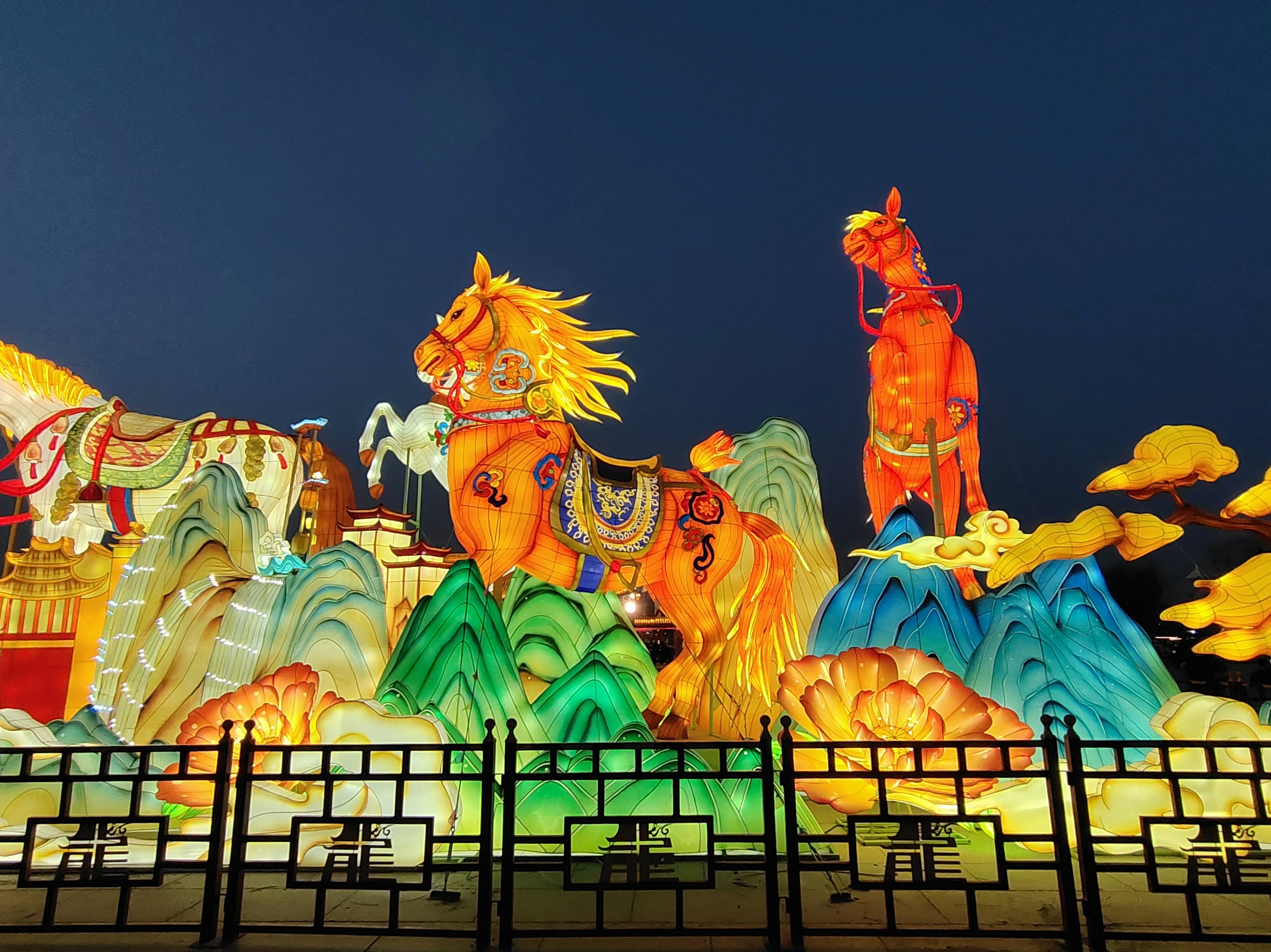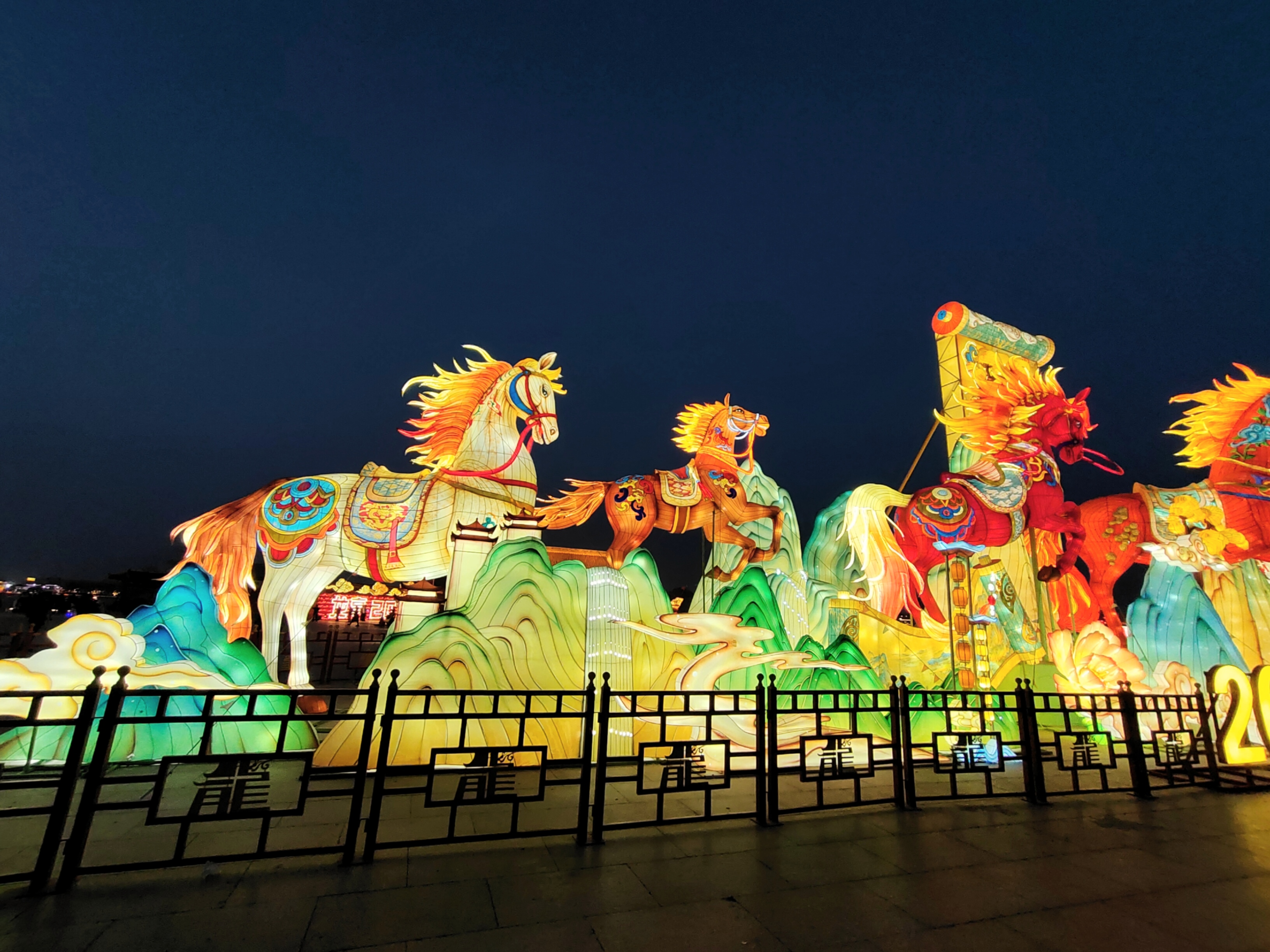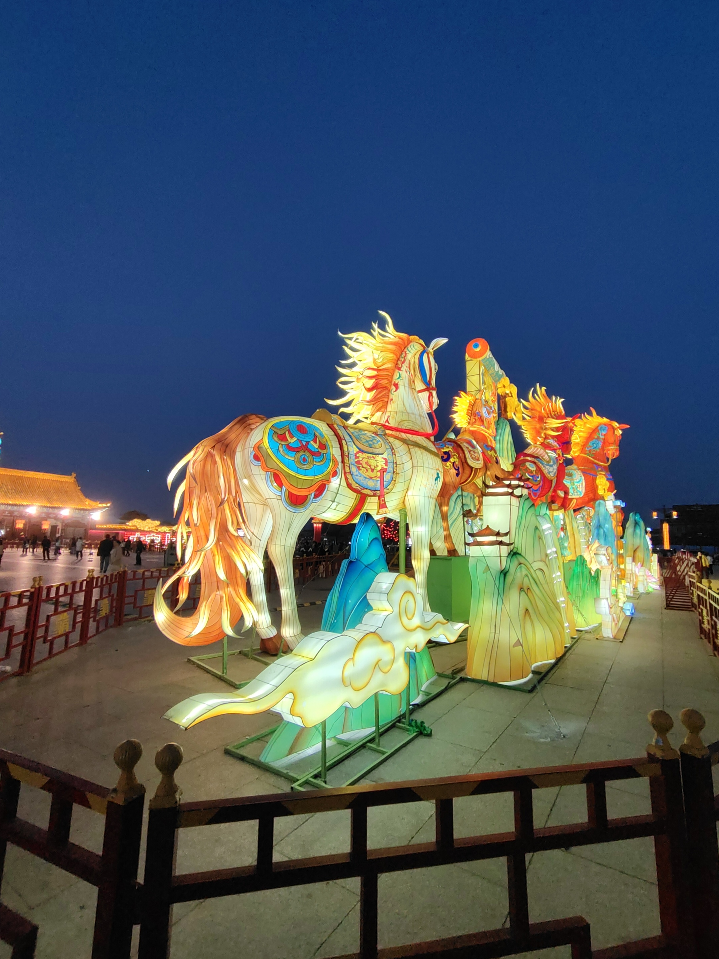 龙亭夜,千灯浮汴水。云纹轻绕朱阁,鲤跃瓶中春意浓。红廊蜿蜒,金鬃骏马踏光而来——一盏灯,照见千年宋韵流转。
