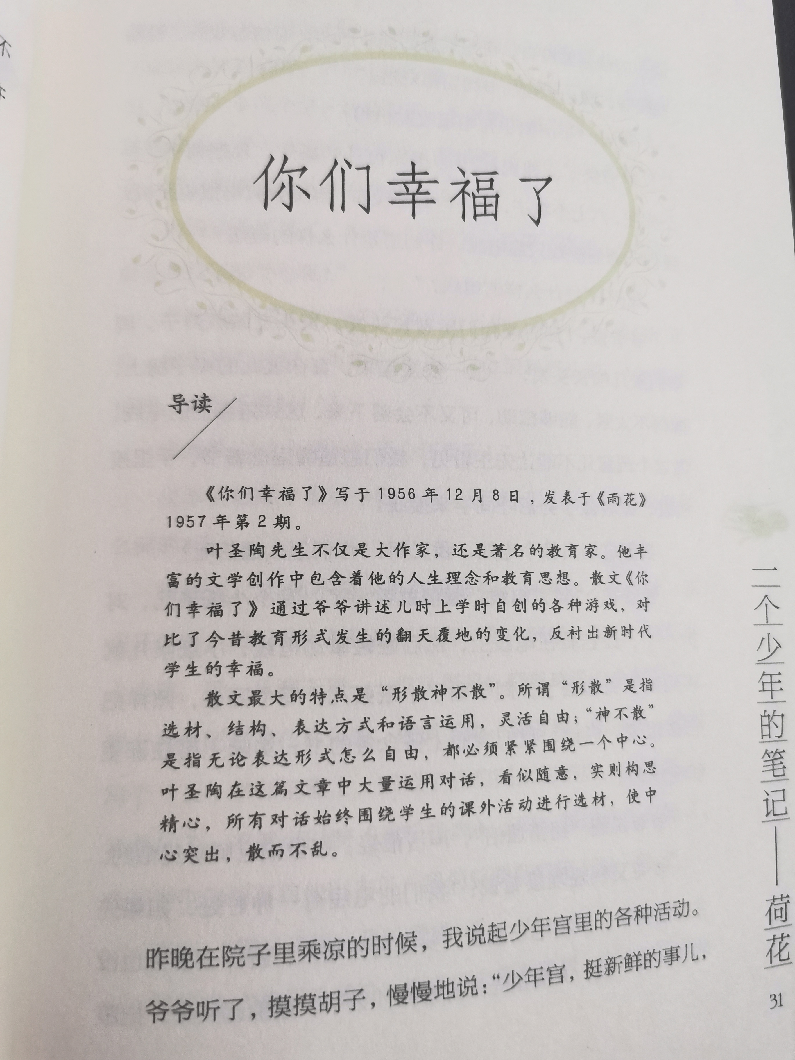 《你们幸福了》:从前先生认为只有读书好,现在先生除了教学生读书,还引导学生尽量地玩儿,认为玩儿跟读书同样重要,这是不同的地方。从这个不同的地方看,你们幸福了。