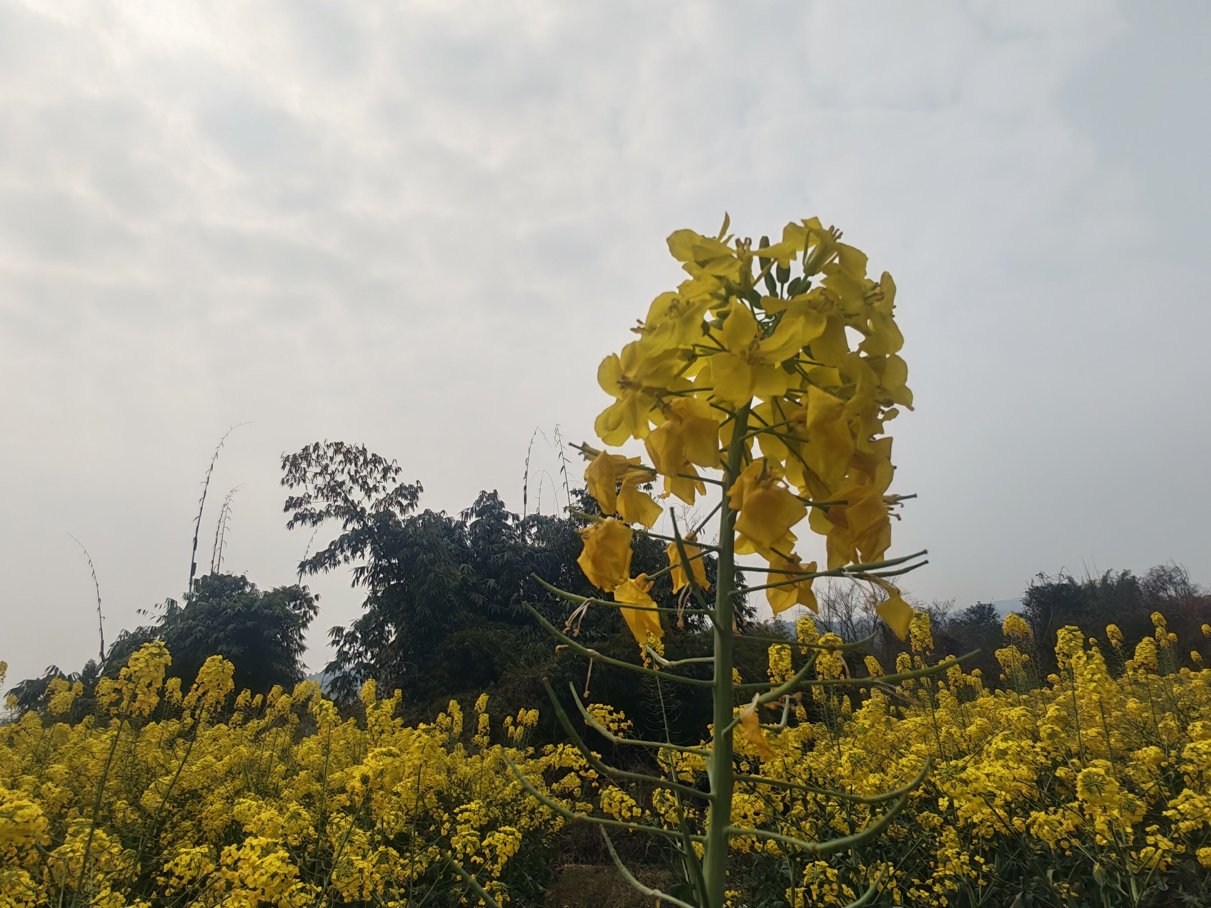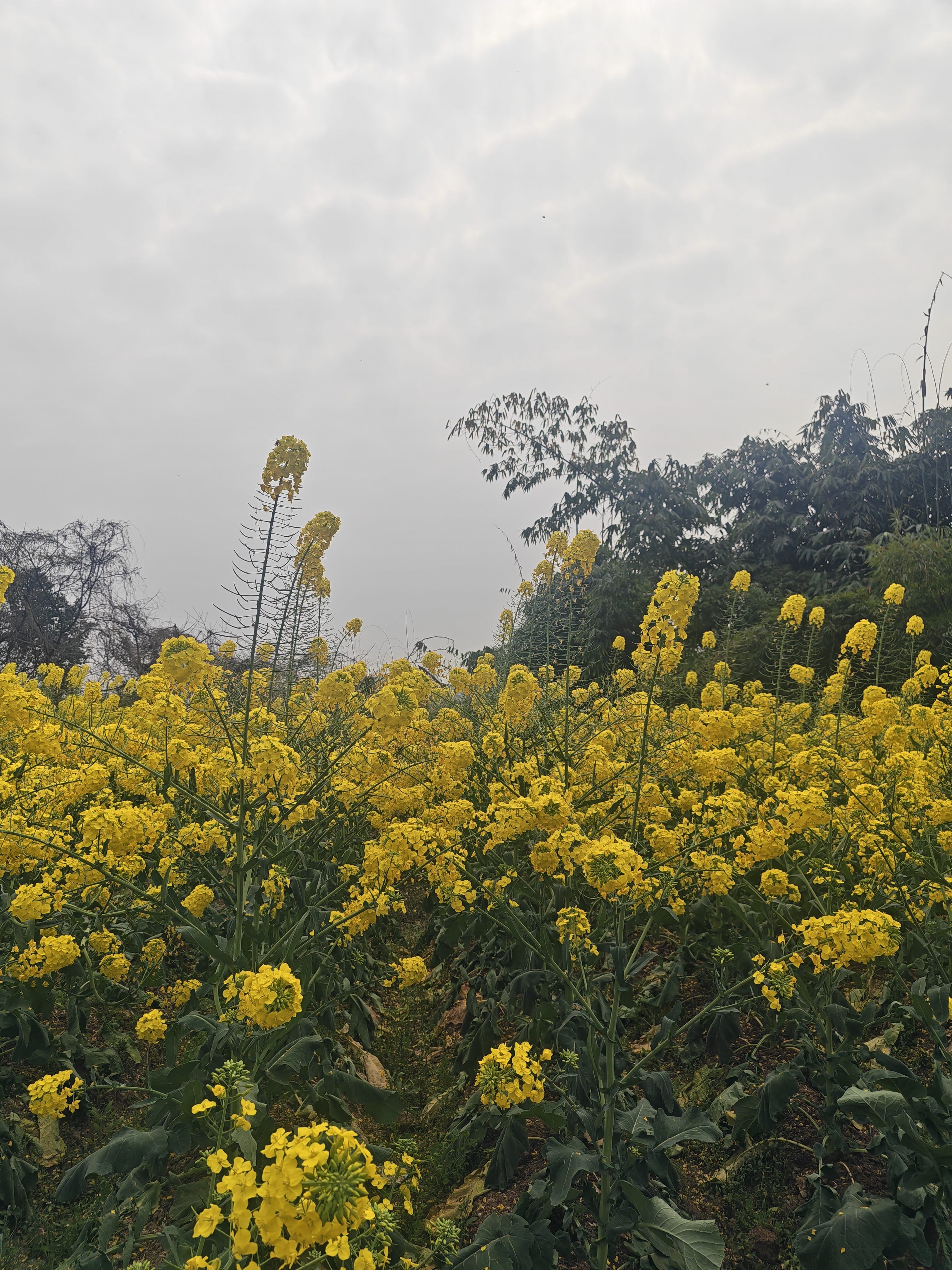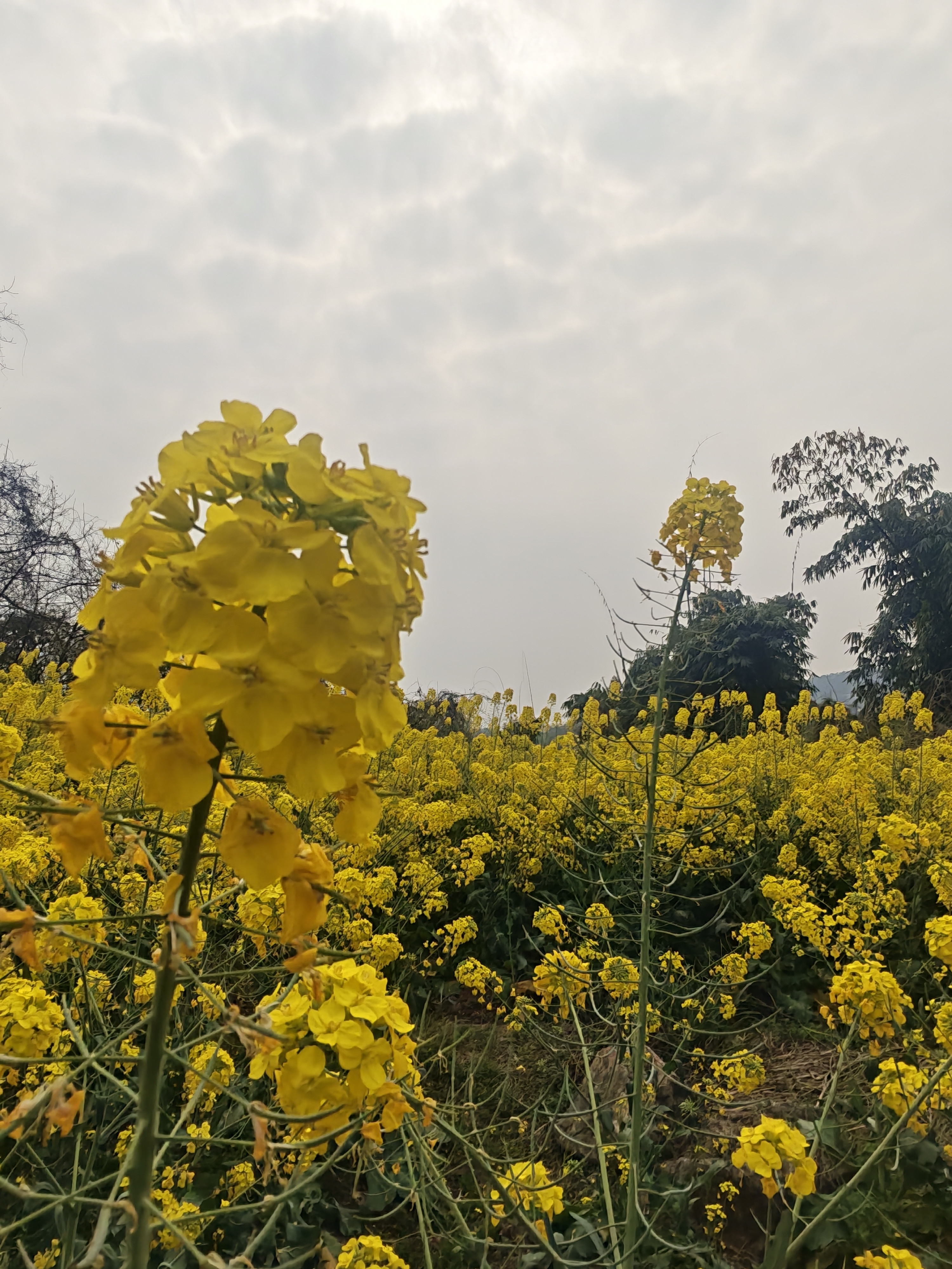 阴云低垂,花海静默,黄绿相间的田野在风里轻轻呼吸,茎叶间藏着整个春天的私语。