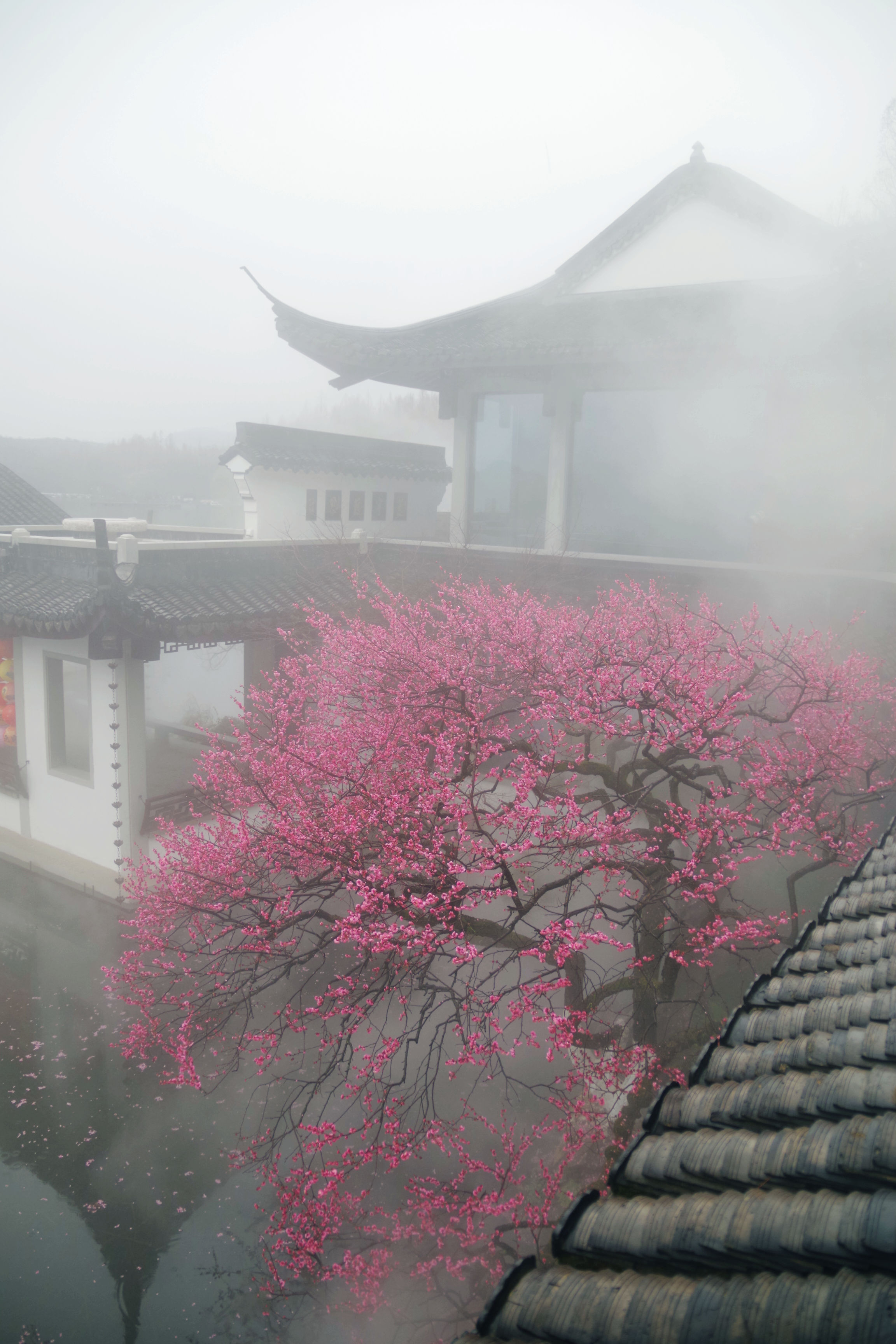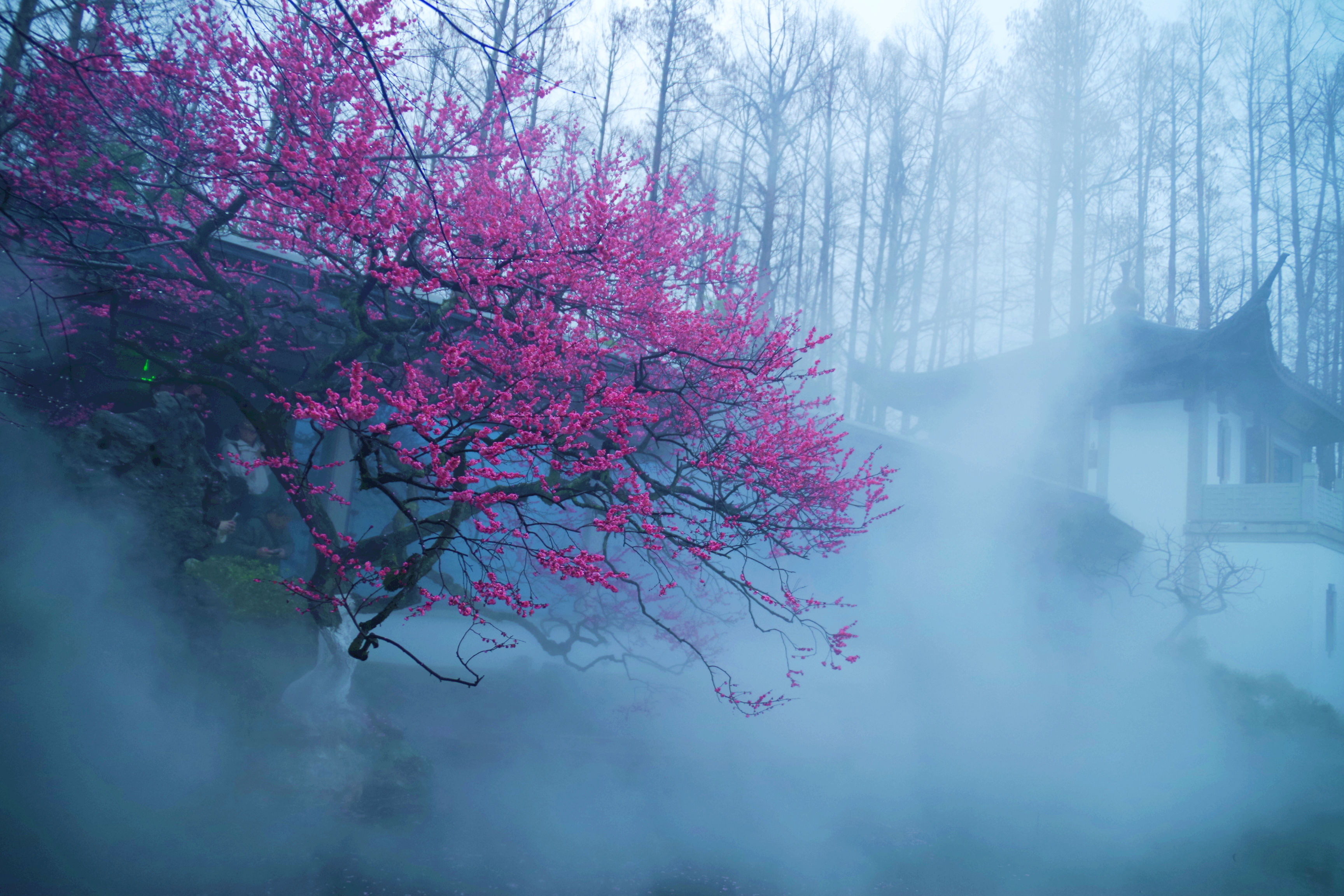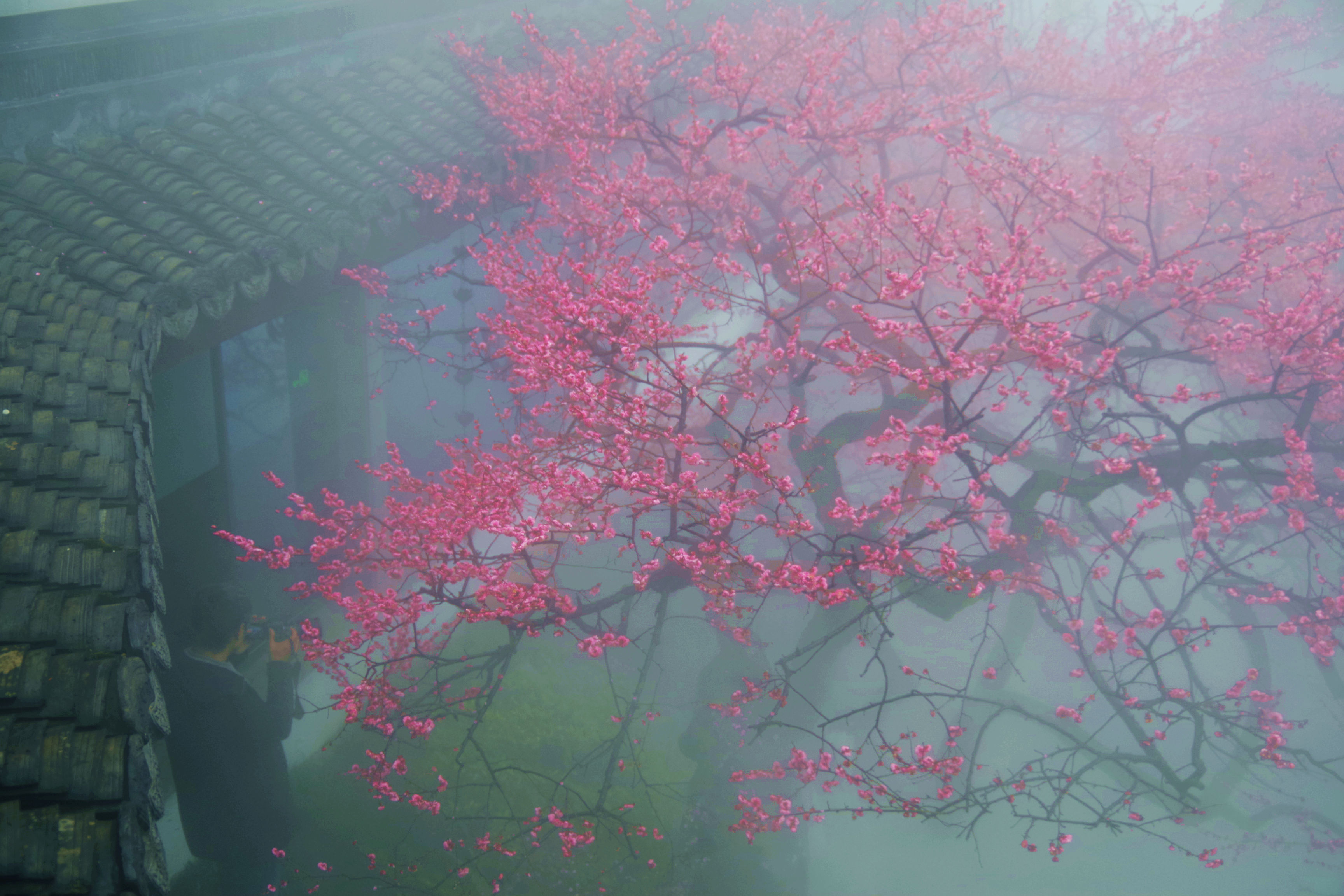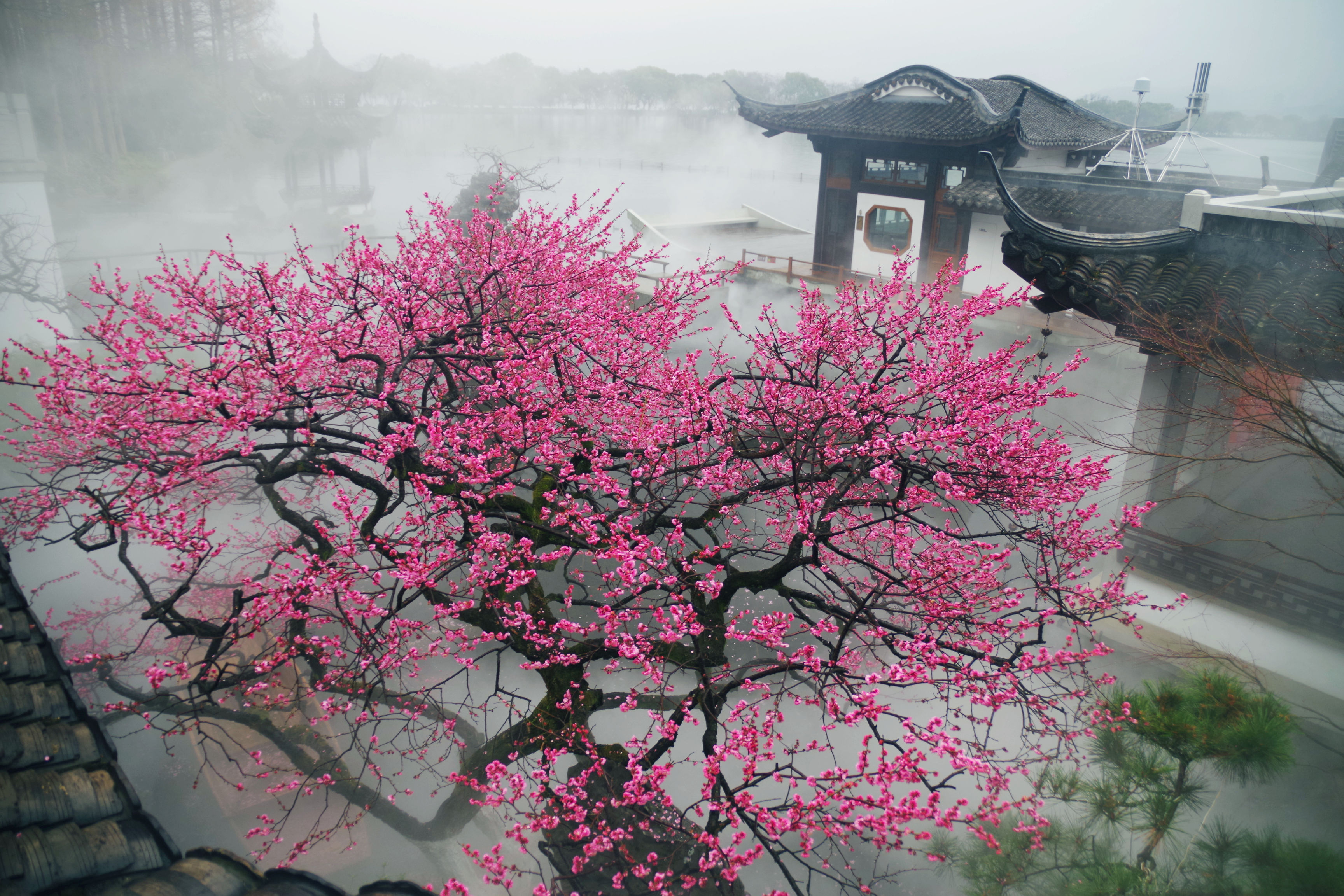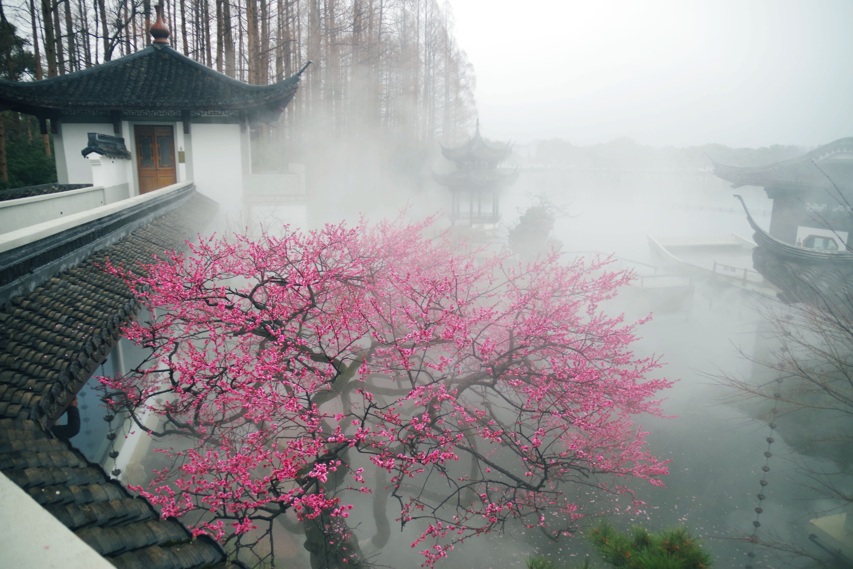昨晚看到湛碧楼老板娘说梅花已经大开,正是赏景的好时候,有人便和老板娘预约了早起去看景,想了想,也报名凑个热闹。湛碧楼在西湖曲院风荷中,临近郭庄,可以远眺雷峰塔,是赏景的好去处。楼内有一株梅花,邻水而开,搭配湛碧楼的雾森系统,宛如瑶池仙境,我每次看到湛碧楼的梅花图,都会觉得被惊艳到。早上五点半醒来,窗外一片漆黑,伴随着淅淅沥沥的雨声,犹豫了两秒要不要早起出门,还是决定起来。美景并不会一直在那里等着我去看,错过了今天,或许会一直惦记且遗憾着。许是春天的缘故,雨并不大,气温虽然下降了些,但也不冷。骑行在路上,感觉还挺惬意的。到了湛碧楼,已经有十几个人在里面拍摄了,雾森下的梅花若隐若现,引得众人惊叹不已,咔嚓咔嚓的快门声不绝于耳。今天我用的广角镜头,可以拍到整株的梅花,还可以把周边的环境拍进来。机位角度大概都是别人早就拍过的,不过我还是喜欢自己拍的照片,哪怕和别人的雷同,也是我自己的劳动成果。在湛碧楼待了不到一小时就出来了,赶时间回来开店带娃。新年开工的的第一天,看了美景,兑了彩票,也算精神财富和物质财富双丰收了。
