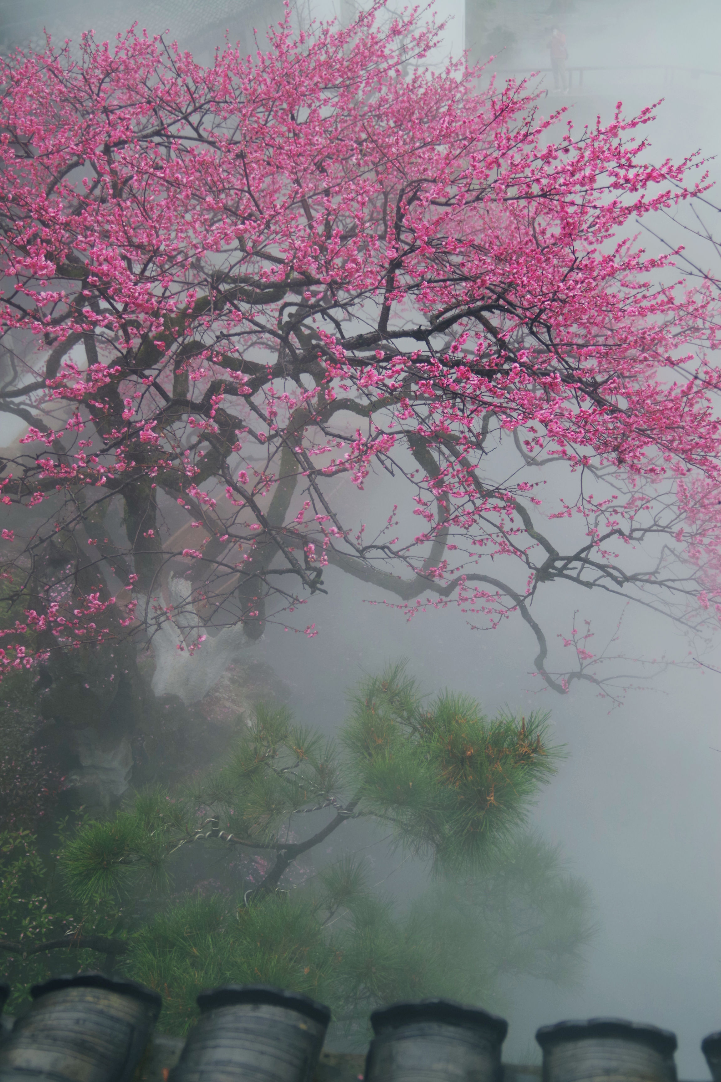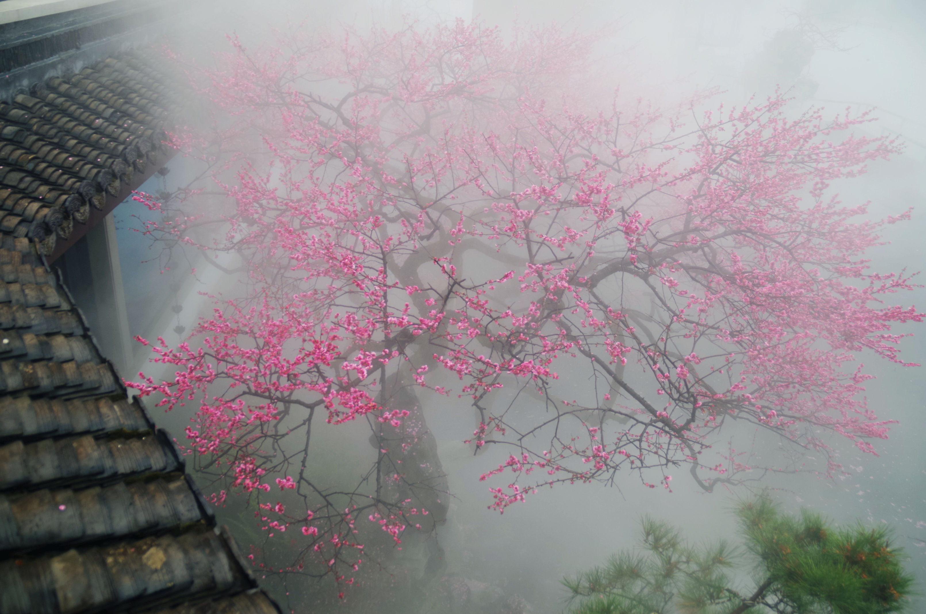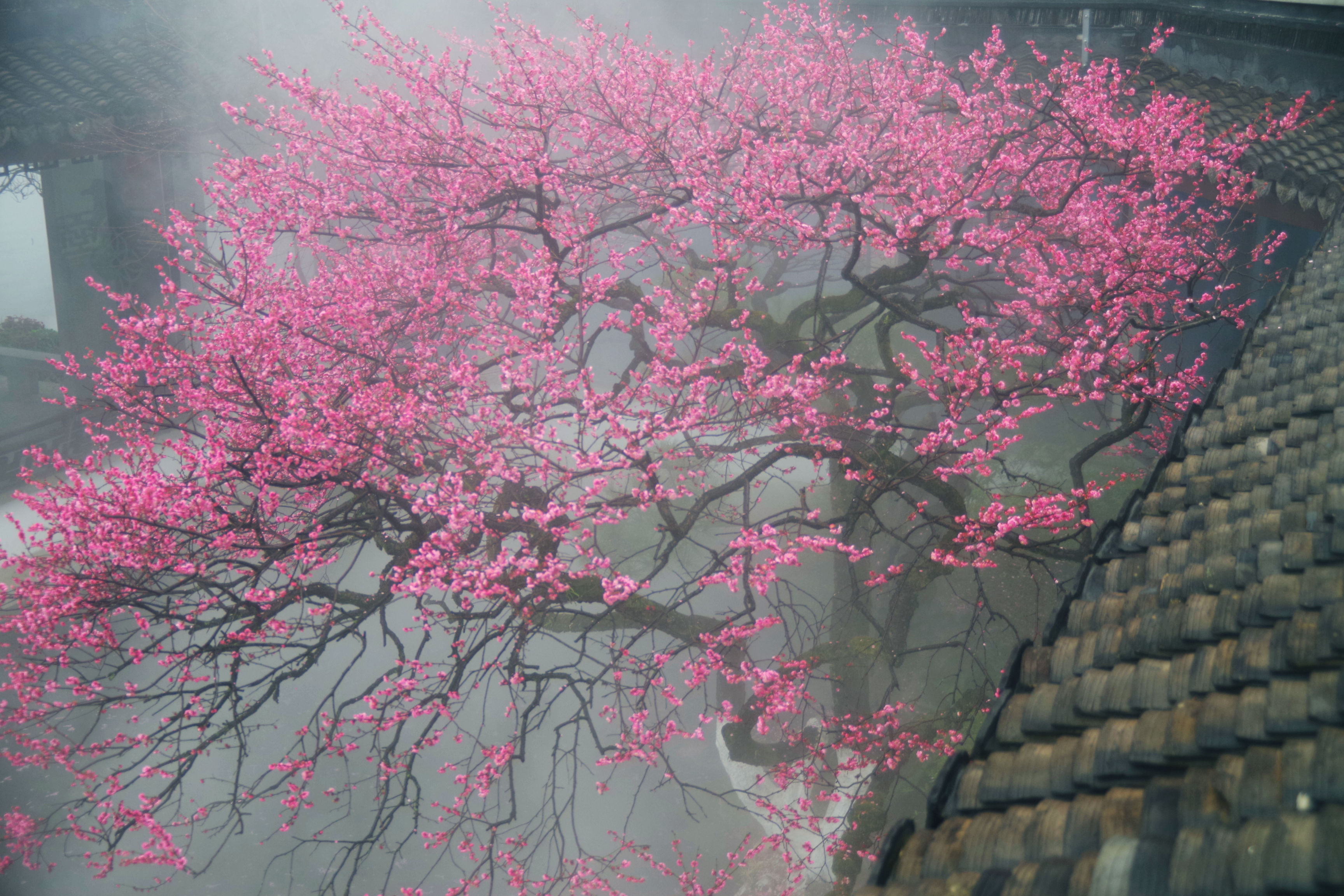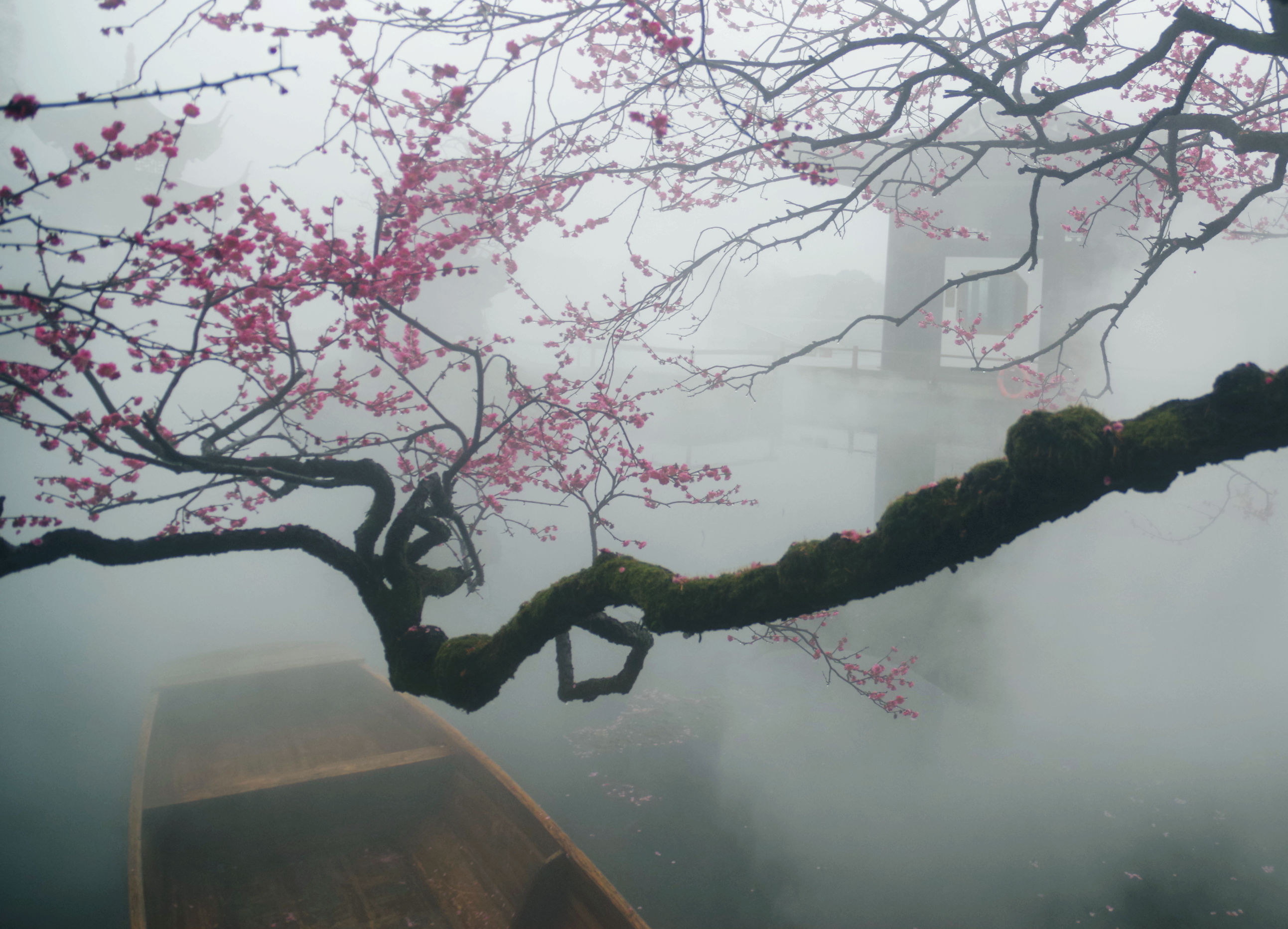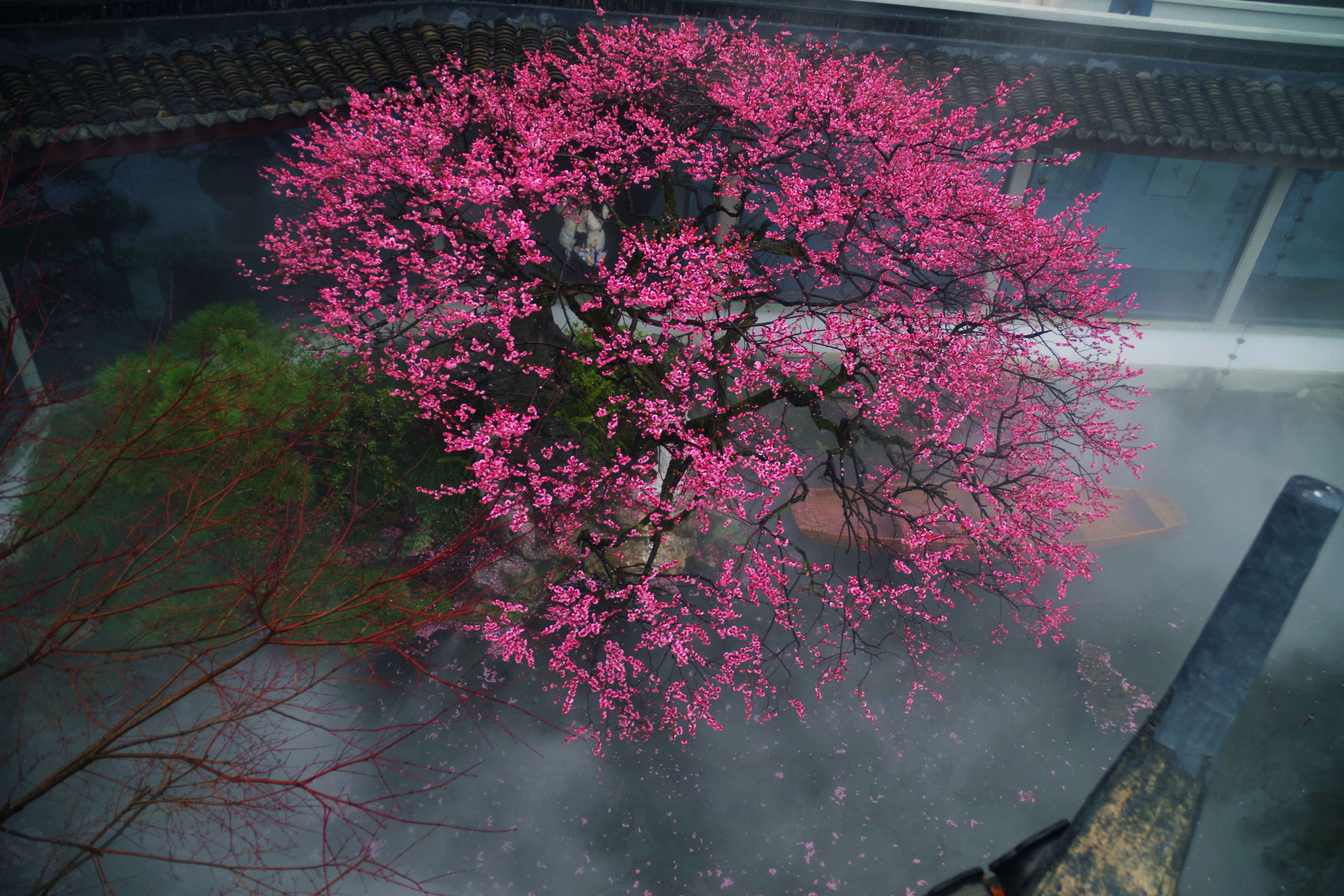 昨晚看到湛碧楼老板娘说梅花已经大开,正是赏景的好时候,有人便和老板娘预约了早起去看景,想了想,也报名凑个热闹。湛碧楼在西湖曲院风荷中,临近郭庄,可以远眺雷峰塔,是赏景的好去处。楼内有一株梅花,邻水而开,搭配湛碧楼的雾森系统,宛如瑶池仙境,我每次看到湛碧楼的梅花图,都会觉得被惊艳到。早上五点半醒来,窗外一片漆黑,伴随着淅淅沥沥的雨声,犹豫了两秒要不要早起出门,还是决定起来。美景并不会一直在那里等着我去看,错过了今天,或许会一直惦记且遗憾着。许是春天的缘故,雨并不大,气温虽然下降了些,但也不冷。骑行在路上,感觉还挺惬意的。到了湛碧楼,已经有十几个人在里面拍摄了,雾森下的梅花若隐若现,引得众人惊叹不已,咔嚓咔嚓的快门声不绝于耳。今天我用的广角镜头,可以拍到整株的梅花,还可以把周边的环境拍进来。机位角度大概都是别人早就拍过的,不过我还是喜欢自己拍的照片,哪怕和别人的雷同,也是我自己的劳动成果。在湛碧楼待了不到一小时就出来了,赶时间回来开店带娃。新年开工的的第一天,看了美景,兑了彩票,也算精神财富和物质财富双丰收了。
