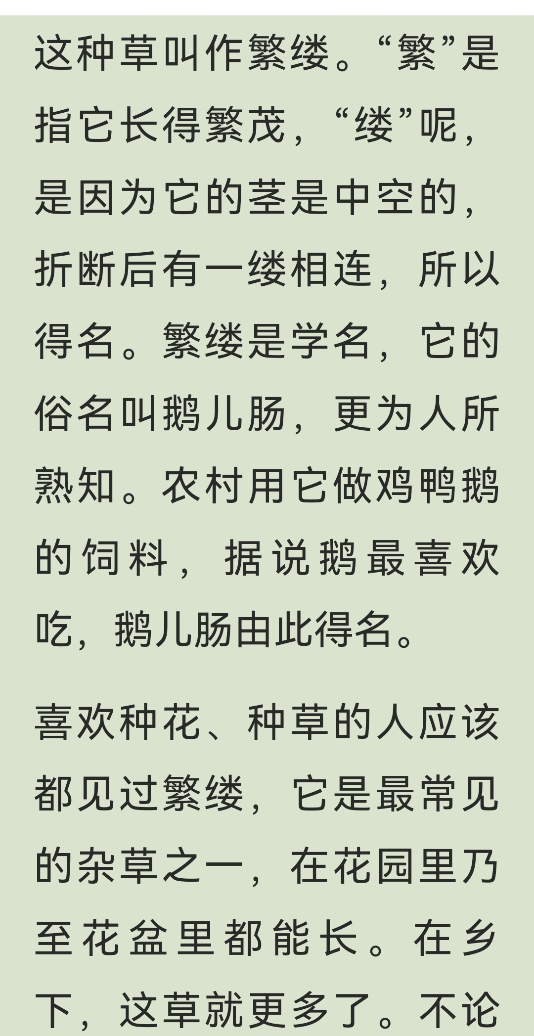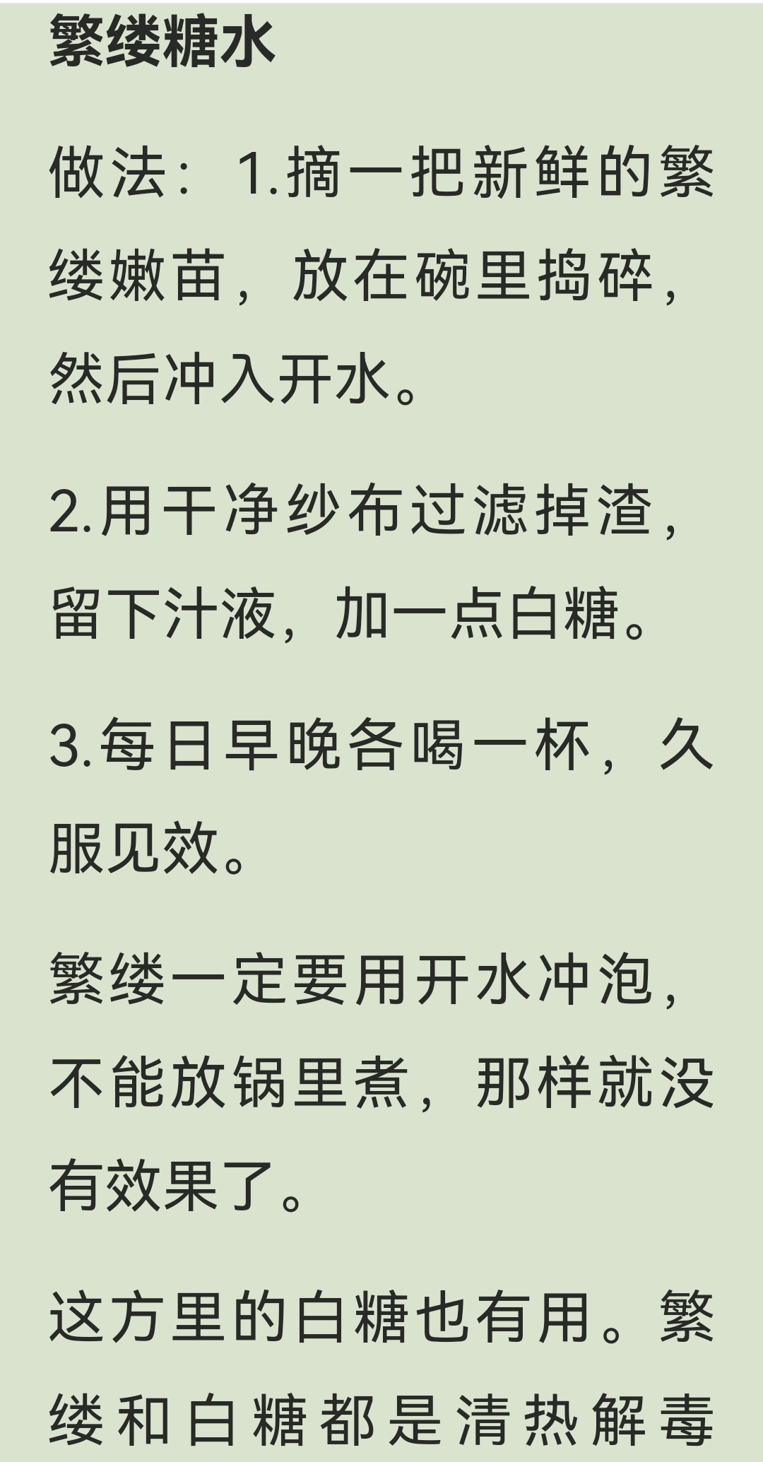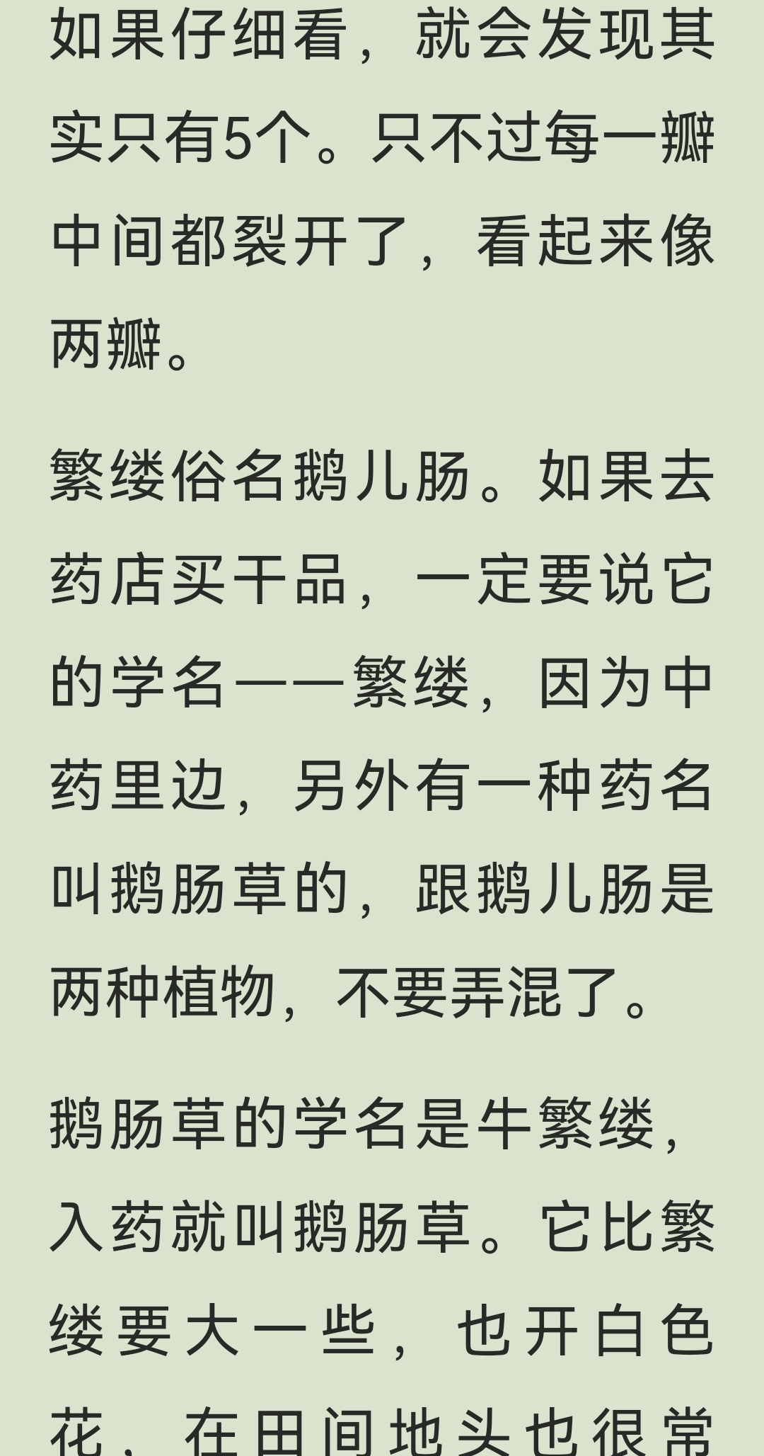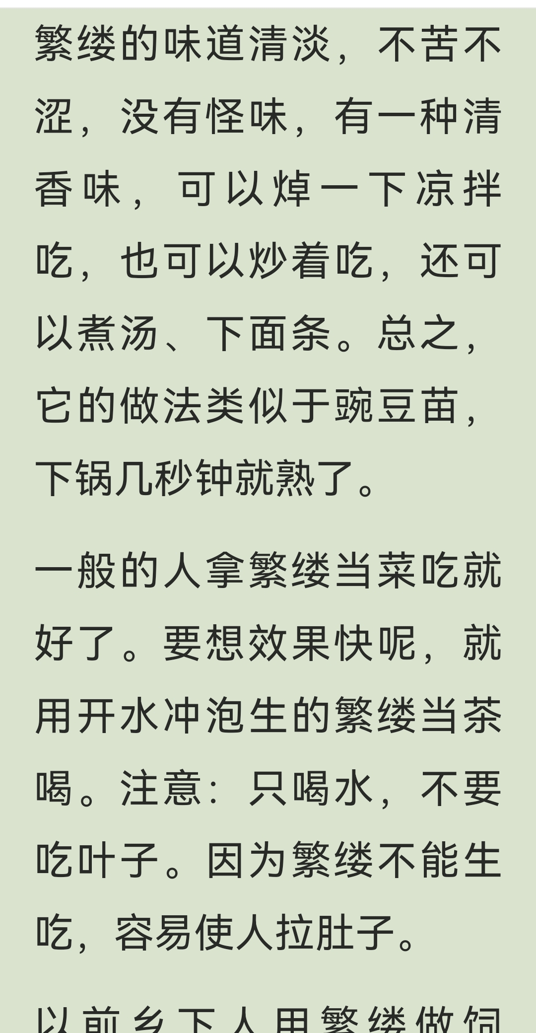 《回家吃饭的智慧》(中)第一章第五小节主要内容: 这一小节以“劝君处处惜芳草,清咽瘦身有繁缕”为主题,详细介绍了繁缕(鹅儿肠)的名称由来、功效、食疗方、食用禁忌,以及与牛繁缕(鹅肠草)的区别,核心内容如下: 1. 名称与形态 - 繁缕,学名繁缕,俗名鹅儿肠,因茎中空、折断后有一缕相连而得名“繁缕”,又因鹅最爱吃而得名“鹅儿肠”。 - 它是常见的一年生草本,茎细弱、绿色,高约20-30厘米,夏天开小白花(花瓣看似10片,实为5片,每片中间开裂)。 2. 核心功效 - 清血热、凉血消炎:入肝、肺、大肠经,可调理乳腺炎、肺炎、阑尾炎等化脓性感染。 - 降脂减肥、清肠排毒:被称为“刮油草”,能降血脂、清肠热,适合现代人减脂需求。 3. 实用食疗方:繁缕糖水 - 适用:虚火型慢性咽炎(咽喉干痛、灼热、口干喜饮)。 - 做法:新鲜繁缕嫩苗捣碎,用开水冲泡,过滤后加白糖,早晚各一杯,久服见效。 - 注意:必须用开水冲泡,不可久煮;白糖可增强清热解毒、生津止渴的效果。 4. 食用与禁忌 - 食用方法:可凉拌、清炒、煮汤或下面条,下锅几秒即熟;也可开水冲泡当茶(只喝水,不吃叶)。 - 禁忌人群:孕妇(有催产作用)、腹部受寒腹泻者;产妇仅可在乳腺炎发作时短期食用,炎症消退后需停用(因其减肥作用会影响营养摄入)。 5. 与牛繁缕的区别 - 外观:牛繁缕茎为紫色,多年生,可长至半米以上;繁缕茎为绿色,一年生,高不超过30厘米。 - 功效:牛繁缕偏于散瘀消肿、走胃经,可消小儿疳积;繁缕偏于凉血消炎、走肝经,可除产妇瘀血。 - 注意:药店购药时需用学名“繁缕”,避免与牛繁缕(鹅肠草)混淆。