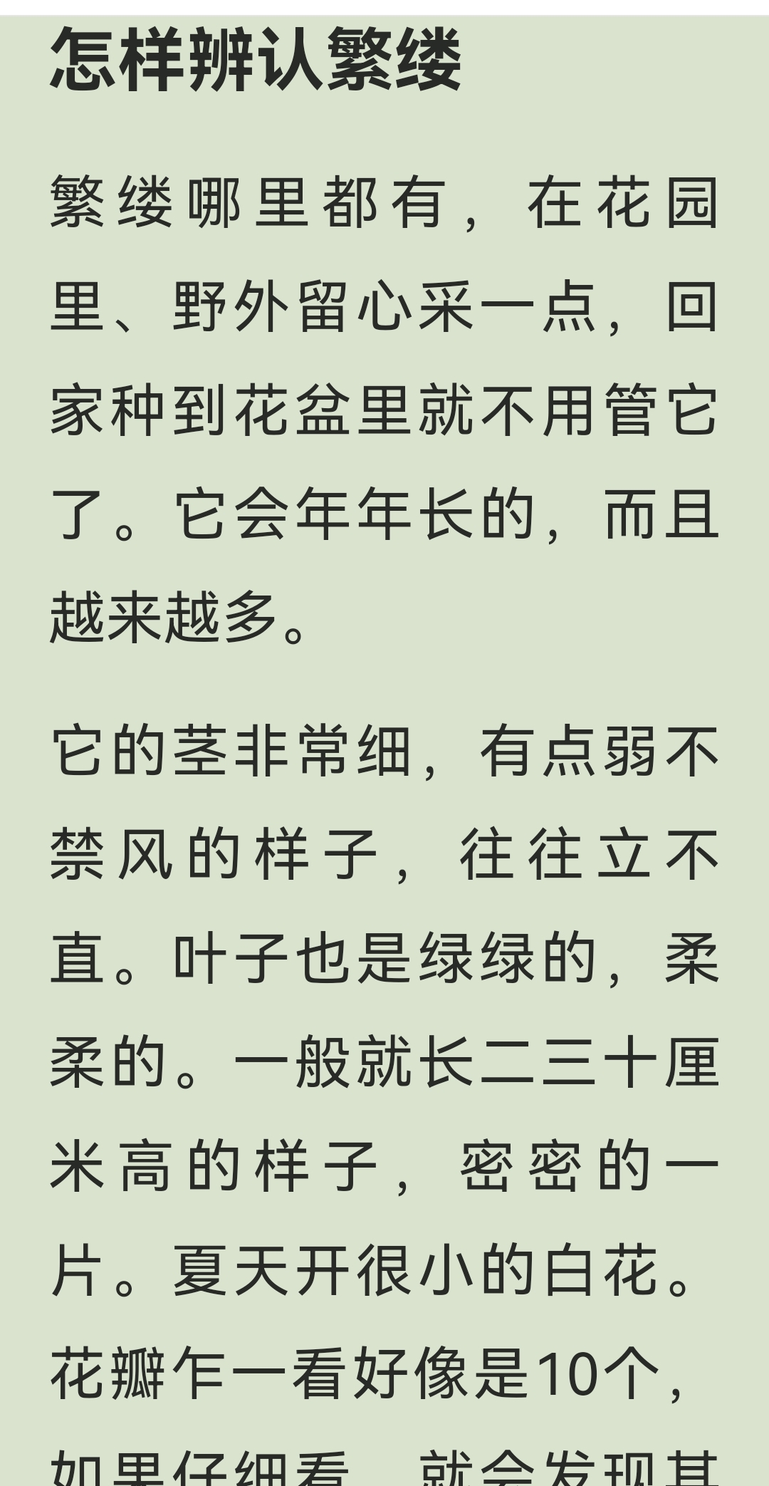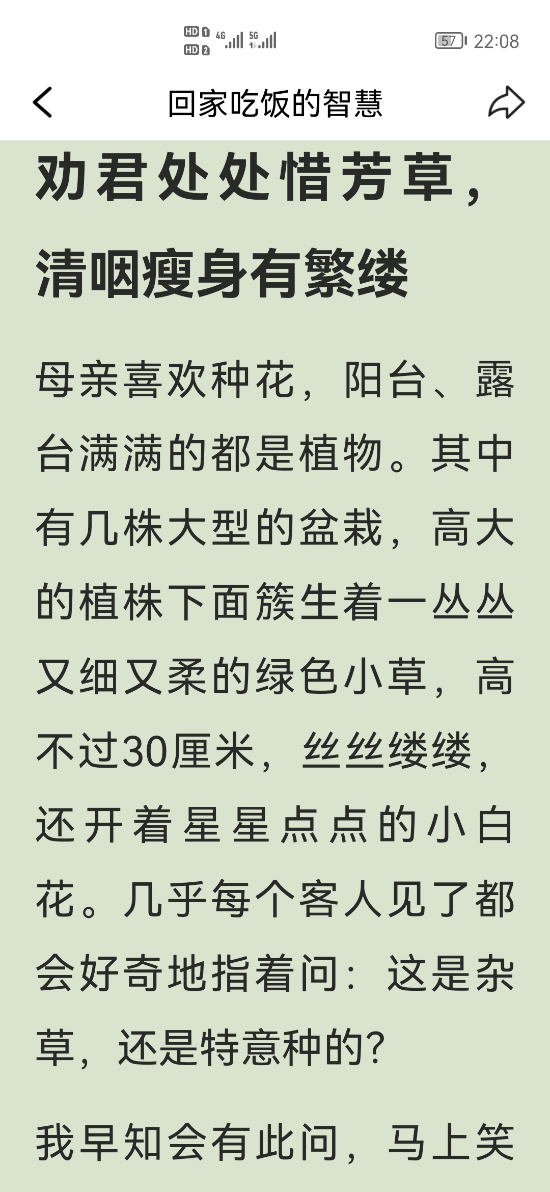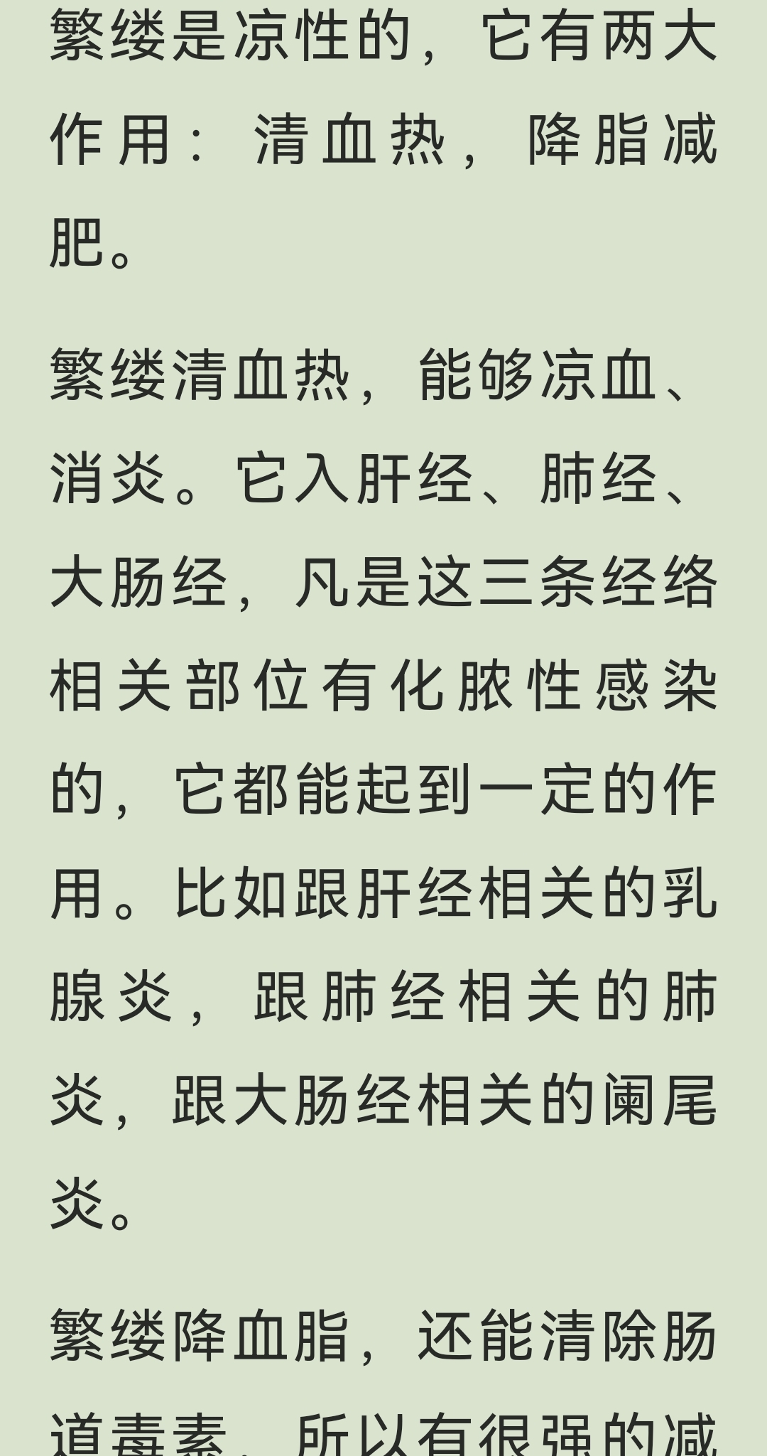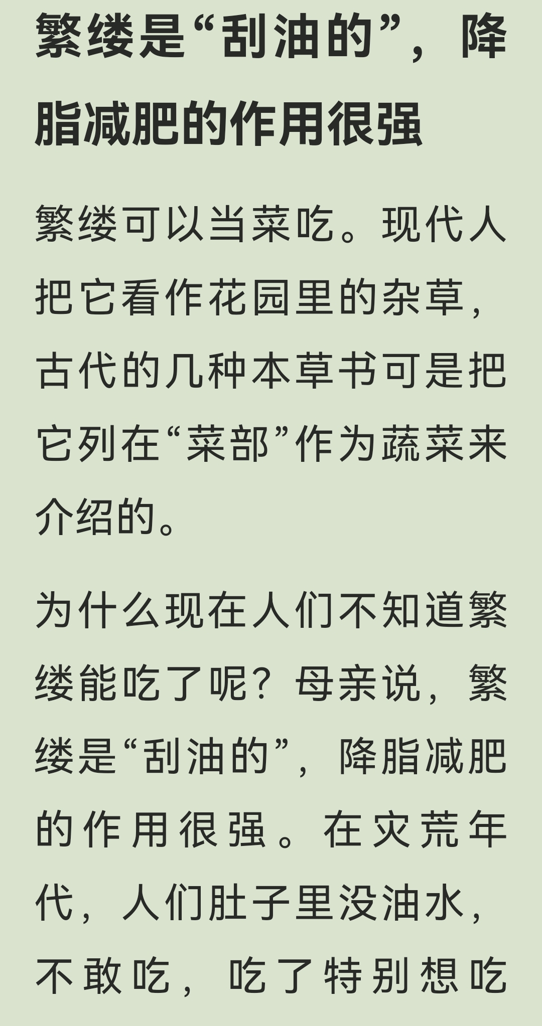 《回家吃饭的智慧》(中)第一章第五小节主要内容: 这一小节以“劝君处处惜芳草,清咽瘦身有繁缕”为主题,详细介绍了繁缕(鹅儿肠)的名称由来、功效、食疗方、食用禁忌,以及与牛繁缕(鹅肠草)的区别,核心内容如下: 1. 名称与形态 - 繁缕,学名繁缕,俗名鹅儿肠,因茎中空、折断后有一缕相连而得名“繁缕”,又因鹅最爱吃而得名“鹅儿肠”。 - 它是常见的一年生草本,茎细弱、绿色,高约20-30厘米,夏天开小白花(花瓣看似10片,实为5片,每片中间开裂)。 2. 核心功效 - 清血热、凉血消炎:入肝、肺、大肠经,可调理乳腺炎、肺炎、阑尾炎等化脓性感染。 - 降脂减肥、清肠排毒:被称为“刮油草”,能降血脂、清肠热,适合现代人减脂需求。 3. 实用食疗方:繁缕糖水 - 适用:虚火型慢性咽炎(咽喉干痛、灼热、口干喜饮)。 - 做法:新鲜繁缕嫩苗捣碎,用开水冲泡,过滤后加白糖,早晚各一杯,久服见效。 - 注意:必须用开水冲泡,不可久煮;白糖可增强清热解毒、生津止渴的效果。 4. 食用与禁忌 - 食用方法:可凉拌、清炒、煮汤或下面条,下锅几秒即熟;也可开水冲泡当茶(只喝水,不吃叶)。 - 禁忌人群:孕妇(有催产作用)、腹部受寒腹泻者;产妇仅可在乳腺炎发作时短期食用,炎症消退后需停用(因其减肥作用会影响营养摄入)。 5. 与牛繁缕的区别 - 外观:牛繁缕茎为紫色,多年生,可长至半米以上;繁缕茎为绿色,一年生,高不超过30厘米。 - 功效:牛繁缕偏于散瘀消肿、走胃经,可消小儿疳积;繁缕偏于凉血消炎、走肝经,可除产妇瘀血。 - 注意:药店购药时需用学名“繁缕”,避免与牛繁缕(鹅肠草)混淆。