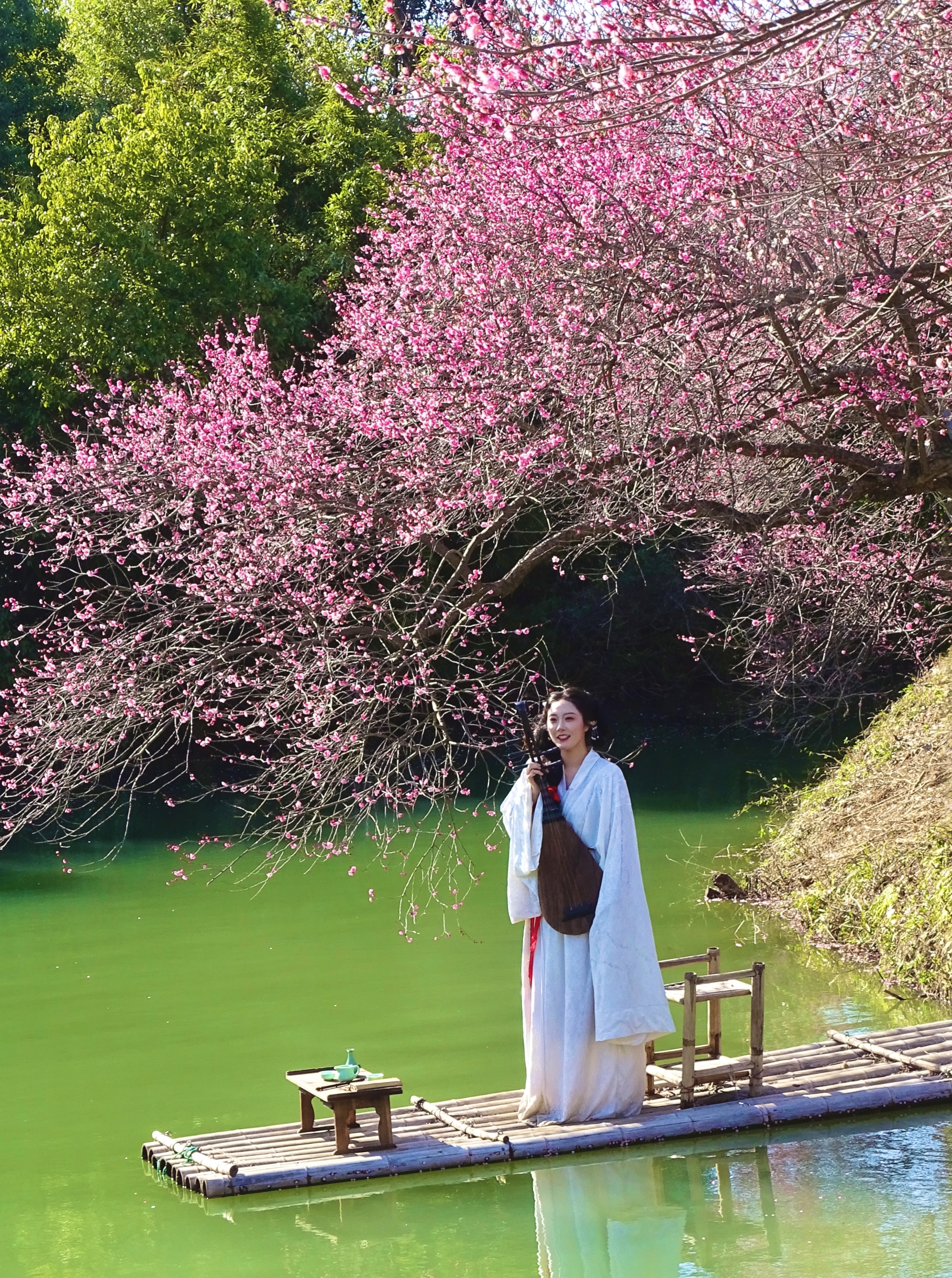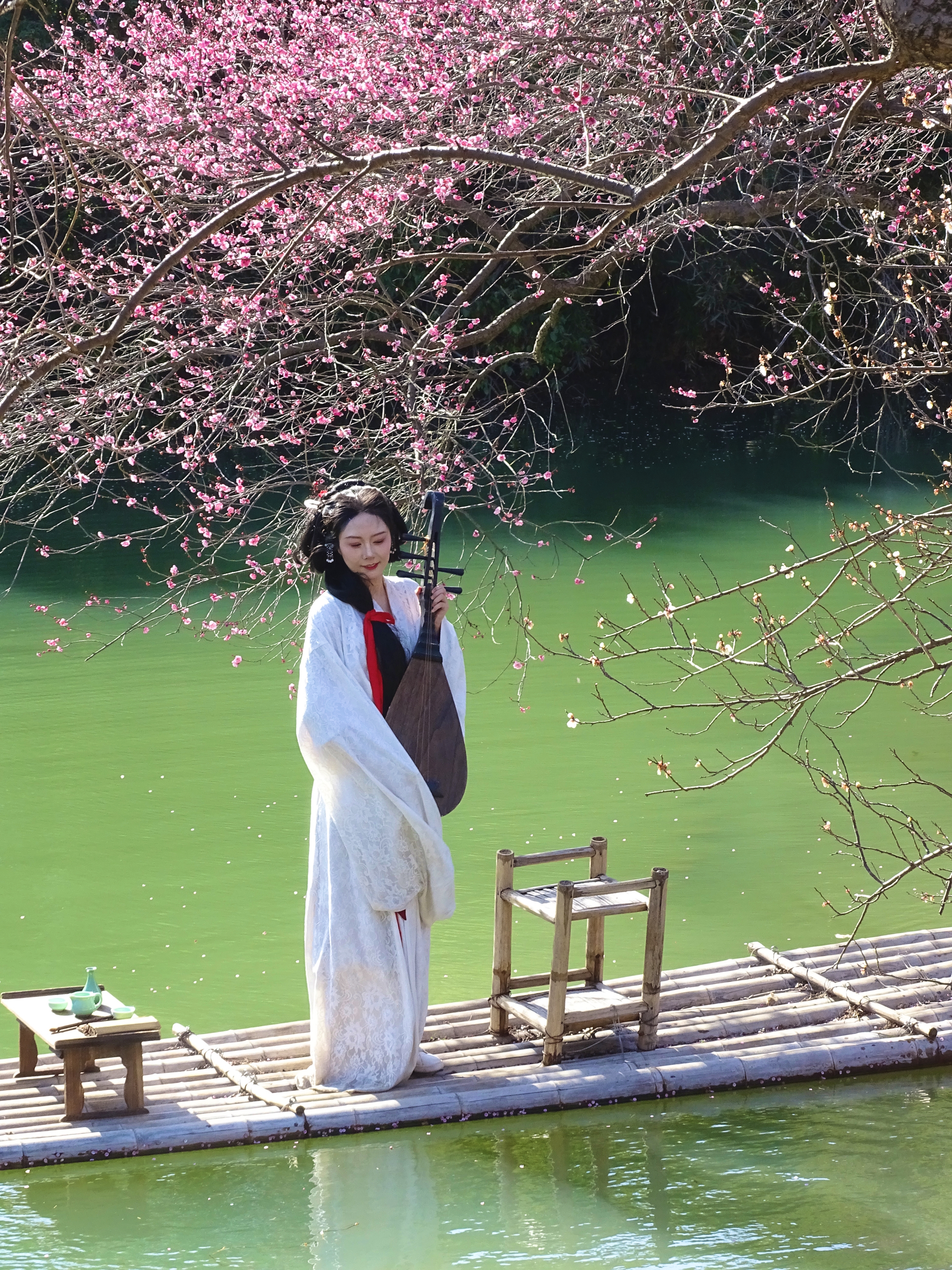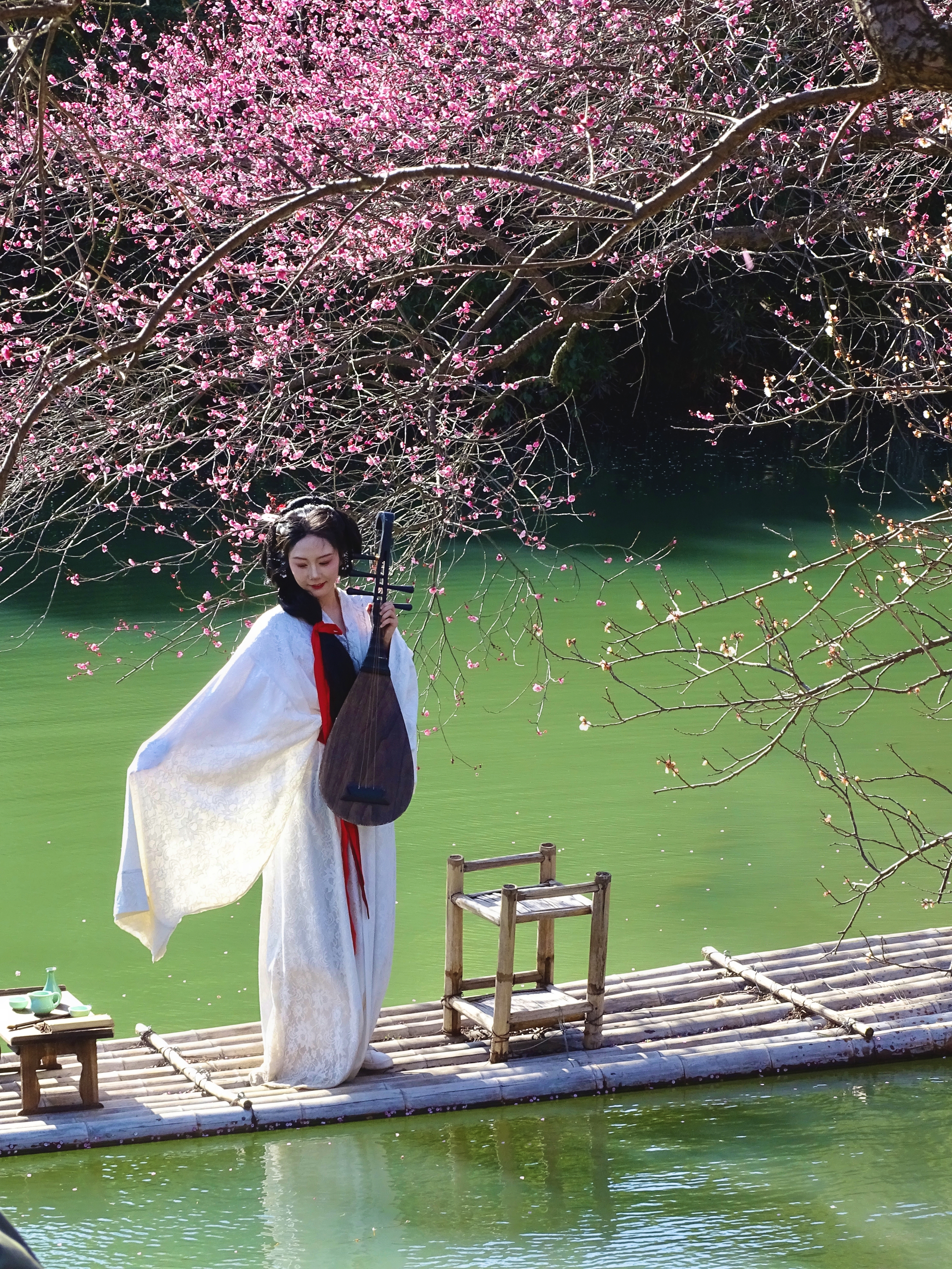 西溪梅花开得正盛,绿水映着花影好温柔。白衣女子手持琵琶与红伞立在竹筏上,像从画里走出来一样。风吹花瓣落水面,连空气都带着甜甜的香。