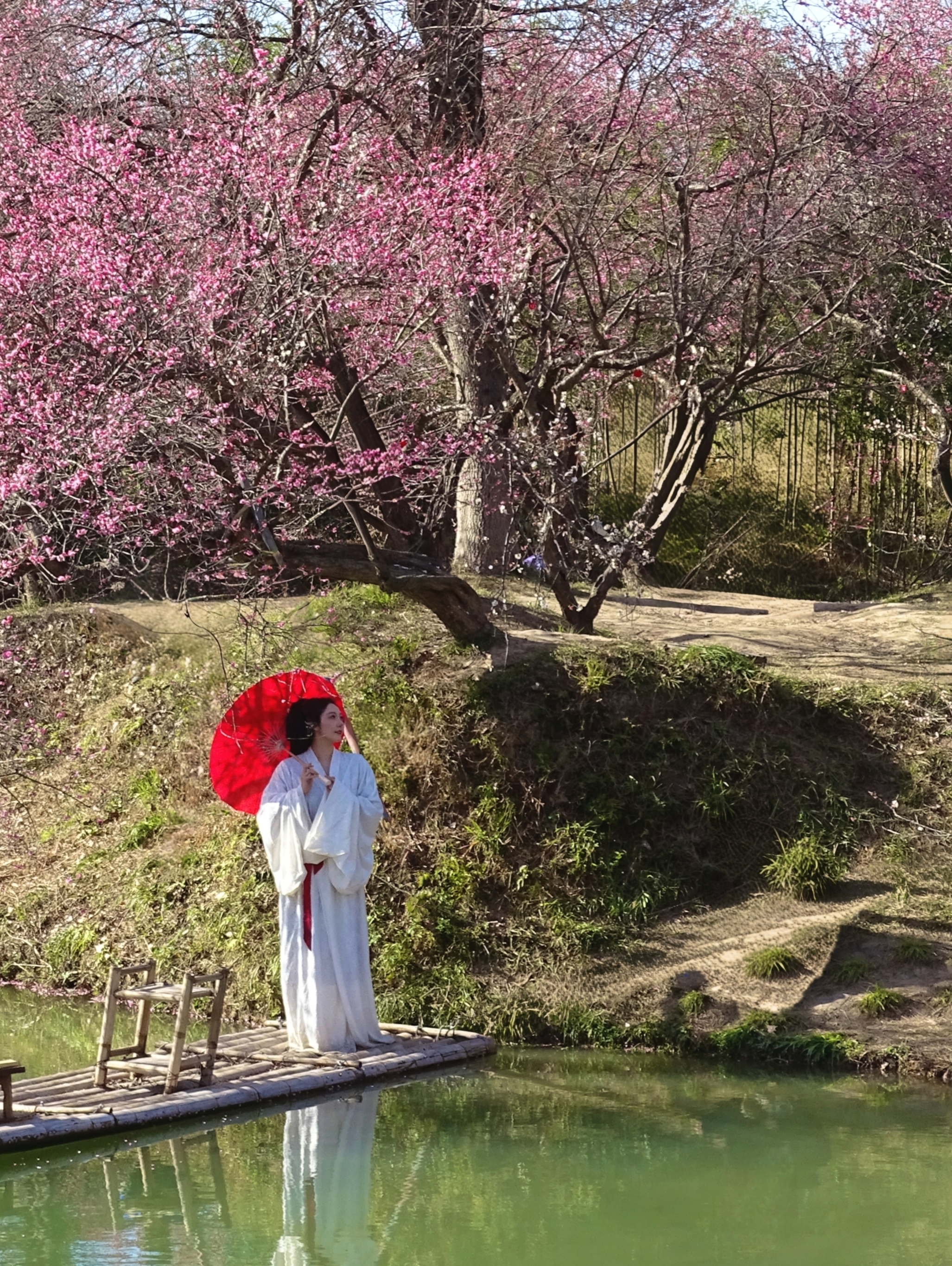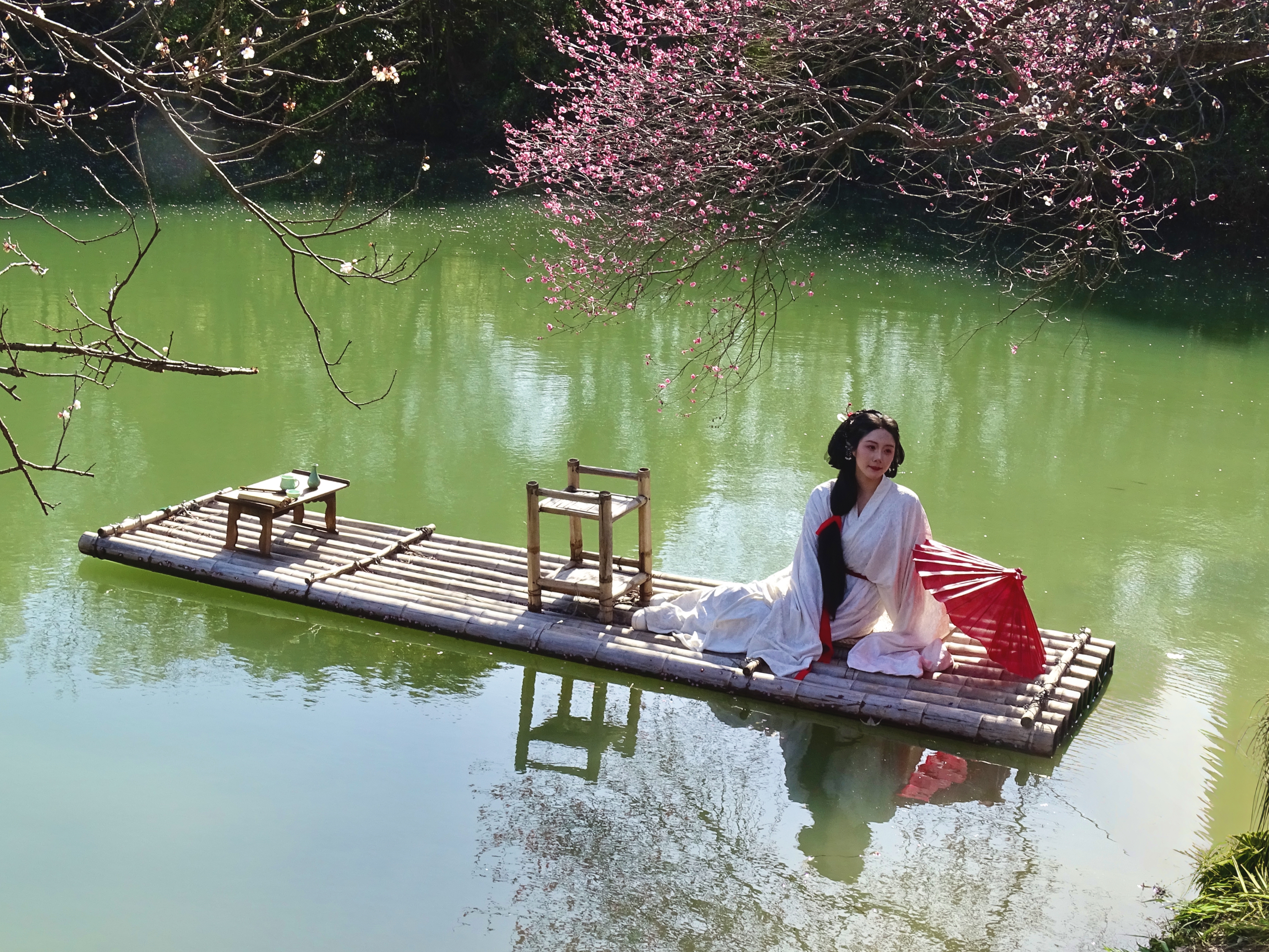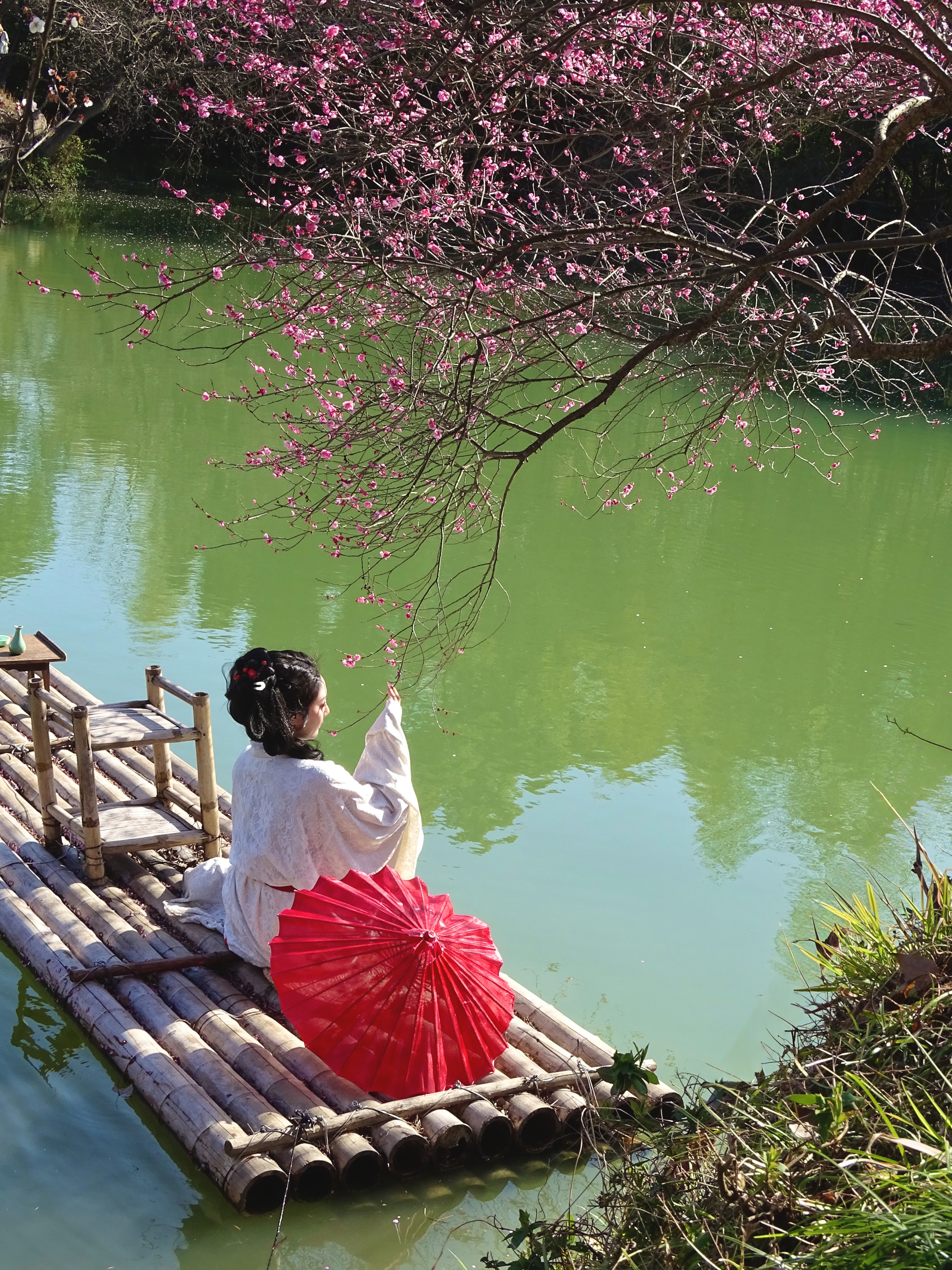 西溪梅花开得正盛,绿水映着花影好温柔。白衣女子手持琵琶与红伞立在竹筏上,像从画里走出来一样。风吹花瓣落水面,连空气都带着甜甜的香。