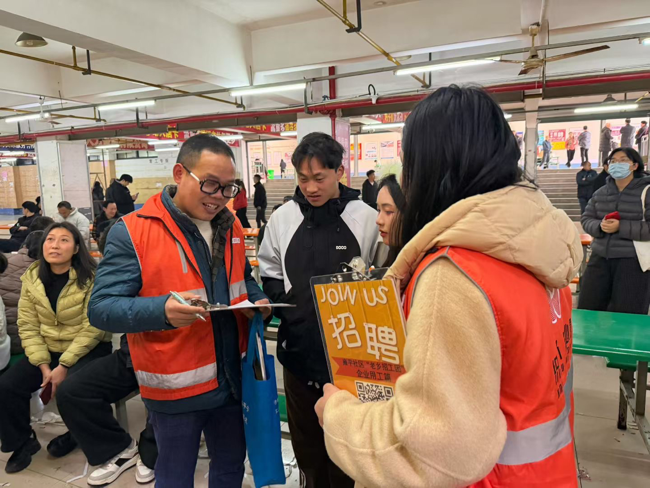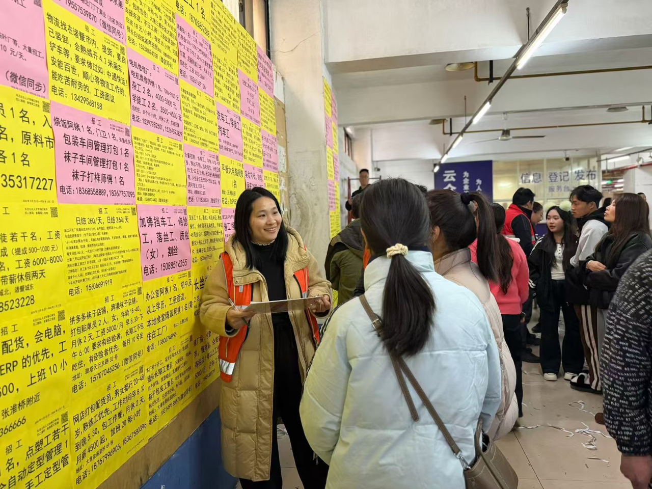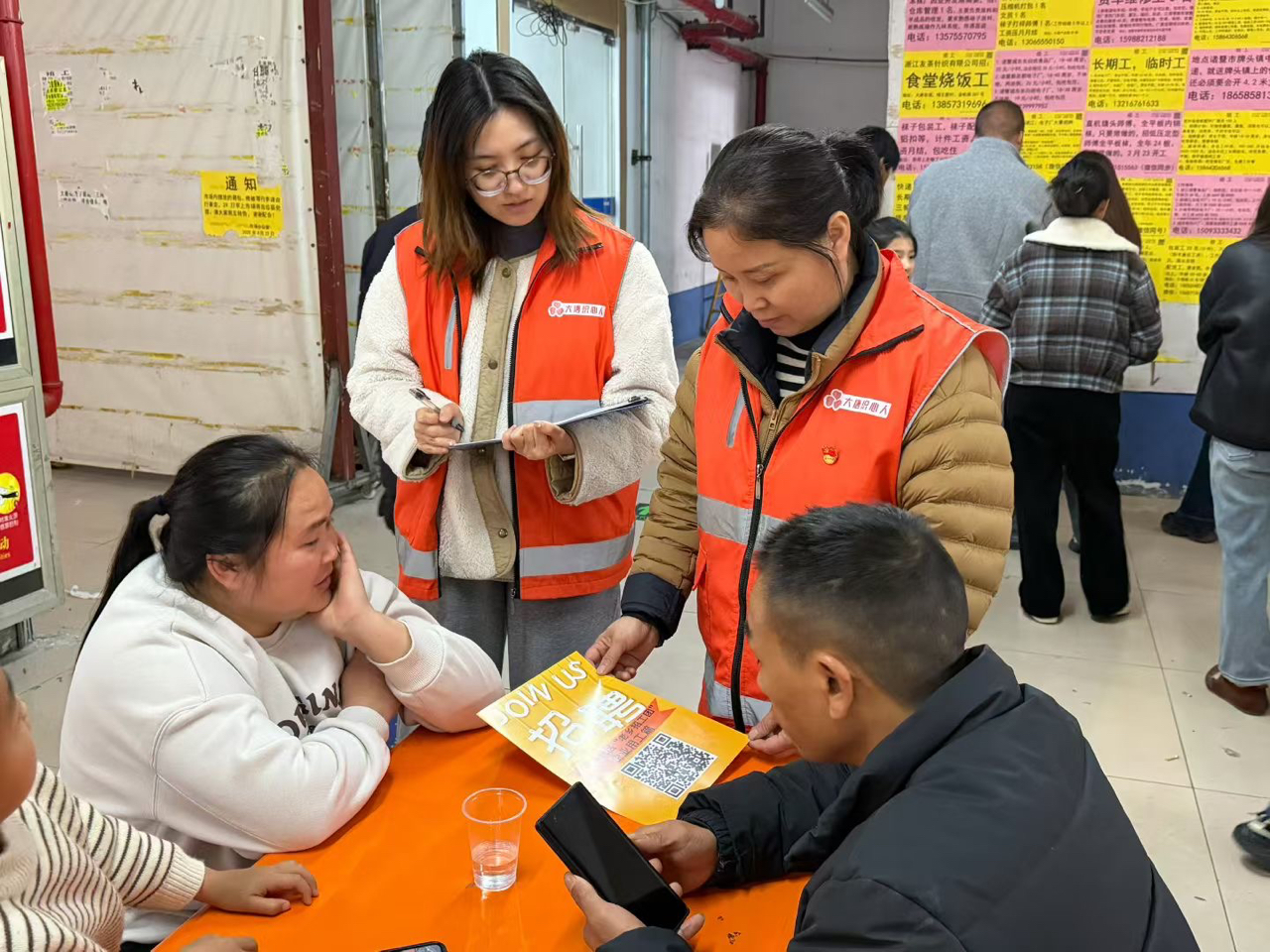 诸暨市大唐劳动力市场,雍平社区“织心人”志愿者穿梭于信息登记台与岗位信息墙之间。现场招聘、二维码扫码求职、老乡招工团联动,覆盖袜业加工、物流、电商贸易等多元岗位。就业指导、政策宣传、劳务中介与便民服务一体融合,展现基层人力资源服务的温度与效能,助力新春复工复产。