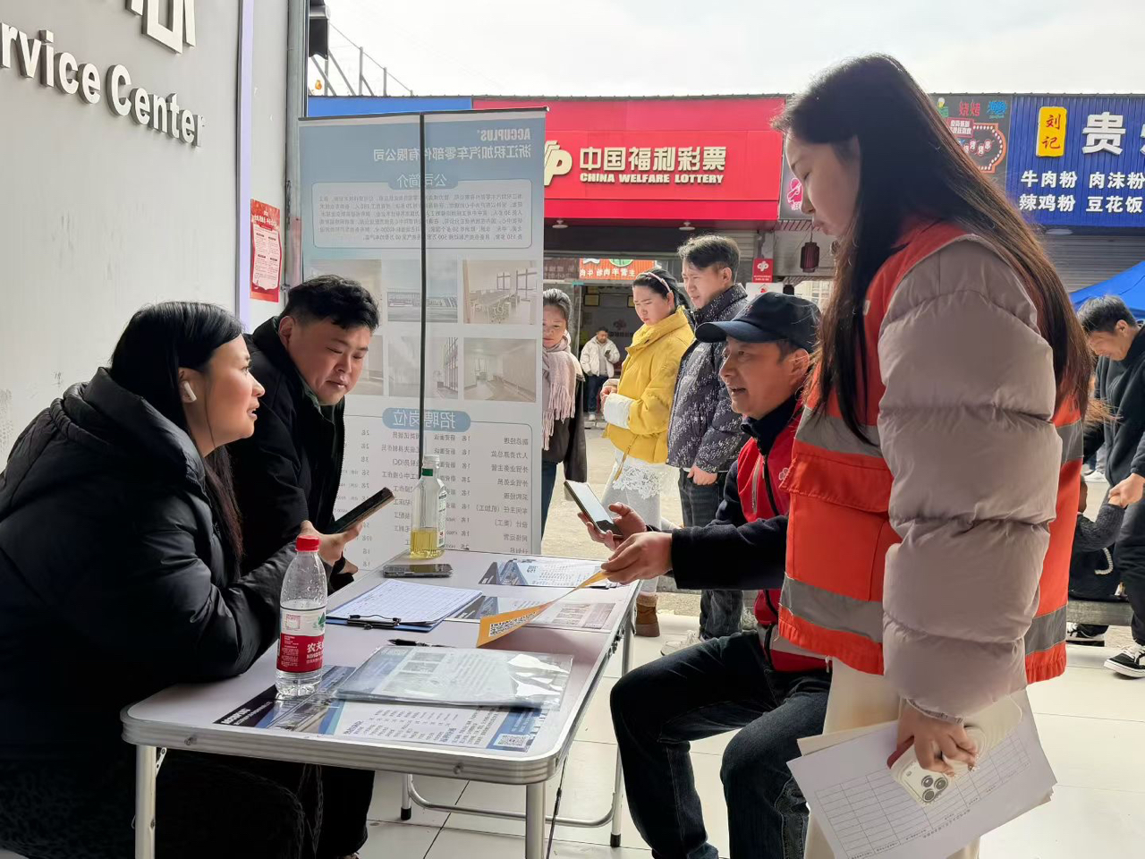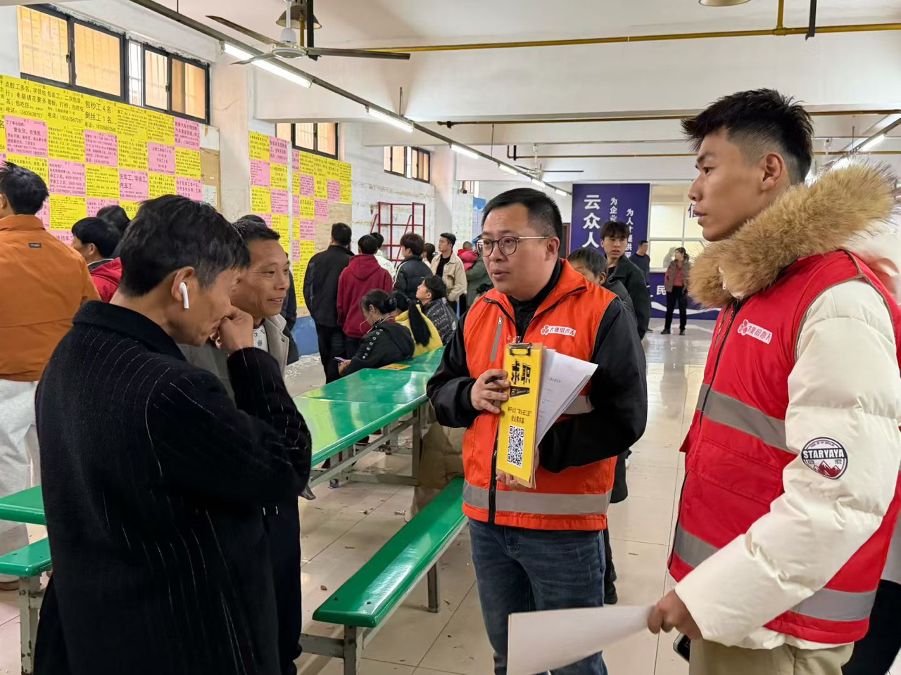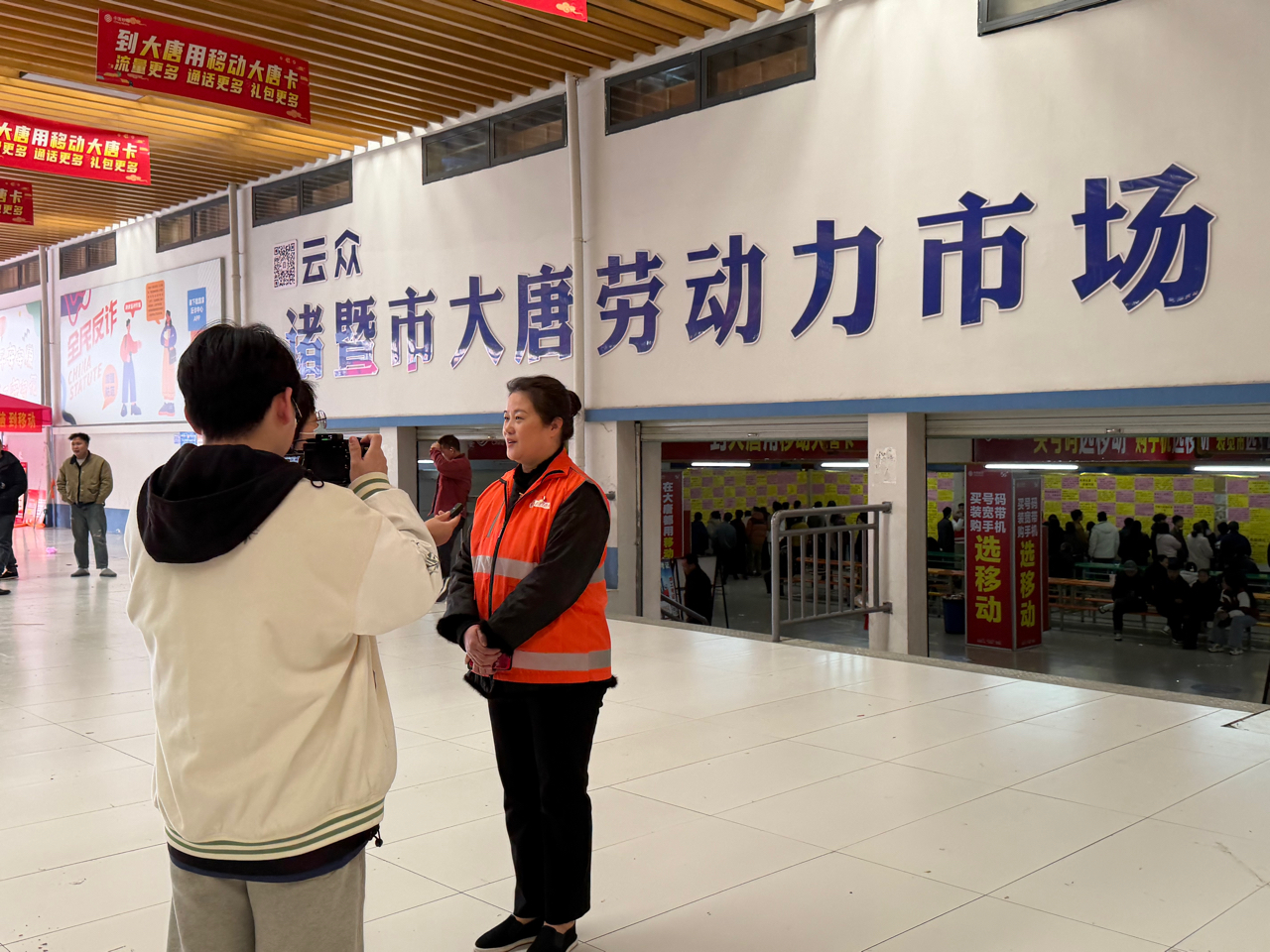 诸暨市大唐劳动力市场,雍平社区“织心人”志愿者穿梭于信息登记台与岗位信息墙之间。现场招聘、二维码扫码求职、老乡招工团联动,覆盖袜业加工、物流、电商贸易等多元岗位。就业指导、政策宣传、劳务中介与便民服务一体融合,展现基层人力资源服务的温度与效能,助力新春复工复产。